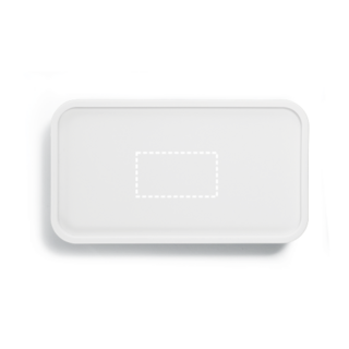 Frischhaltebox aus PP und PS mit 2 Fächer (je 680 mL) und einer herausnehmbarer Trennwand. Enthält Gabel, Messer und Löffel. Schliessung mittels Gummiband. Für Mikrowellengebrauch den Deckel abnehmen. 180 x 100 x 100 mm