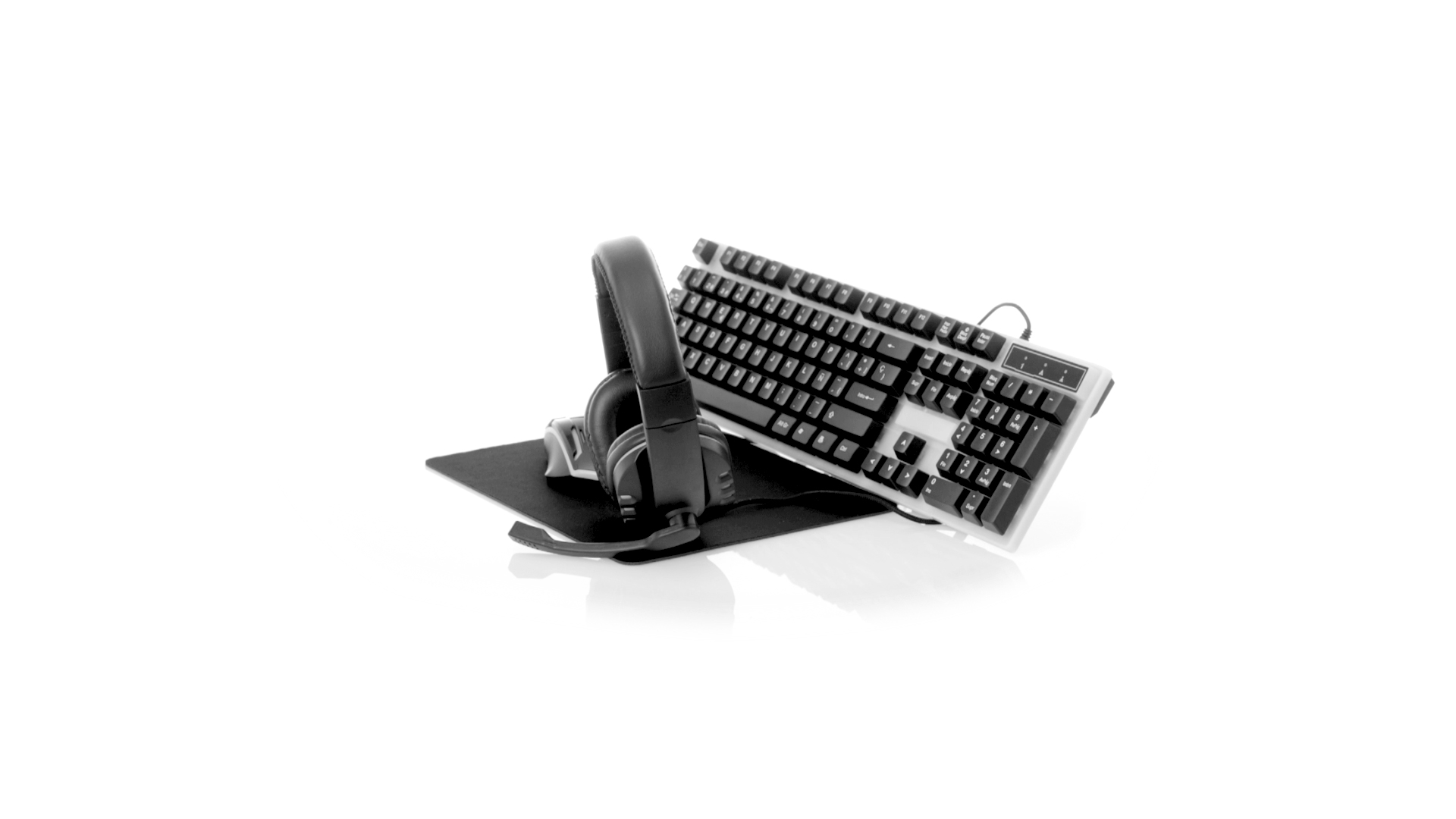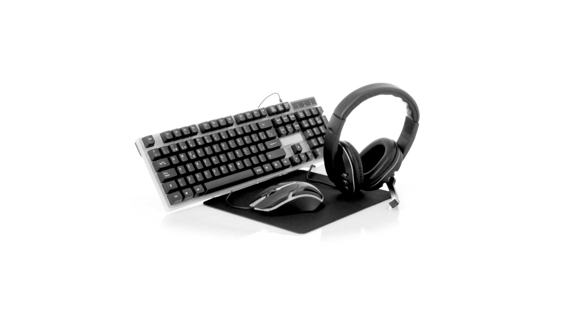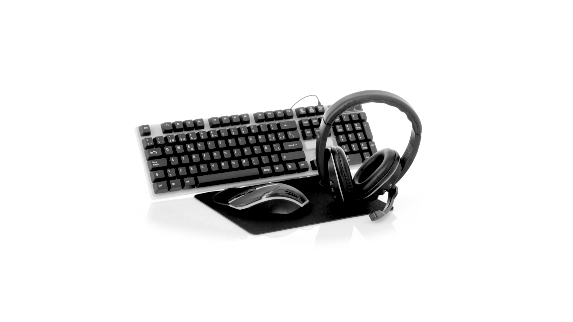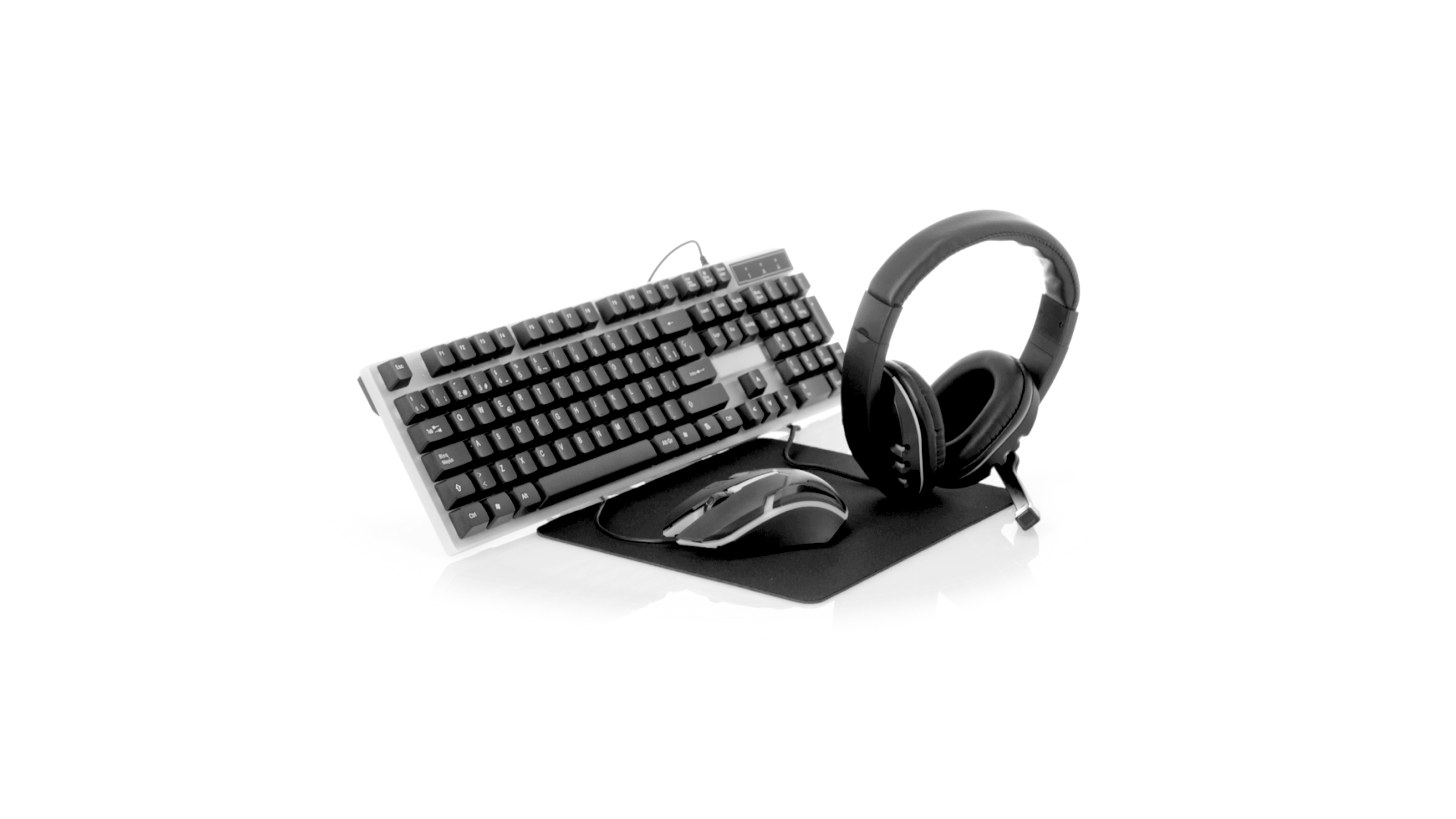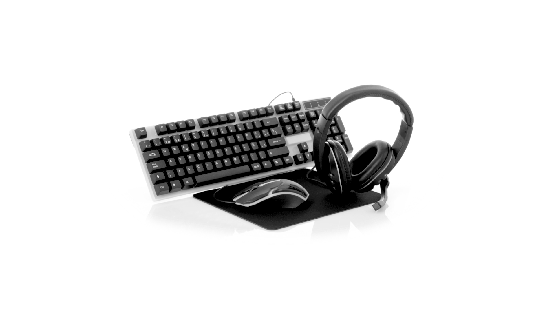 Gamer-Set für ein intensives Spielerlebnis. Enthält eine optische Maus und eine QWERTY-Tastatur auf Spanisch, beide mit mehrfarbiger LED-Hintergrundbeleuchtung und USB-Kabelanschluss. Dazu kommt ein weiches Mauspad aus Polyester mit rutschfester Silikonunterlage, perfekt für eine präzise Maussteuerung. Vervollständigt wird das Set mit Surround-Sound-Ohrhörern mit mehrfarbiger LED-Hintergrundbeleuchtung, integriertem Mikrofon und 3,5-mm-Klinkenanschluss. Das Set ist in elegantem Schwarz gehalten und wird in einer individuellen Kraftbox geliefert.