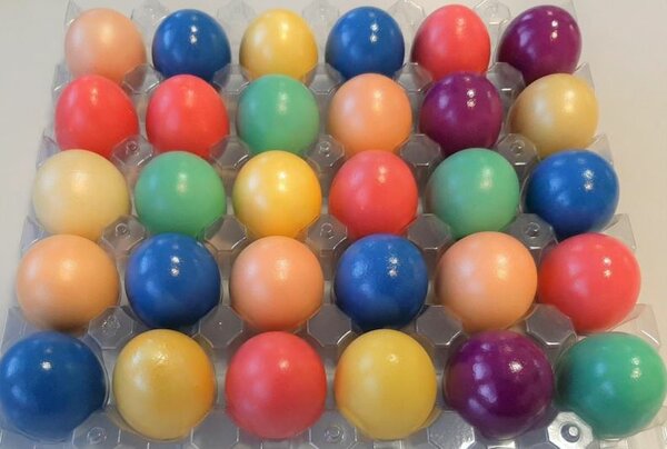 Mit Farben aus laufender Produktion – keine Mindestbestellmengen Mit Spezialfarben Pantone – Mind. 1’000 Eier (produktionstechnische Vorgabe) Um die Eier auf den Höckern korrekt liefern zu können, beträgt die Mindestbestellmenge 1 Karton, d.h. 150 bzw. 360 Eier