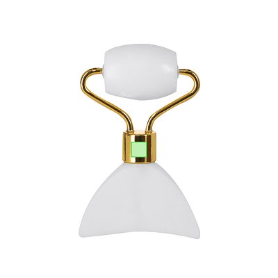 Hochwertige Gesichtsroller aus weissem Jadestein. Angenehmer Handmassager fürs Gesicht, mit einem Gesichtszylinder aus weichem, poliertem Stein und Spatel.