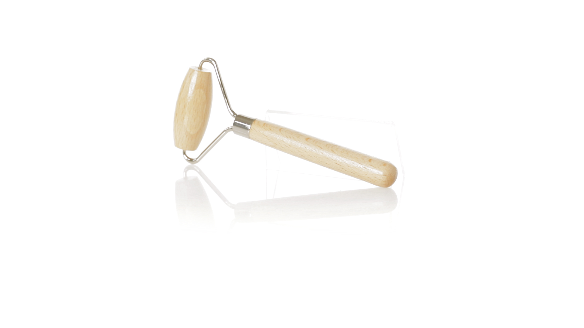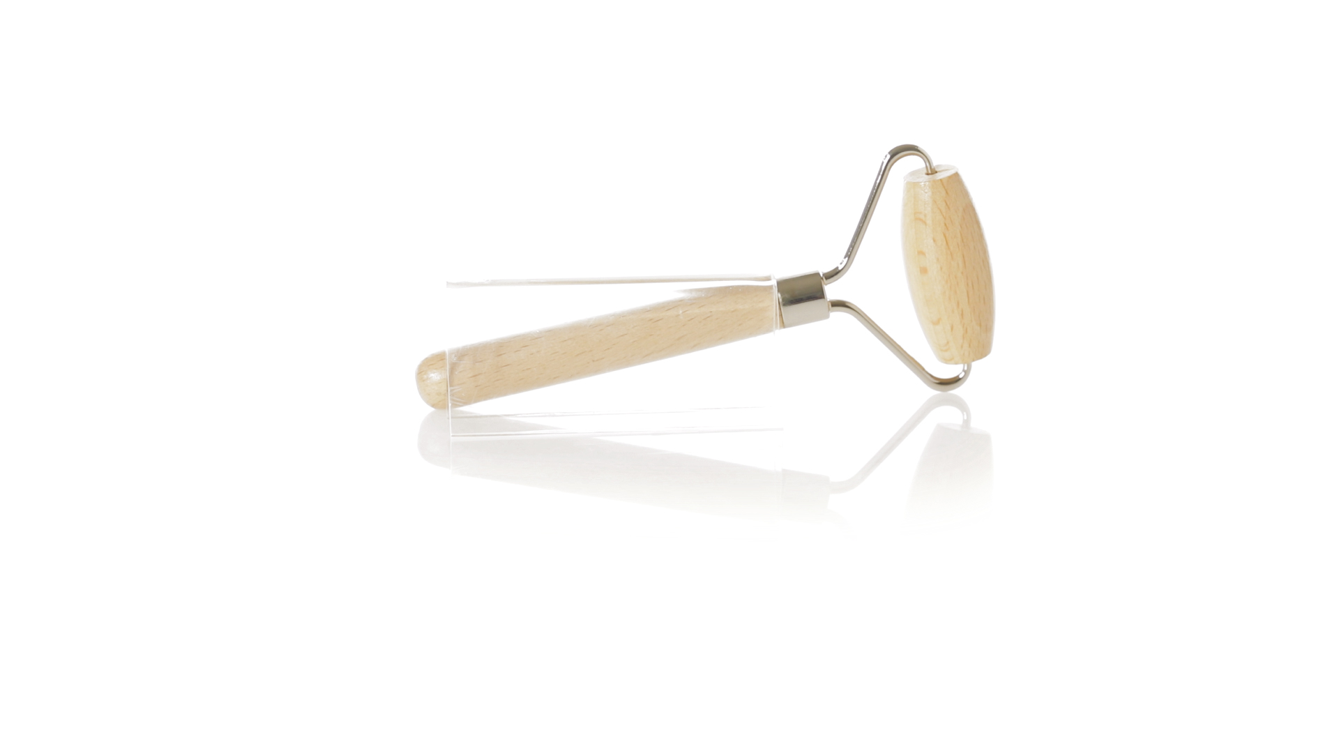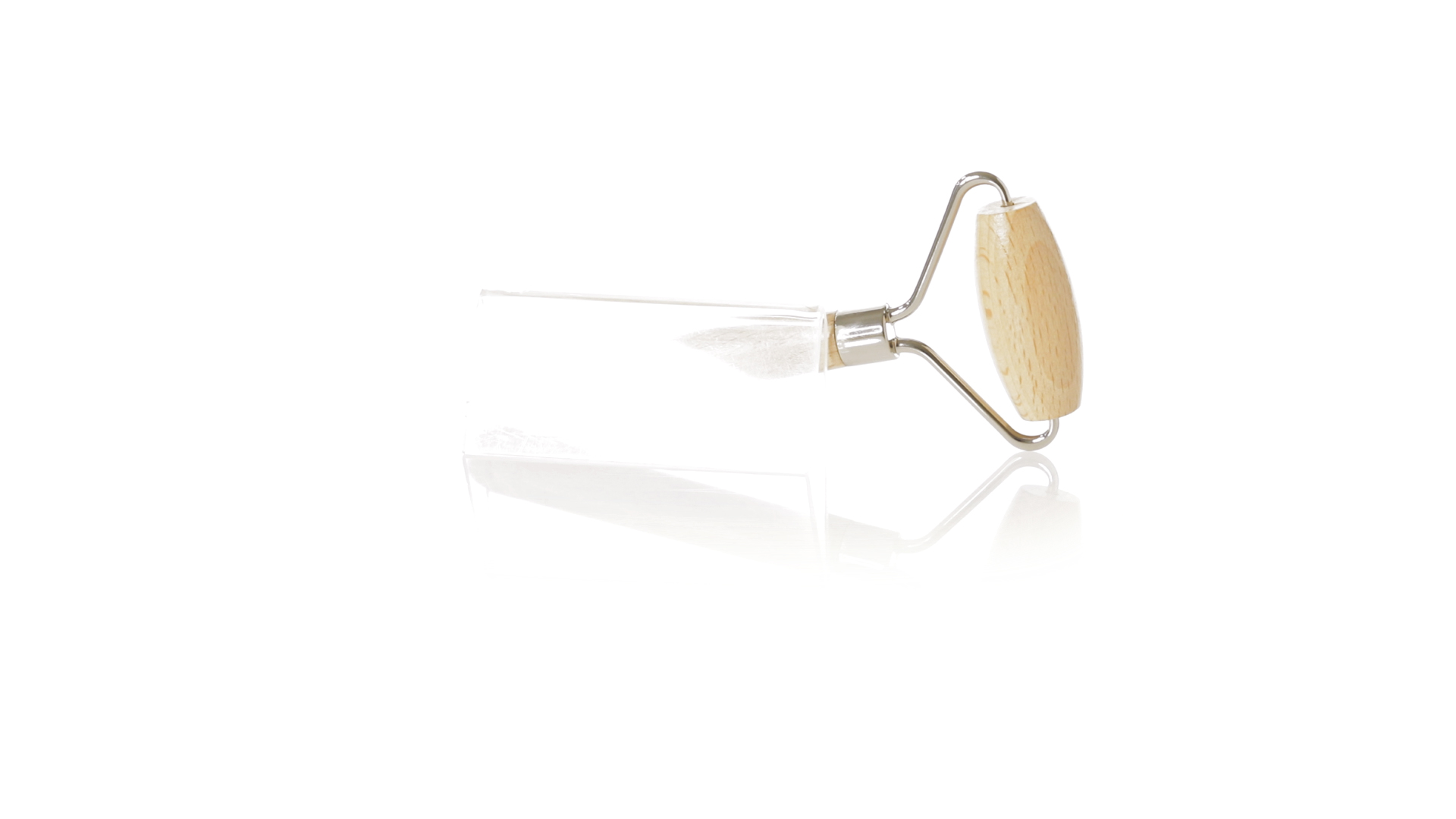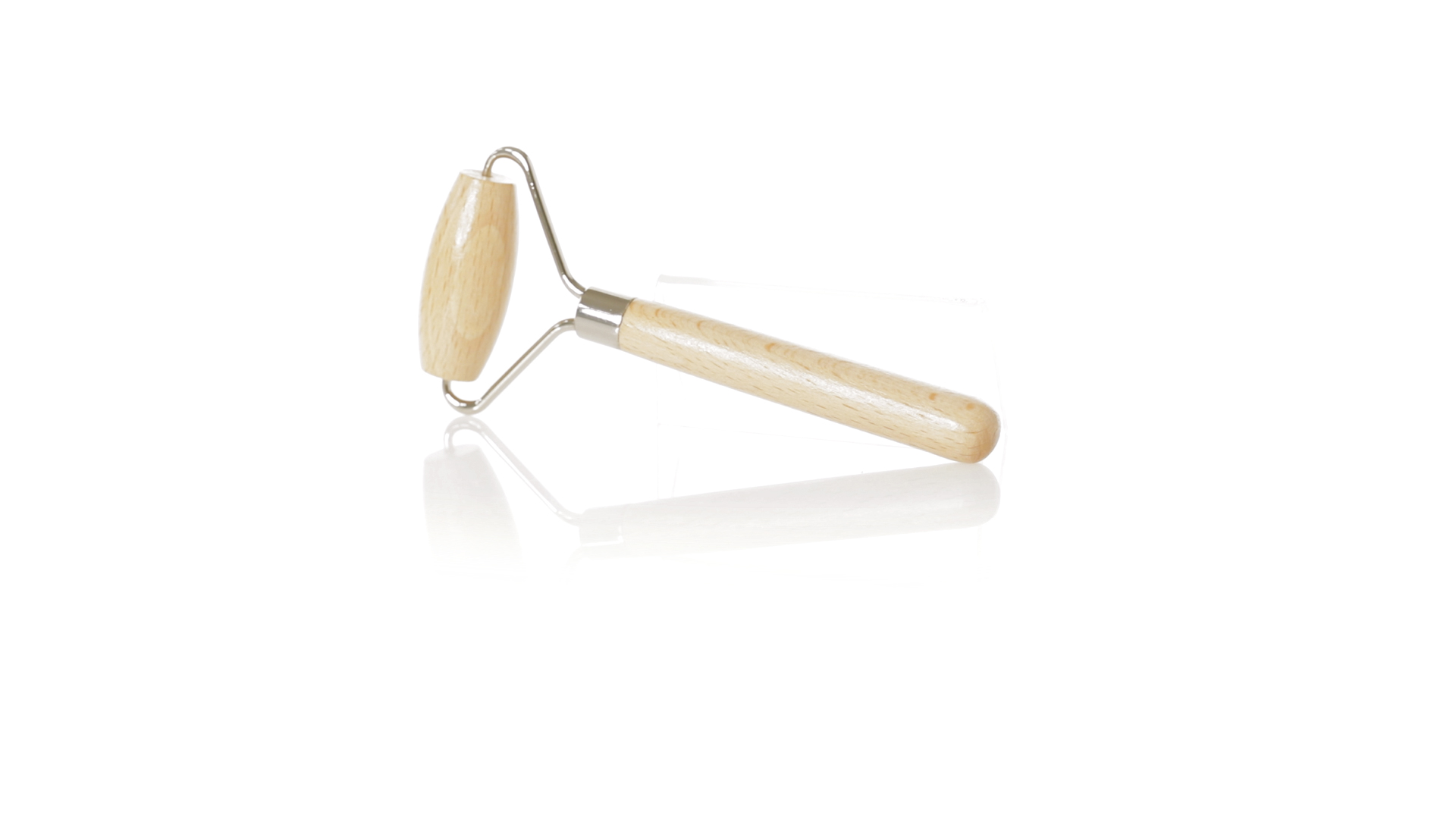 Gesichtsmassage-Massageroller aus Naturholz, der die Gesichtspflege fördert und entspannend wirkt. Präsentiert in einer individuellen Ökodesign-Box aus Kraftkarton.