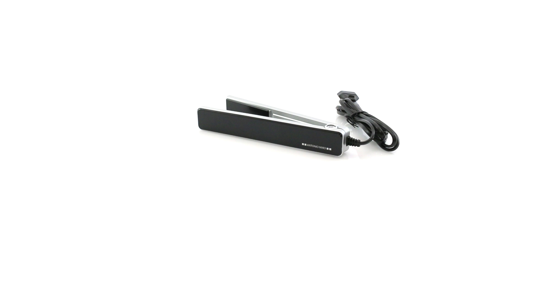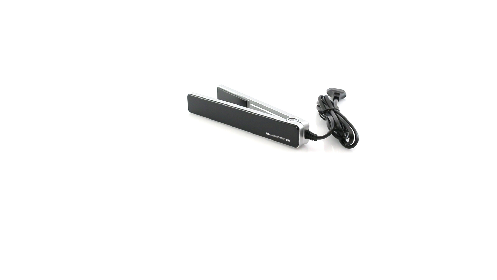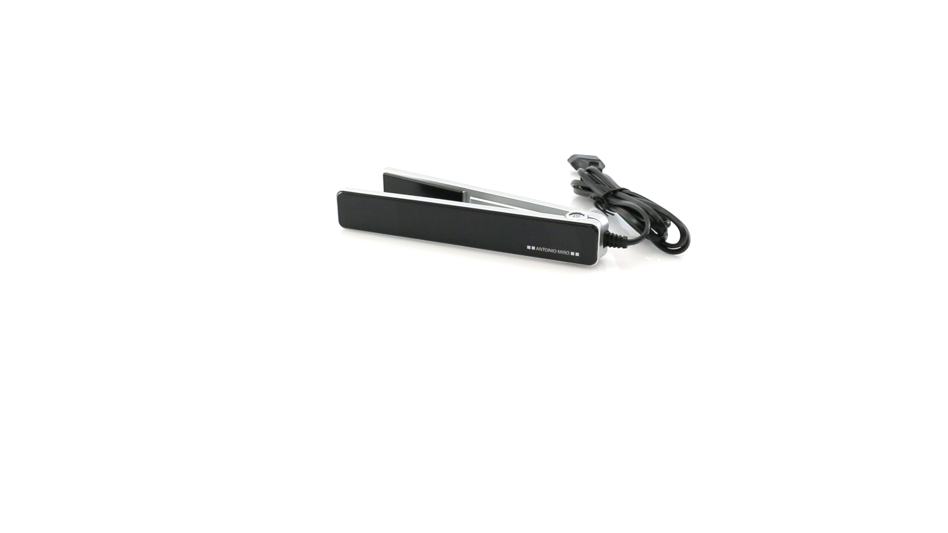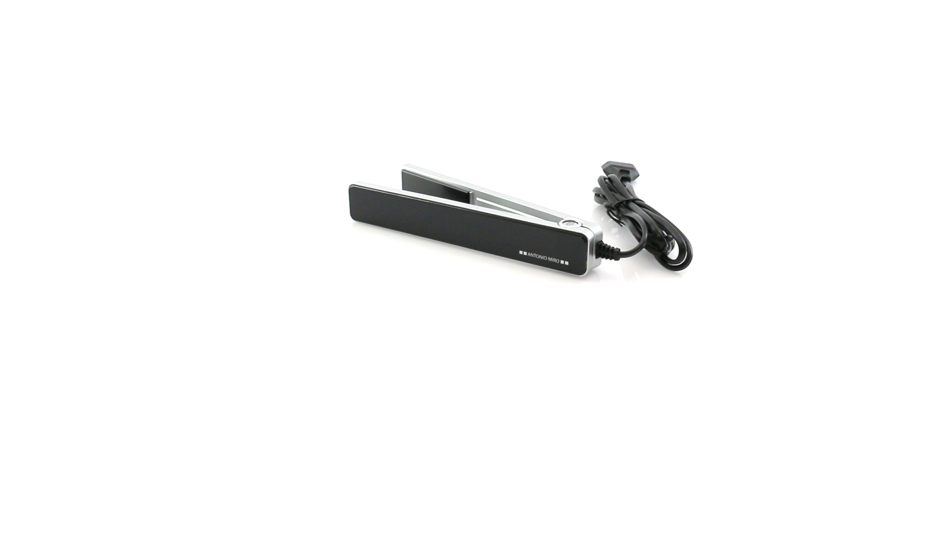 Glätteisen von Antonio Miró mit schlichten Design und Keramikbeschichtung auf den Platten. Präsentiert in einer individuellen, eleganten Box mit dem Markenlogo.