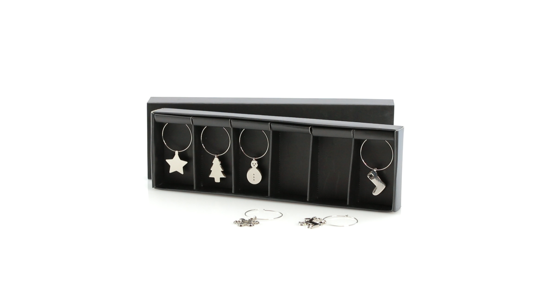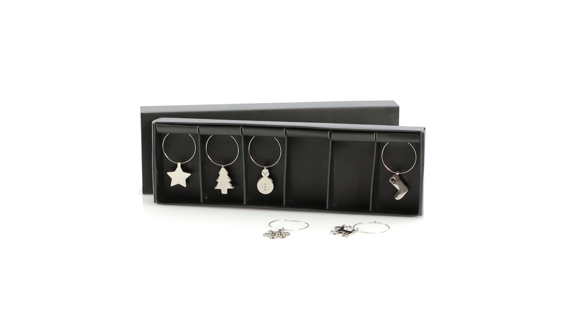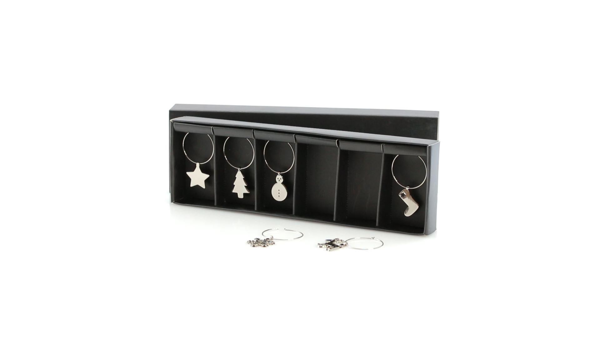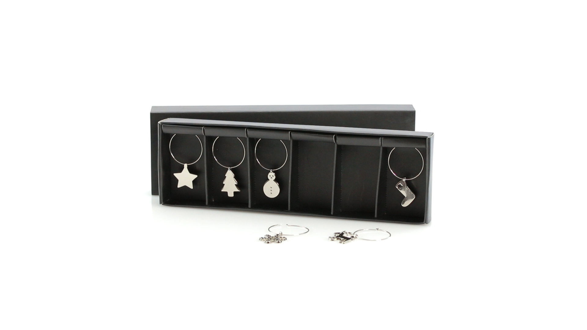 Glasmarkierer aus Metall mit 6 verschiedenen Weihnachtsmotiven in glänzender Metallic-Ausführung. Präsentiert in einer Schachtel mit einzelnen Fächern.