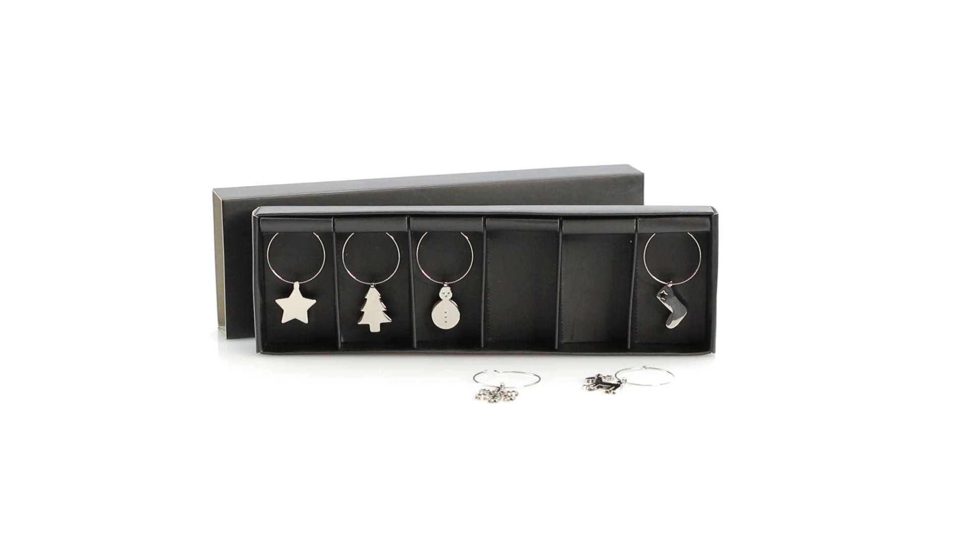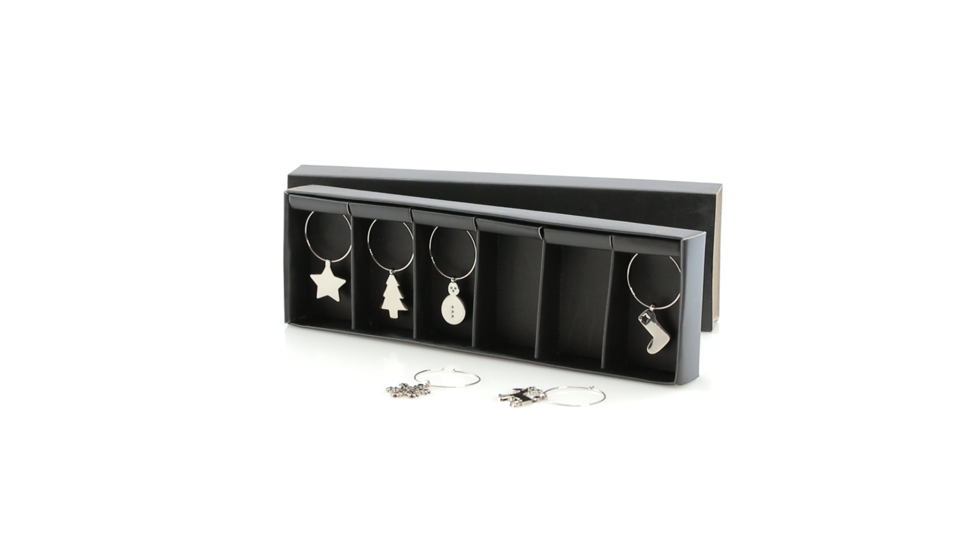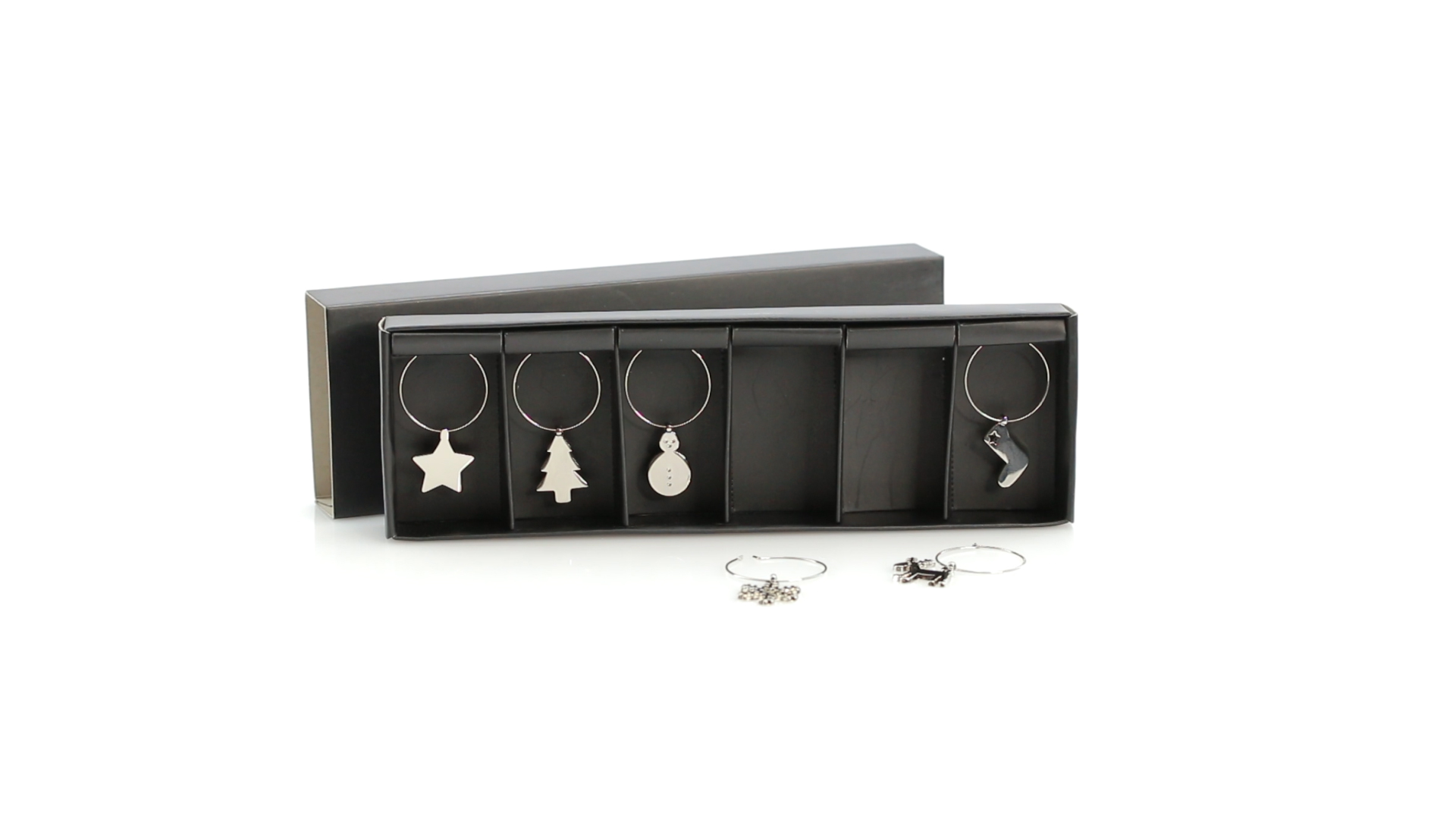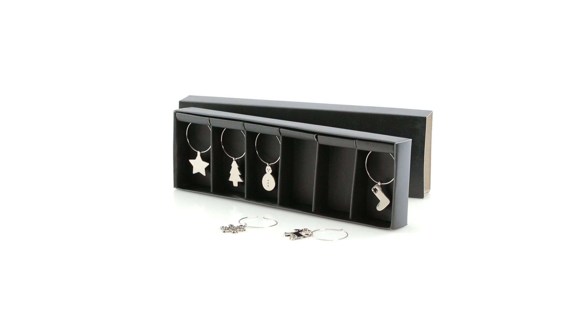 Glasmarkierer aus Metall mit 6 verschiedenen Weihnachtsmotiven in glänzender Metallic-Ausführung. Präsentiert in einer Schachtel mit einzelnen Fächern.