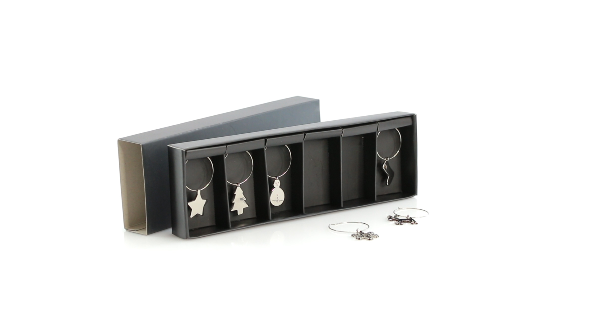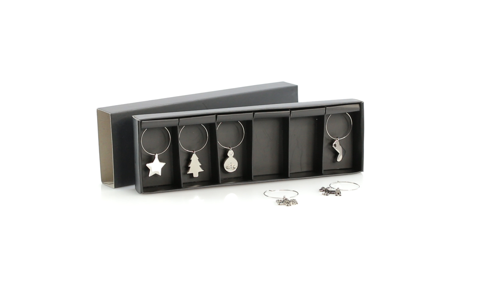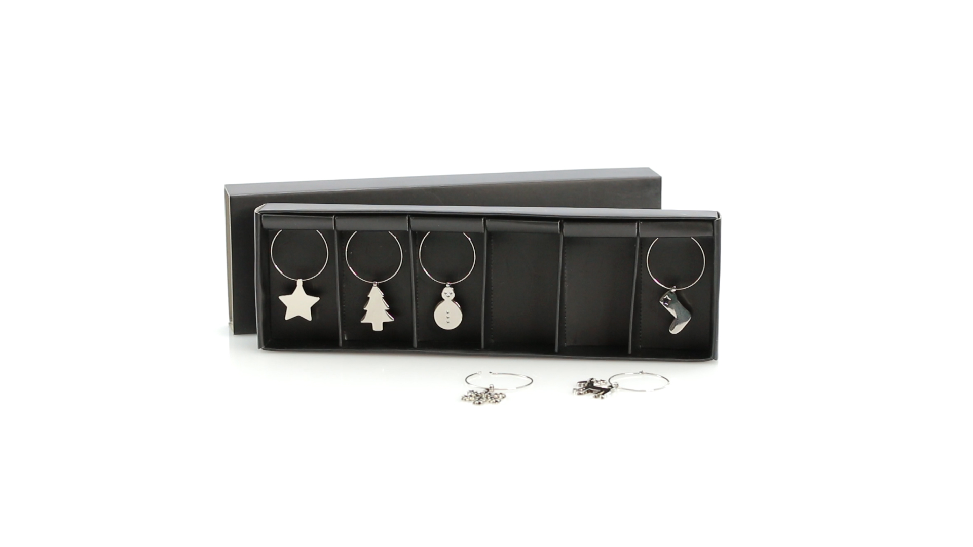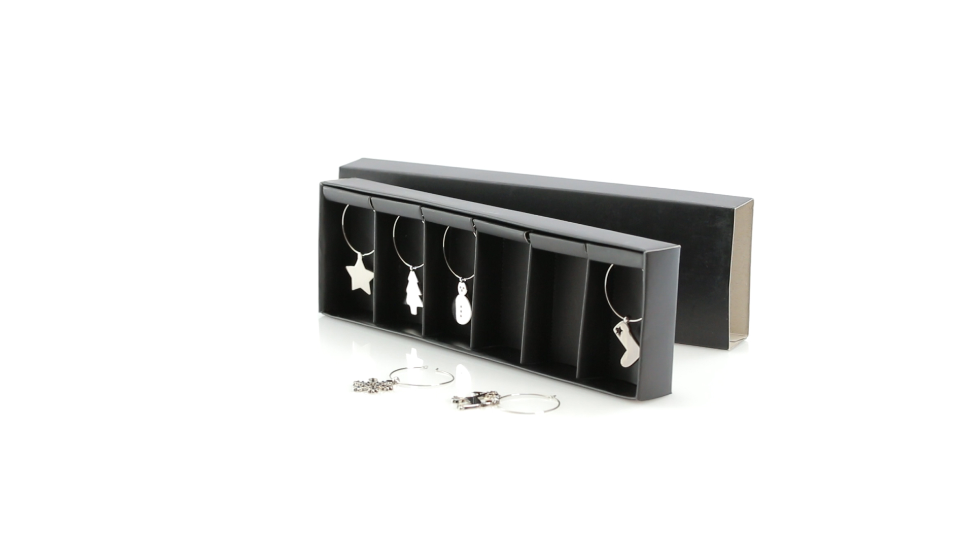 Glasmarkierer aus Metall mit 6 verschiedenen Weihnachtsmotiven in glänzender Metallic-Ausführung. Präsentiert in einer Schachtel mit einzelnen Fächern.