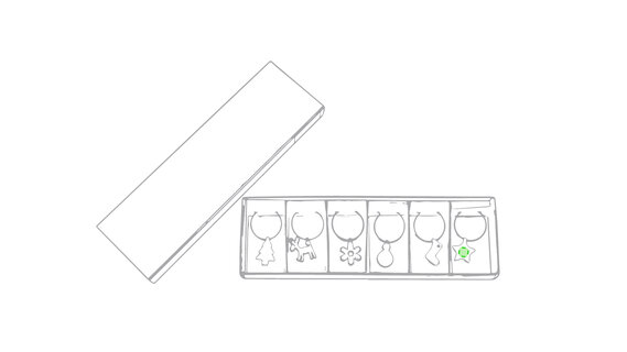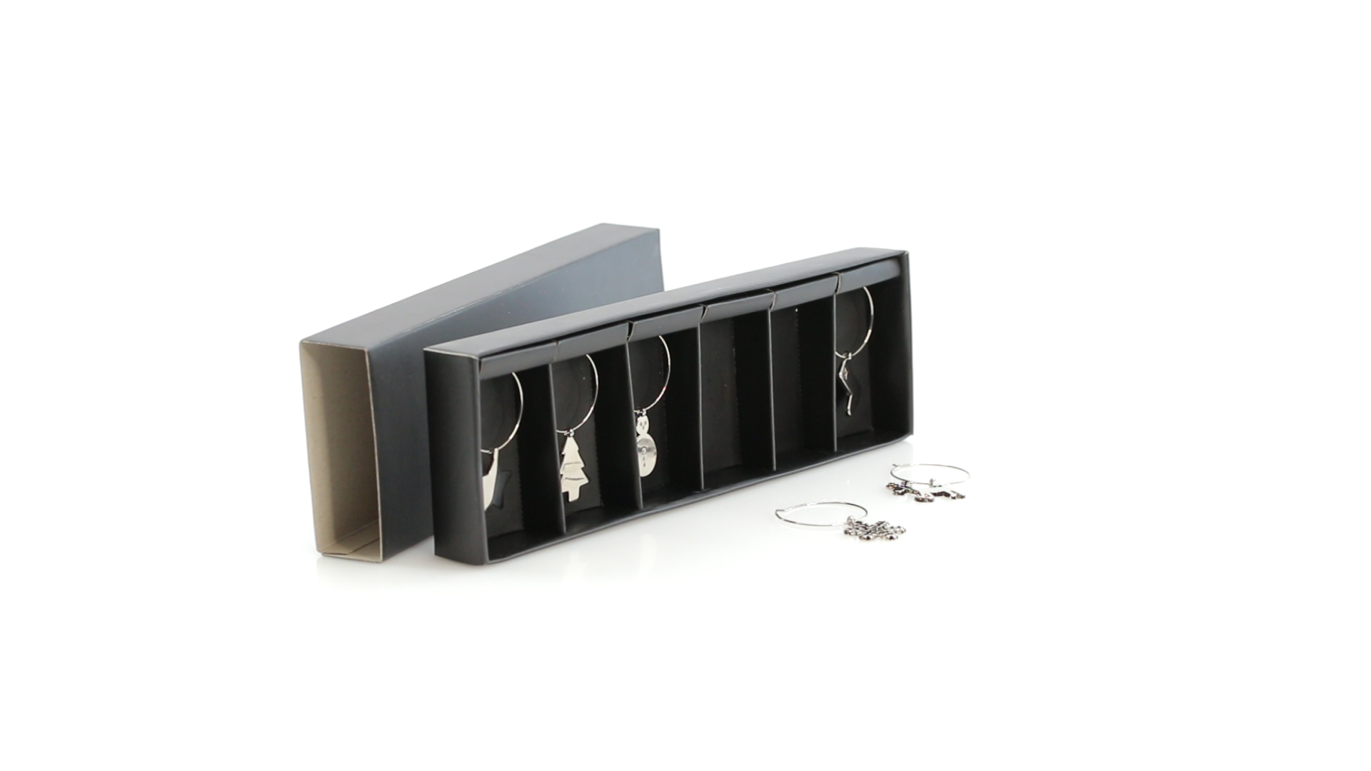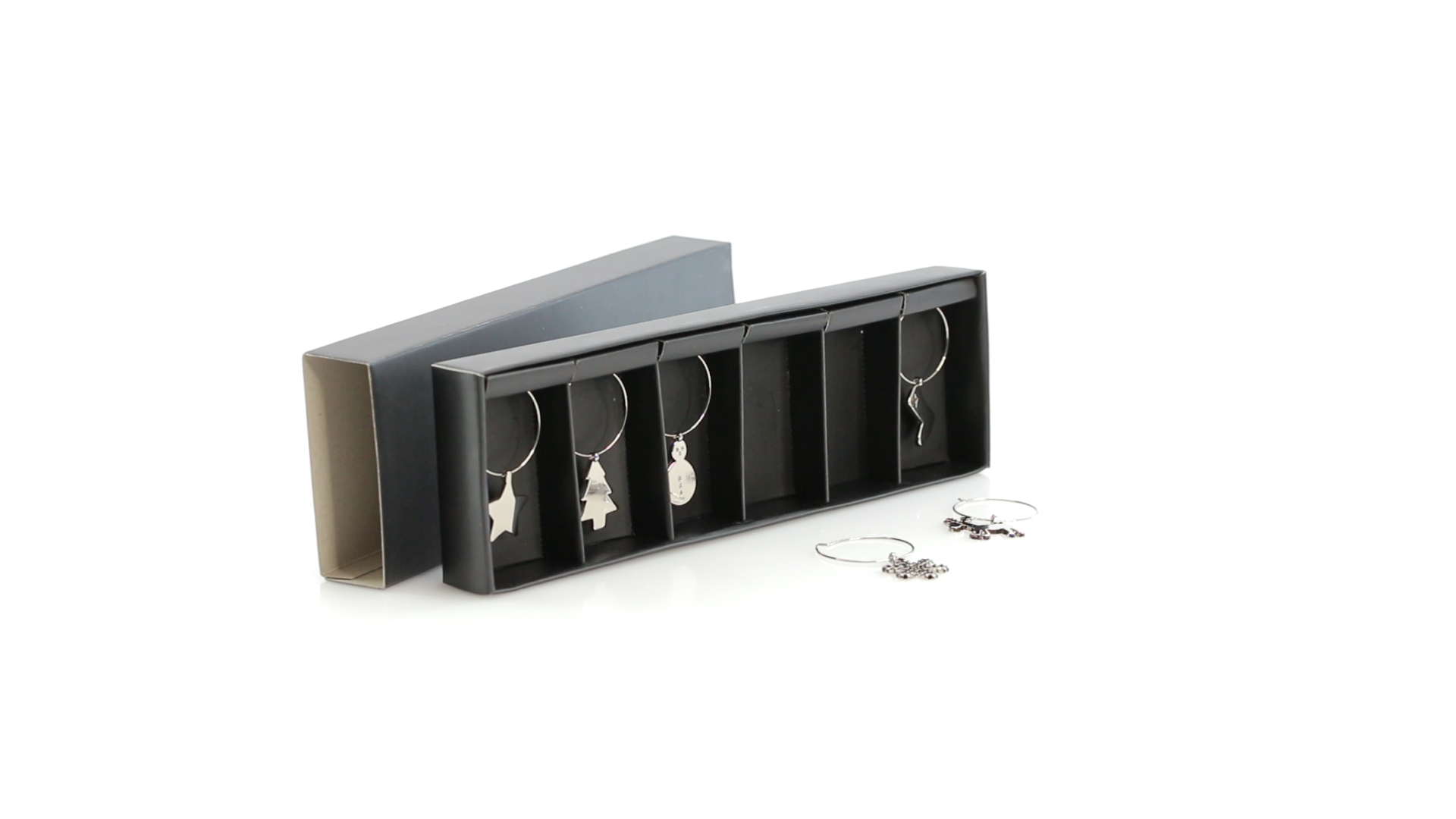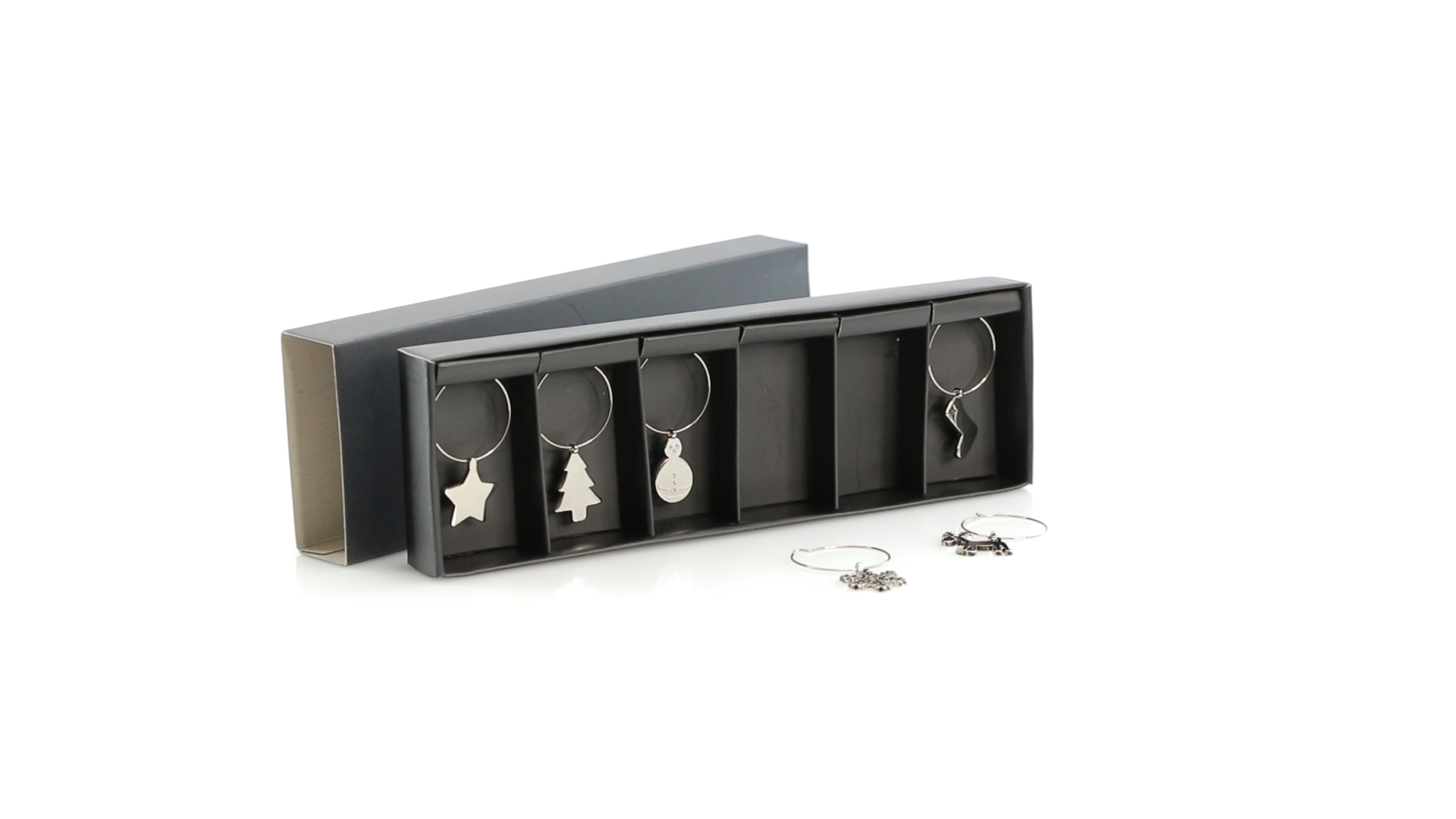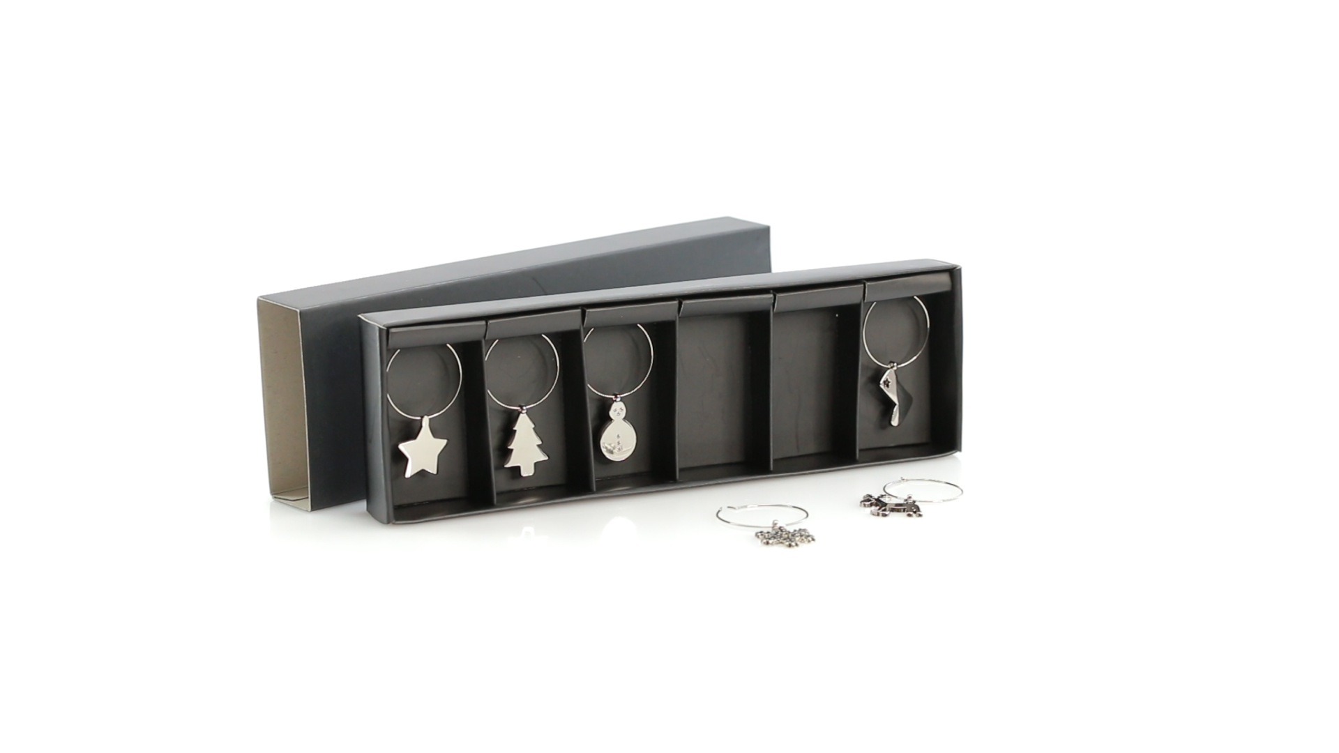 Glasmarkierer aus Metall mit 6 verschiedenen Weihnachtsmotiven in glänzender Metallic-Ausführung. Präsentiert in einer Schachtel mit einzelnen Fächern.