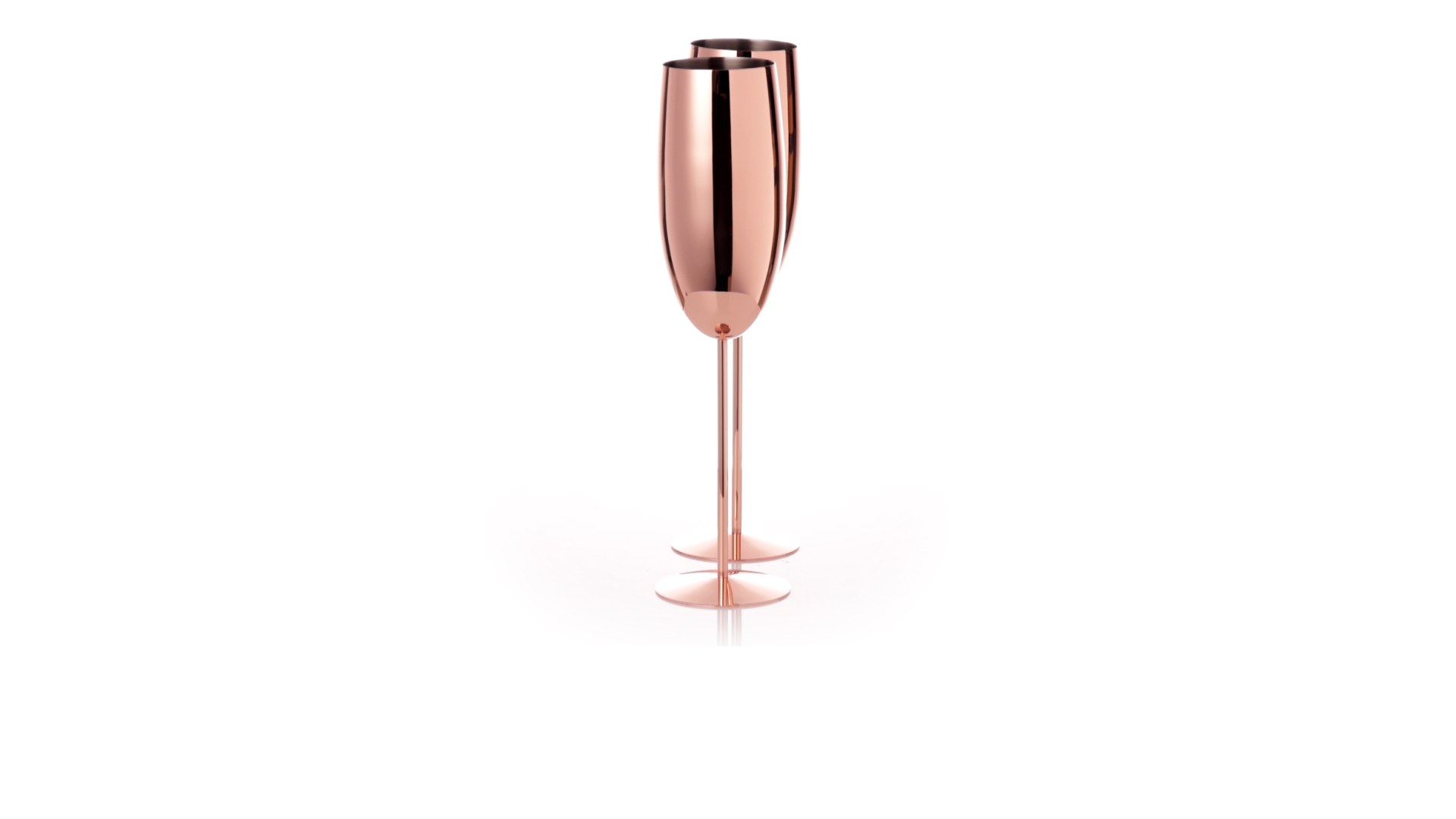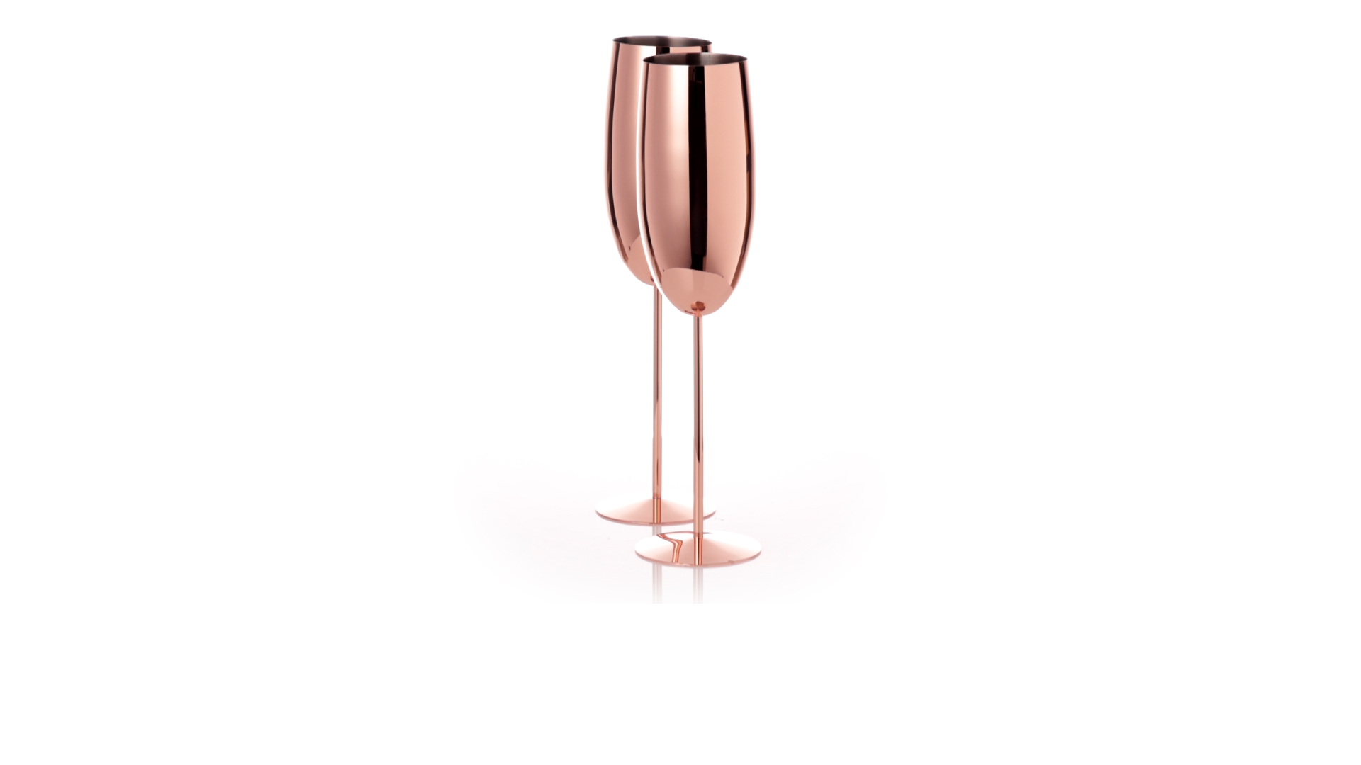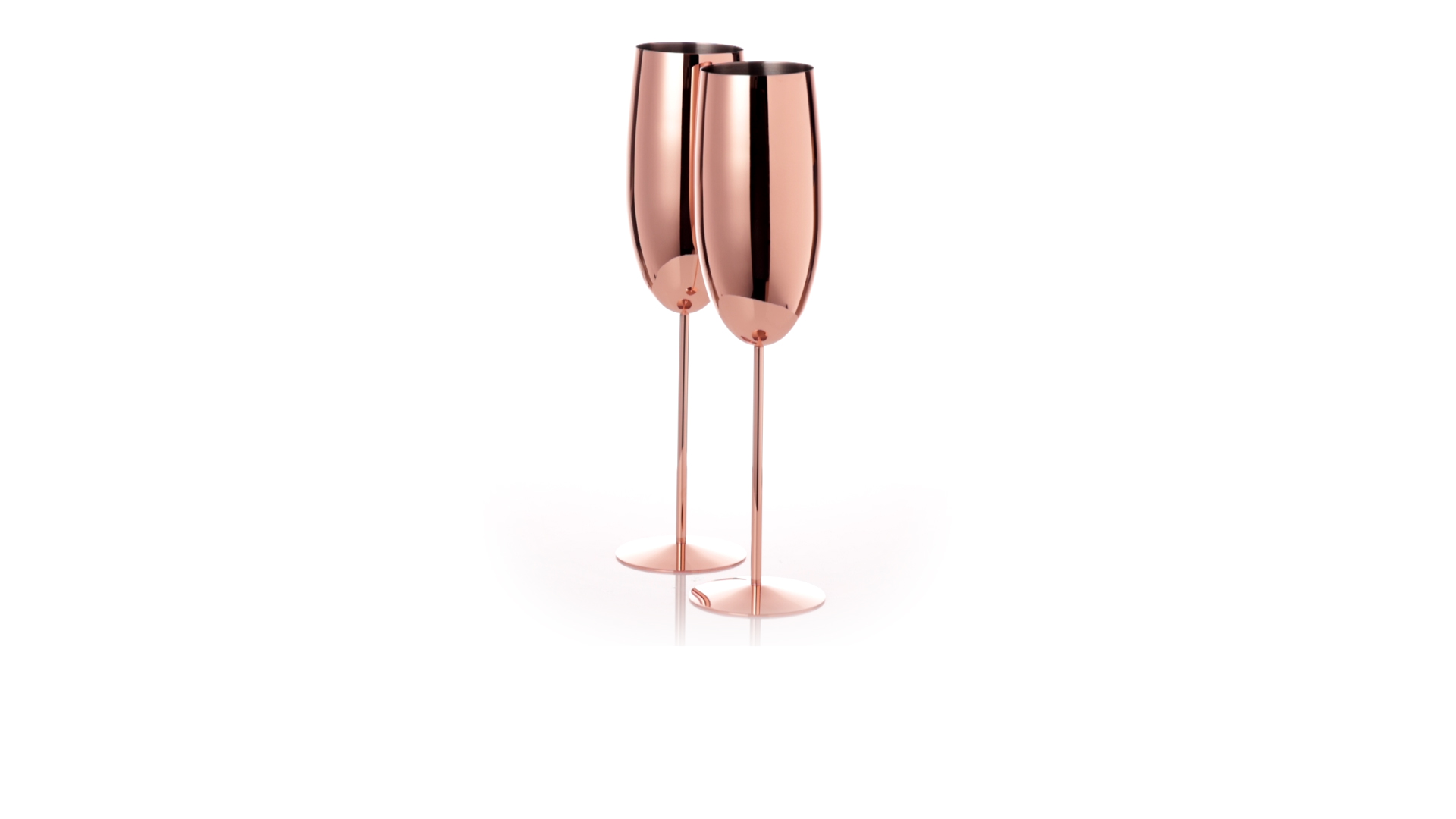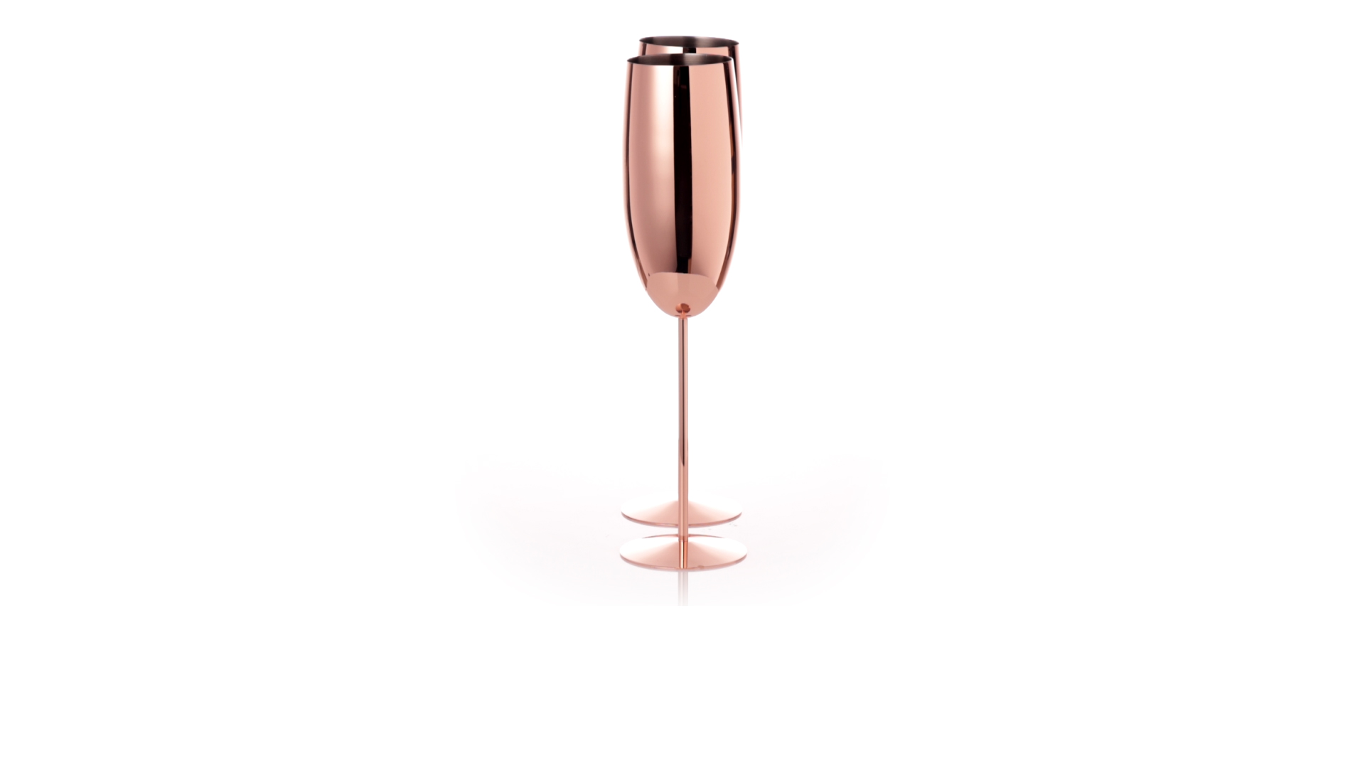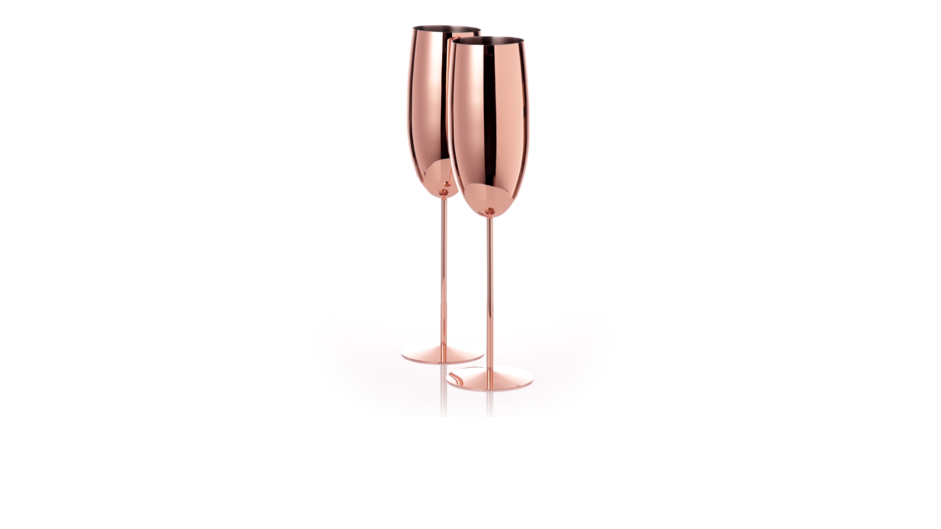 Gläserset mit 270 ml Fassungsvermögen und raffiniertem Design. Aus rostfreiem Stahl, mit galvanisierter Kupferbeschichtung und glänzender Oberfläche. Präsentiert in einer exklusiven, individuellen schwarzen Designbox.