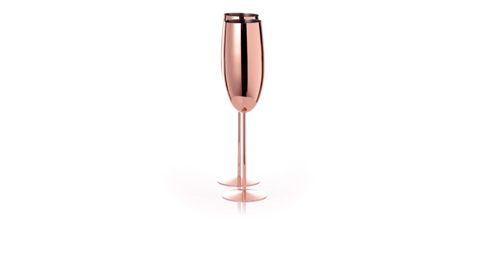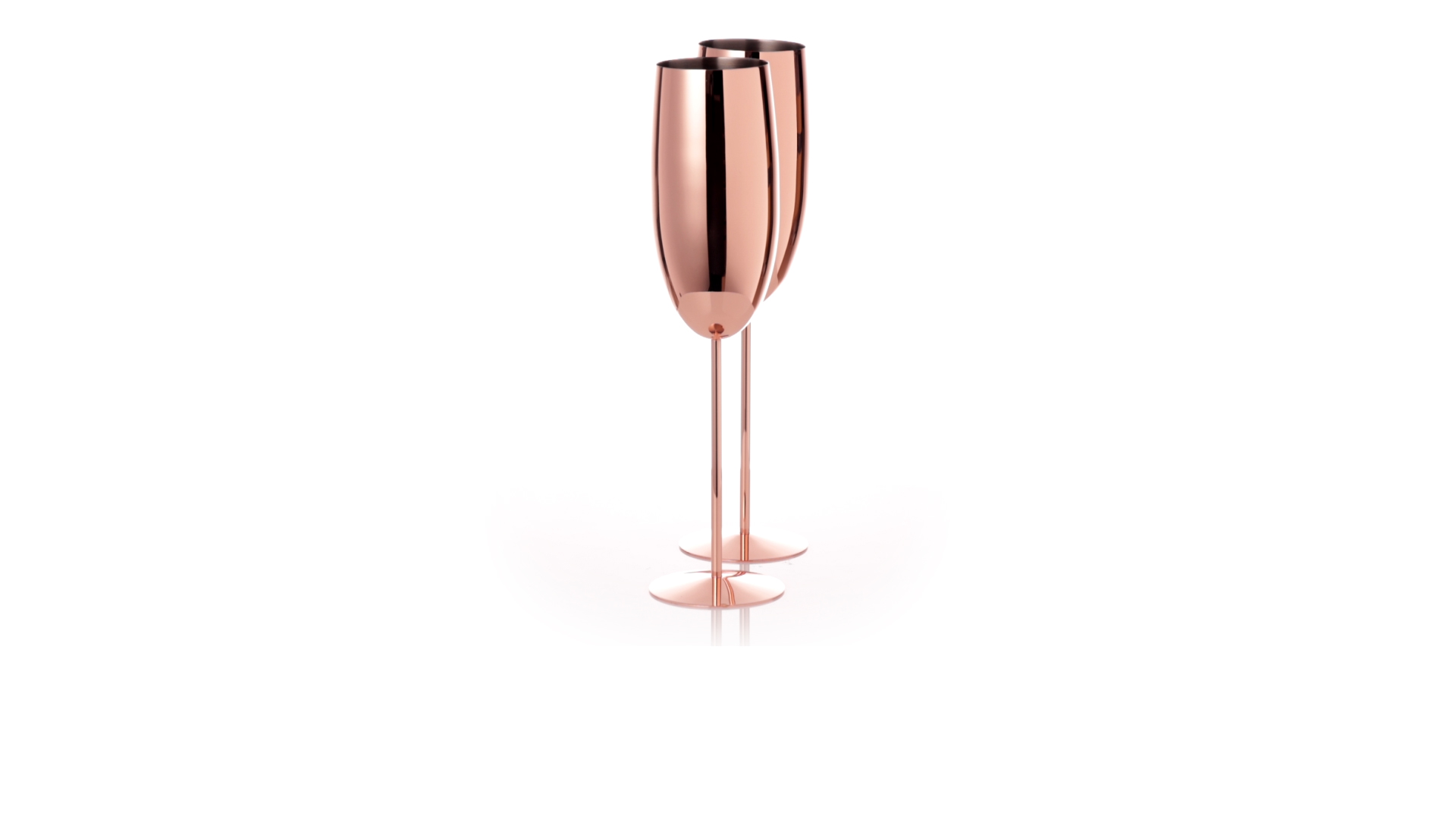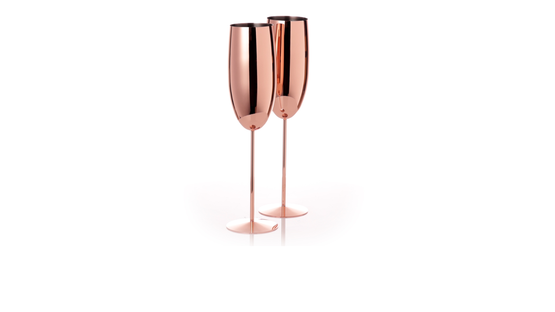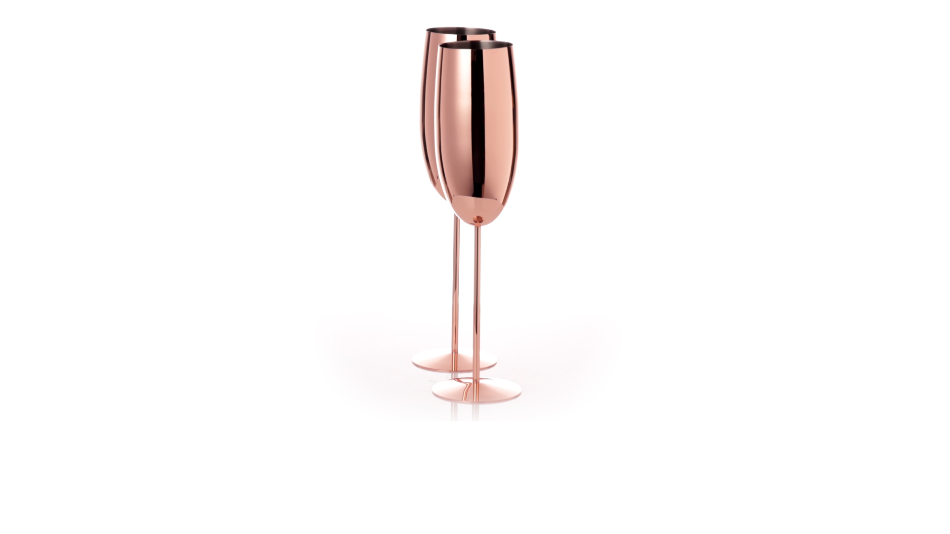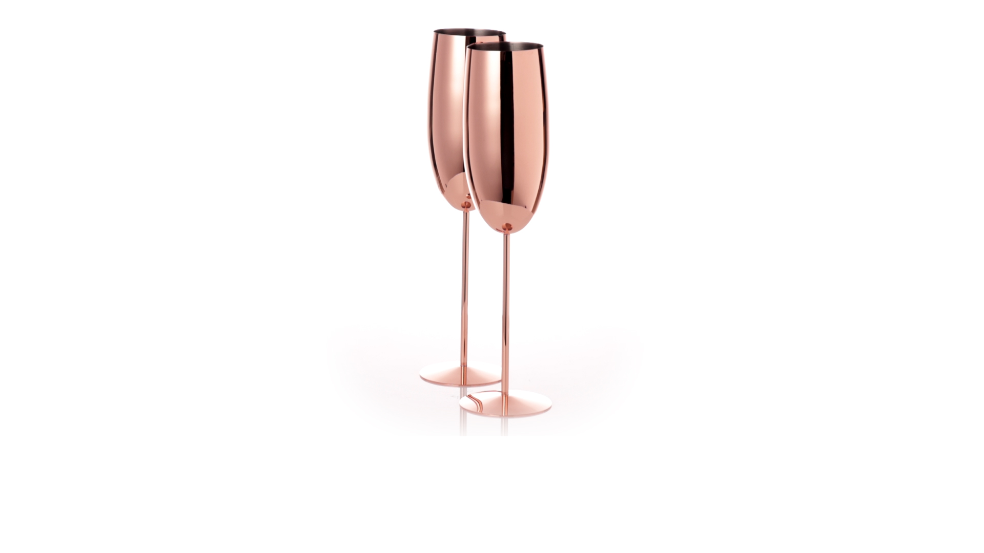 Gläserset mit 270 ml Fassungsvermögen und raffiniertem Design. Aus rostfreiem Stahl, mit galvanisierter Kupferbeschichtung und glänzender Oberfläche. Präsentiert in einer exklusiven, individuellen schwarzen Designbox.