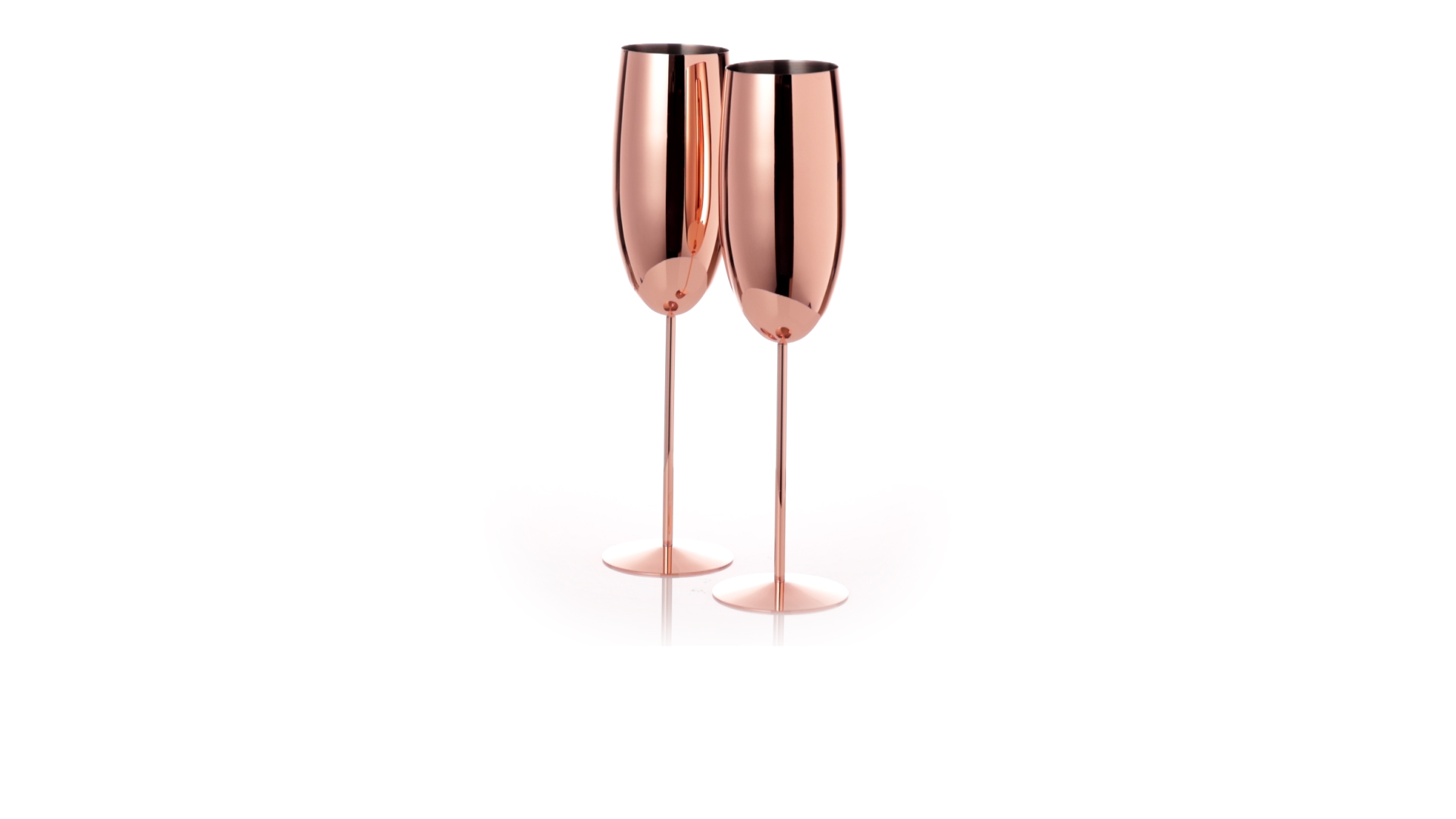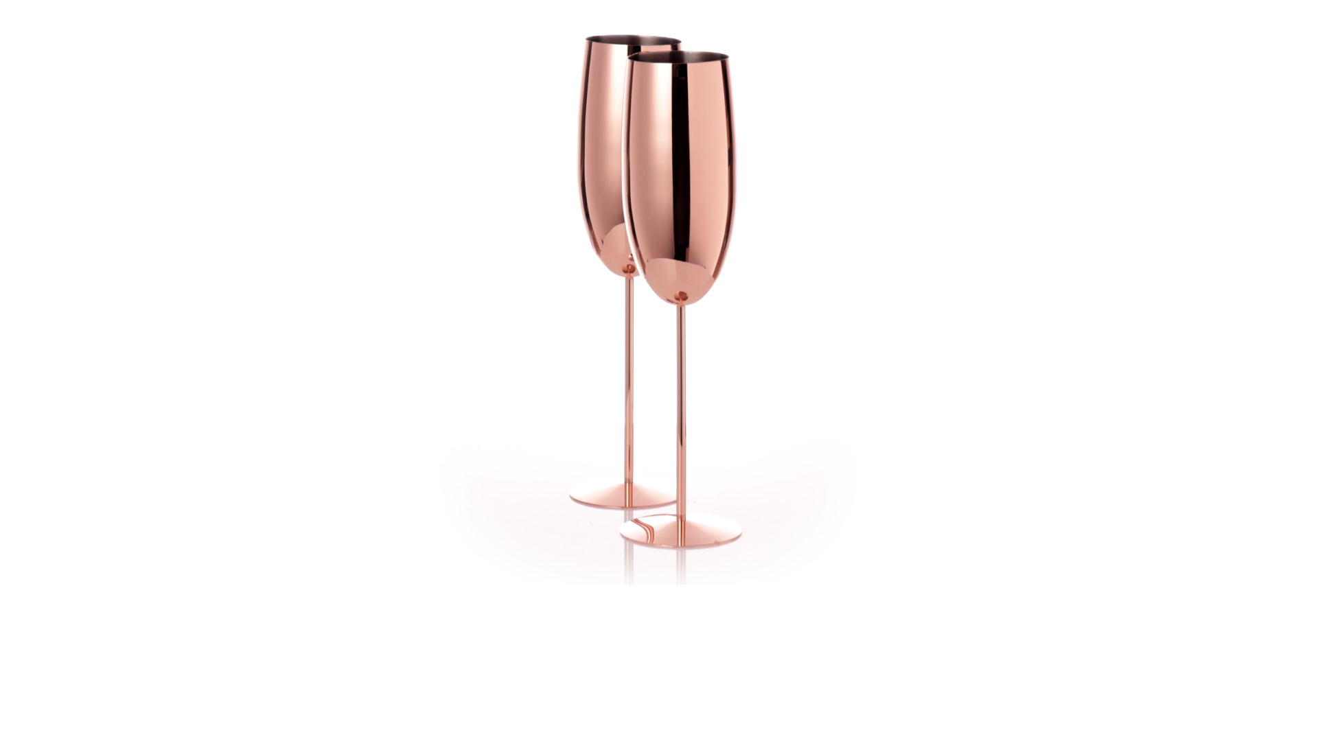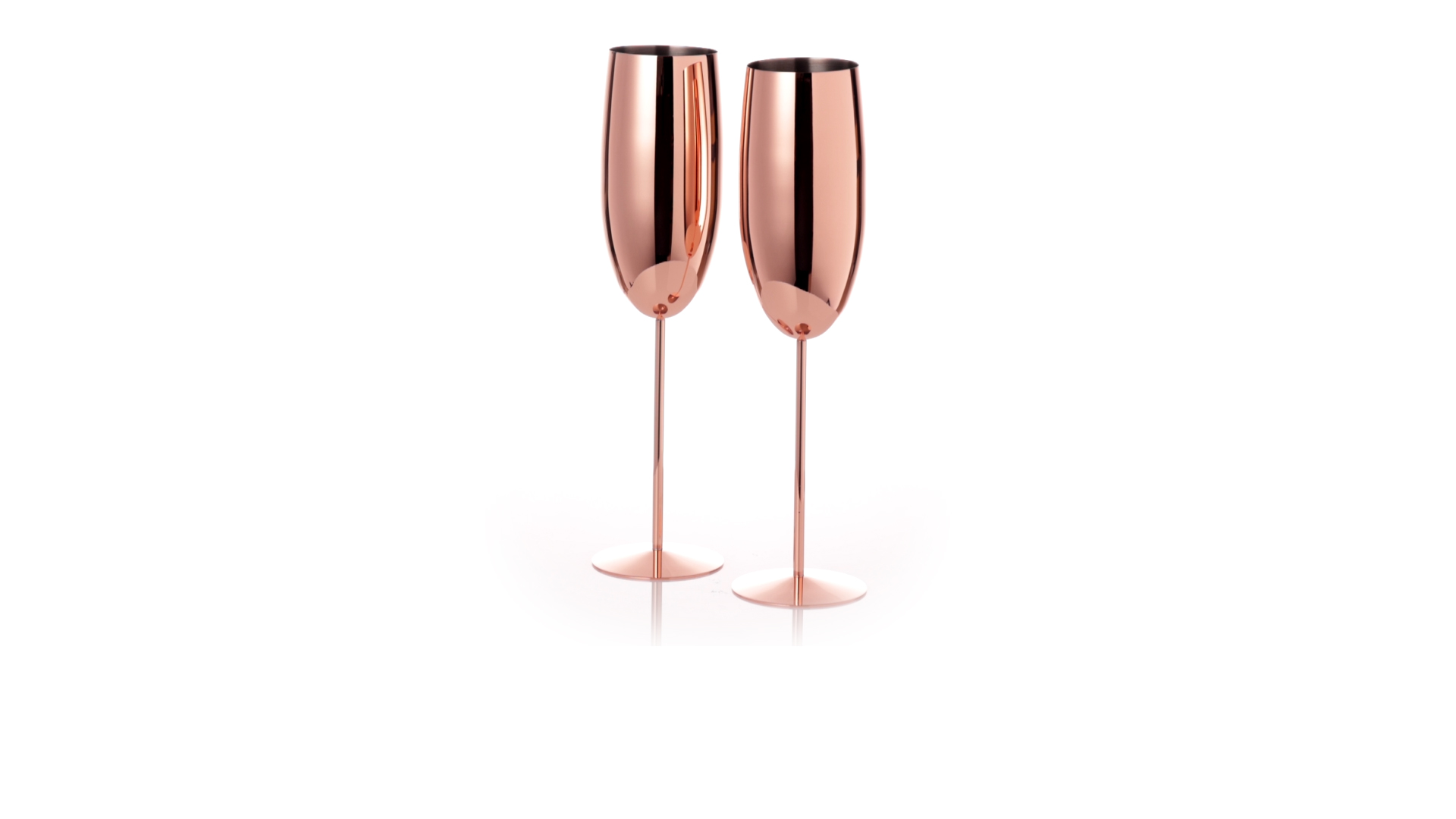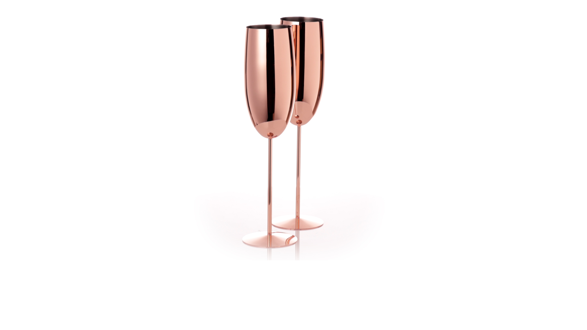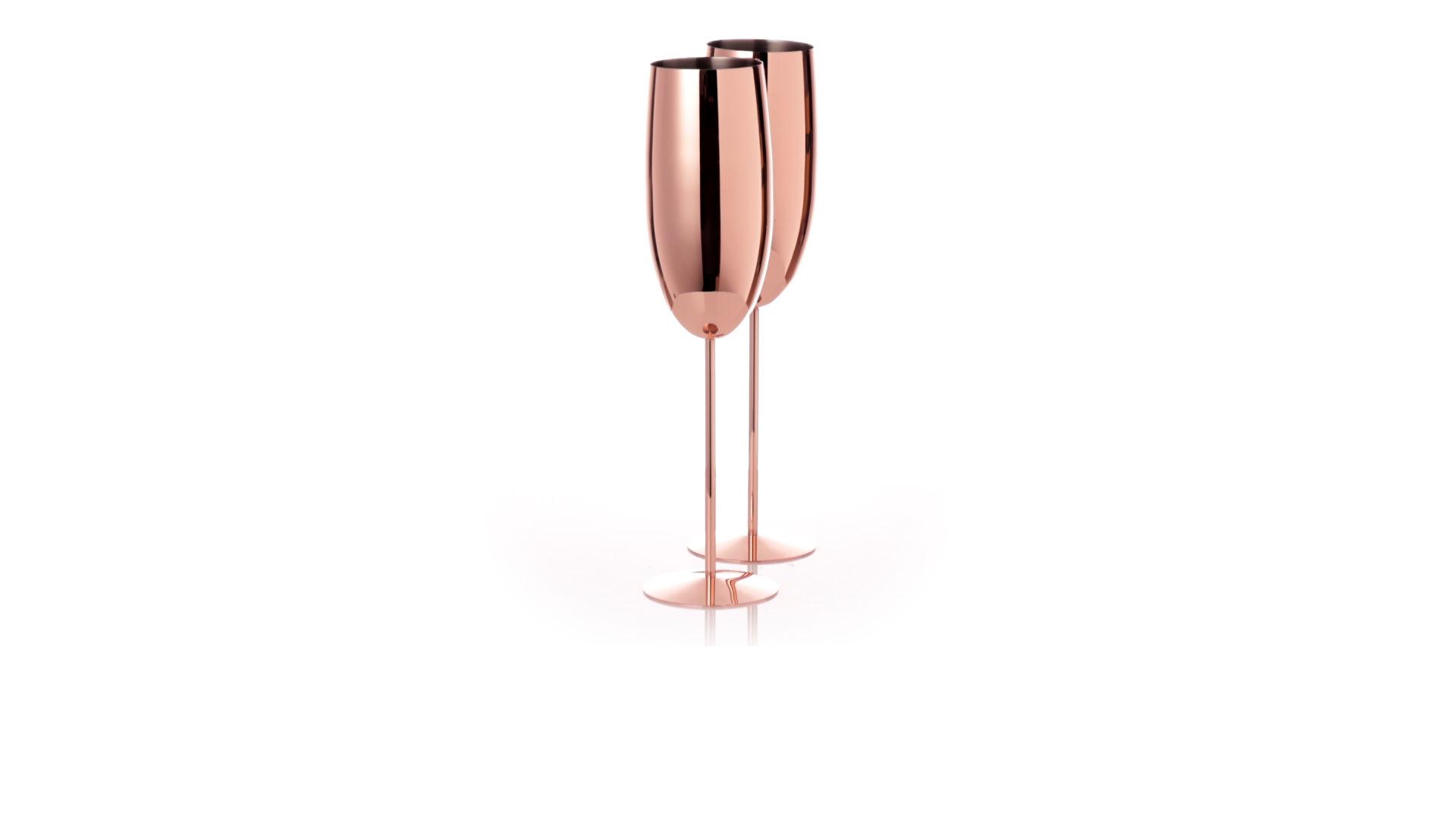 Gläserset mit 270 ml Fassungsvermögen und raffiniertem Design. Aus rostfreiem Stahl, mit galvanisierter Kupferbeschichtung und glänzender Oberfläche. Präsentiert in einer exklusiven, individuellen schwarzen Designbox.