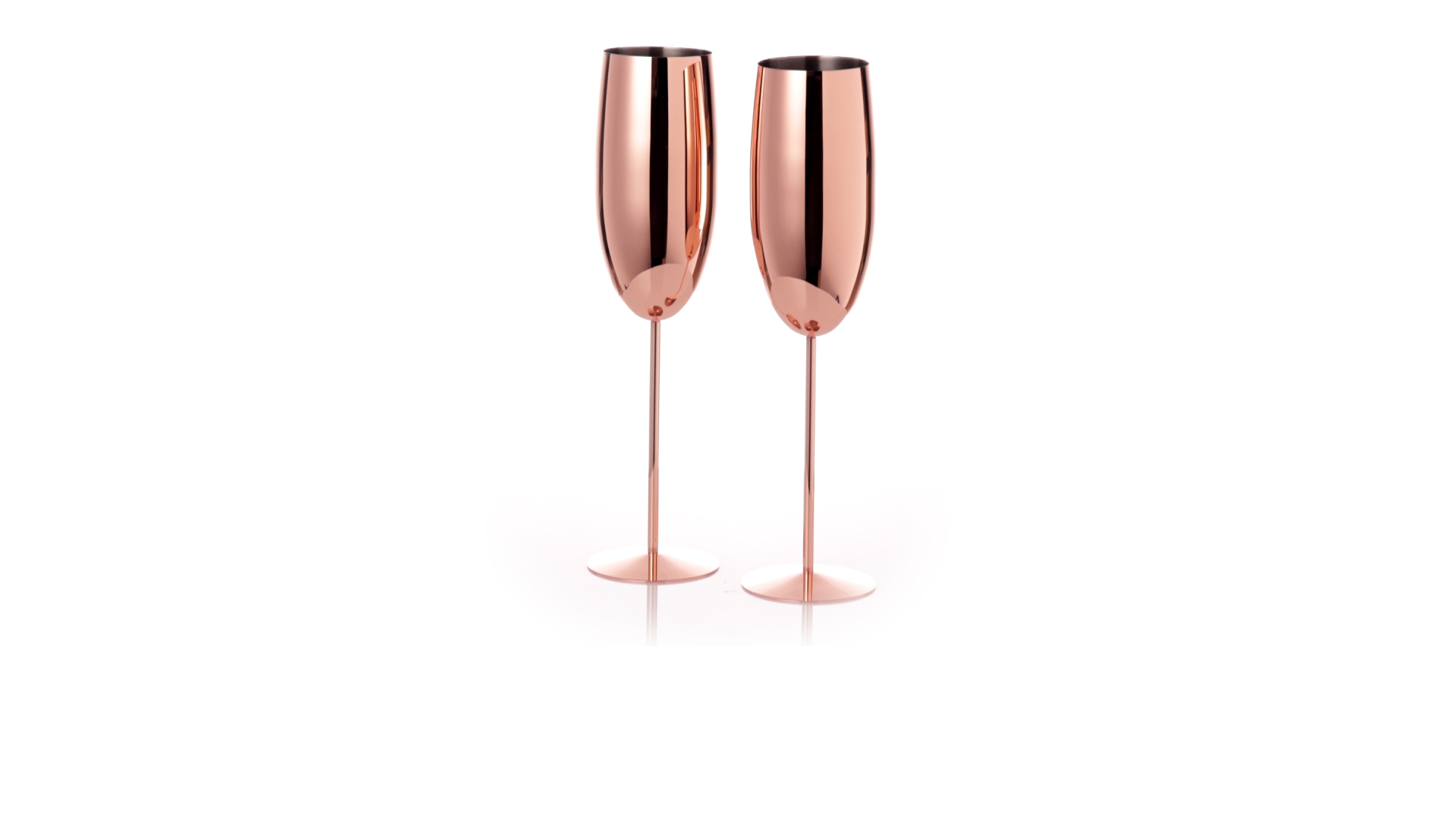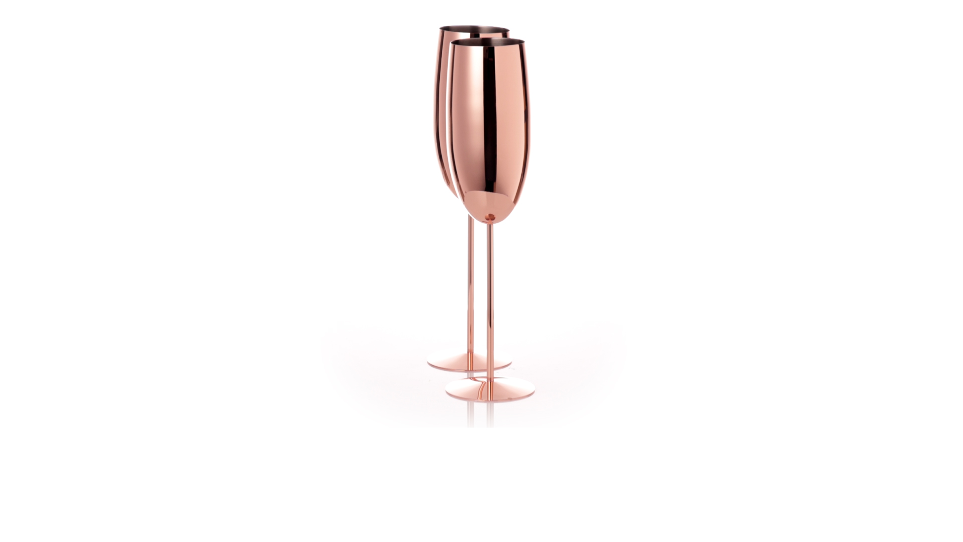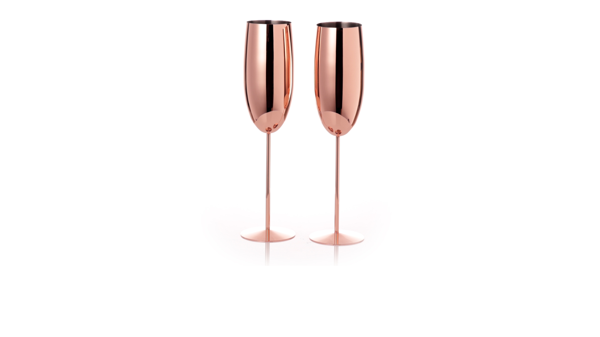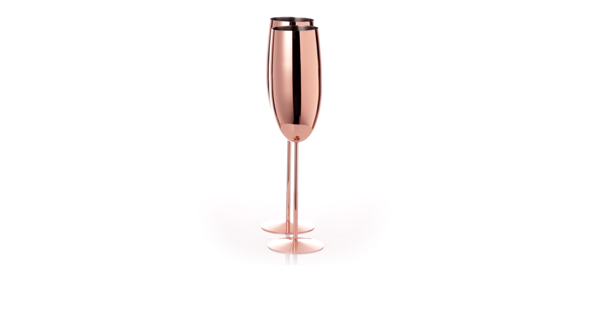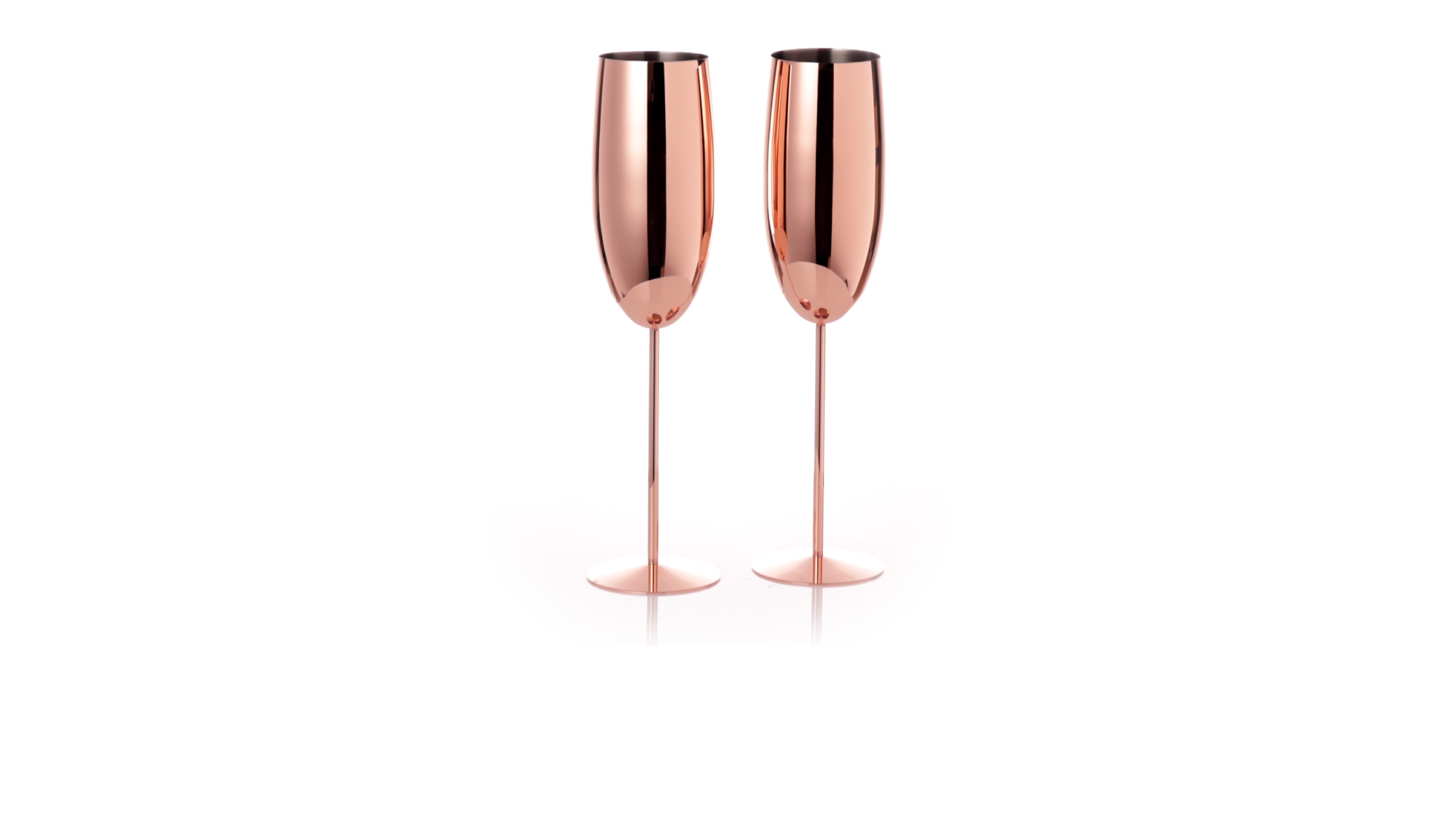 Gläserset mit 270 ml Fassungsvermögen und raffiniertem Design. Aus rostfreiem Stahl, mit galvanisierter Kupferbeschichtung und glänzender Oberfläche. Präsentiert in einer exklusiven, individuellen schwarzen Designbox.