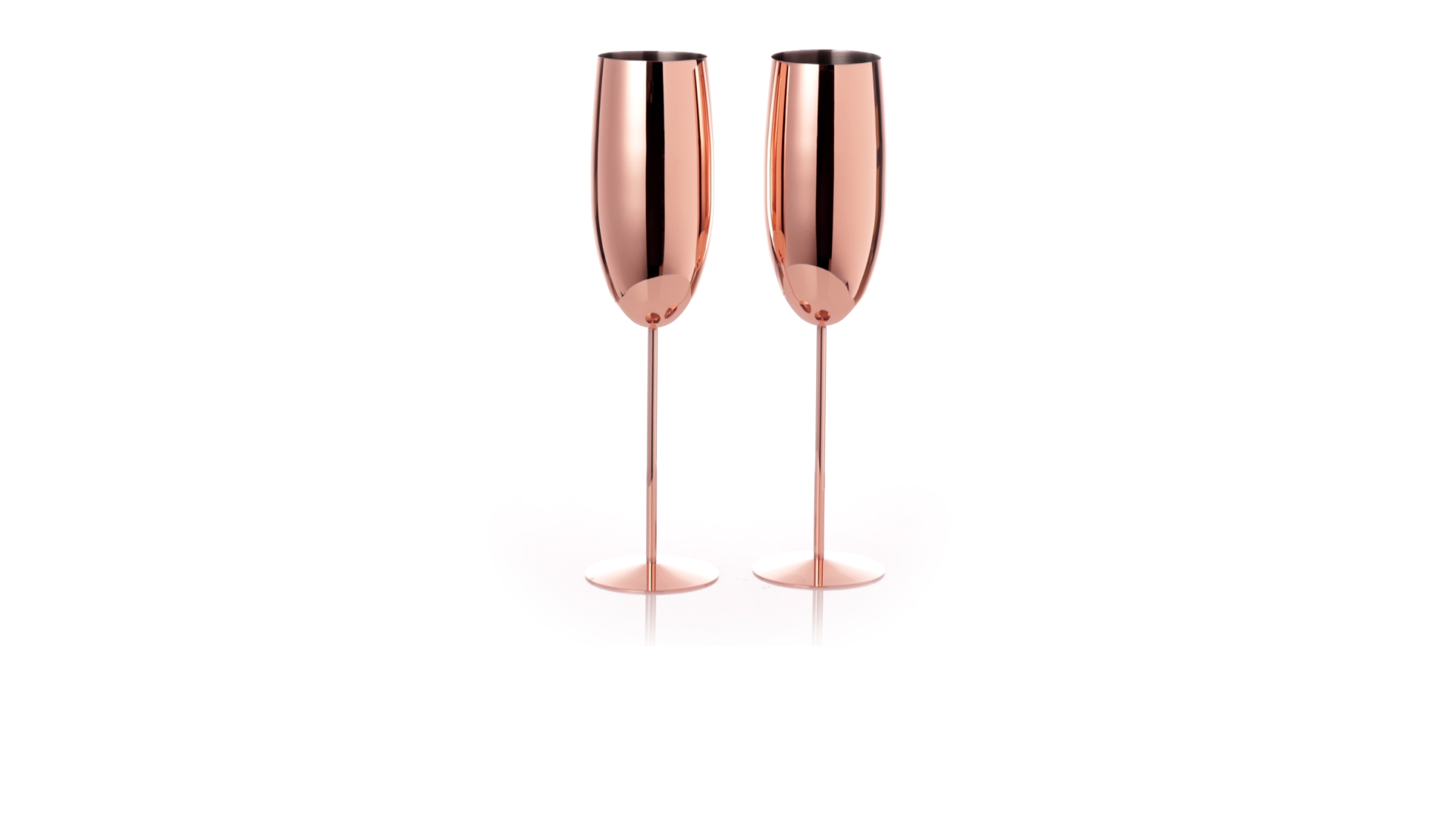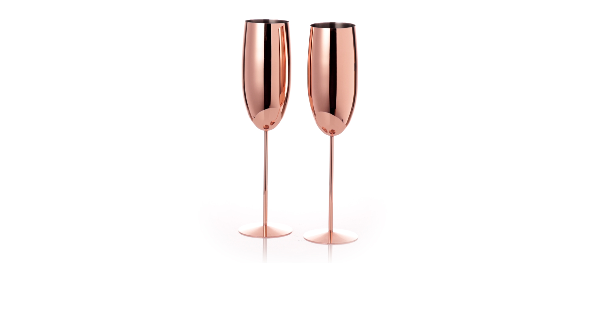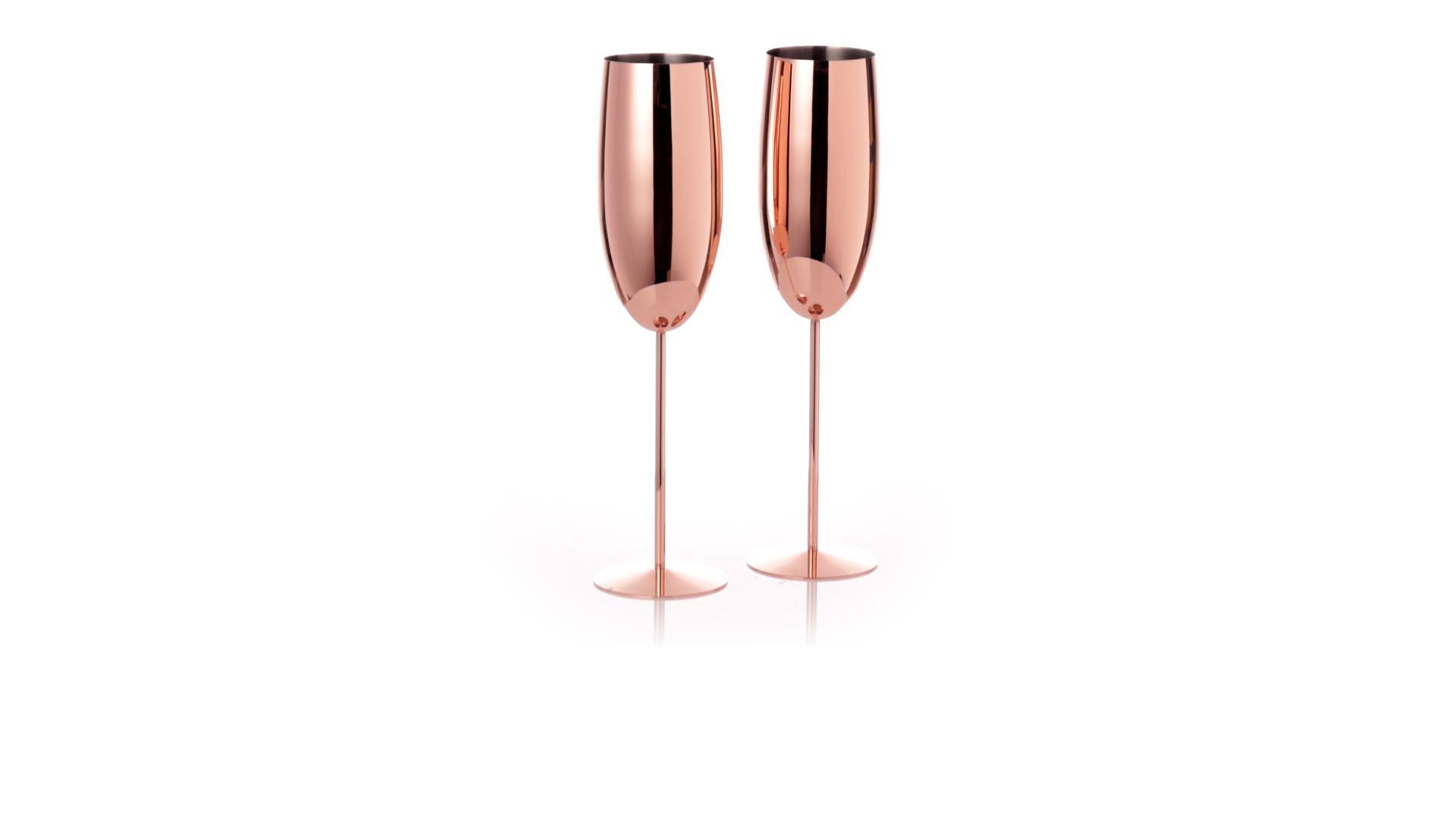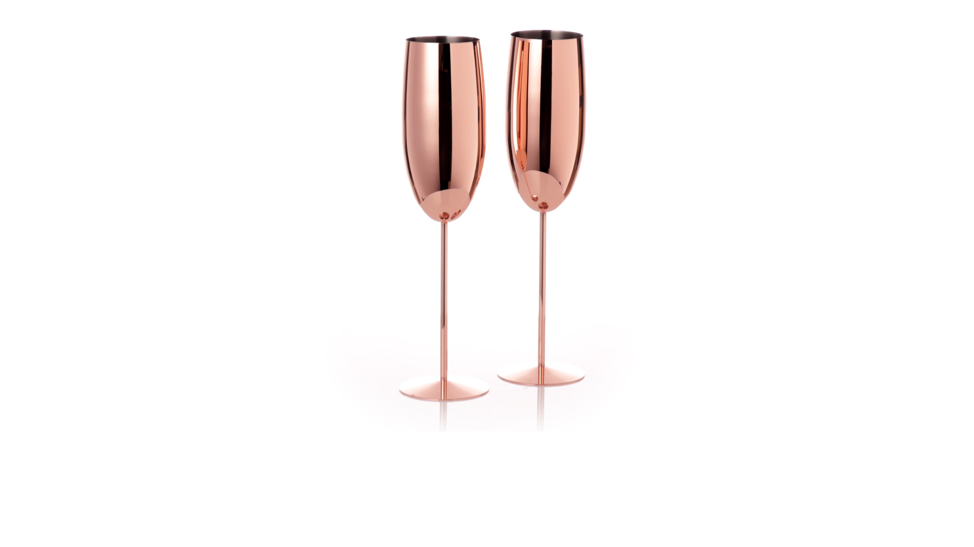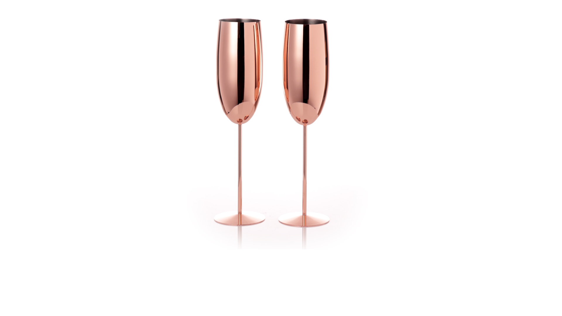Gläserset mit 270 ml Fassungsvermögen und raffiniertem Design. Aus rostfreiem Stahl, mit galvanisierter Kupferbeschichtung und glänzender Oberfläche. Präsentiert in einer exklusiven, individuellen schwarzen Designbox.