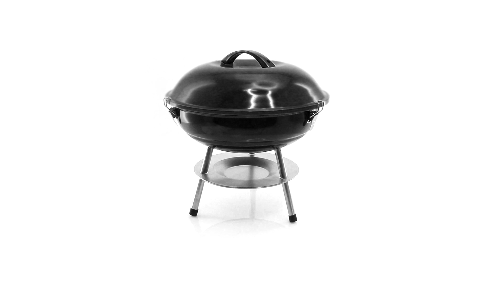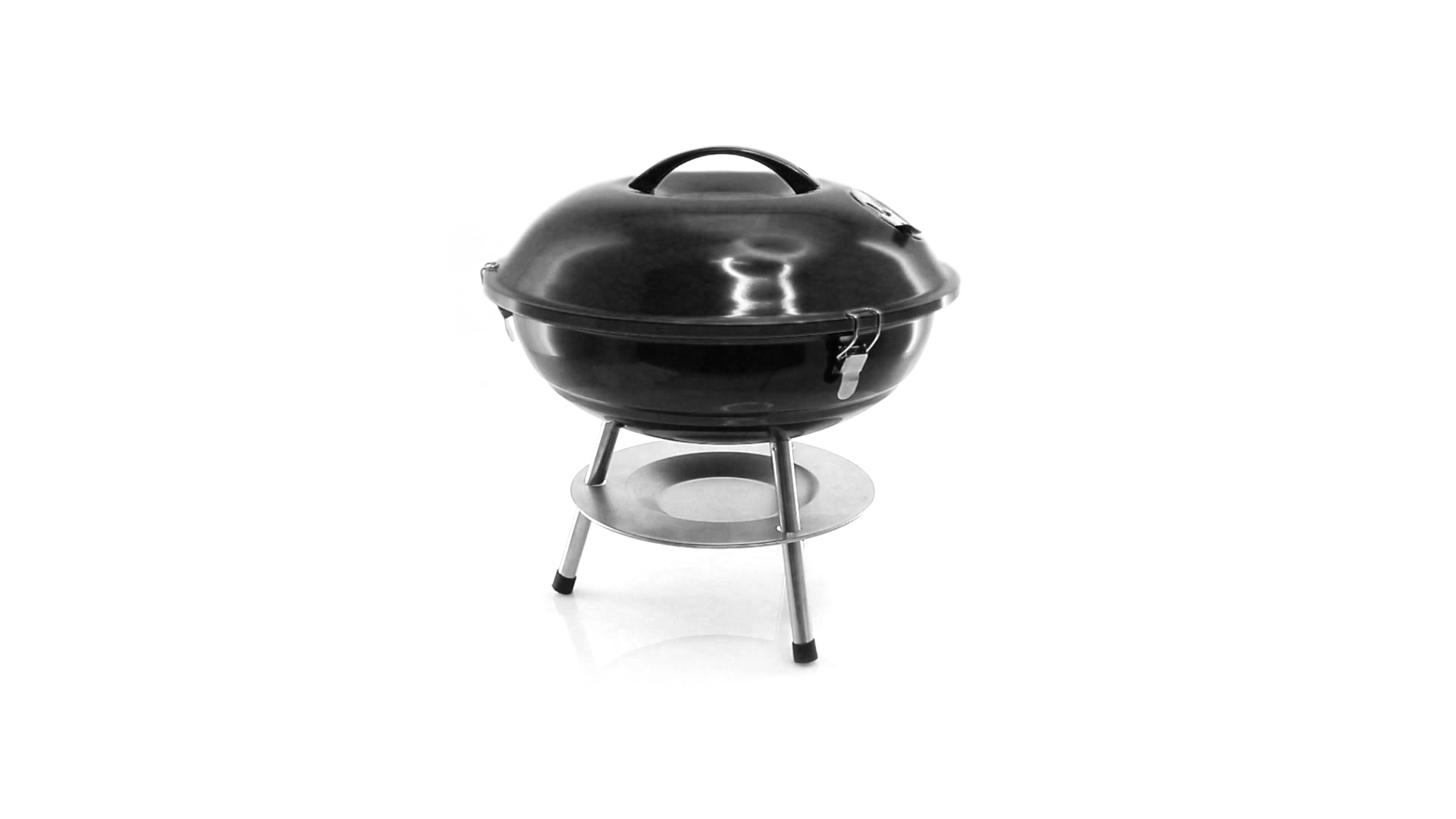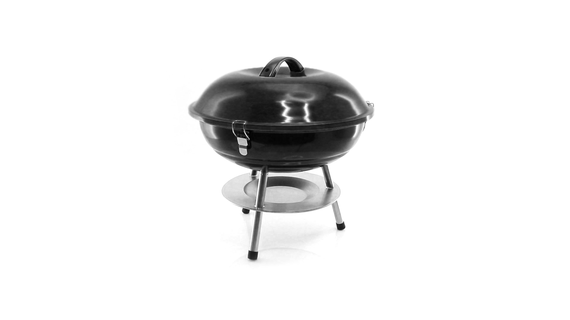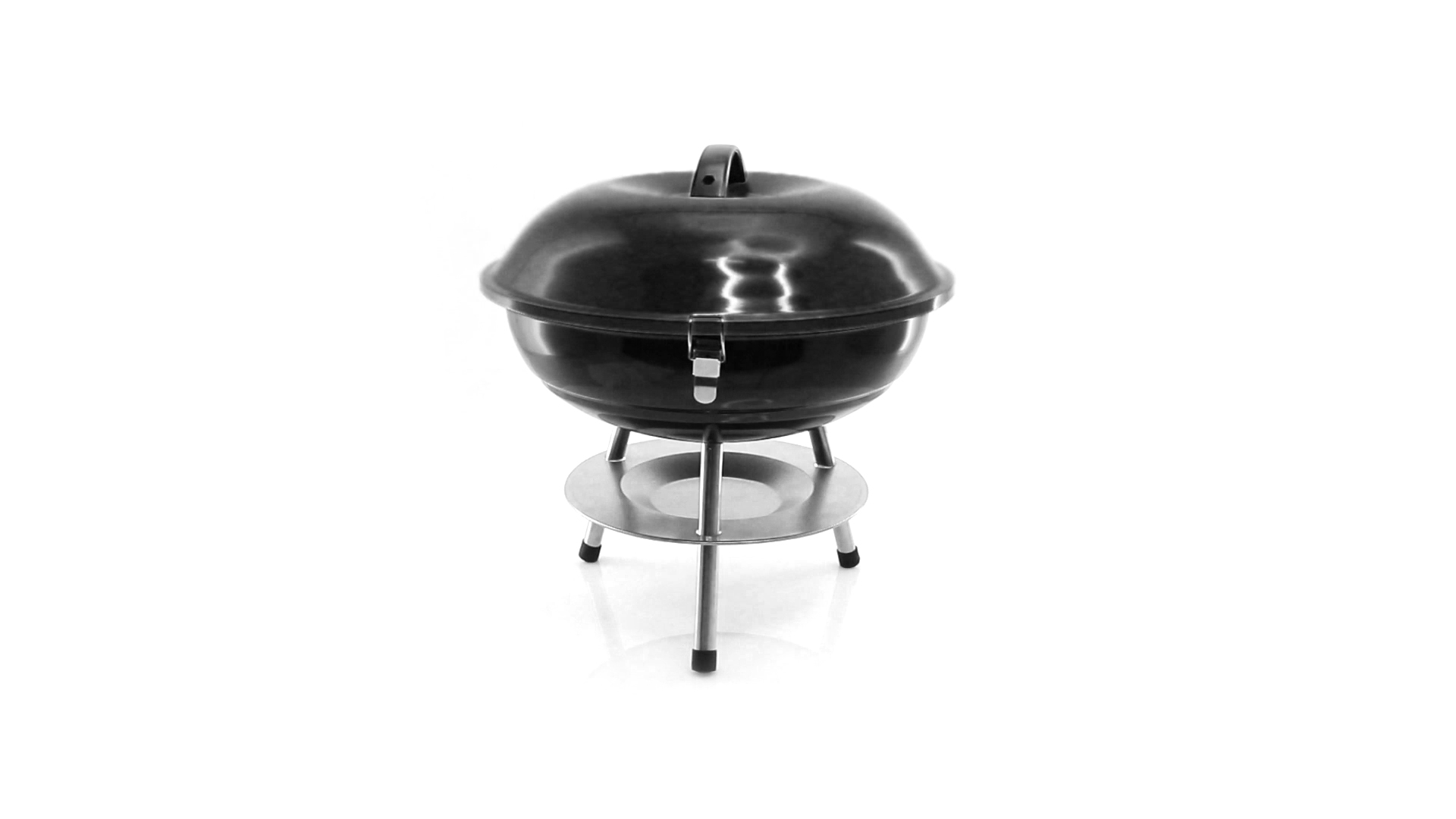 Grill aus widerstandsfähigem Kohlenstoffstahl mit schwarzer Oberfläche. Deckel mit komfortablem Griff und Lüftungslöchern, mit Metallgitter, Tropfschutzplatte und rutschfesten Füssen. Präsentiert in einer attraktiven Designbox.