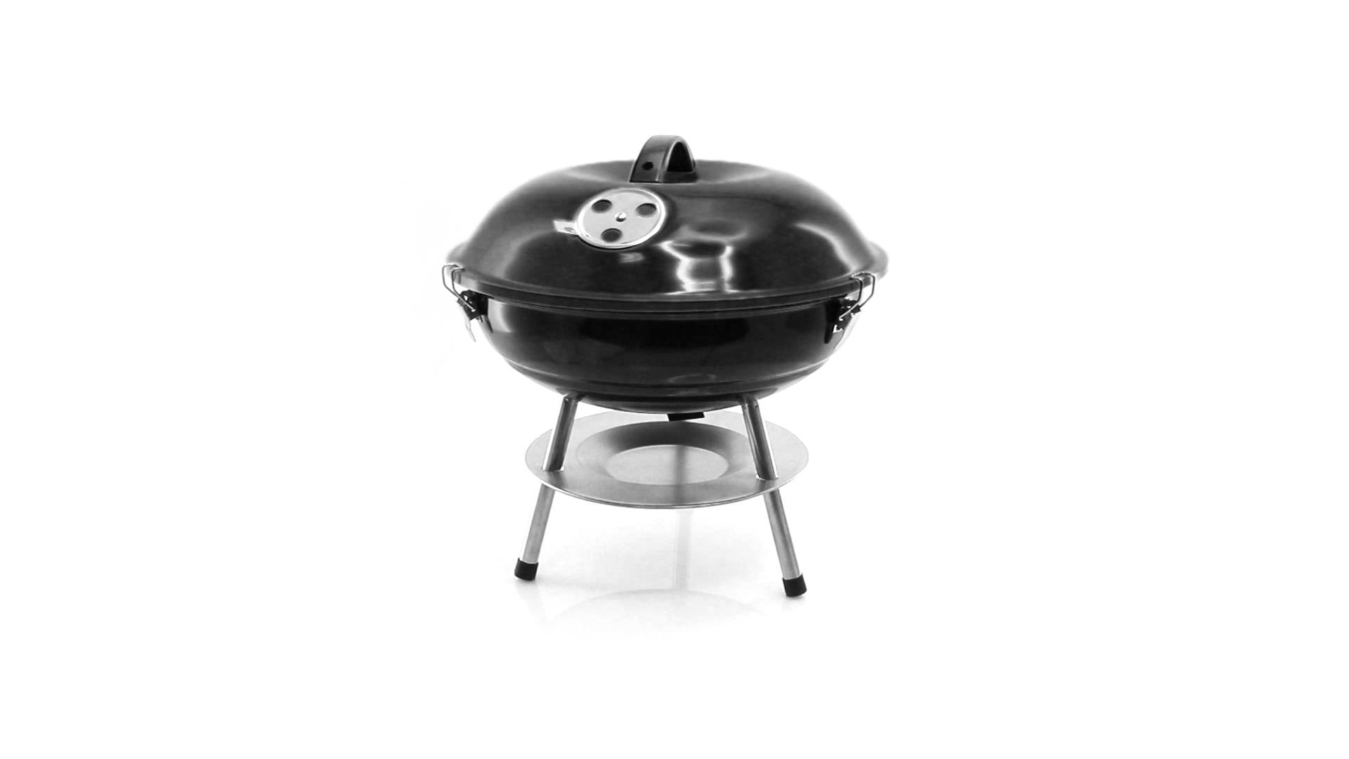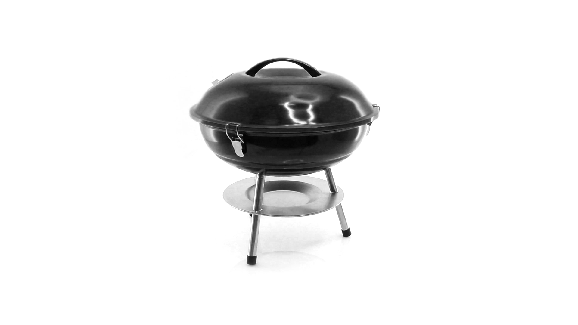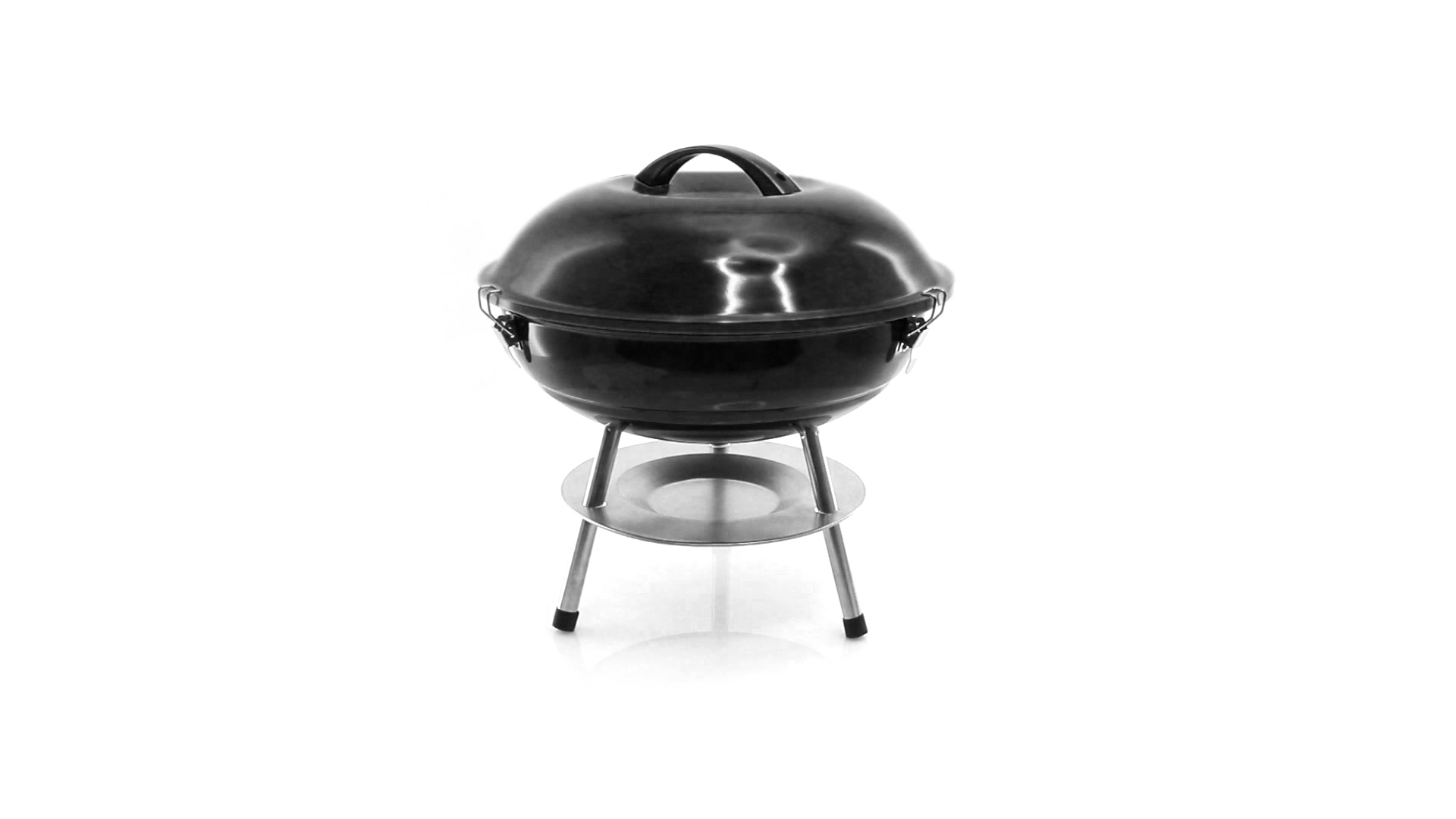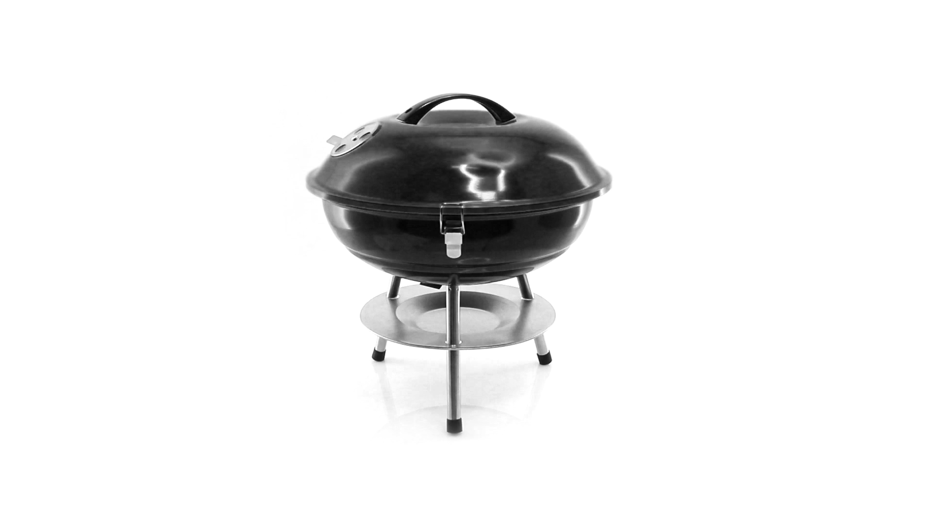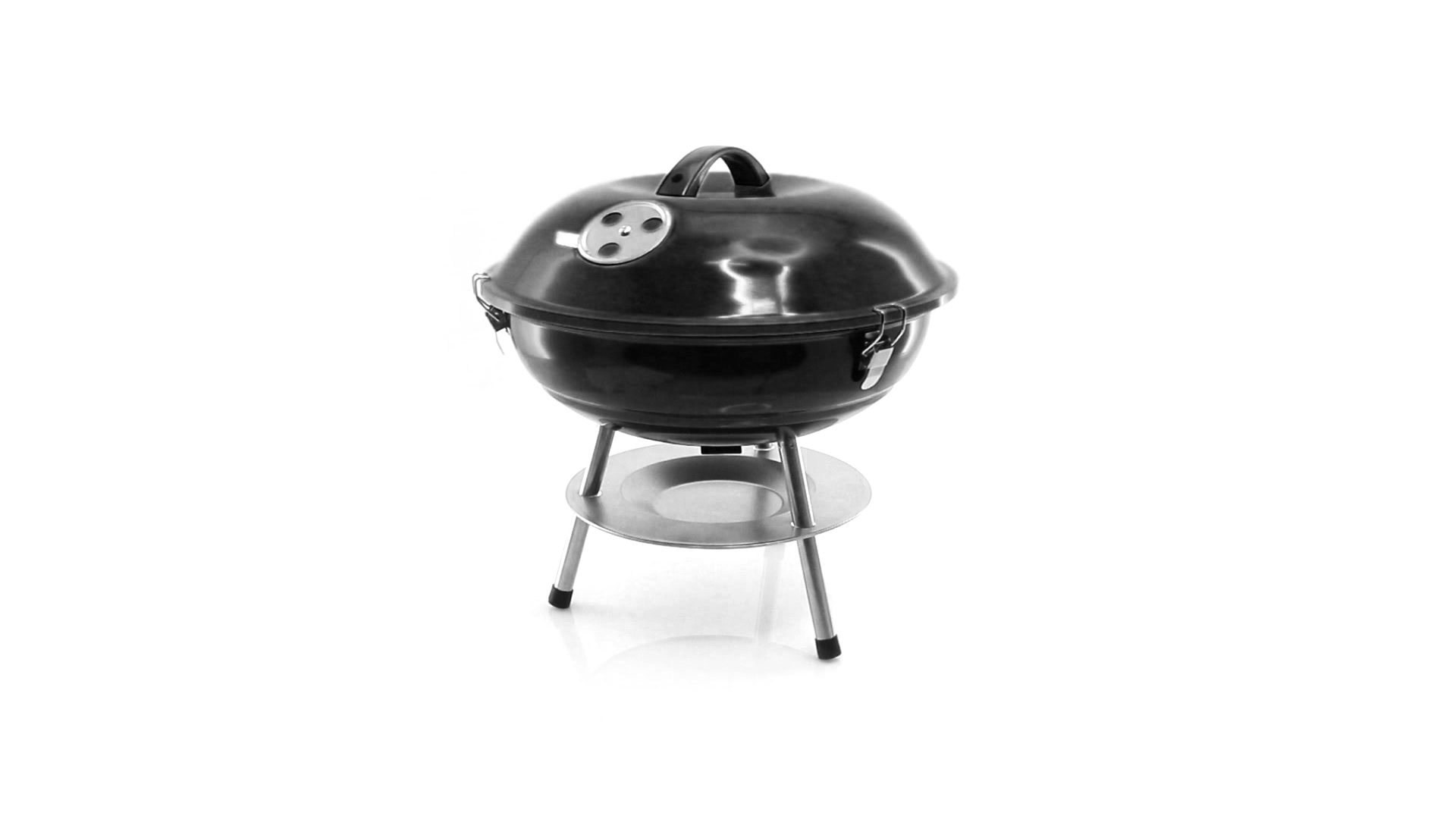 Grill aus widerstandsfähigem Kohlenstoffstahl mit schwarzer Oberfläche. Deckel mit komfortablem Griff und Lüftungslöchern, mit Metallgitter, Tropfschutzplatte und rutschfesten Füssen. Präsentiert in einer attraktiven Designbox.