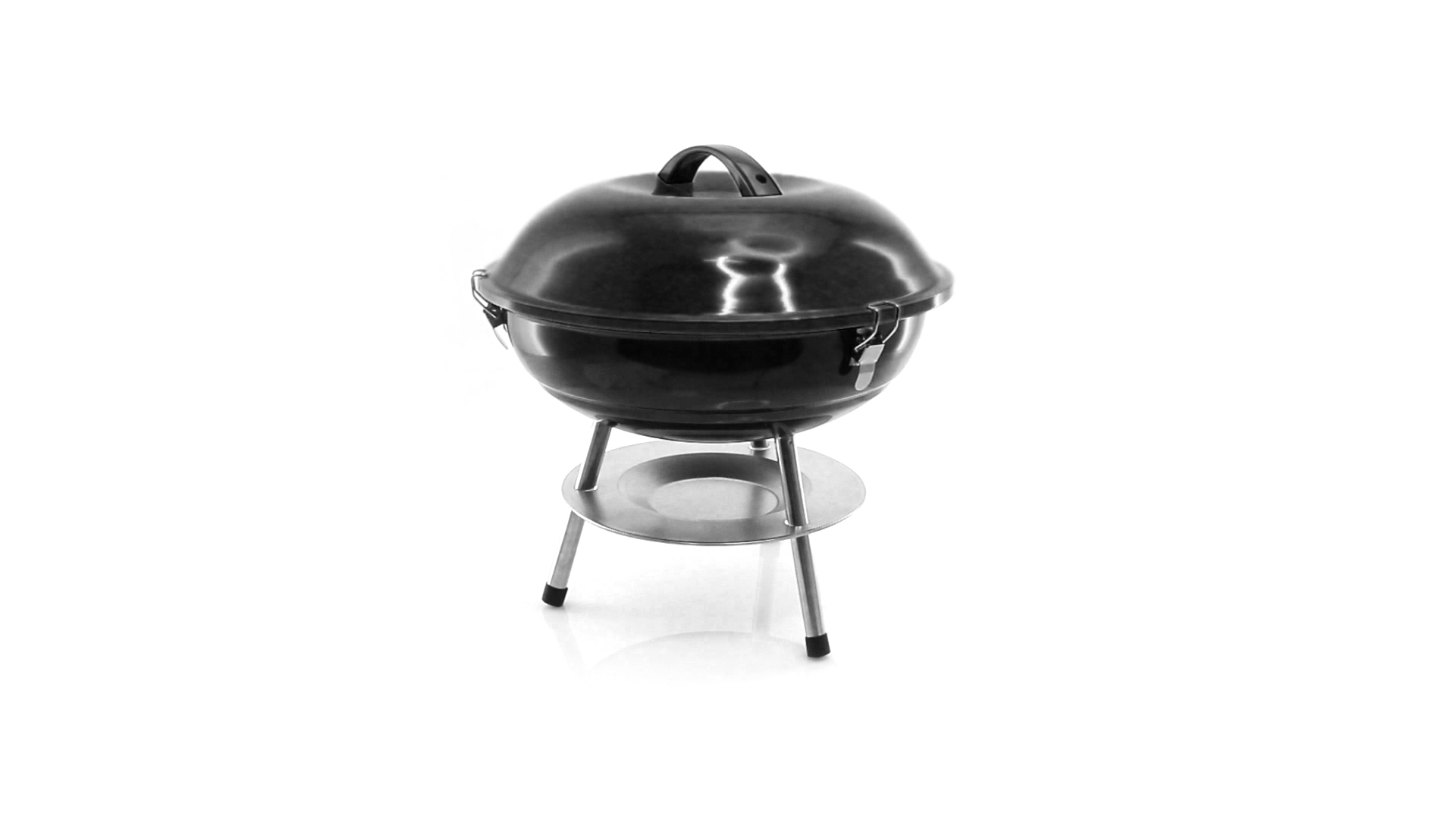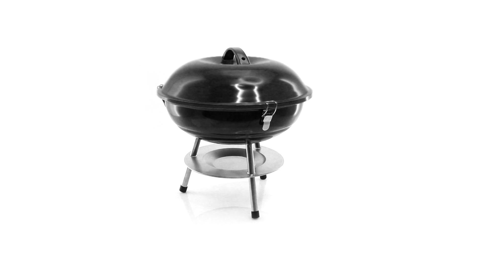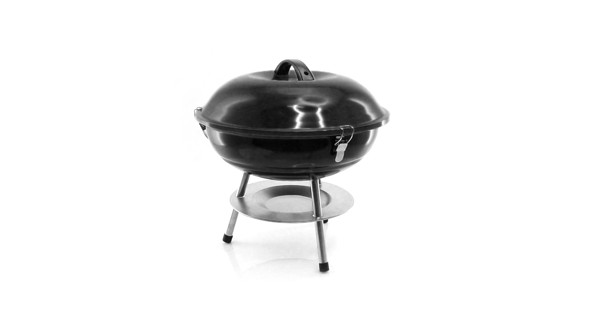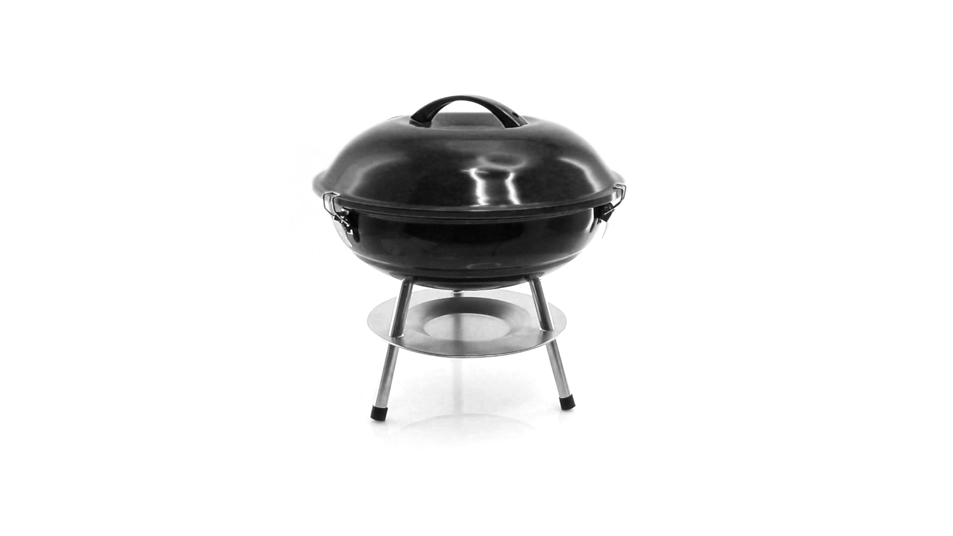 Grill aus widerstandsfähigem Kohlenstoffstahl mit schwarzer Oberfläche. Deckel mit komfortablem Griff und Lüftungslöchern, mit Metallgitter, Tropfschutzplatte und rutschfesten Füssen. Präsentiert in einer attraktiven Designbox.
