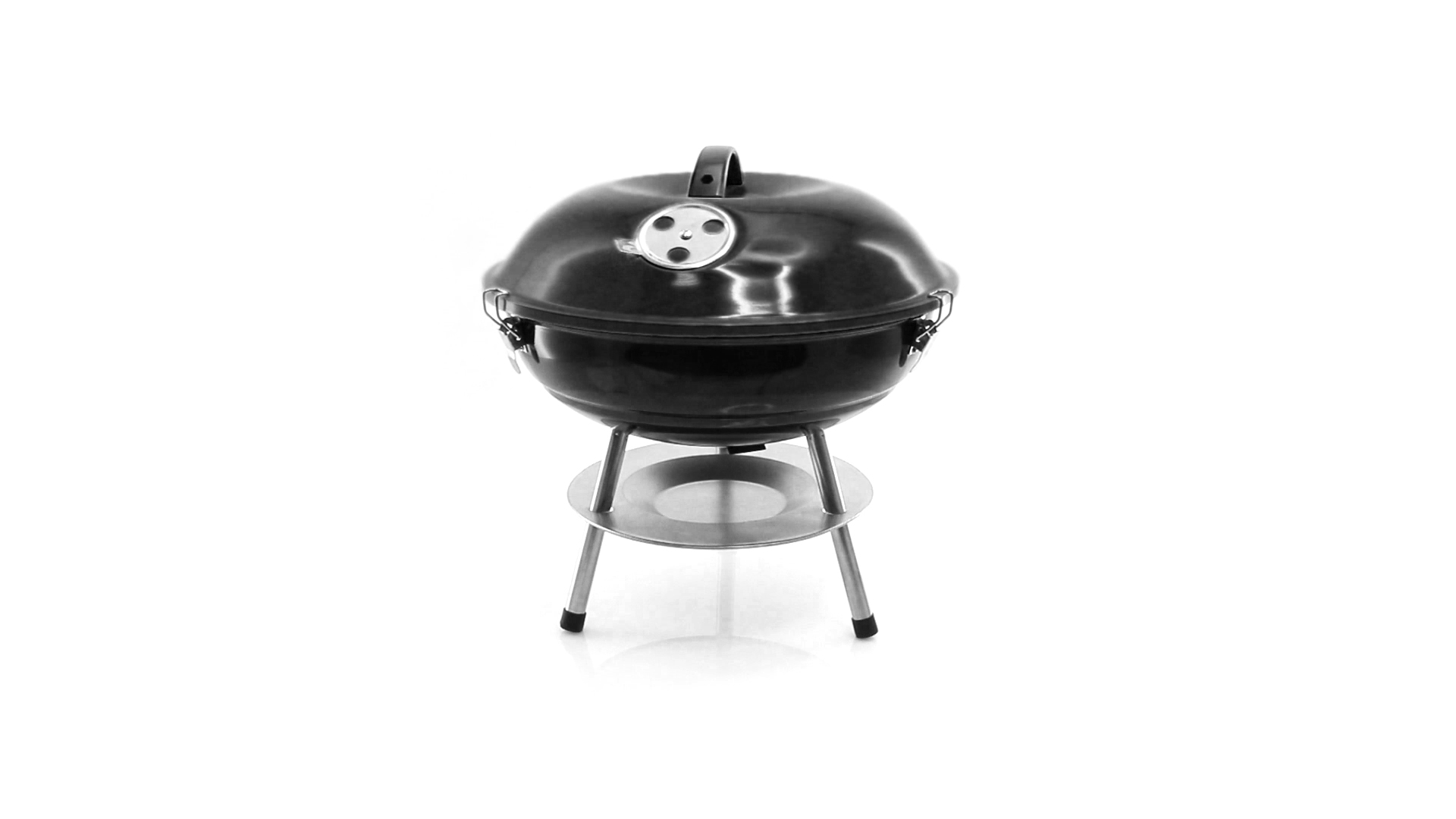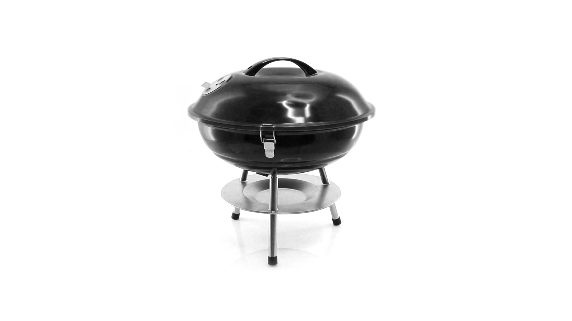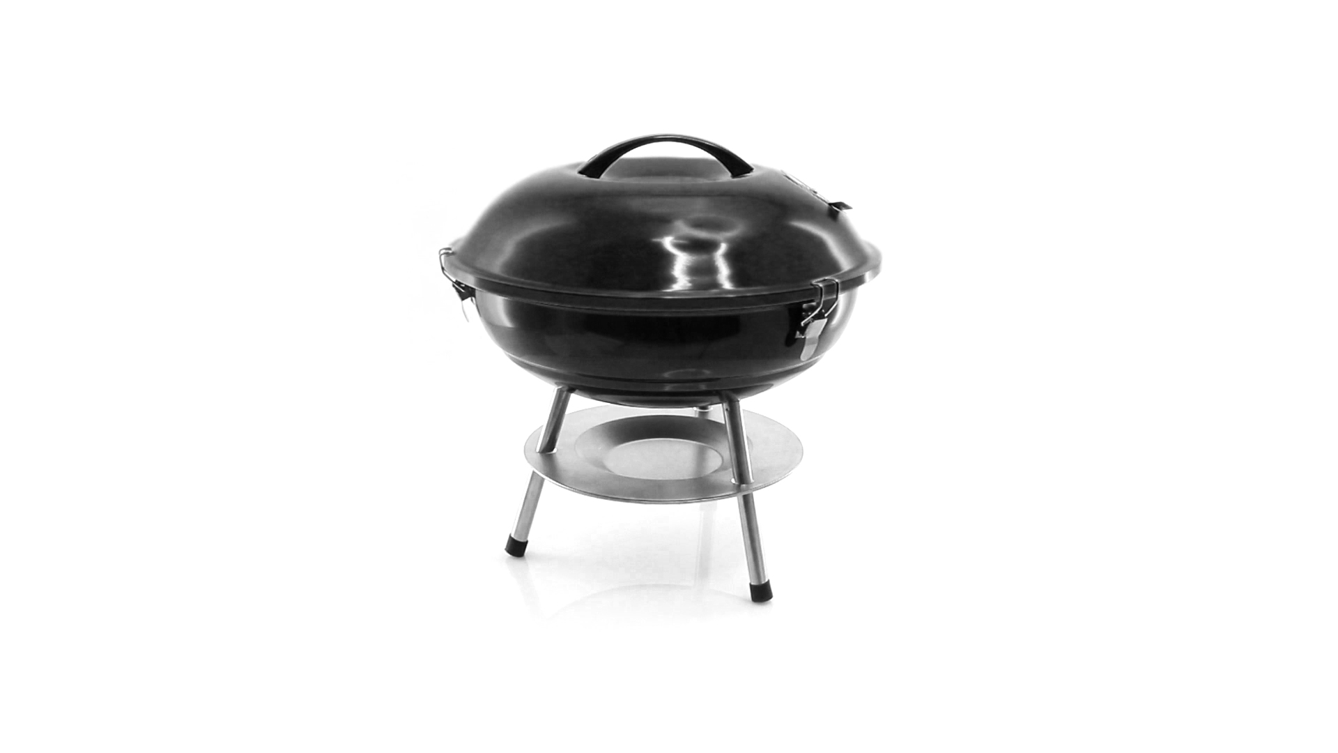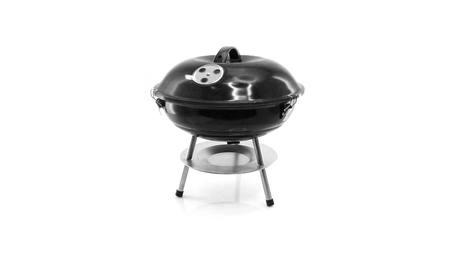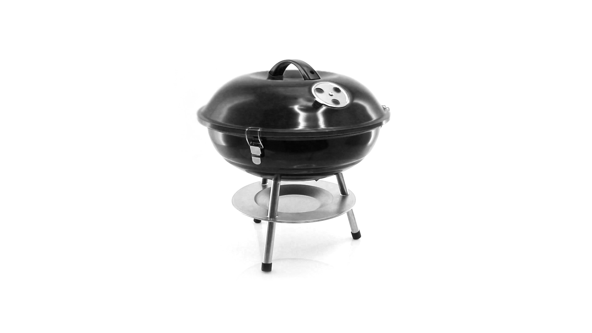 Grill aus widerstandsfähigem Kohlenstoffstahl mit schwarzer Oberfläche. Deckel mit komfortablem Griff und Lüftungslöchern, mit Metallgitter, Tropfschutzplatte und rutschfesten Füssen. Präsentiert in einer attraktiven Designbox.