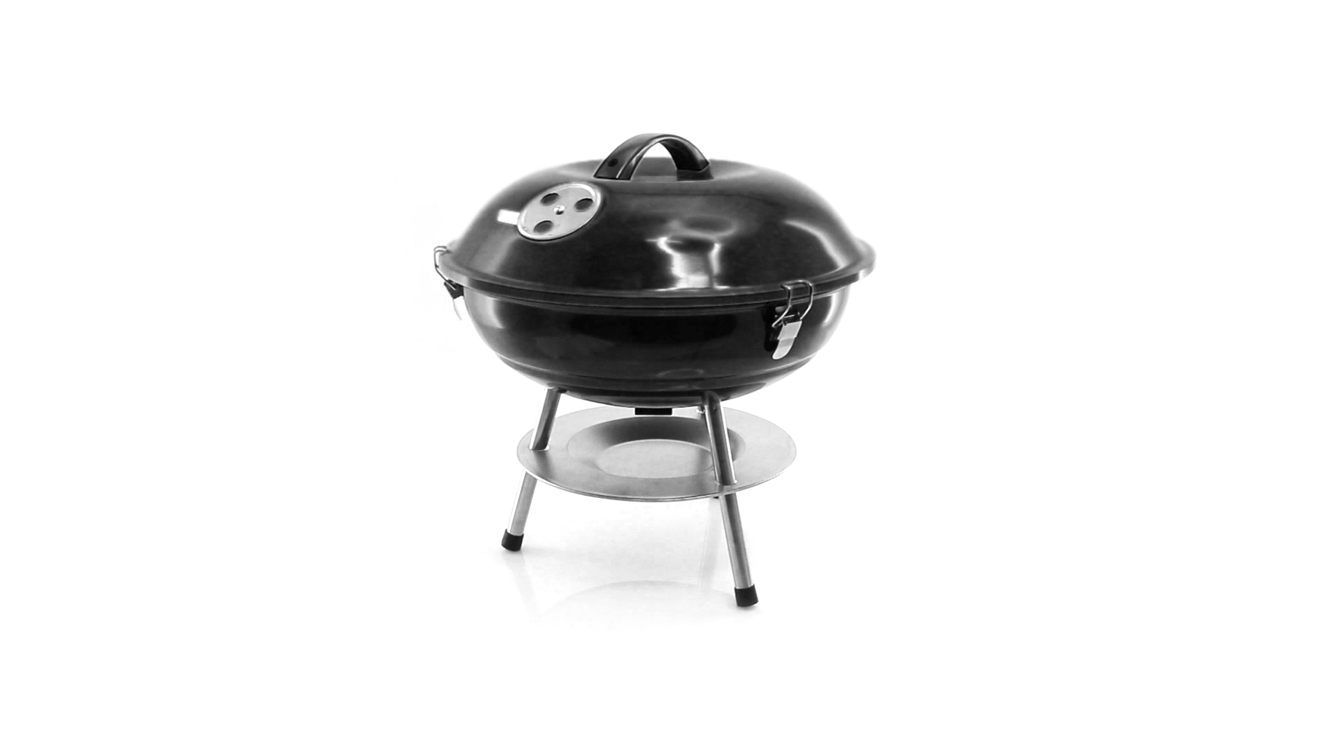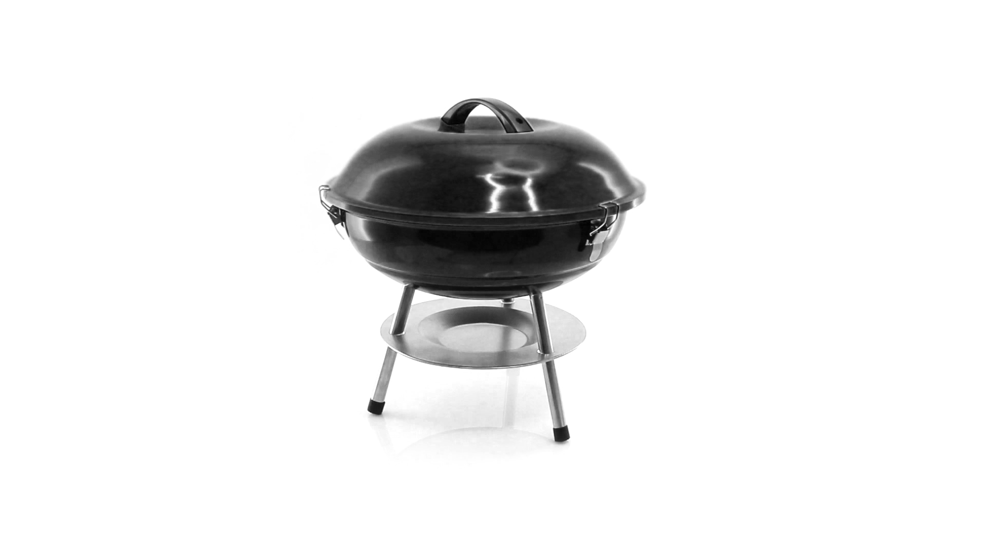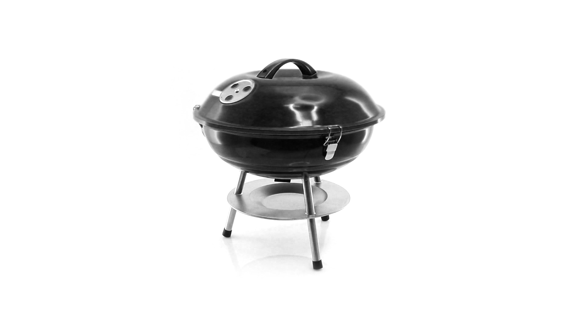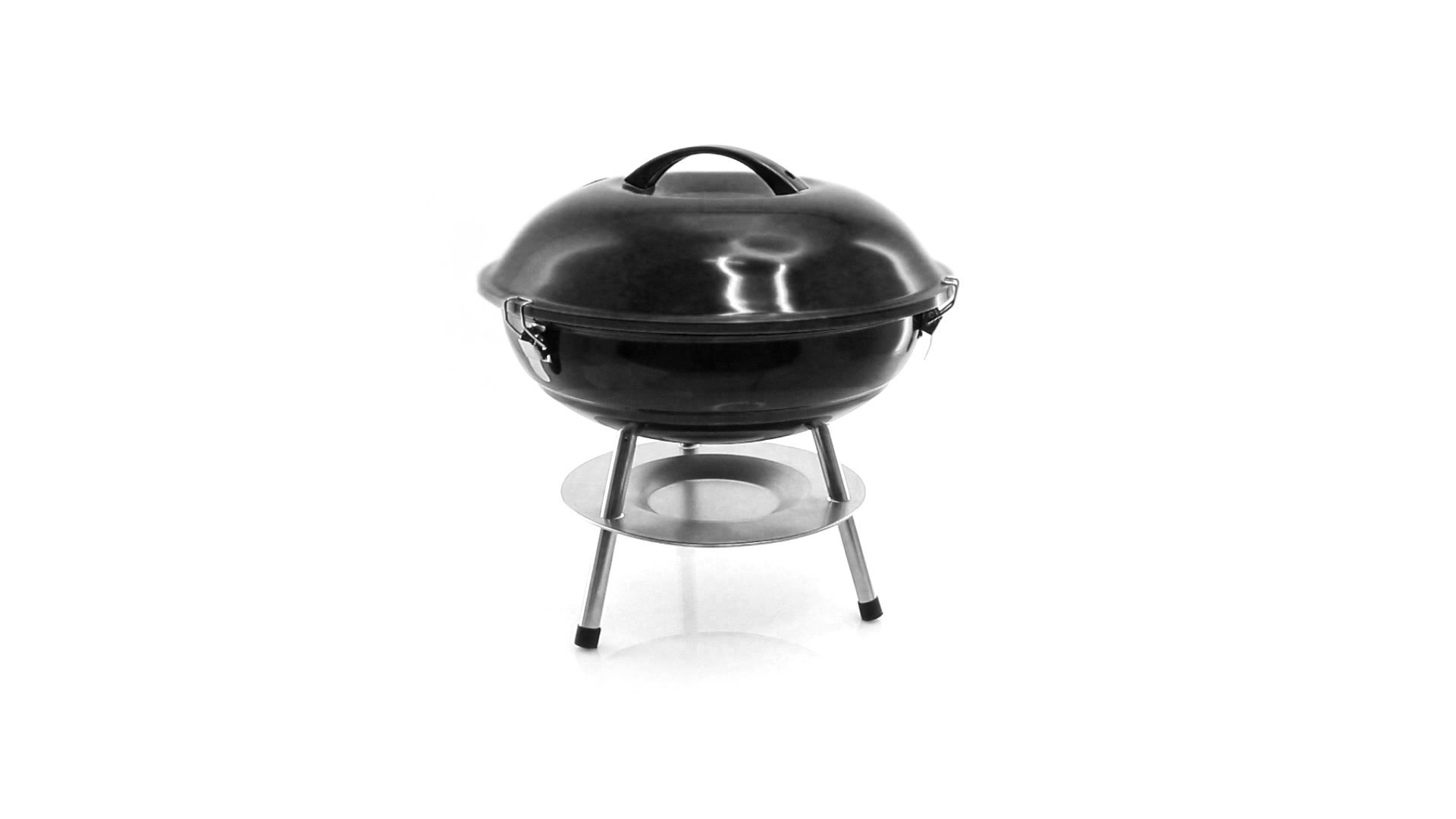 Grill aus widerstandsfähigem Kohlenstoffstahl mit schwarzer Oberfläche. Deckel mit komfortablem Griff und Lüftungslöchern, mit Metallgitter, Tropfschutzplatte und rutschfesten Füssen. Präsentiert in einer attraktiven Designbox.