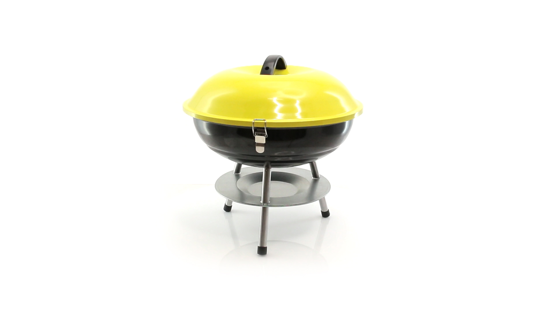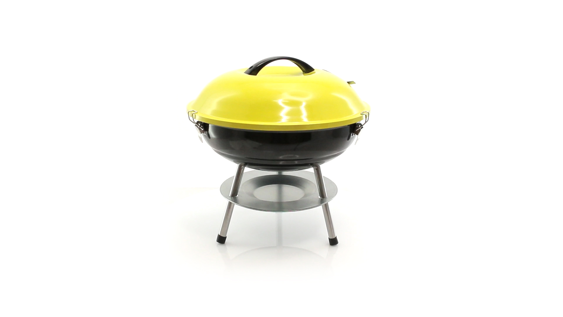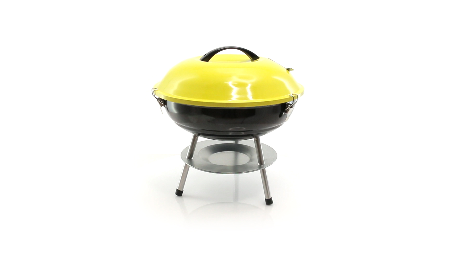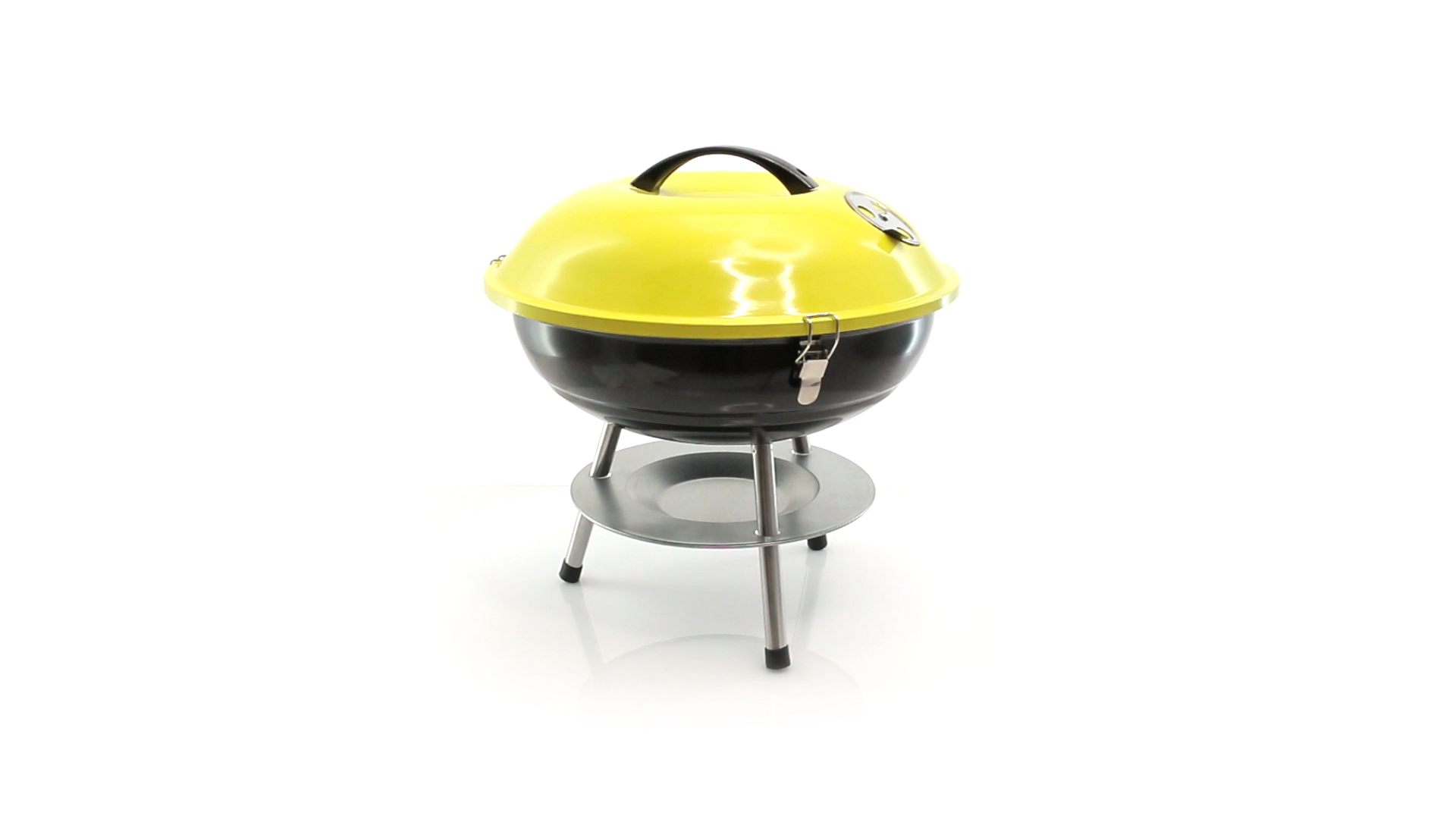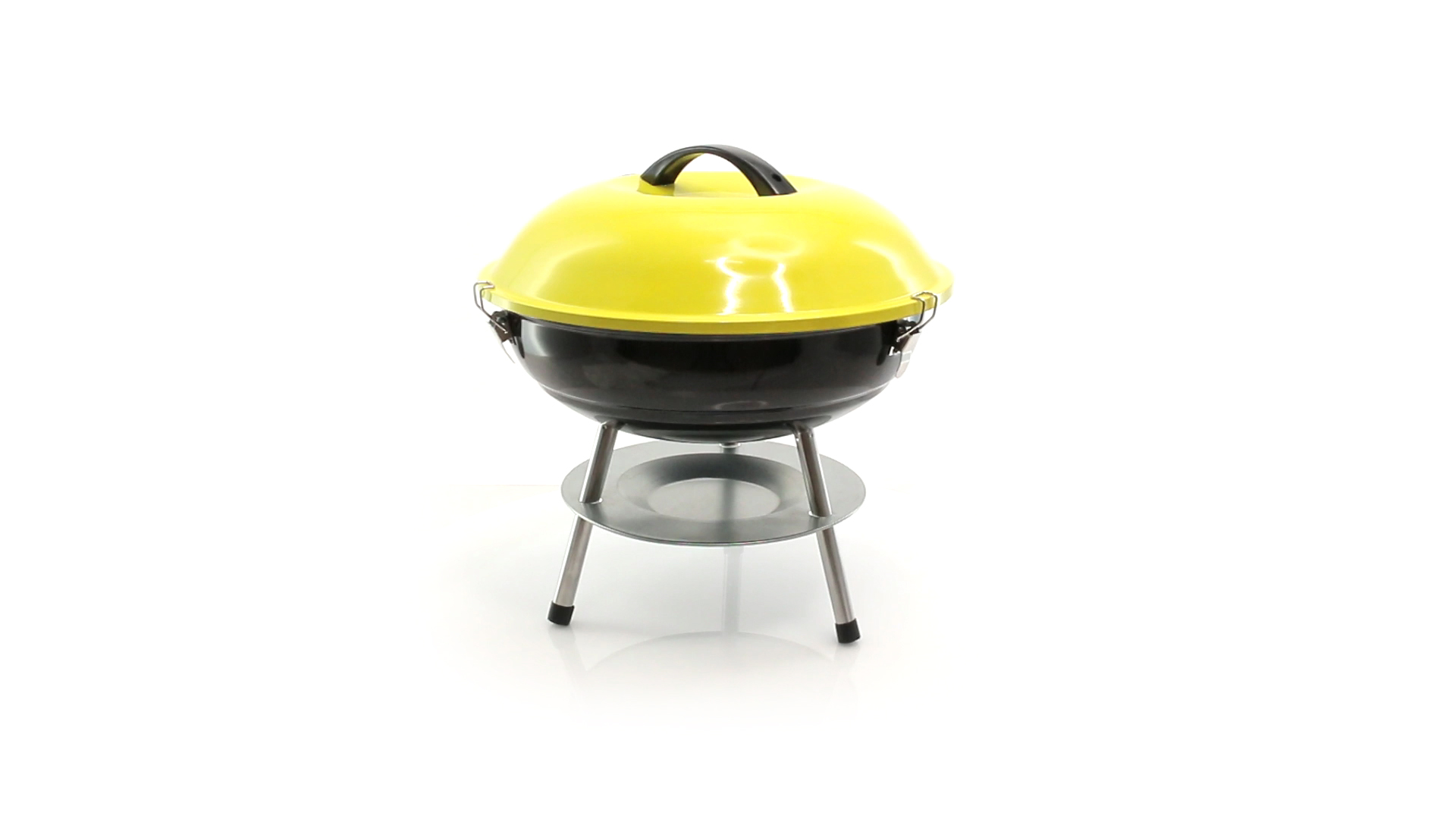 Grill aus resistentem Stahl mit schwarzer Grillschale und Deckel in lebendigen Farben mit komfortablem Griff und Lüftungsöffnungen. Zudem mit Metallrost und rutschfesten Standbeinen. Präsentiert in einer attraktiven Designbox.
