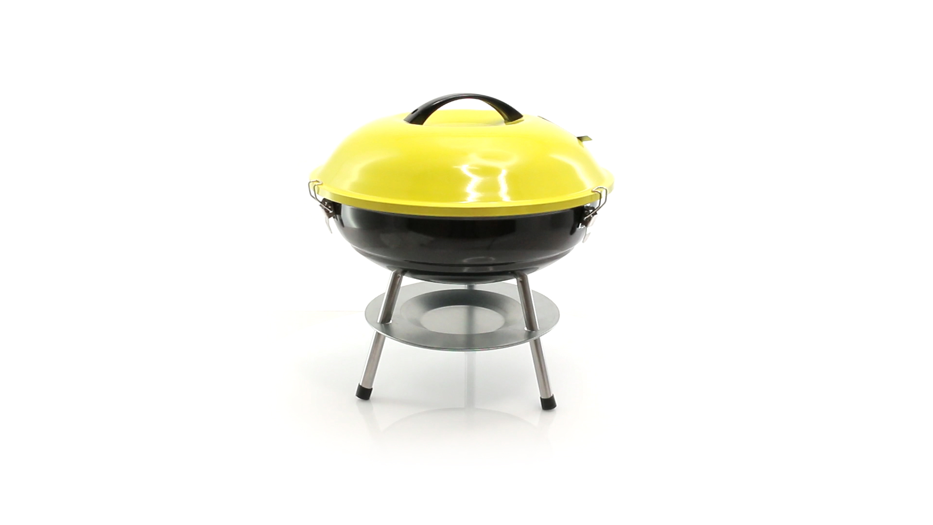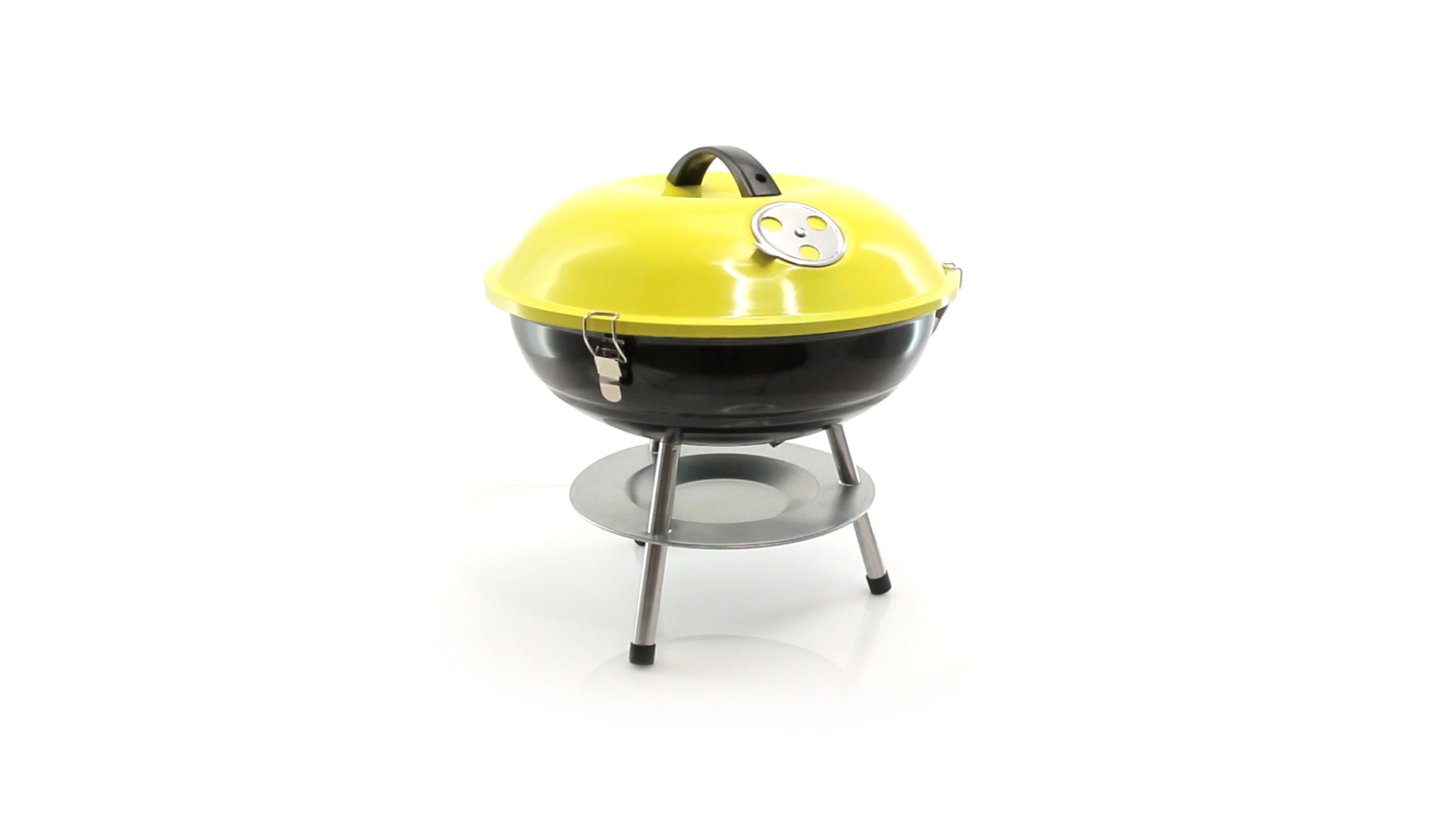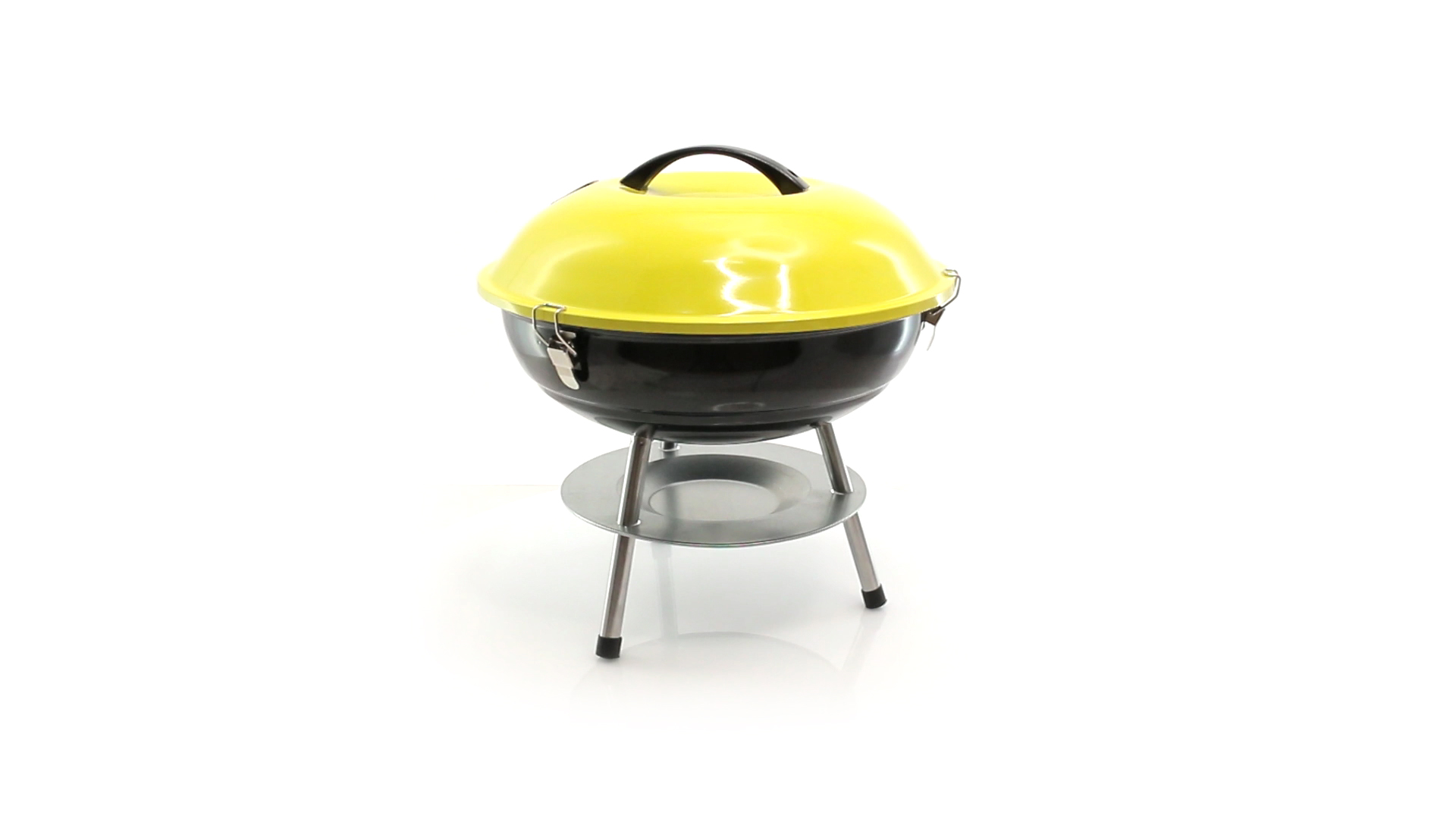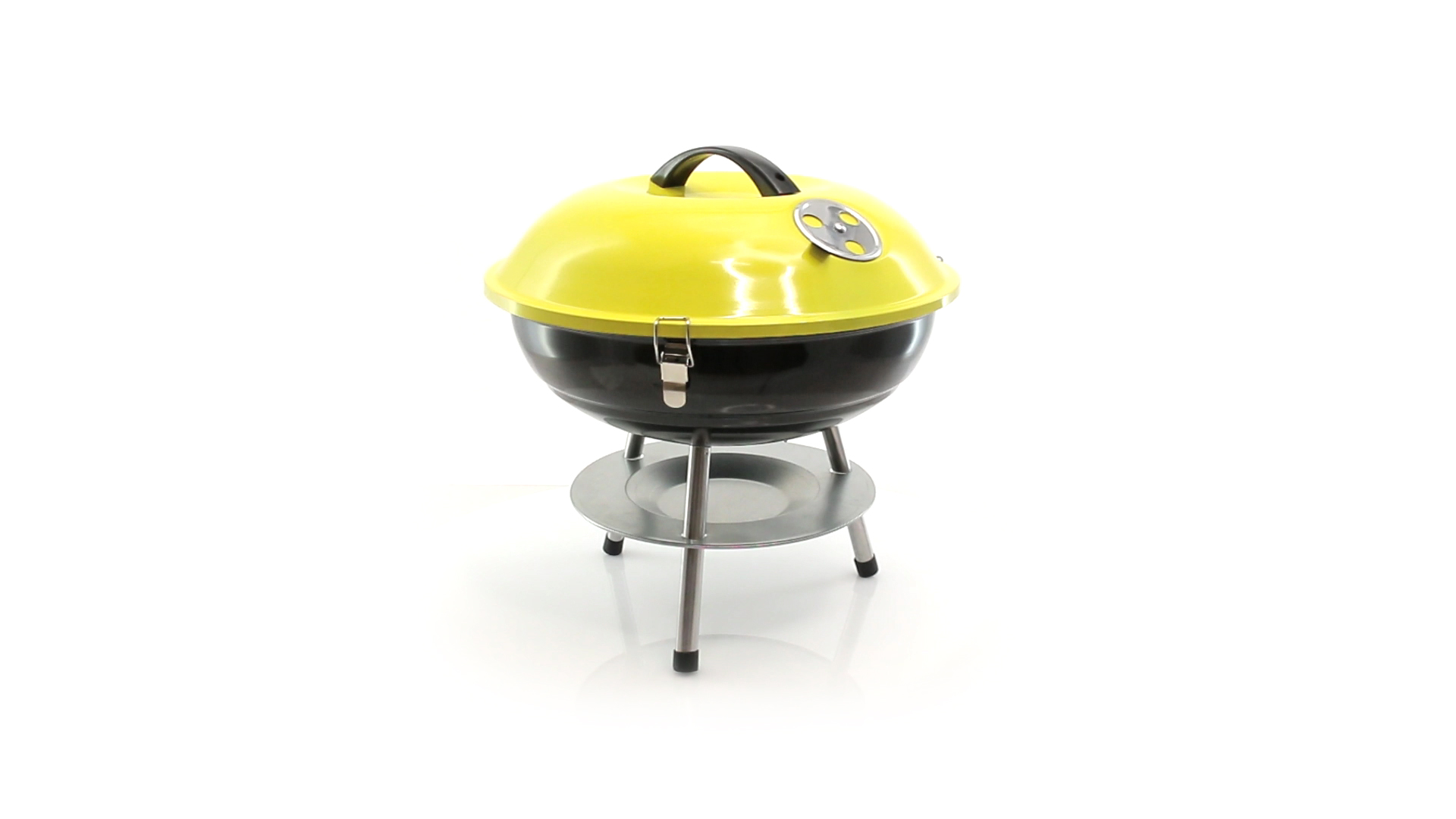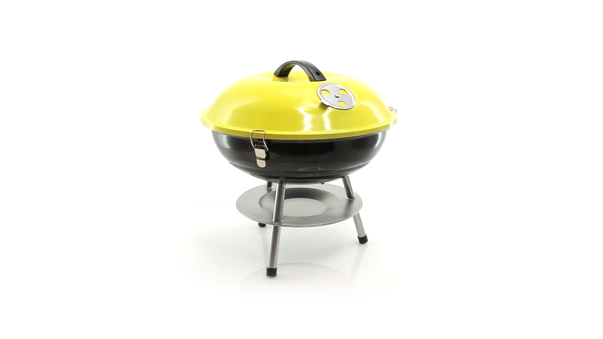Grill aus resistentem Stahl mit schwarzer Grillschale und Deckel in lebendigen Farben mit komfortablem Griff und Lüftungsöffnungen. Zudem mit Metallrost und rutschfesten Standbeinen. Präsentiert in einer attraktiven Designbox.