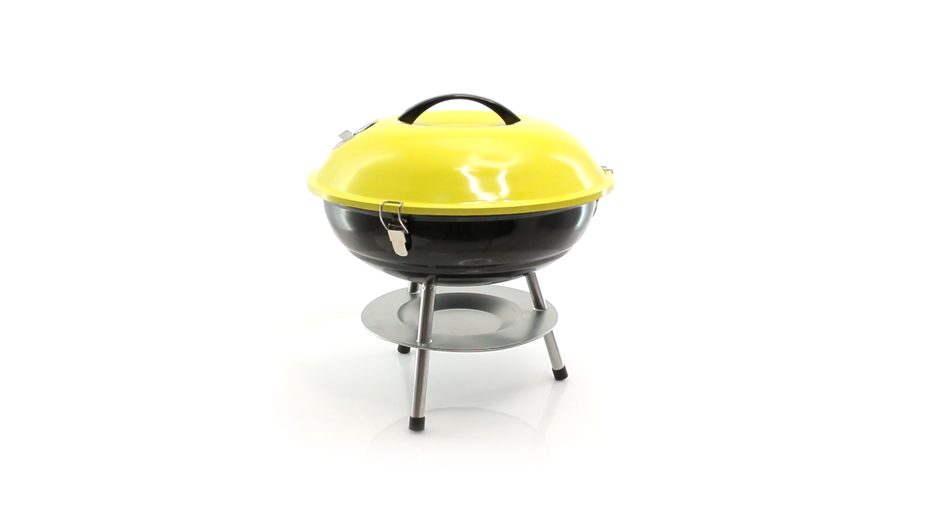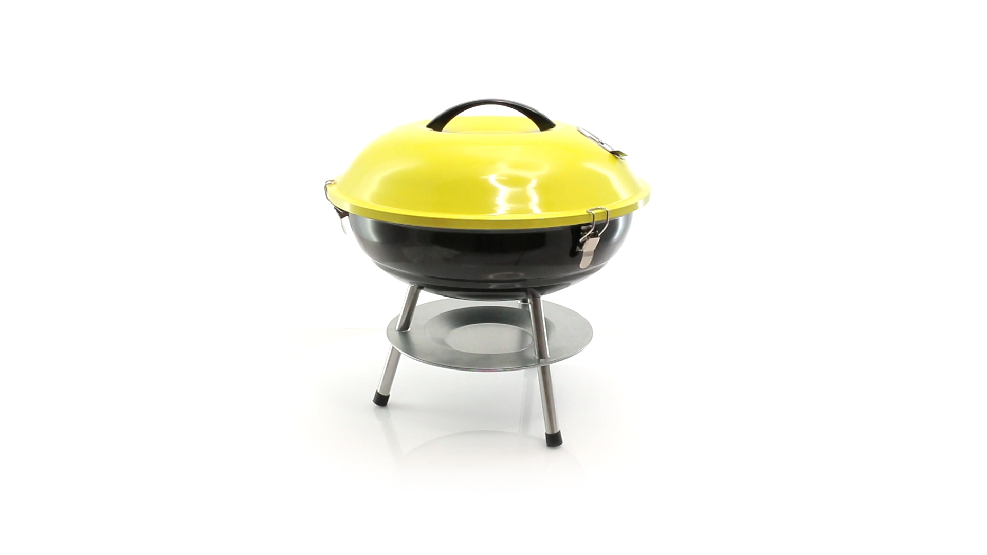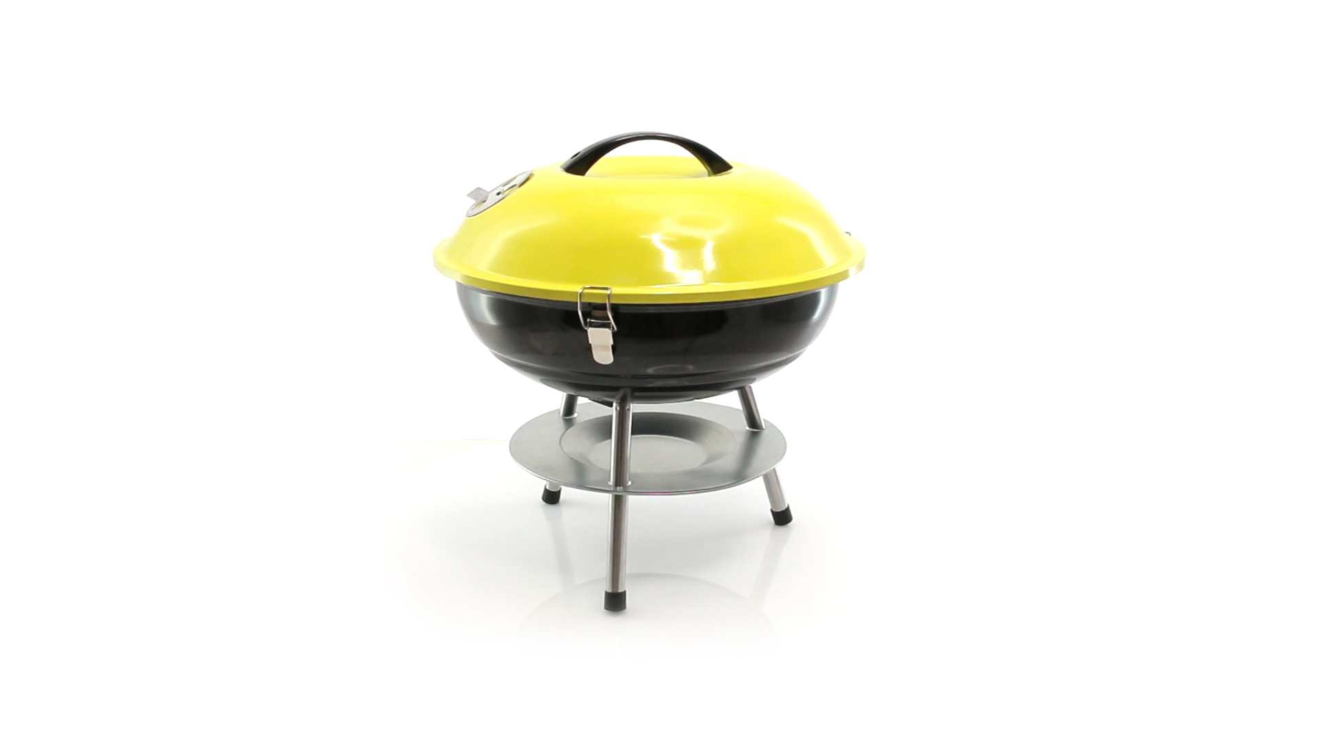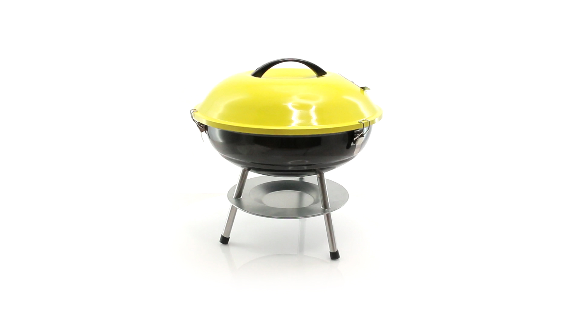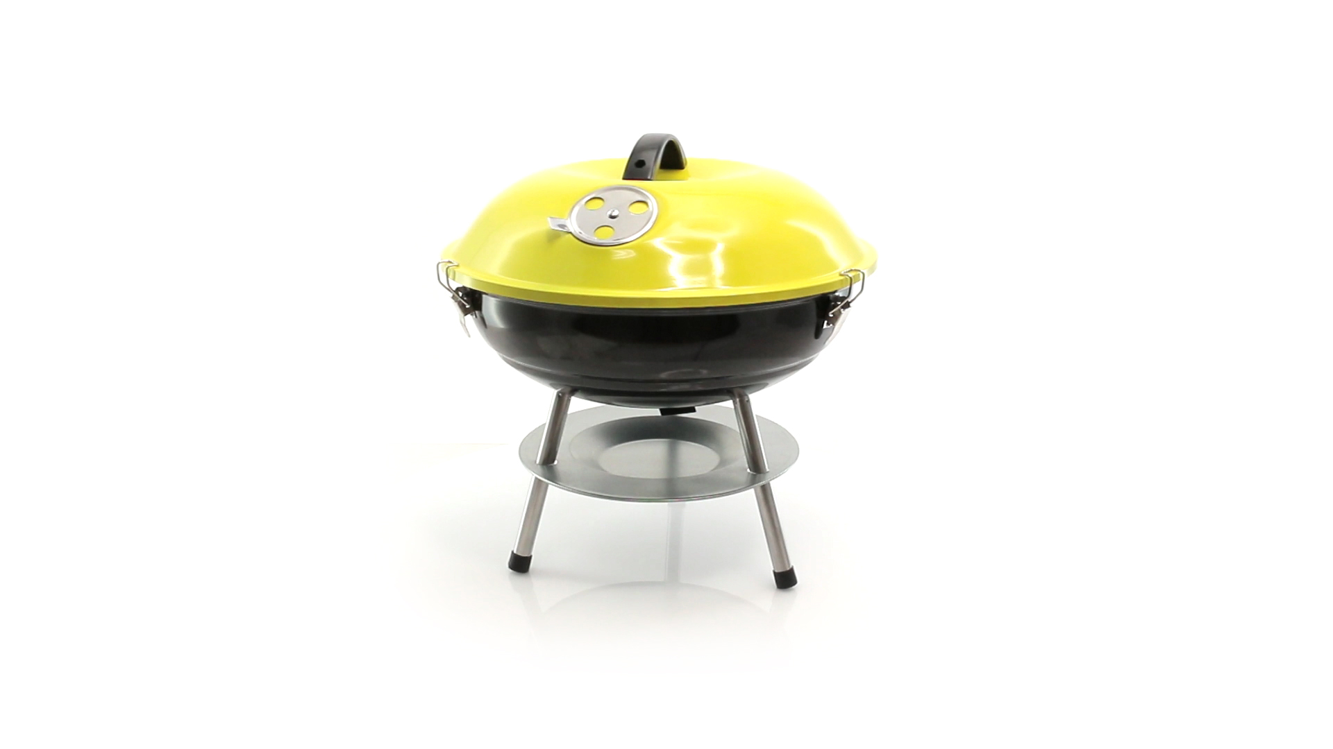Grill aus resistentem Stahl mit schwarzer Grillschale und Deckel in lebendigen Farben mit komfortablem Griff und Lüftungsöffnungen. Zudem mit Metallrost und rutschfesten Standbeinen. Präsentiert in einer attraktiven Designbox.