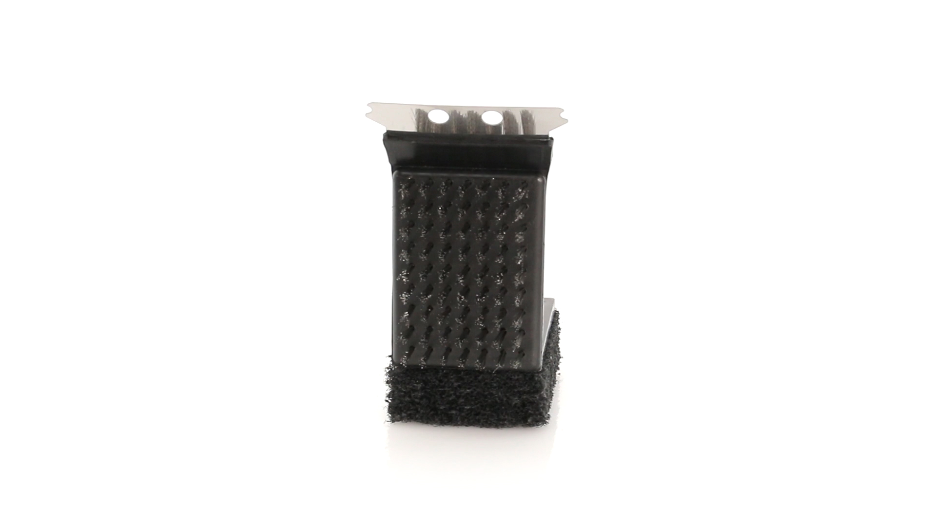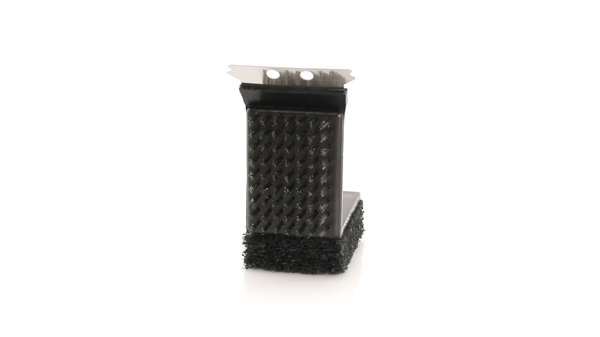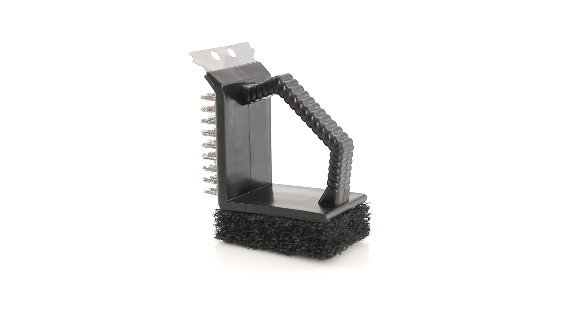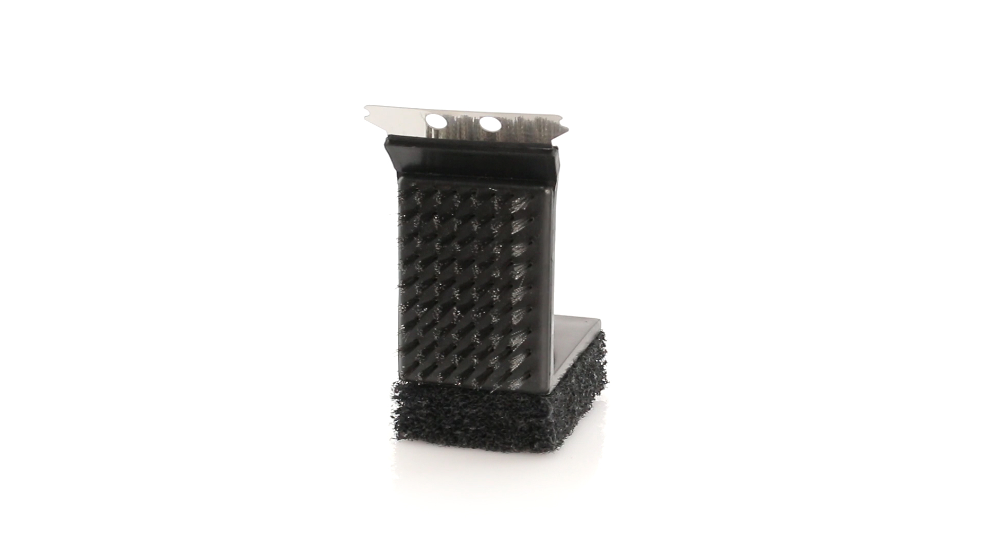 Grillreiniger mit komfortablem Griff. Enthält Edelstahlspachtel, hochresistenten Scheuerschwamm und Bürste mit Metallborsten. Präsentiert in einer individuellen Box in Silber.