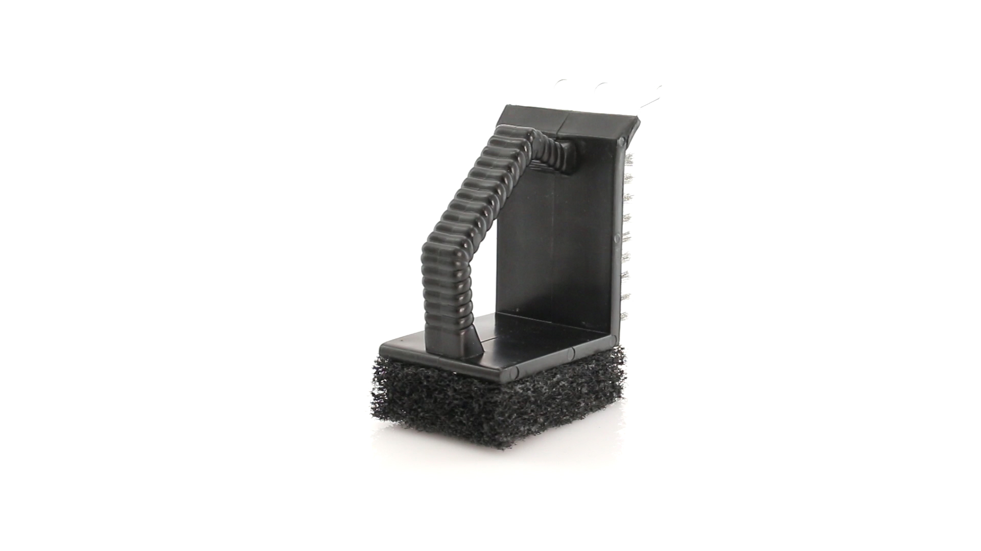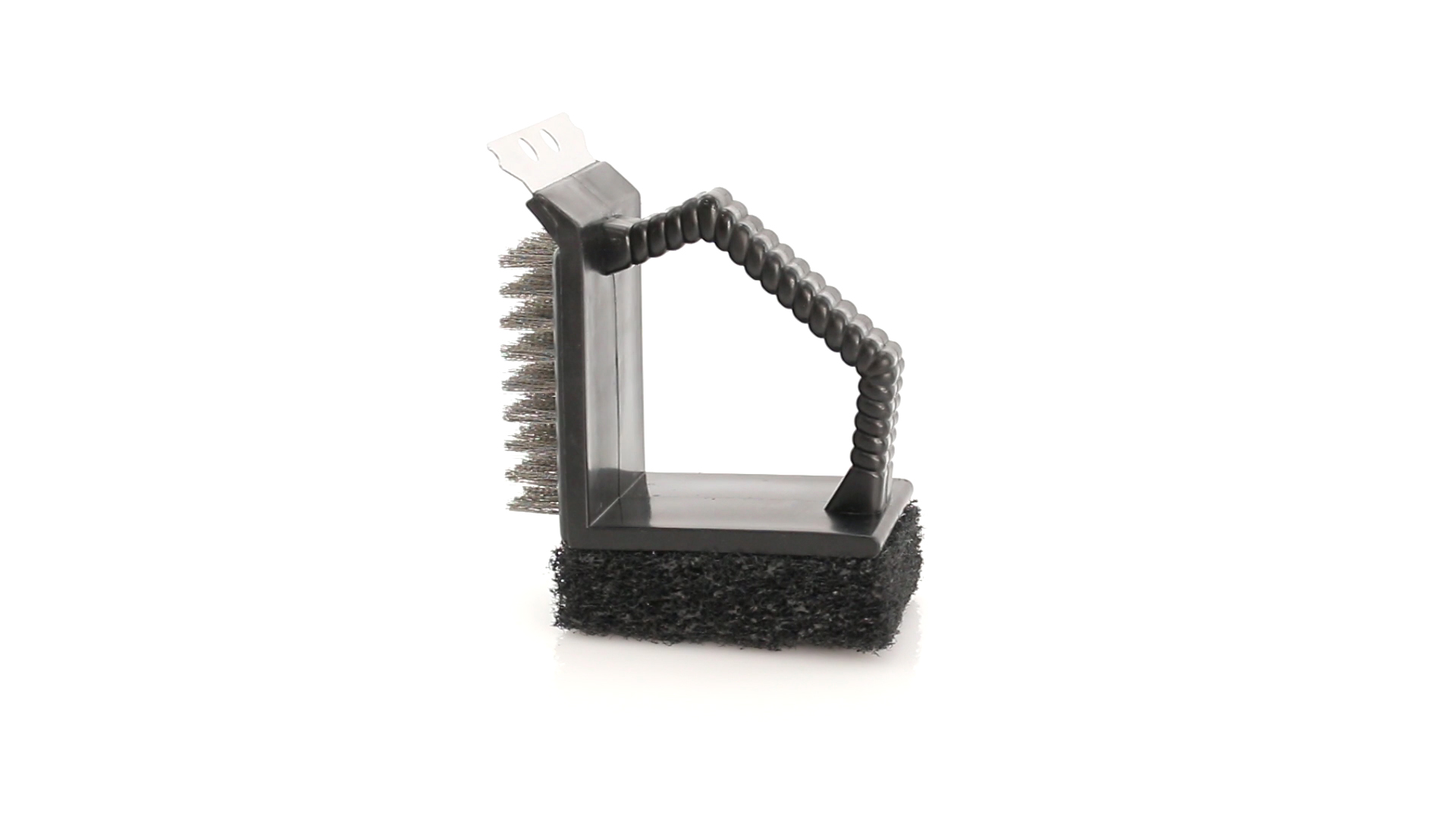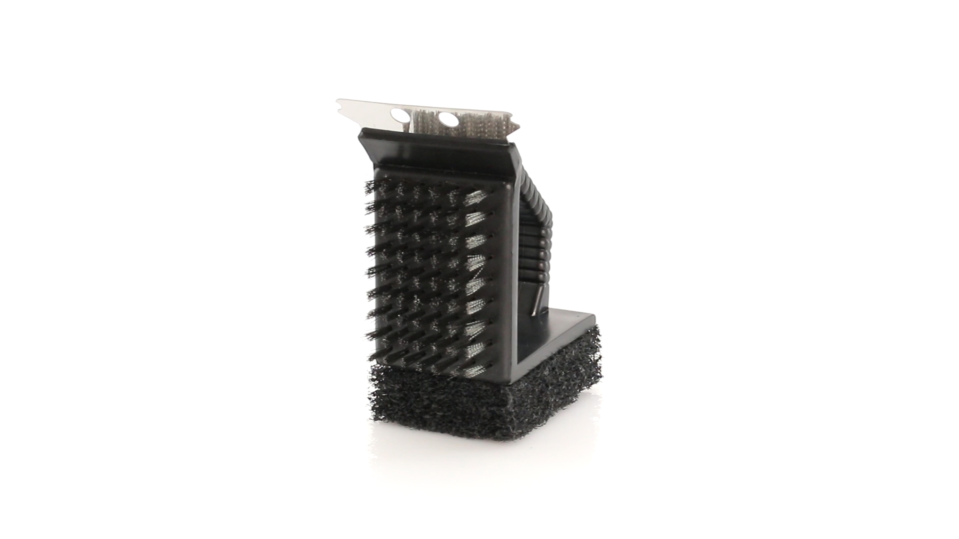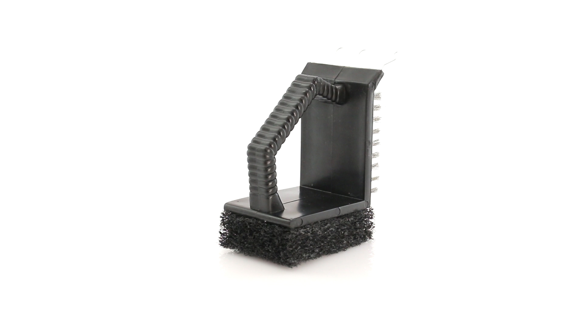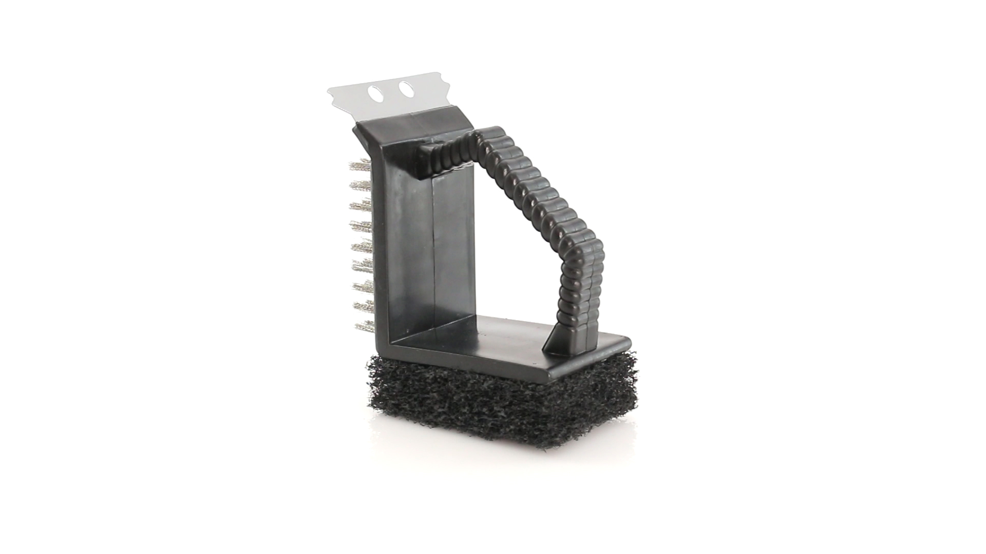 Grillreiniger mit komfortablem Griff. Enthält Edelstahlspachtel, hochresistenten Scheuerschwamm und Bürste mit Metallborsten. Präsentiert in einer individuellen Box in Silber.