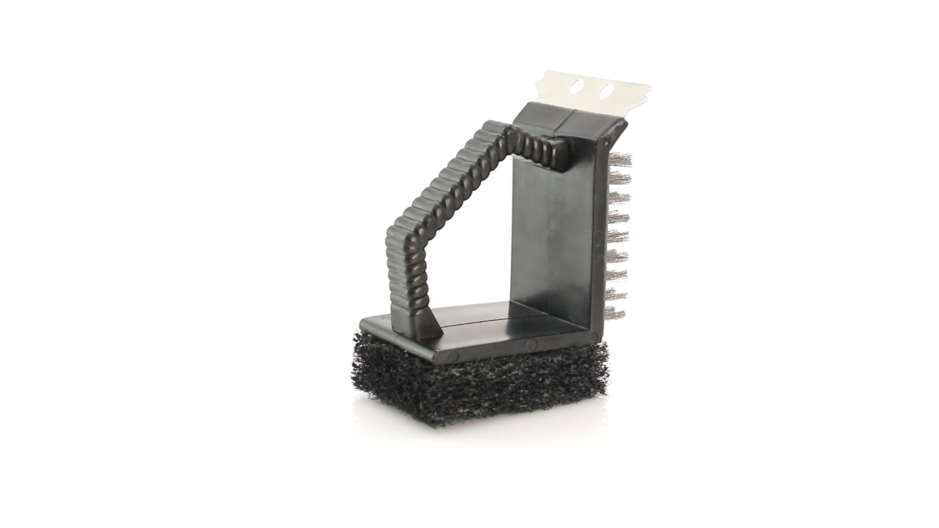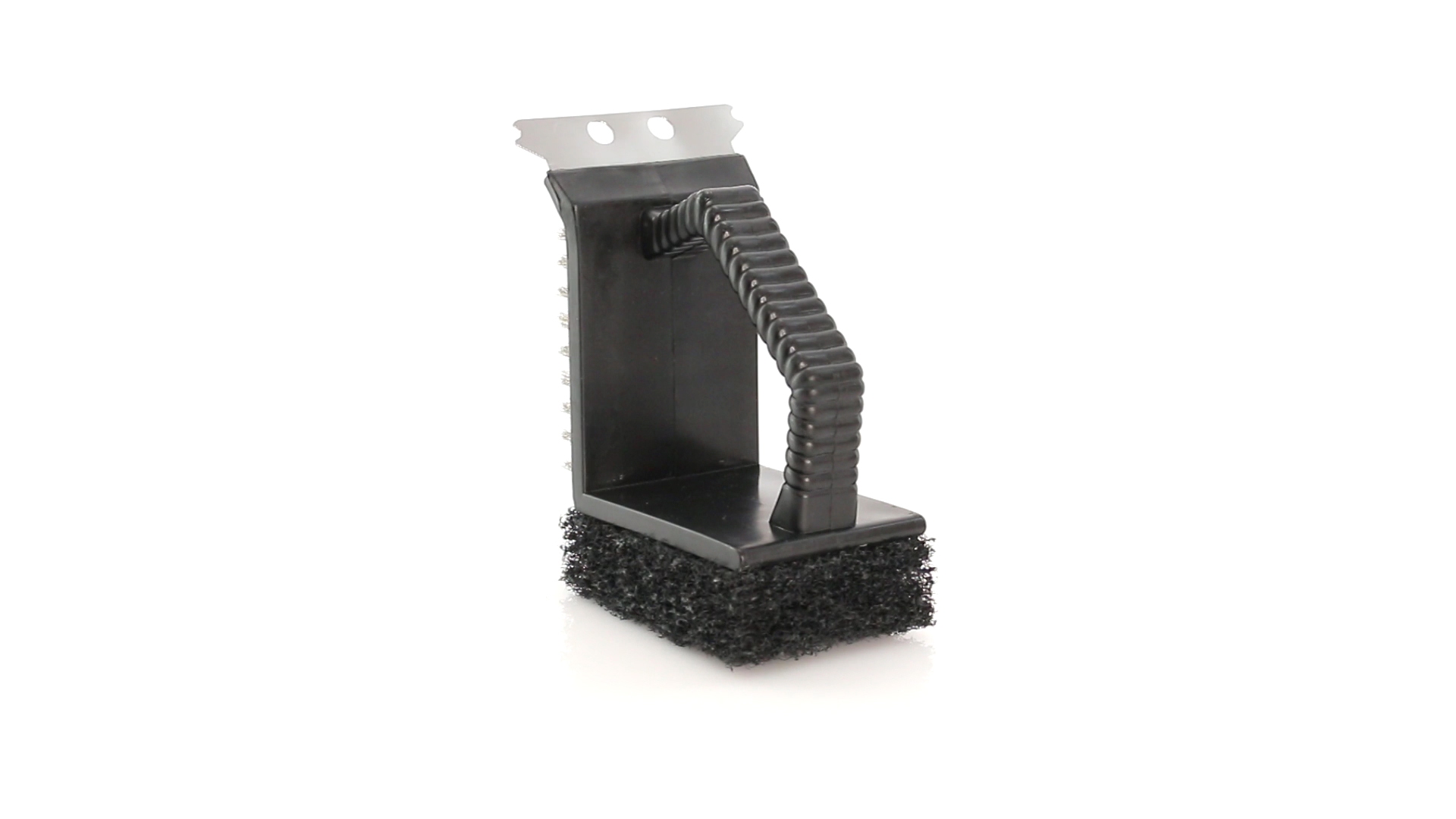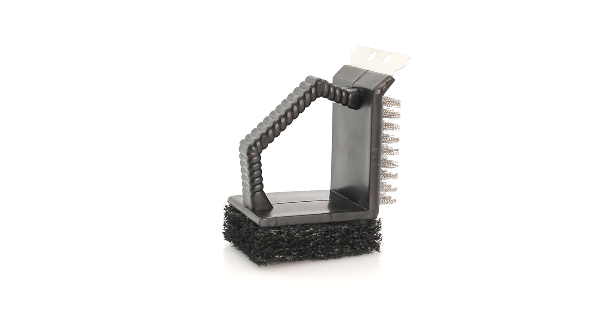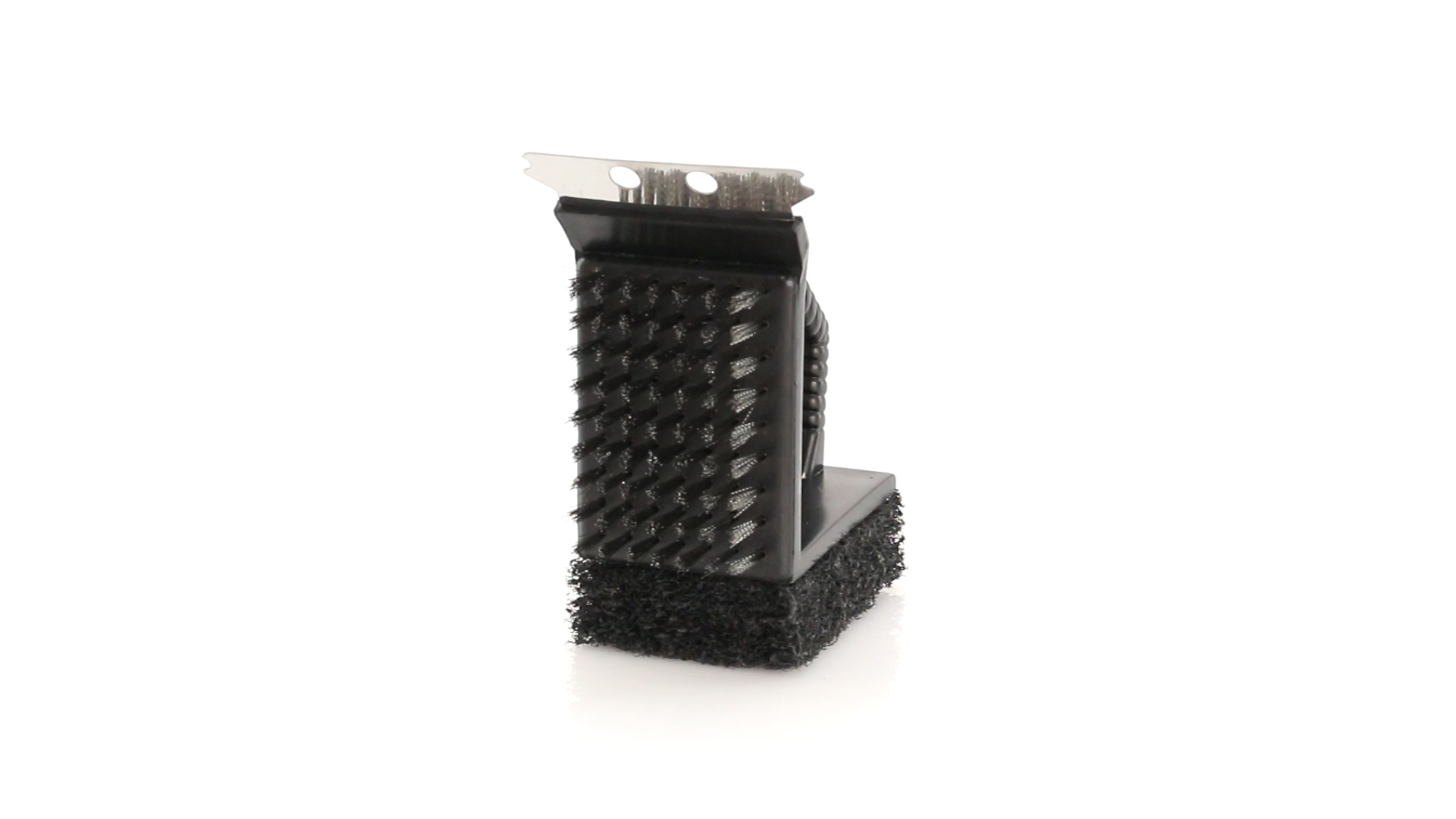 Grillreiniger mit komfortablem Griff. Enthält Edelstahlspachtel, hochresistenten Scheuerschwamm und Bürste mit Metallborsten. Präsentiert in einer individuellen Box in Silber.