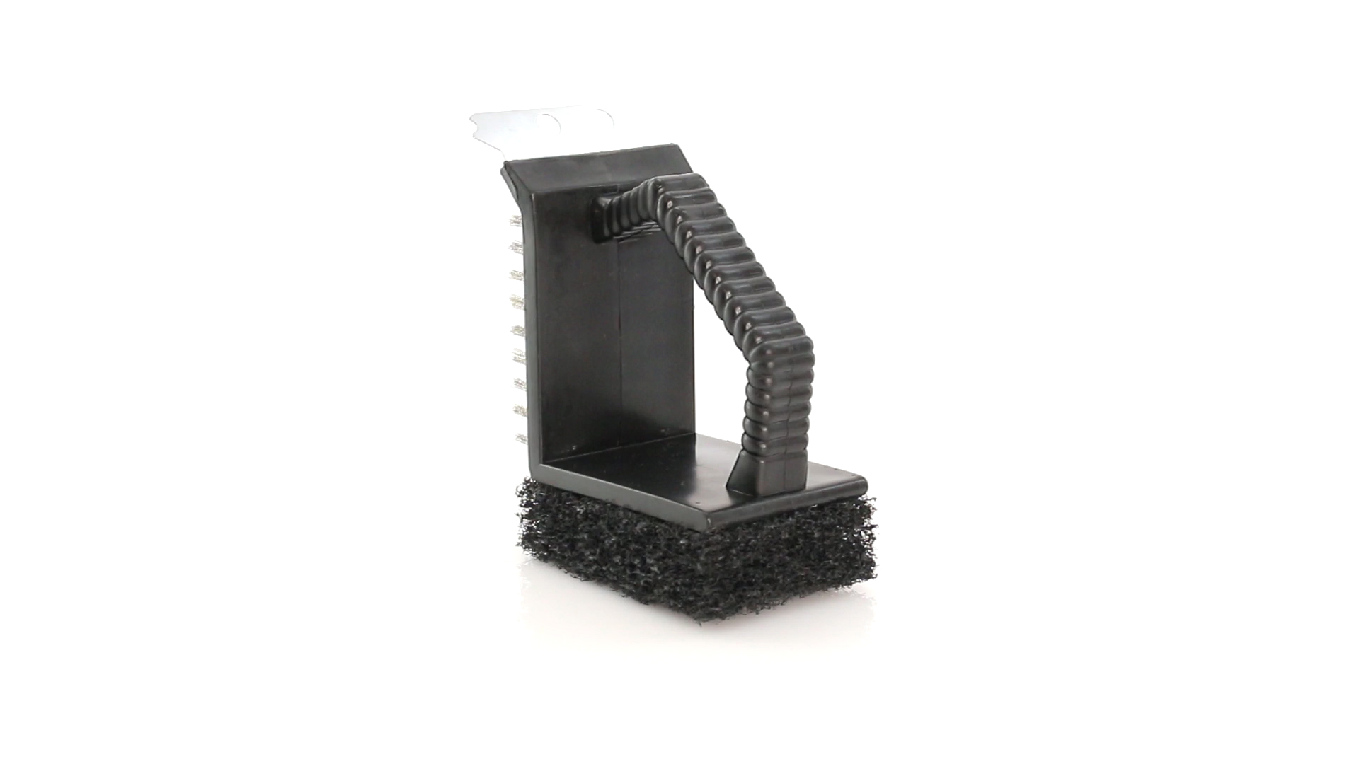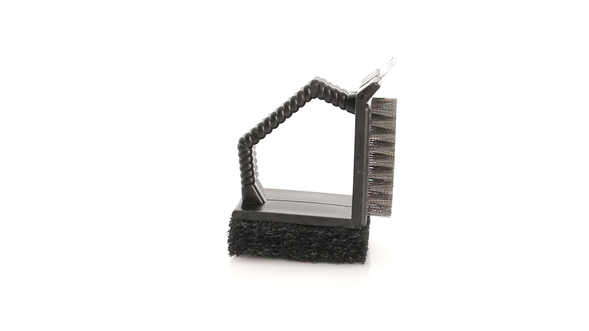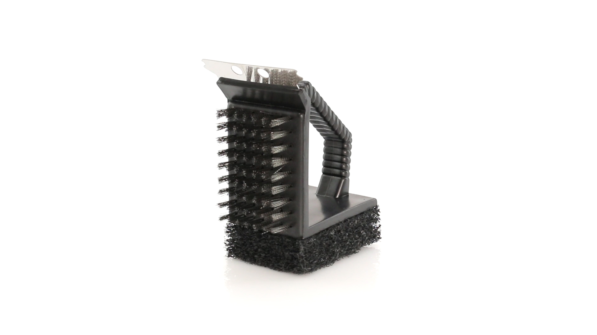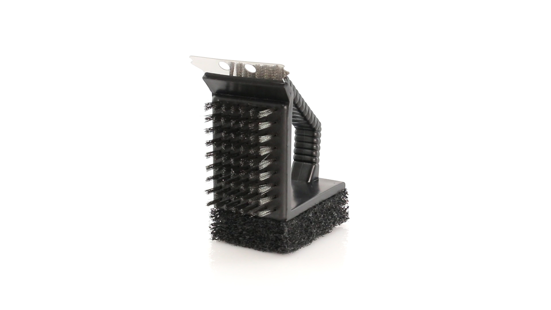 Grillreiniger mit komfortablem Griff. Enthält Edelstahlspachtel, hochresistenten Scheuerschwamm und Bürste mit Metallborsten. Präsentiert in einer individuellen Box in Silber.