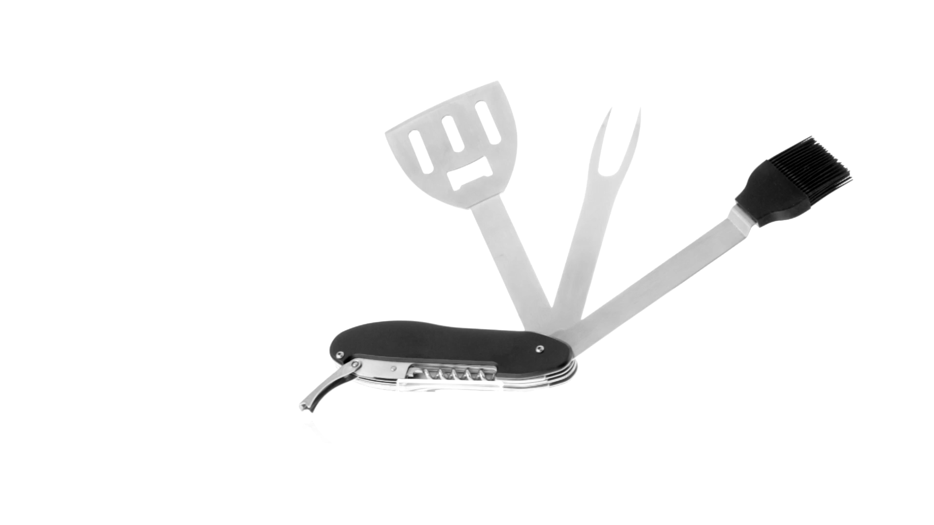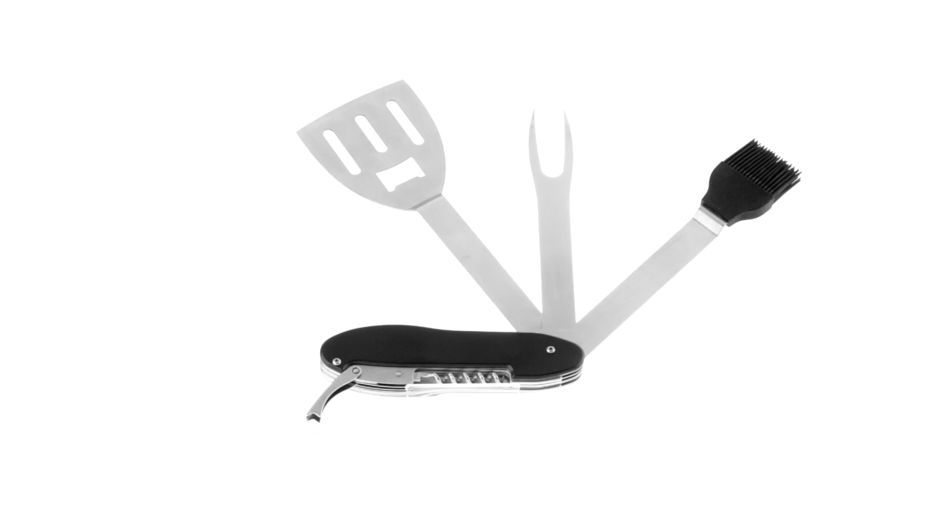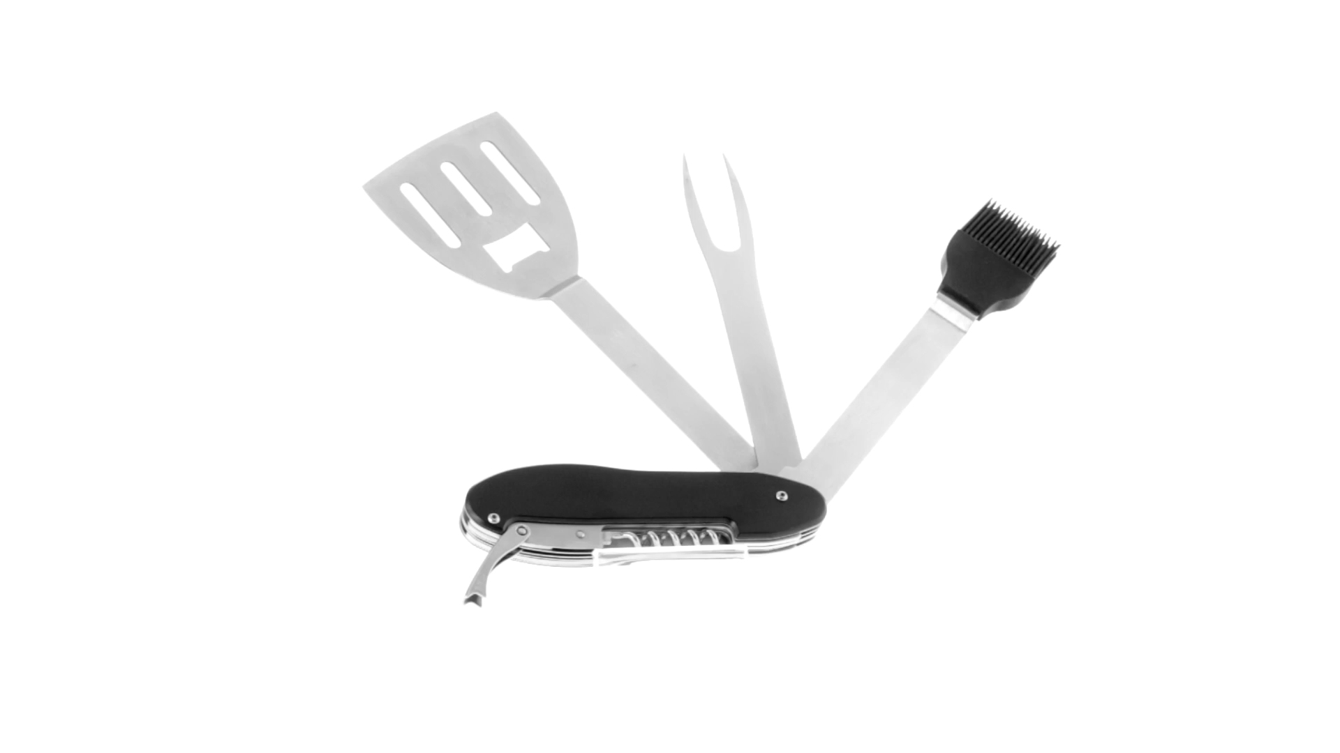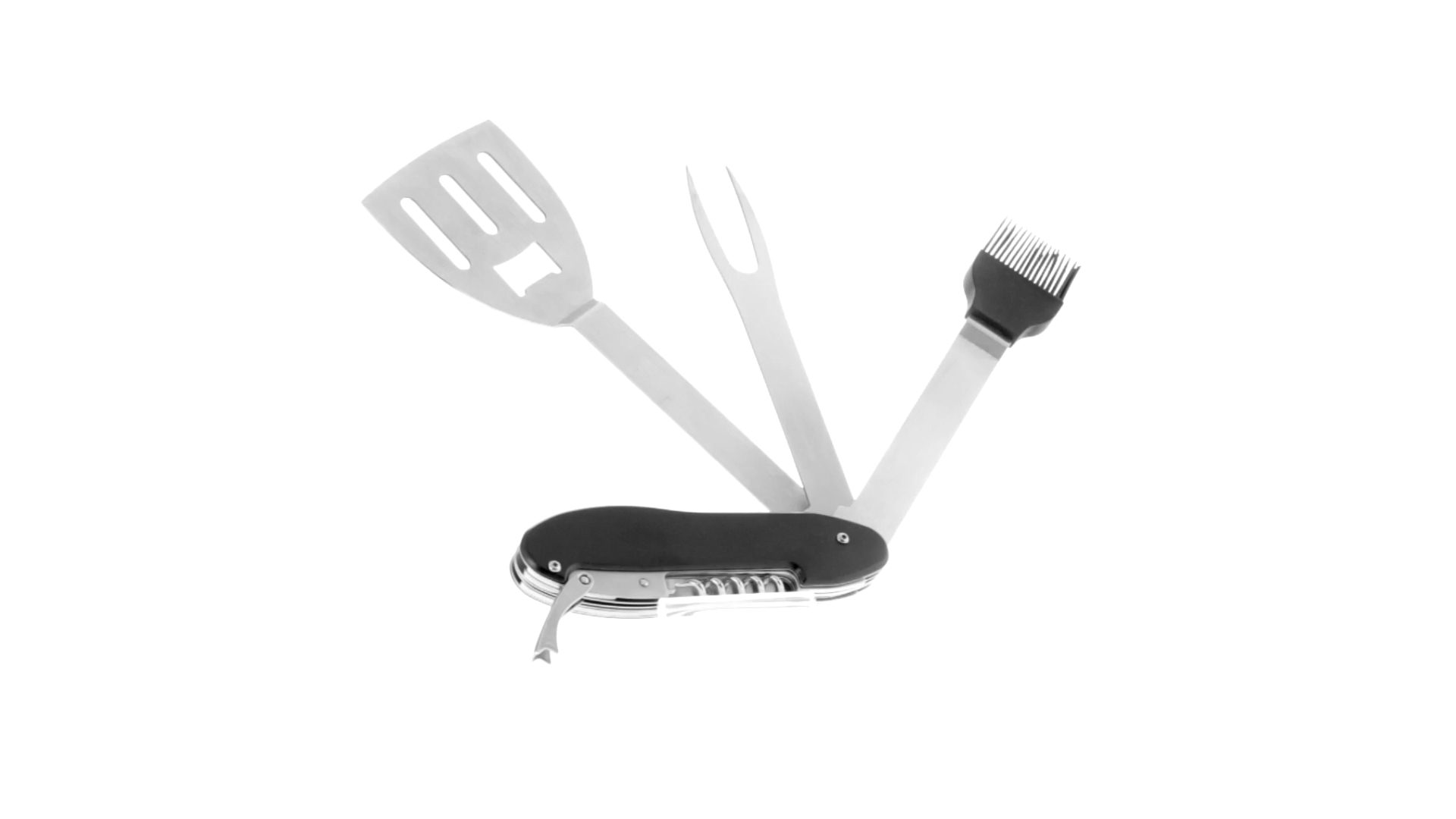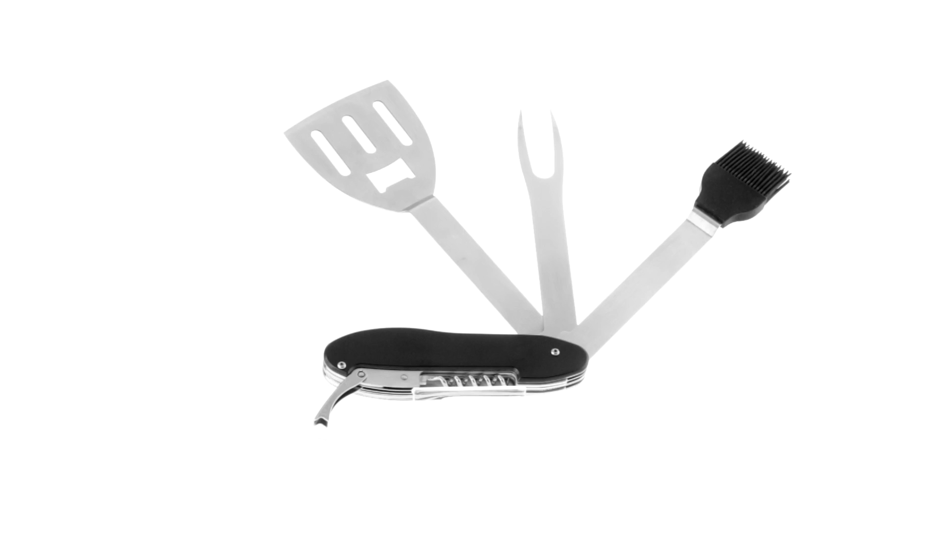 Praktisches Grill-Set aus Edelstahl. Mit Korkenzieher, Kapselschneider, Wender, Zange, Pinsel und Öffner.