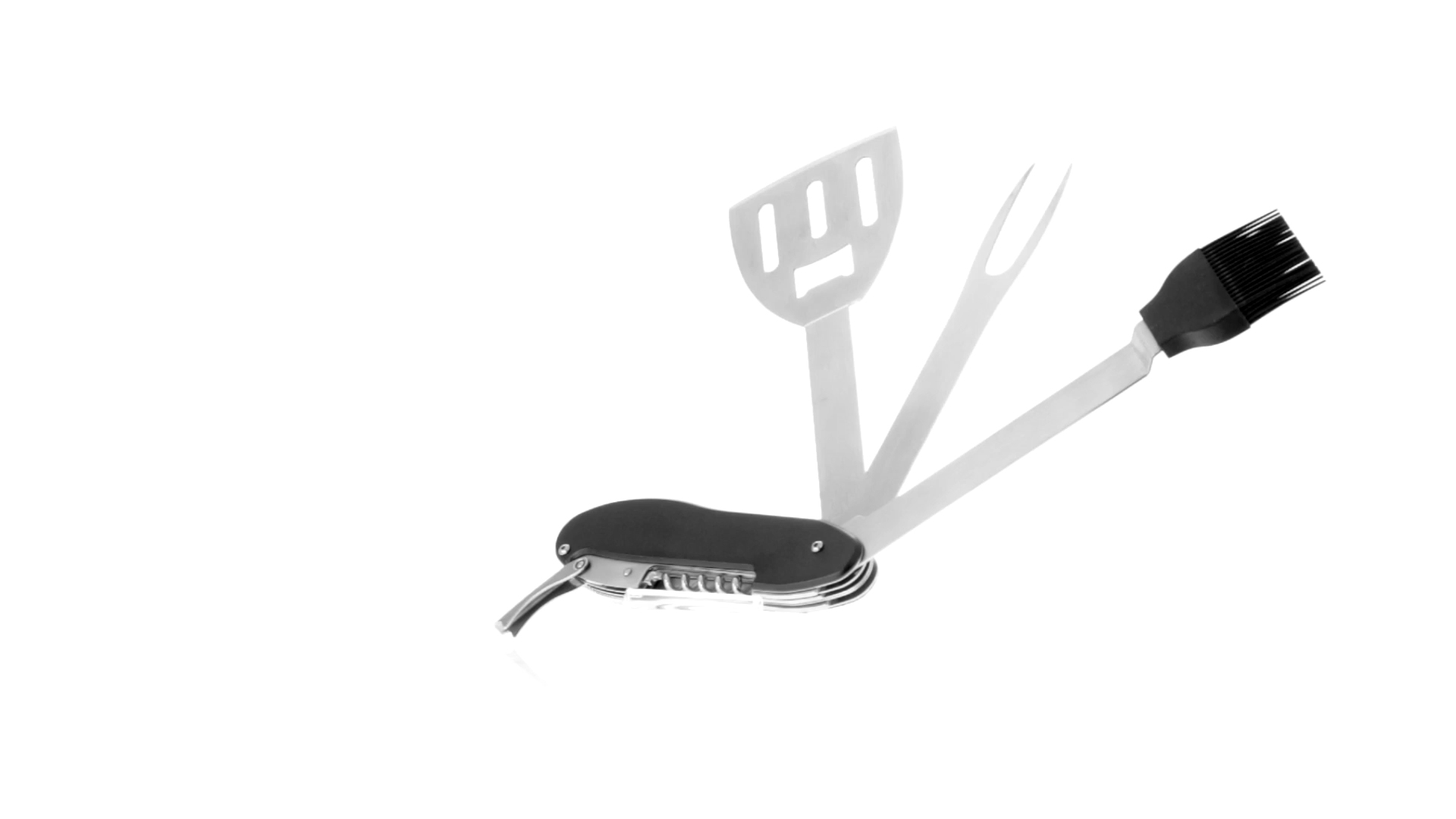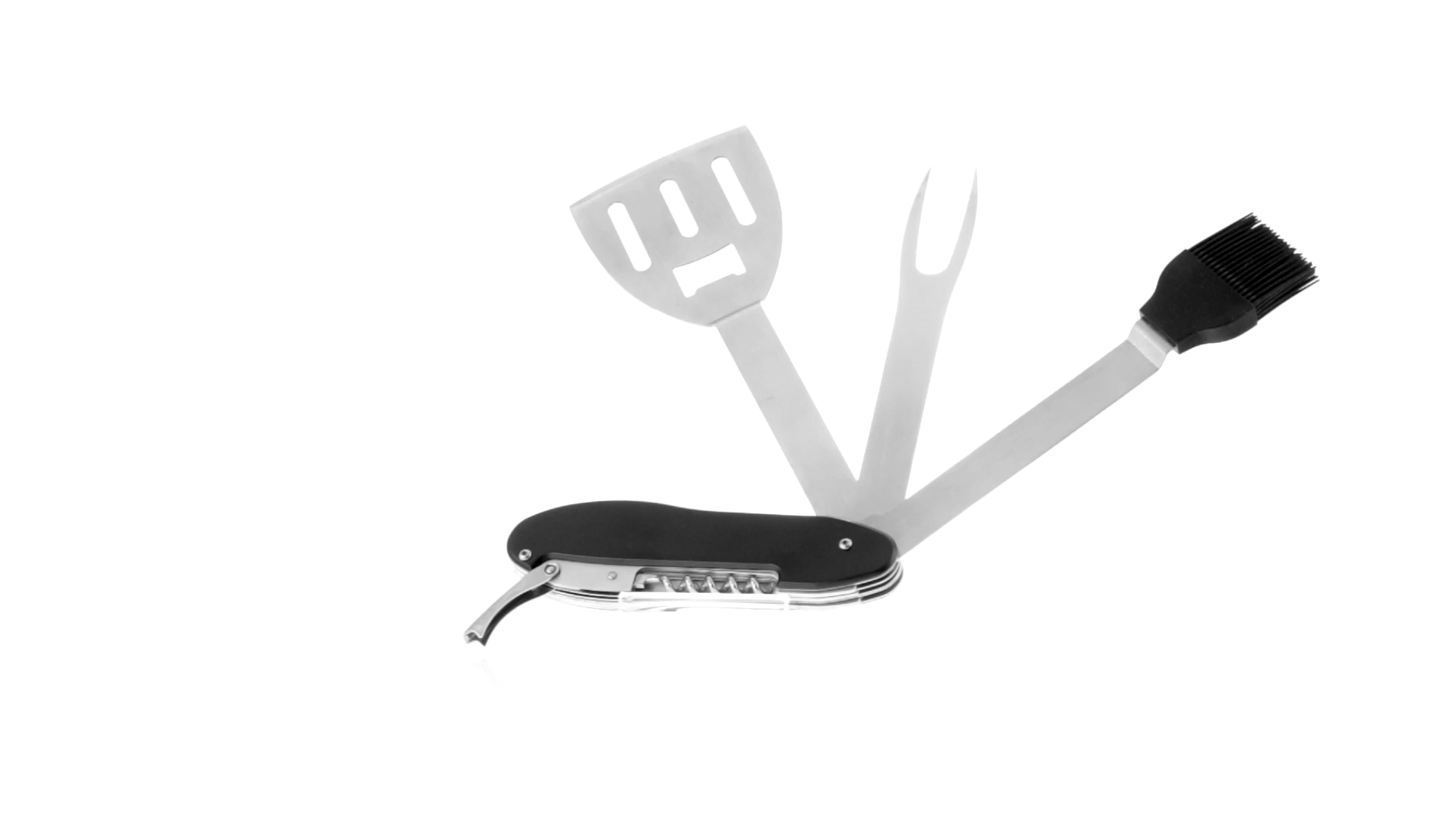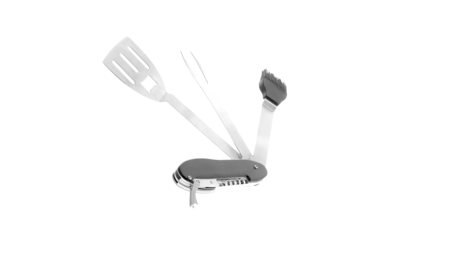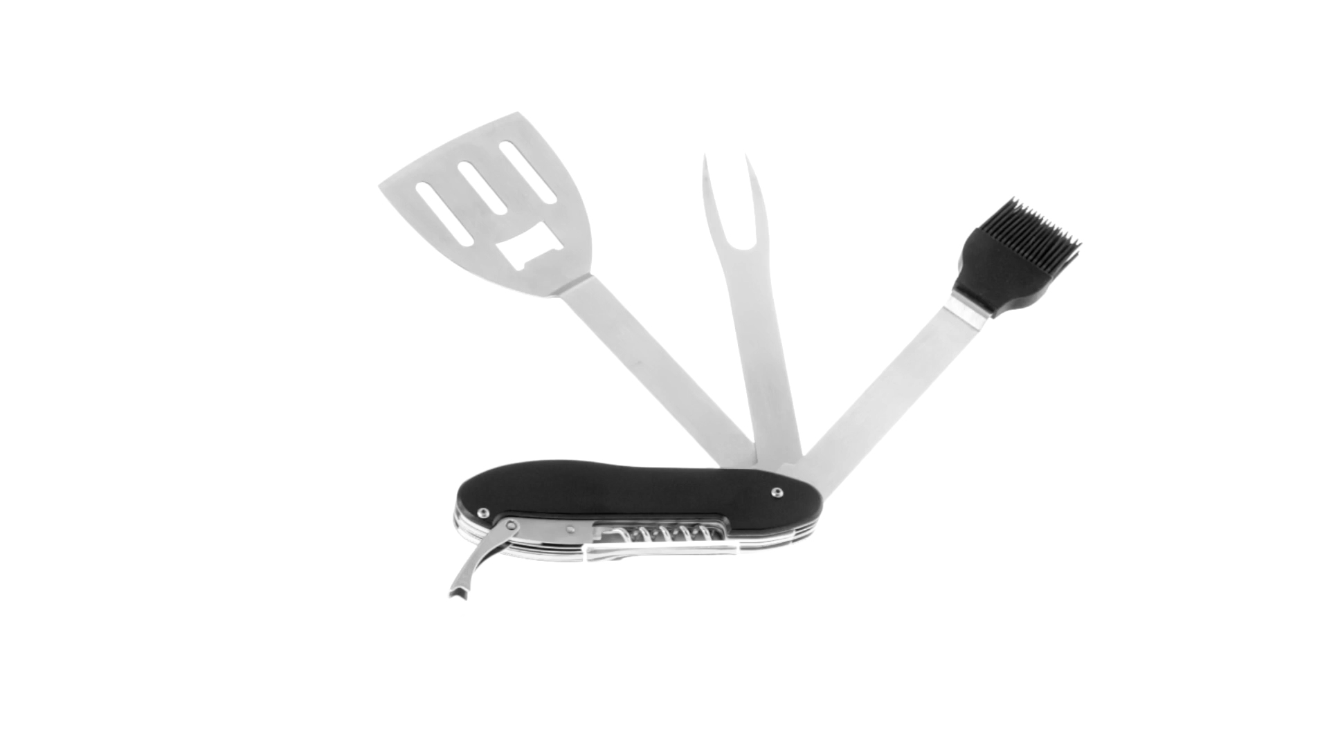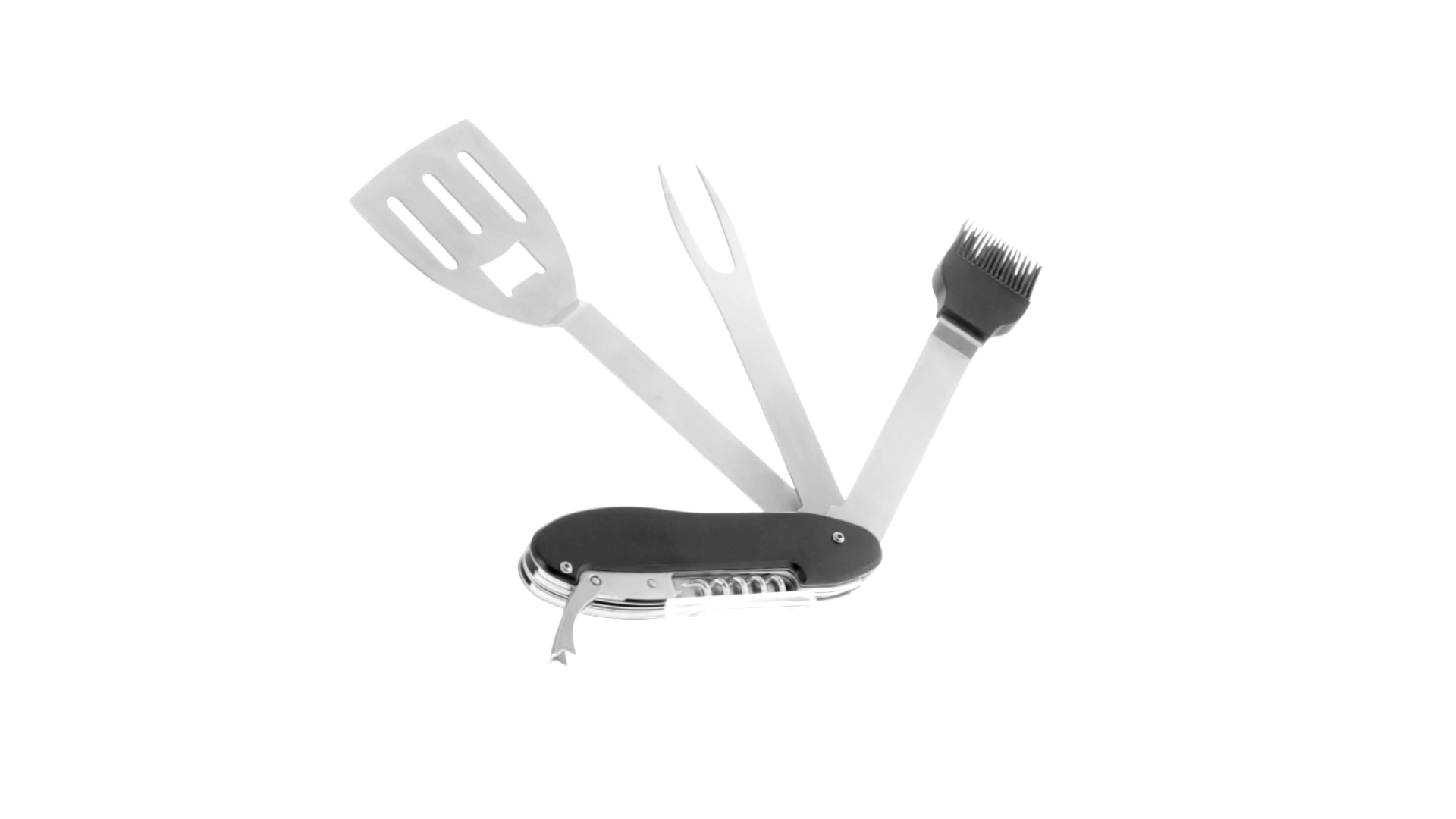 Praktisches Grill-Set aus Edelstahl. Mit Korkenzieher, Kapselschneider, Wender, Zange, Pinsel und Öffner.