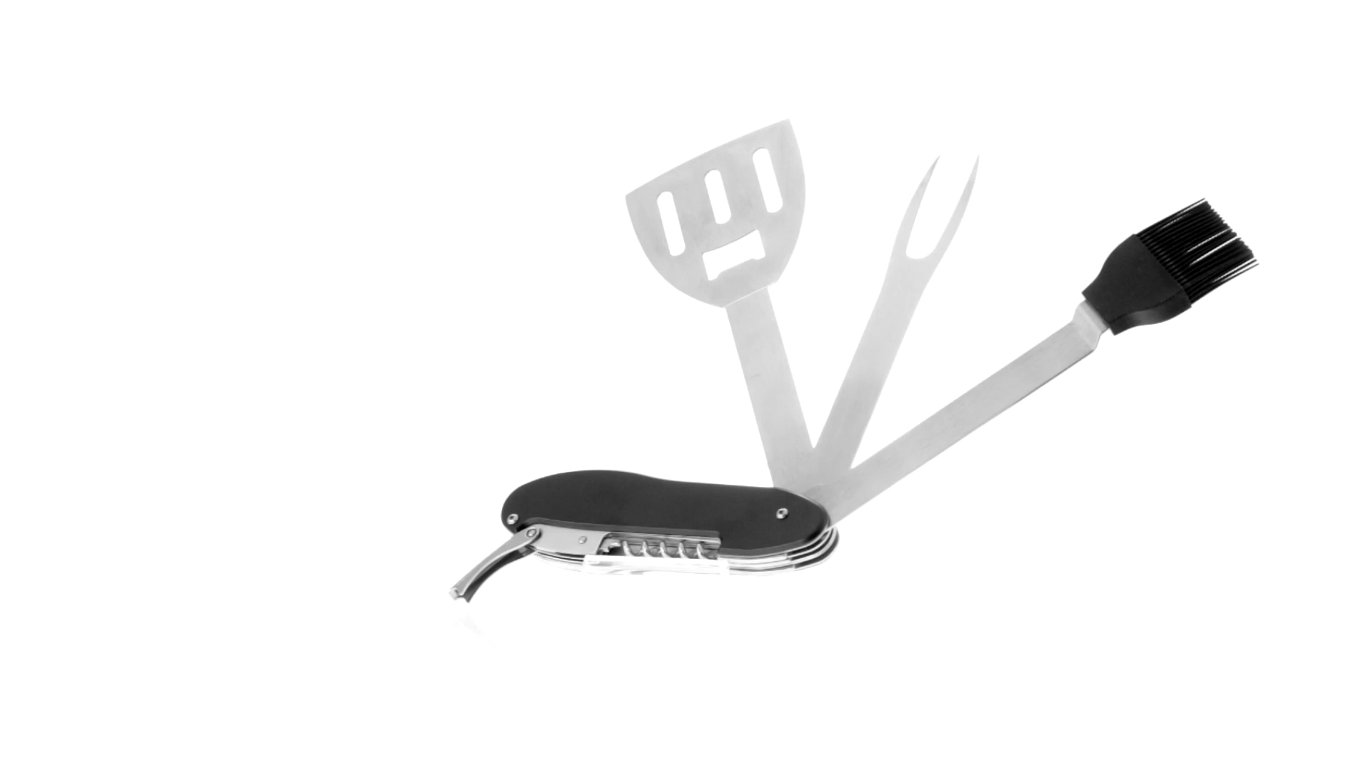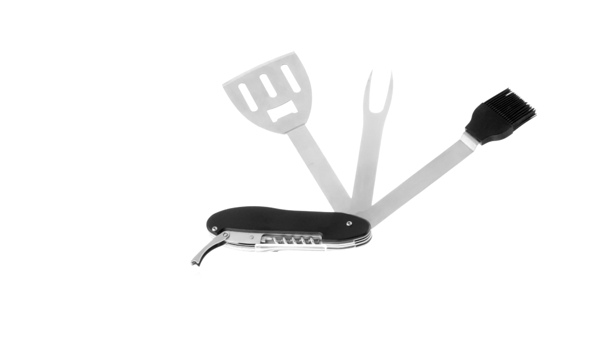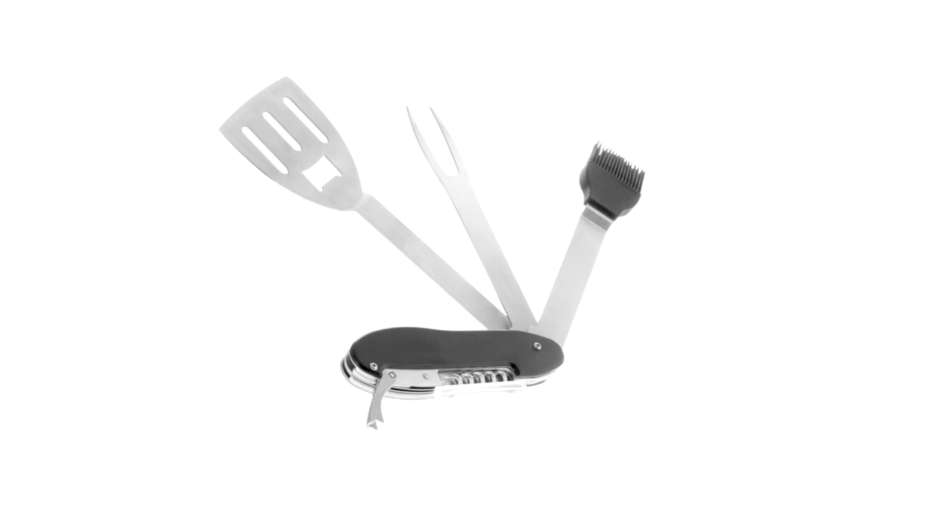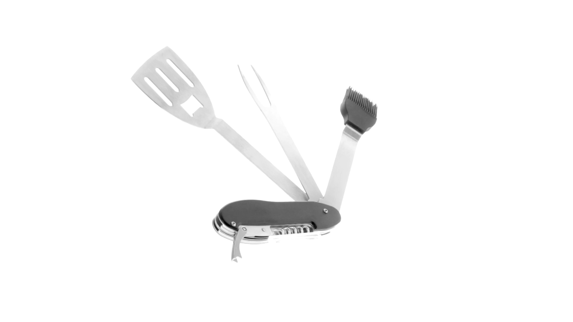 Praktisches Grill-Set aus Edelstahl. Mit Korkenzieher, Kapselschneider, Wender, Zange, Pinsel und Öffner.