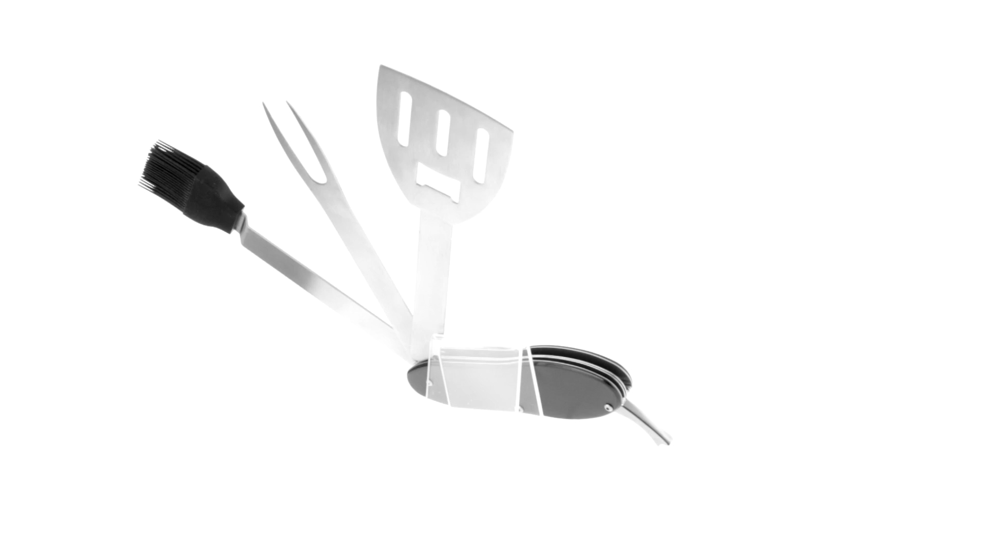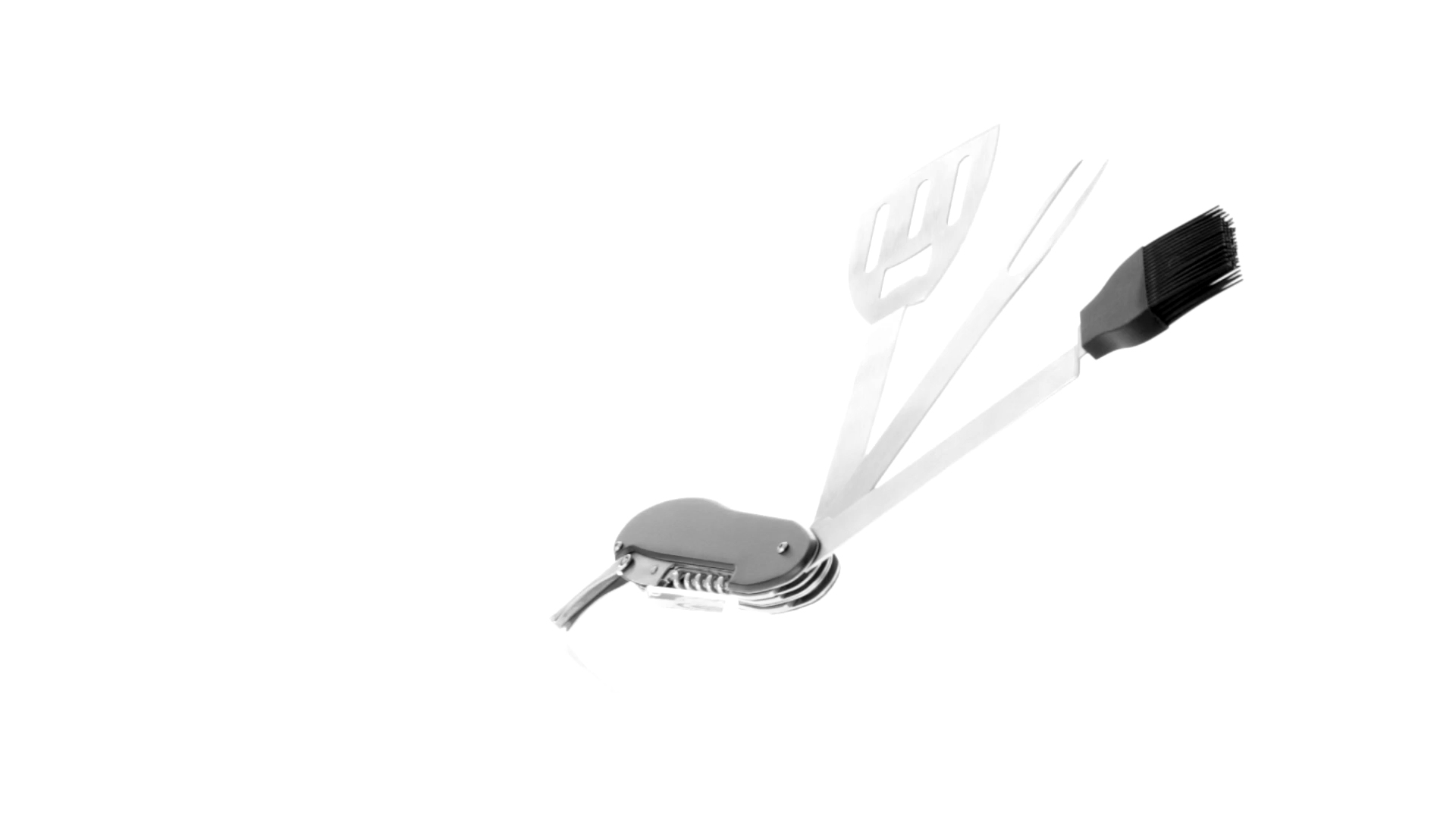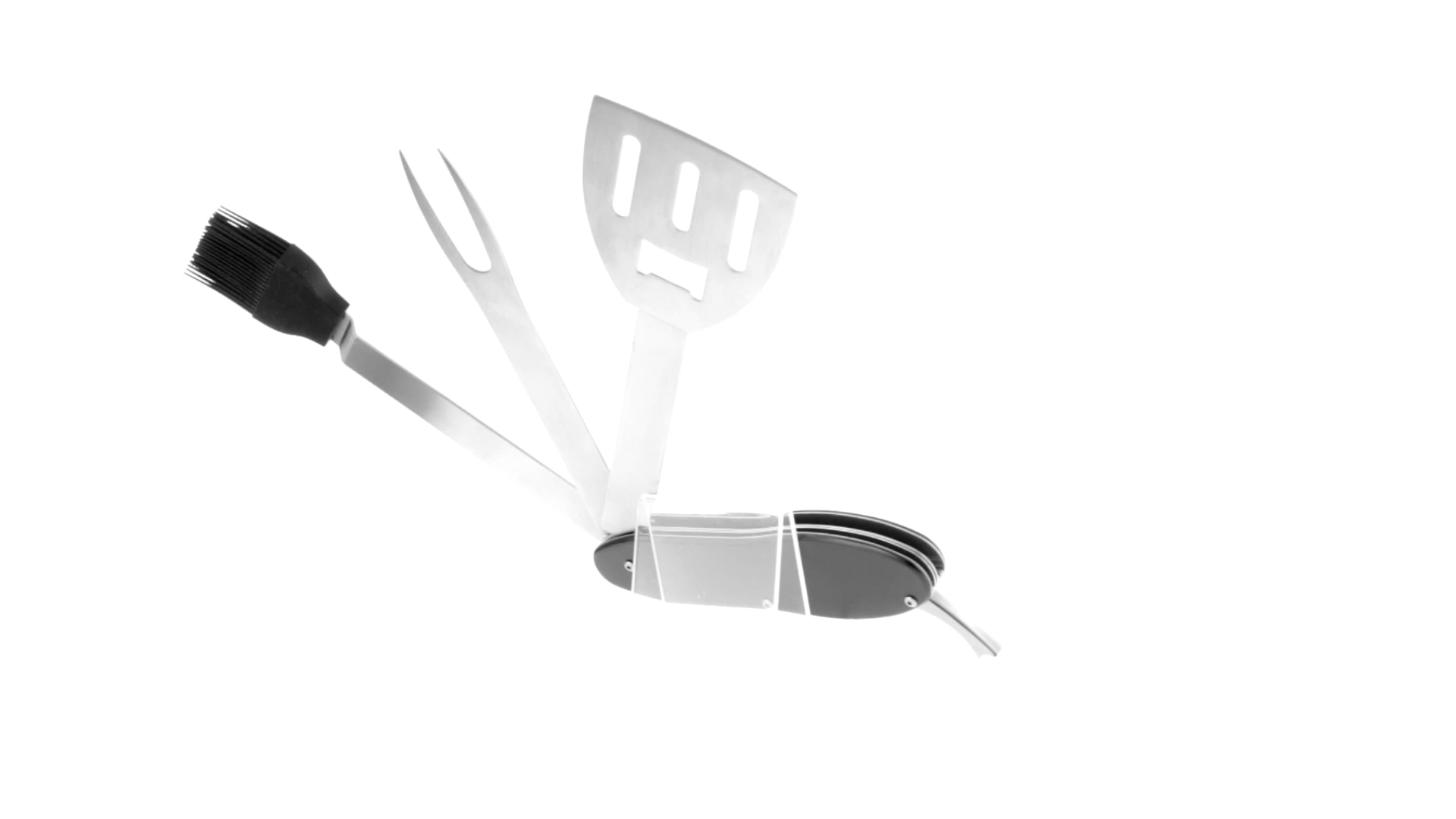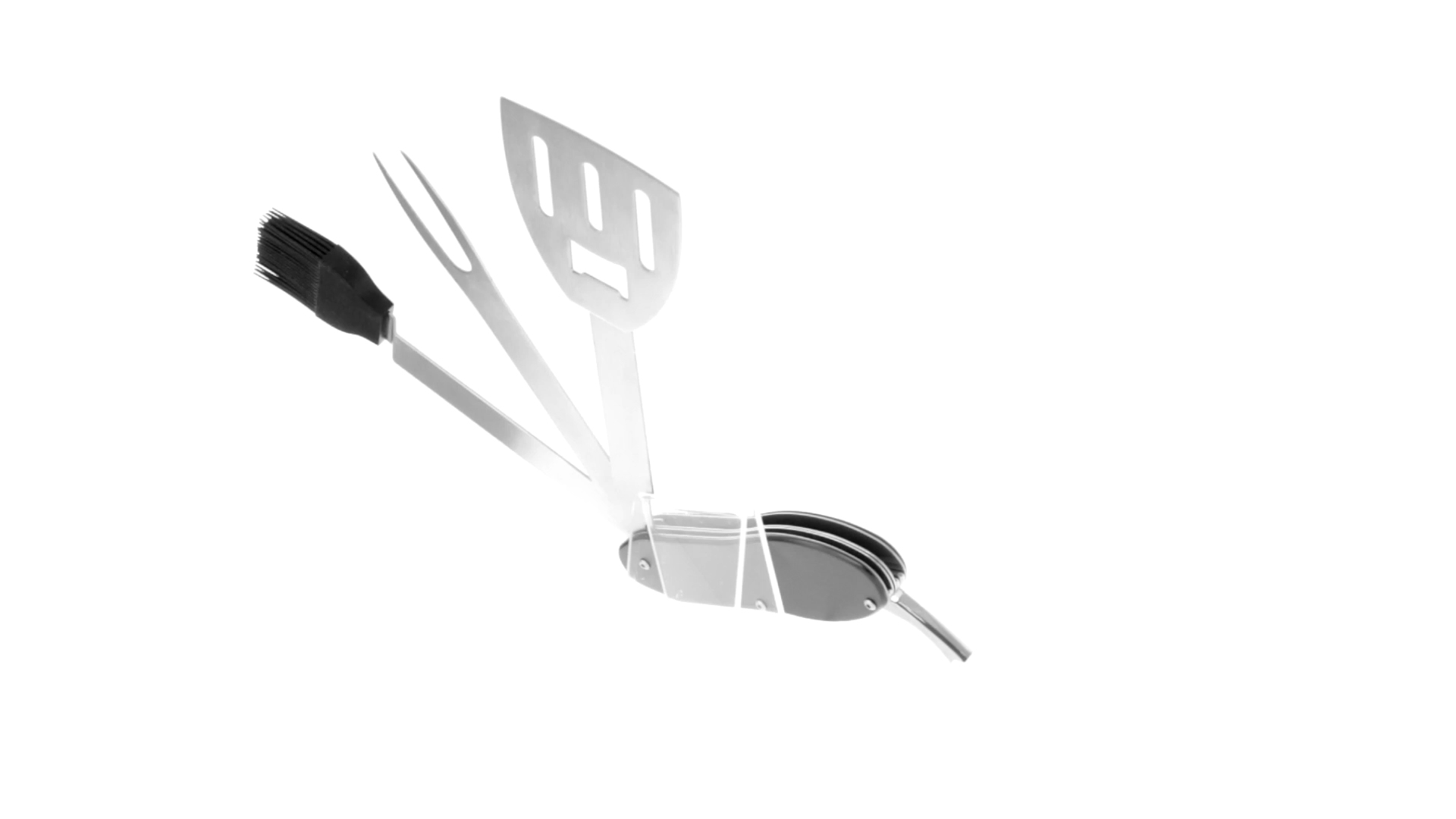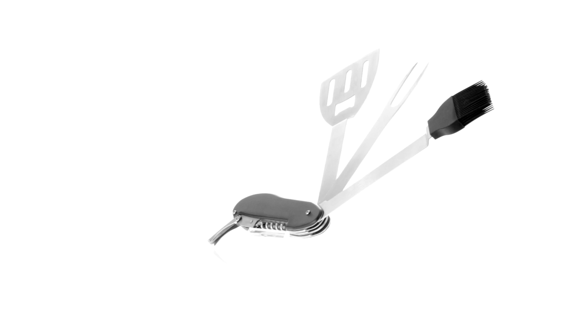 Praktisches Grill-Set aus Edelstahl. Mit Korkenzieher, Kapselschneider, Wender, Zange, Pinsel und Öffner.