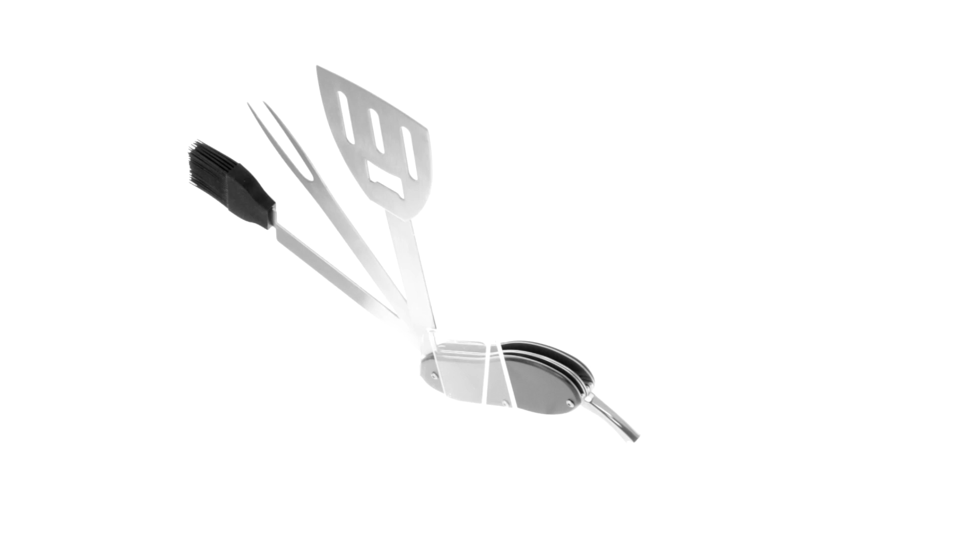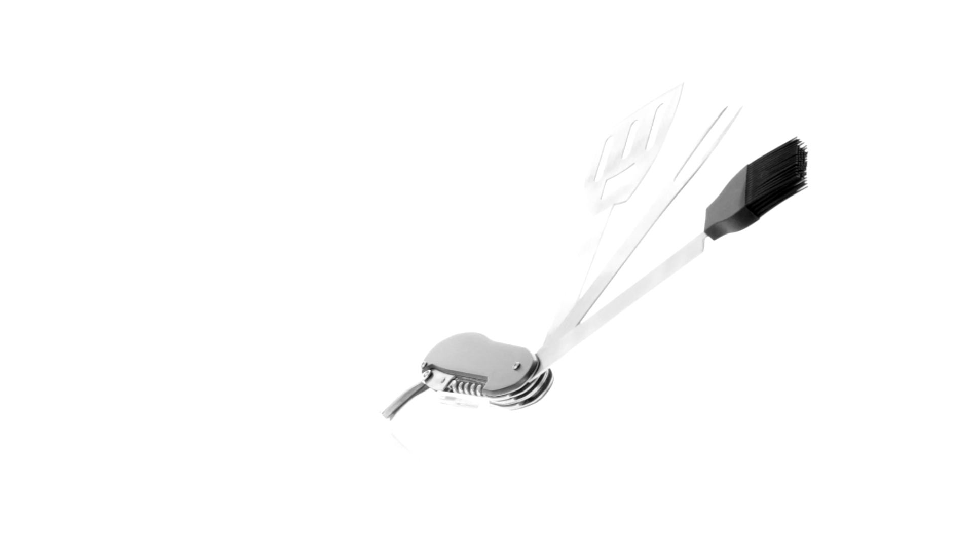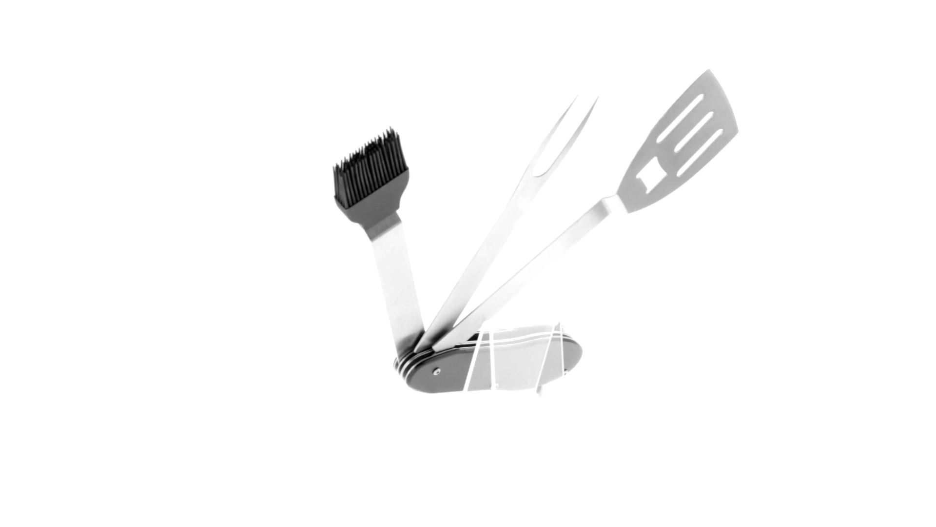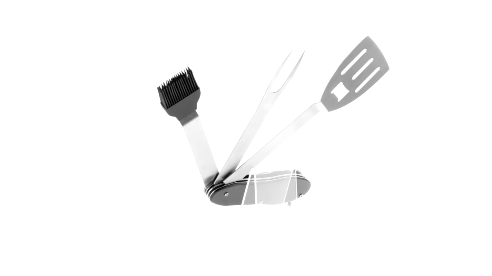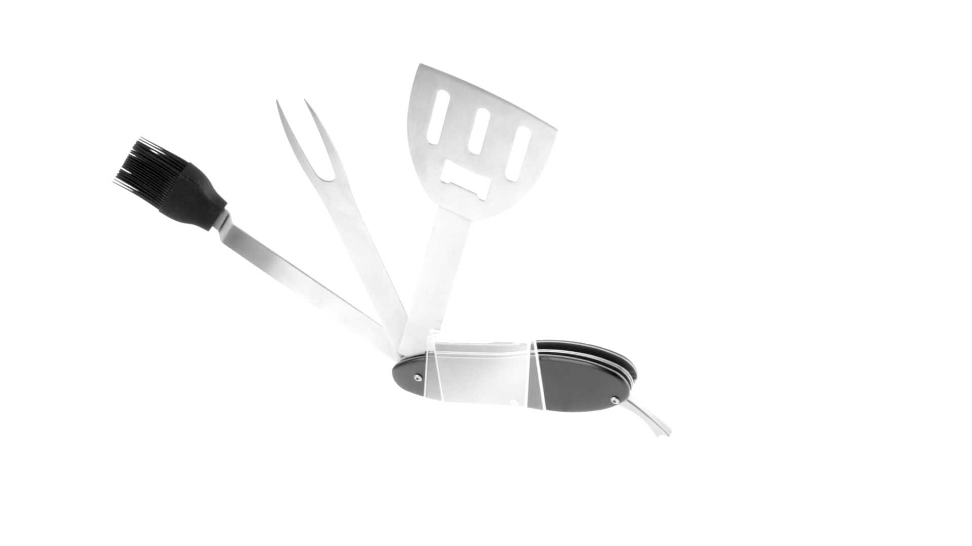 Praktisches Grill-Set aus Edelstahl. Mit Korkenzieher, Kapselschneider, Wender, Zange, Pinsel und Öffner.