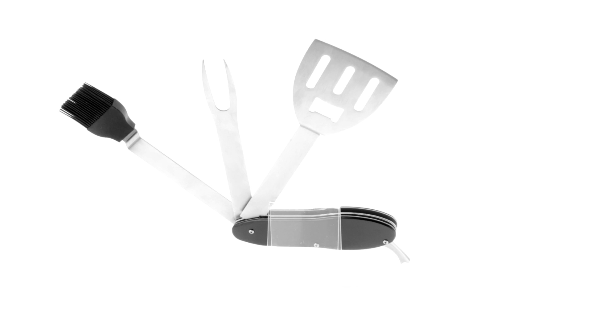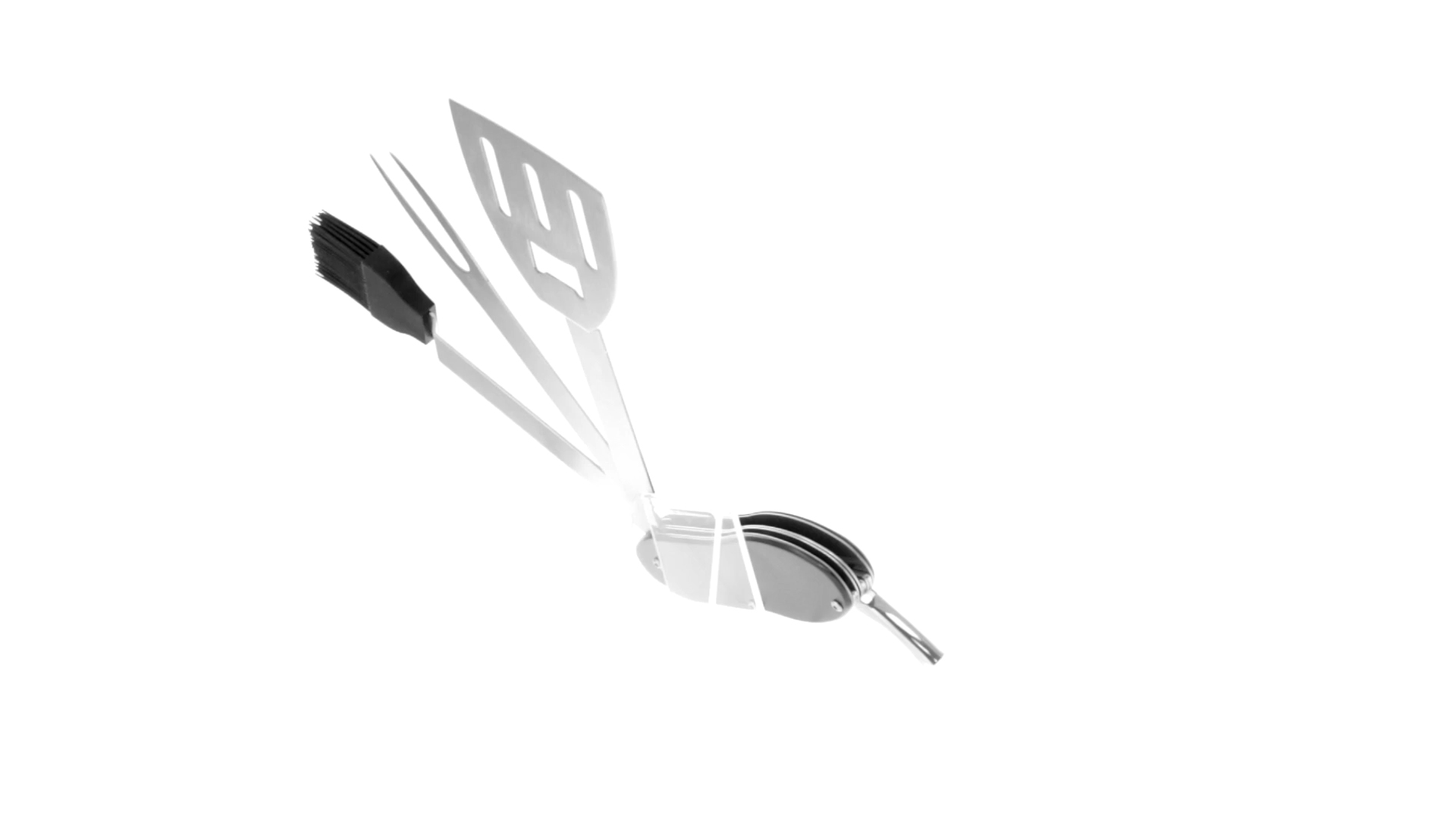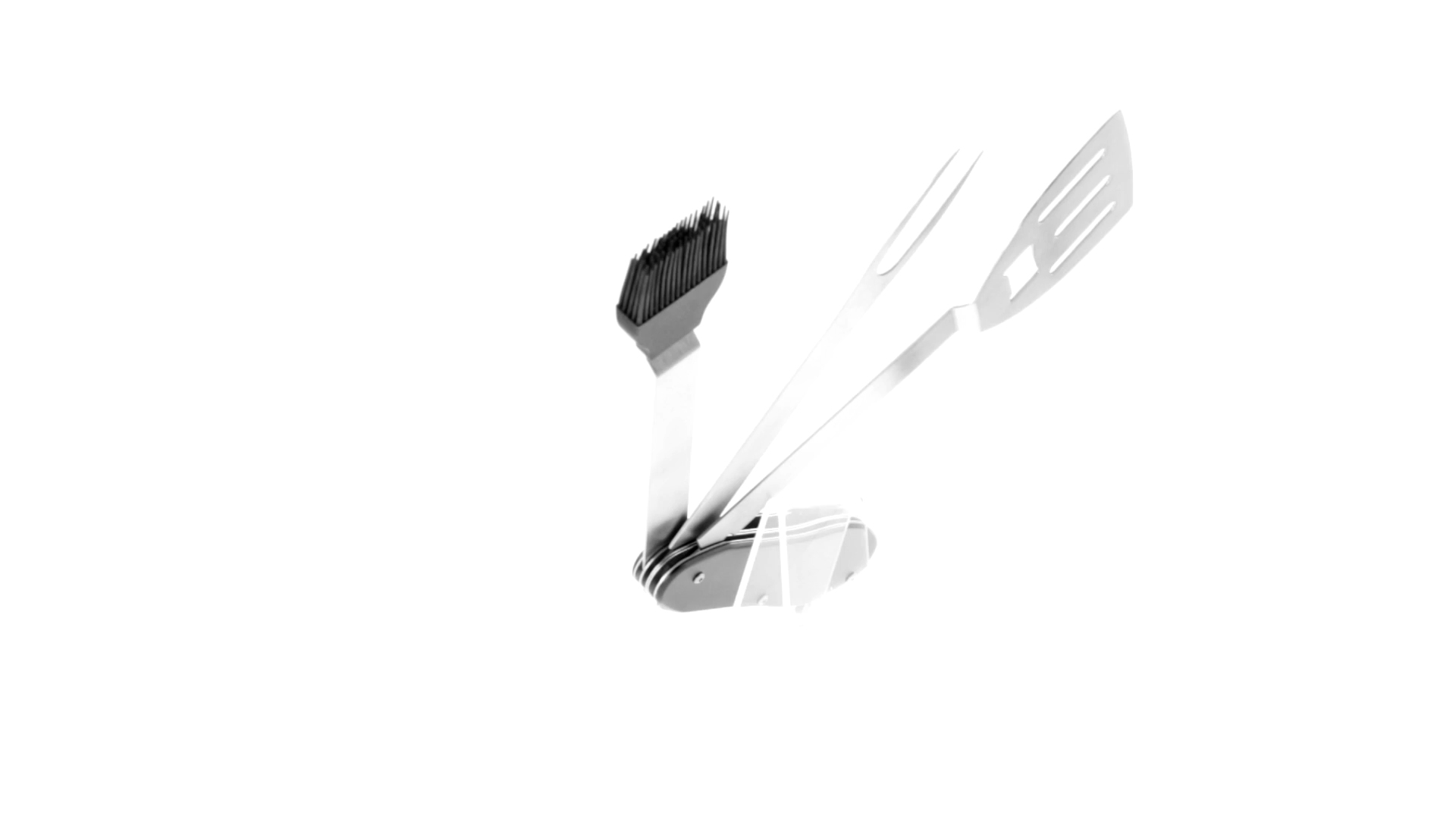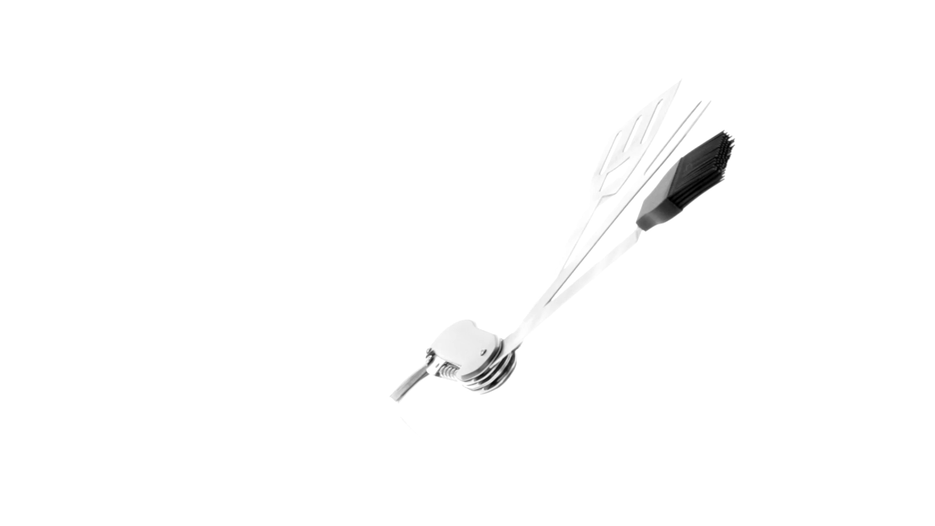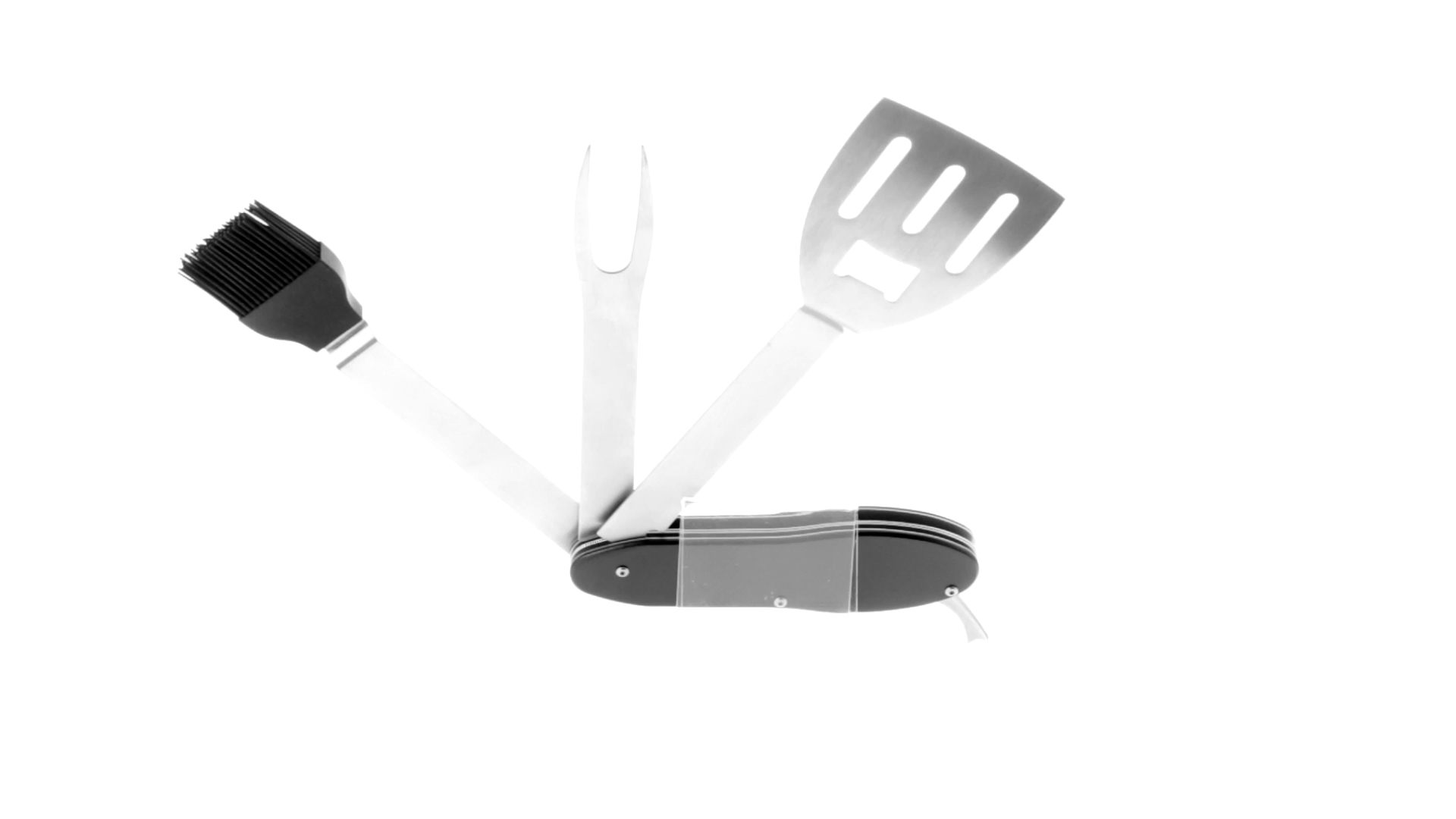 Praktisches Grill-Set aus Edelstahl. Mit Korkenzieher, Kapselschneider, Wender, Zange, Pinsel und Öffner.
