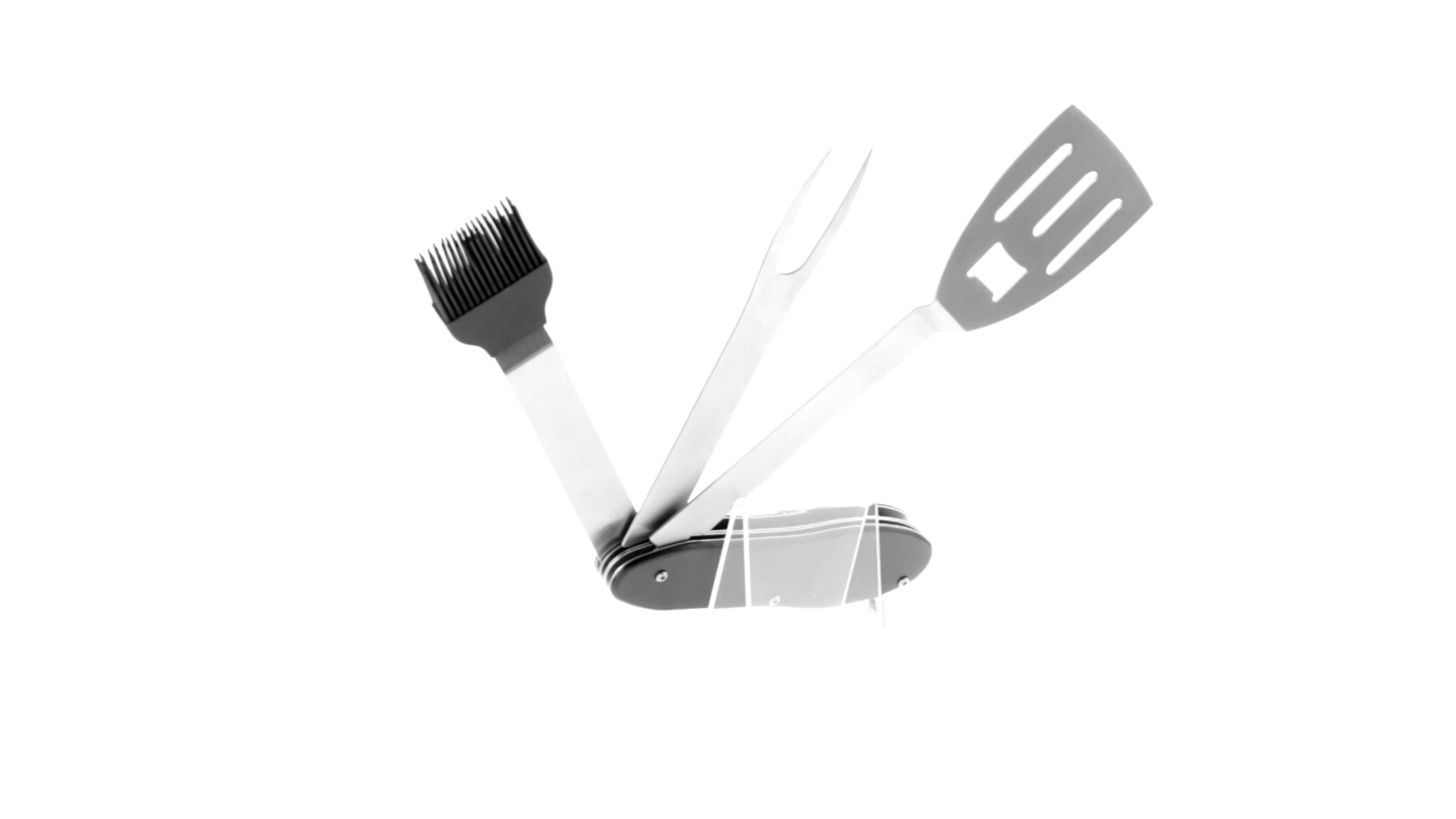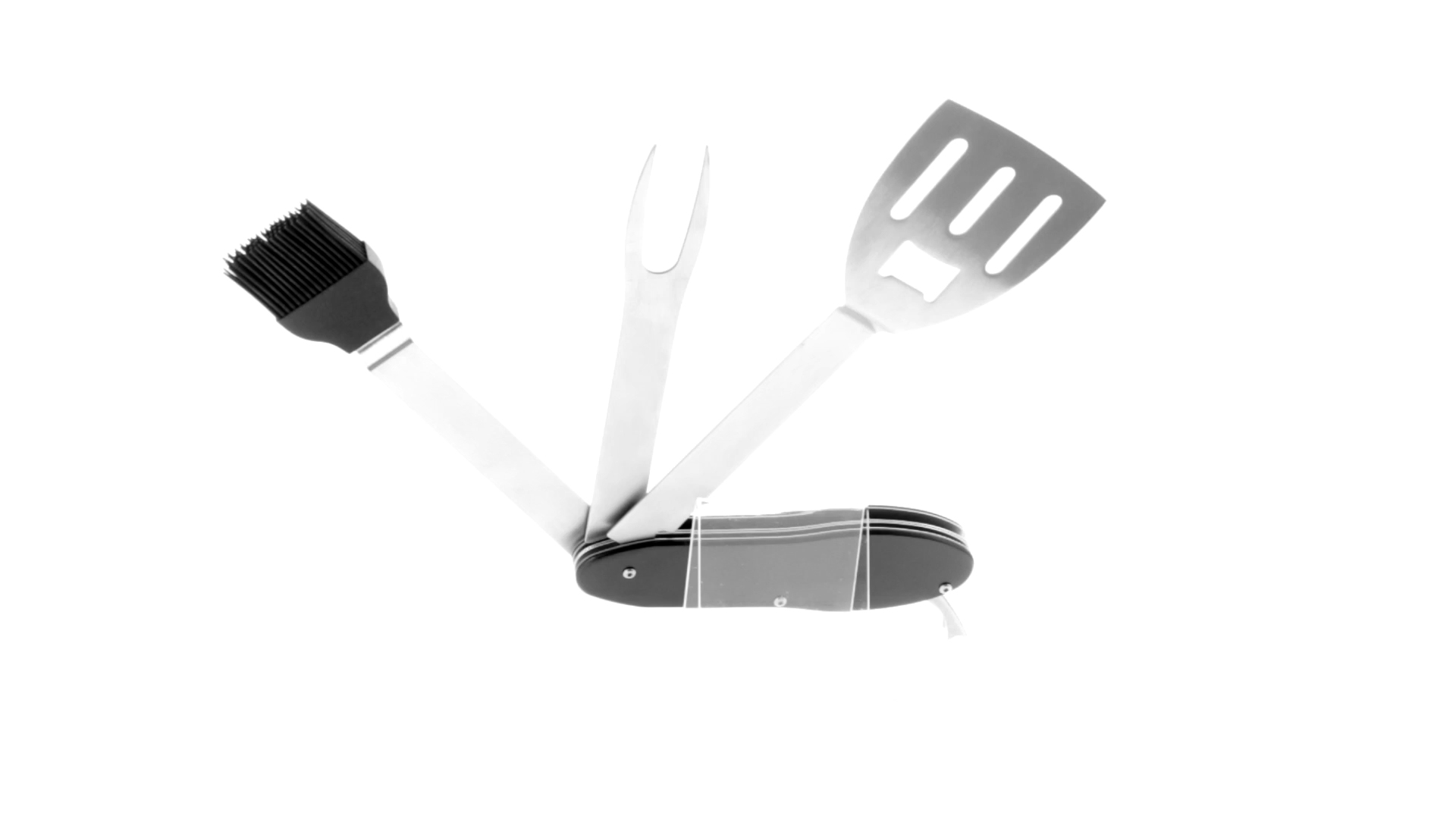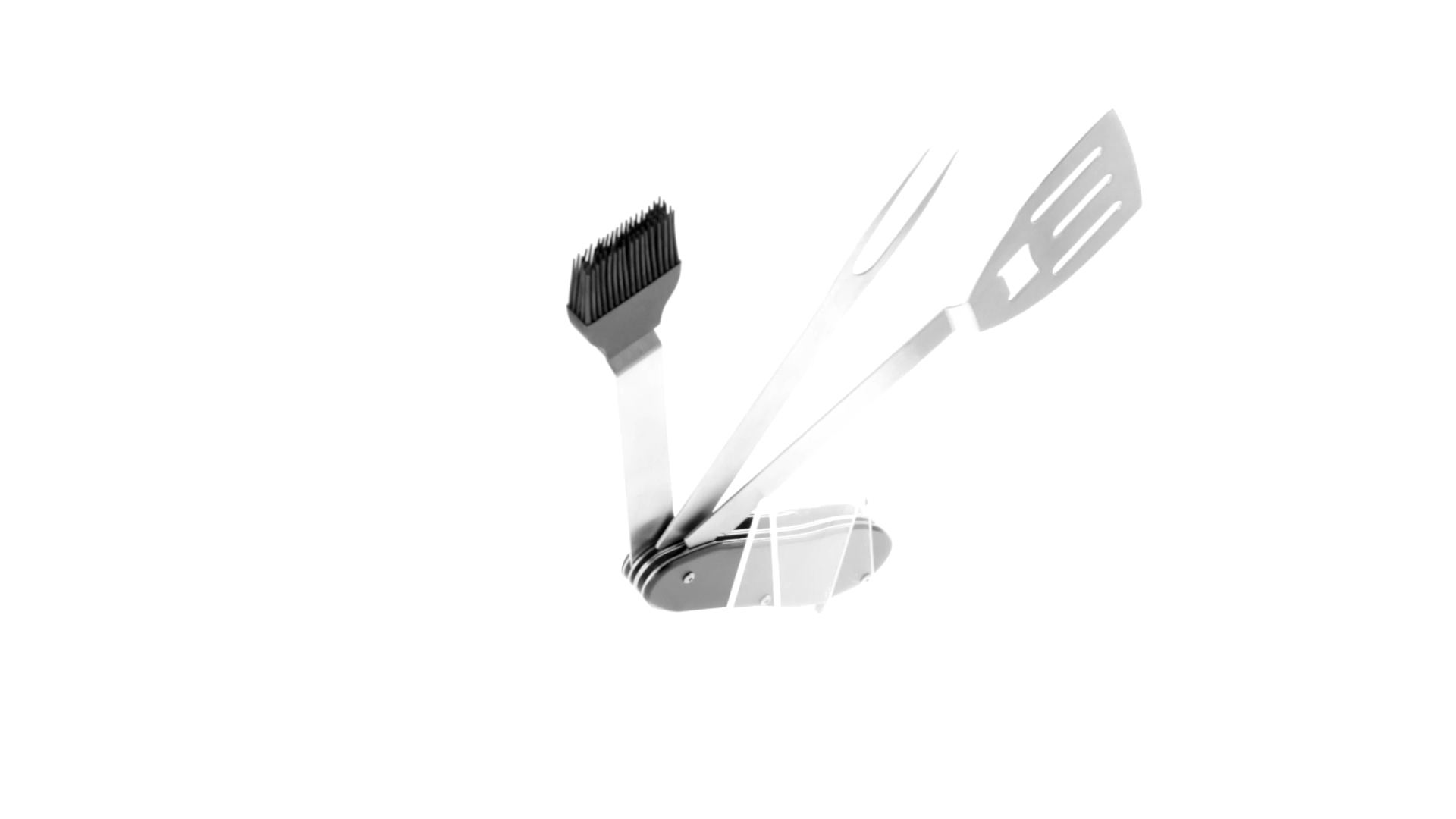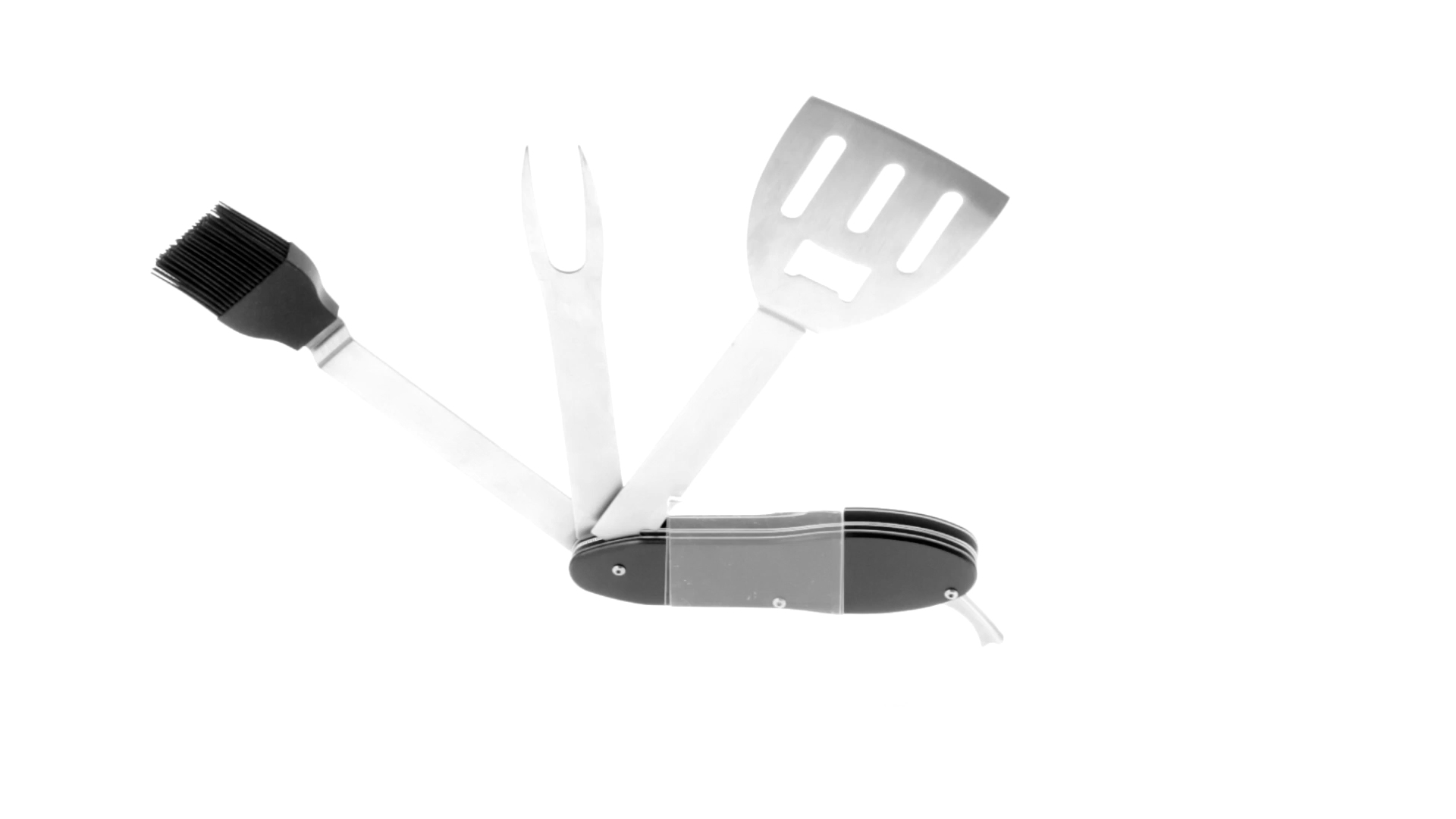 Praktisches Grill-Set aus Edelstahl. Mit Korkenzieher, Kapselschneider, Wender, Zange, Pinsel und Öffner.