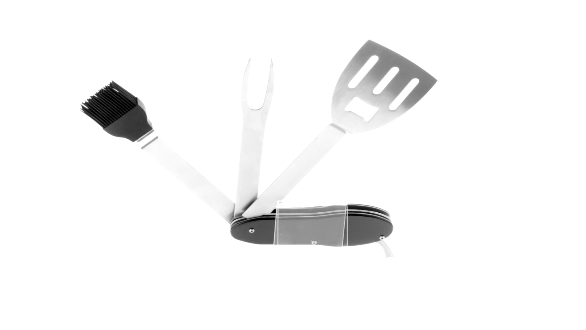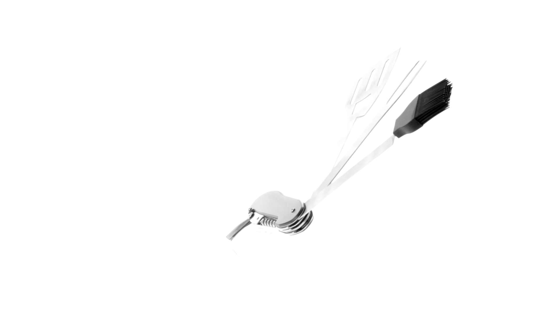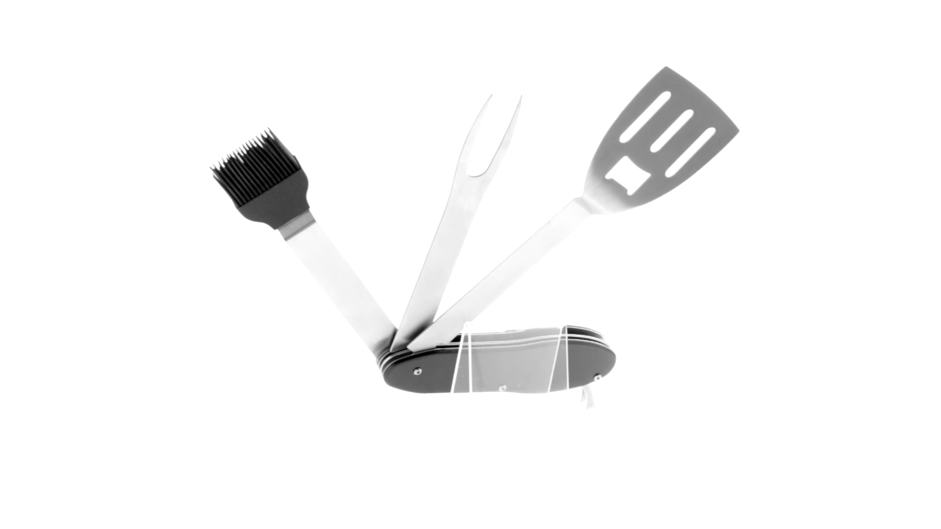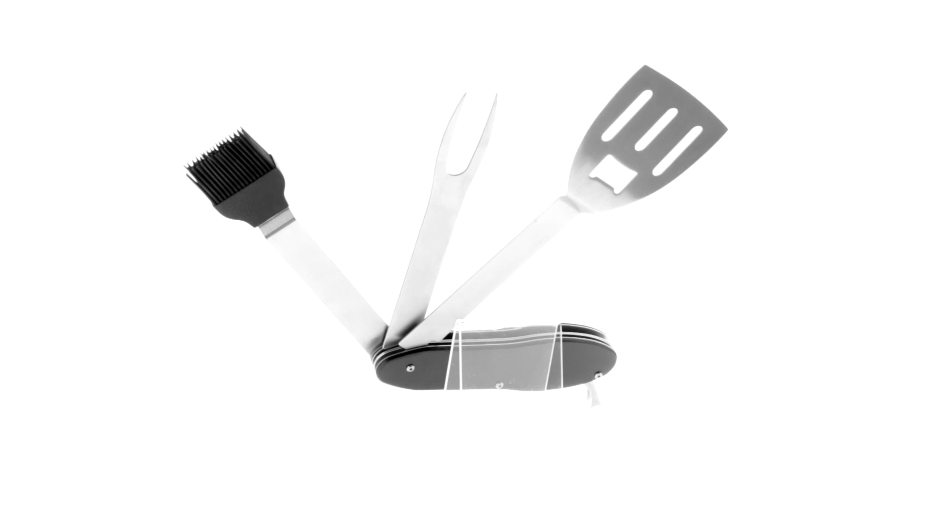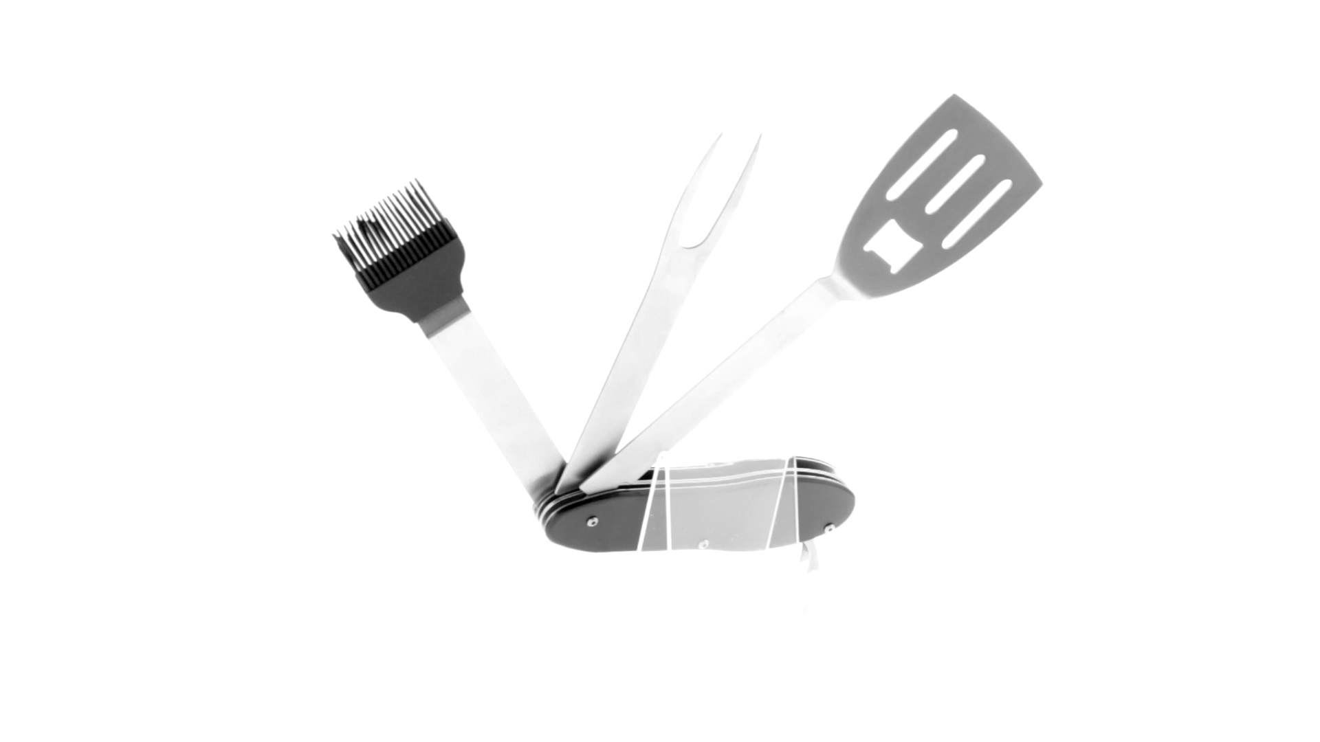 Praktisches Grill-Set aus Edelstahl. Mit Korkenzieher, Kapselschneider, Wender, Zange, Pinsel und Öffner.