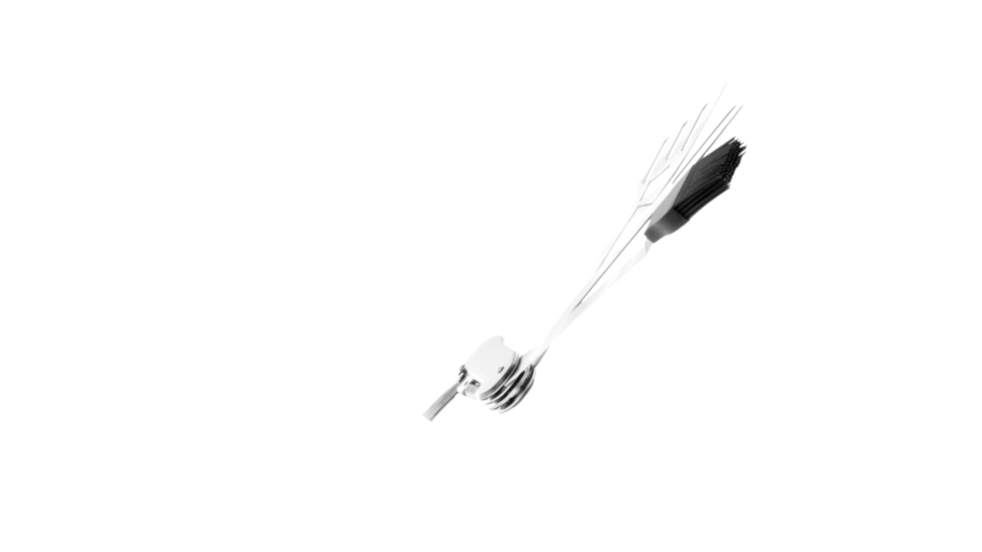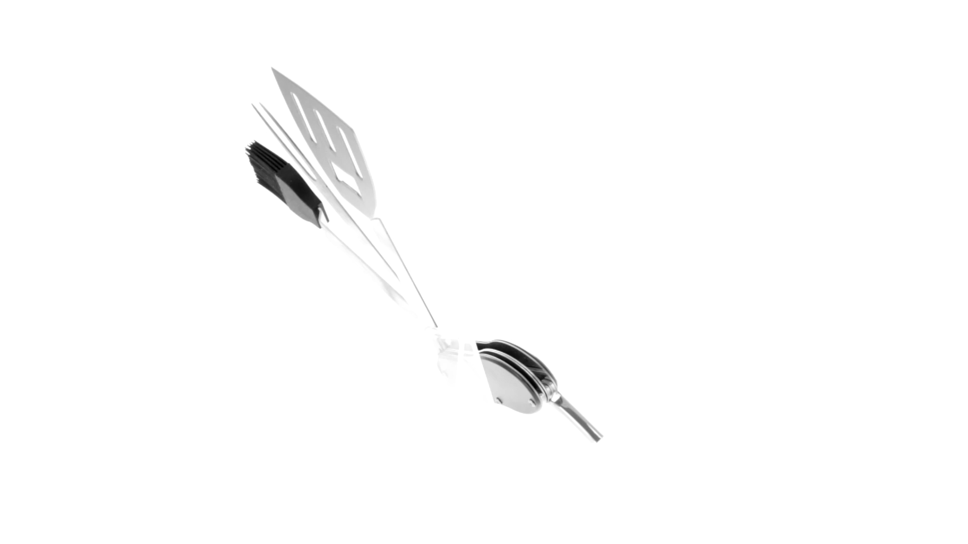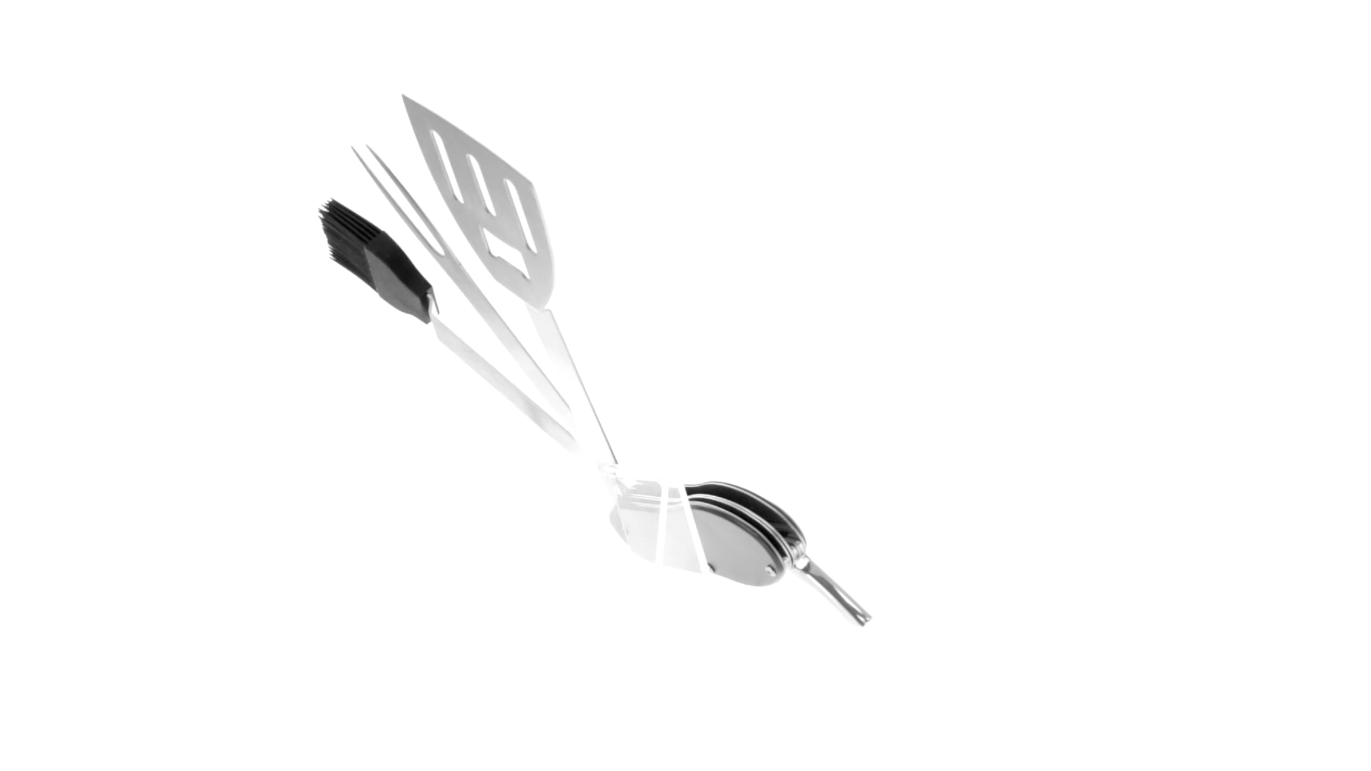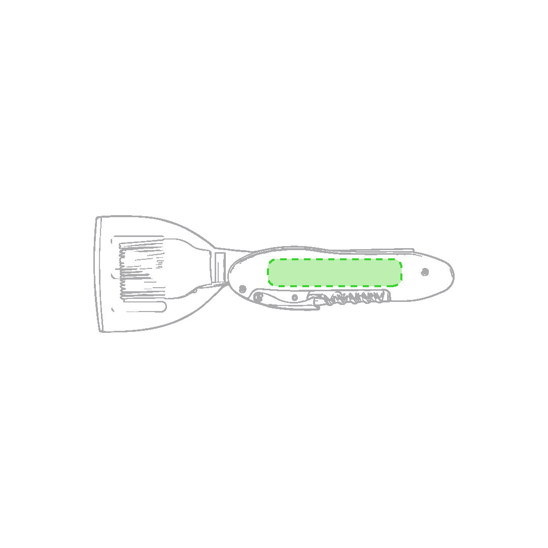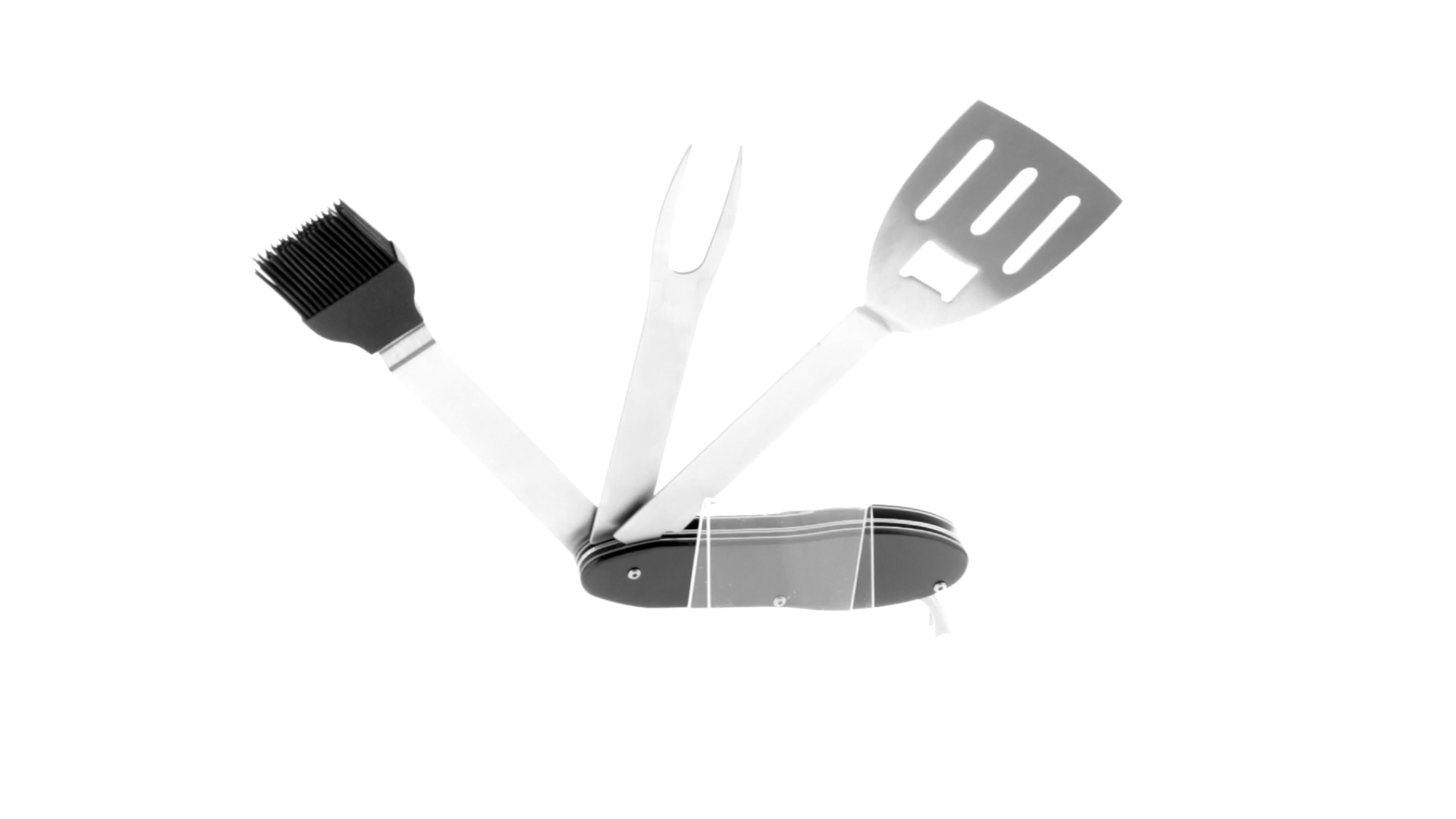 Praktisches Grill-Set aus Edelstahl. Mit Korkenzieher, Kapselschneider, Wender, Zange, Pinsel und Öffner.