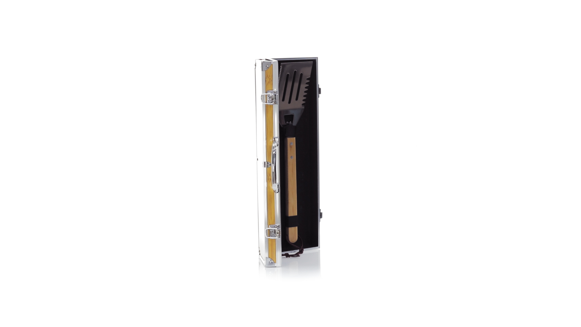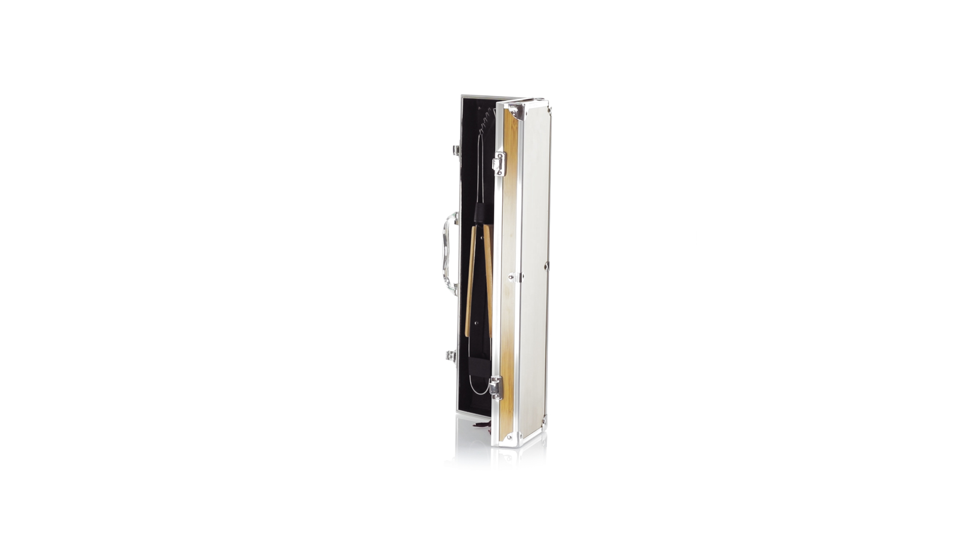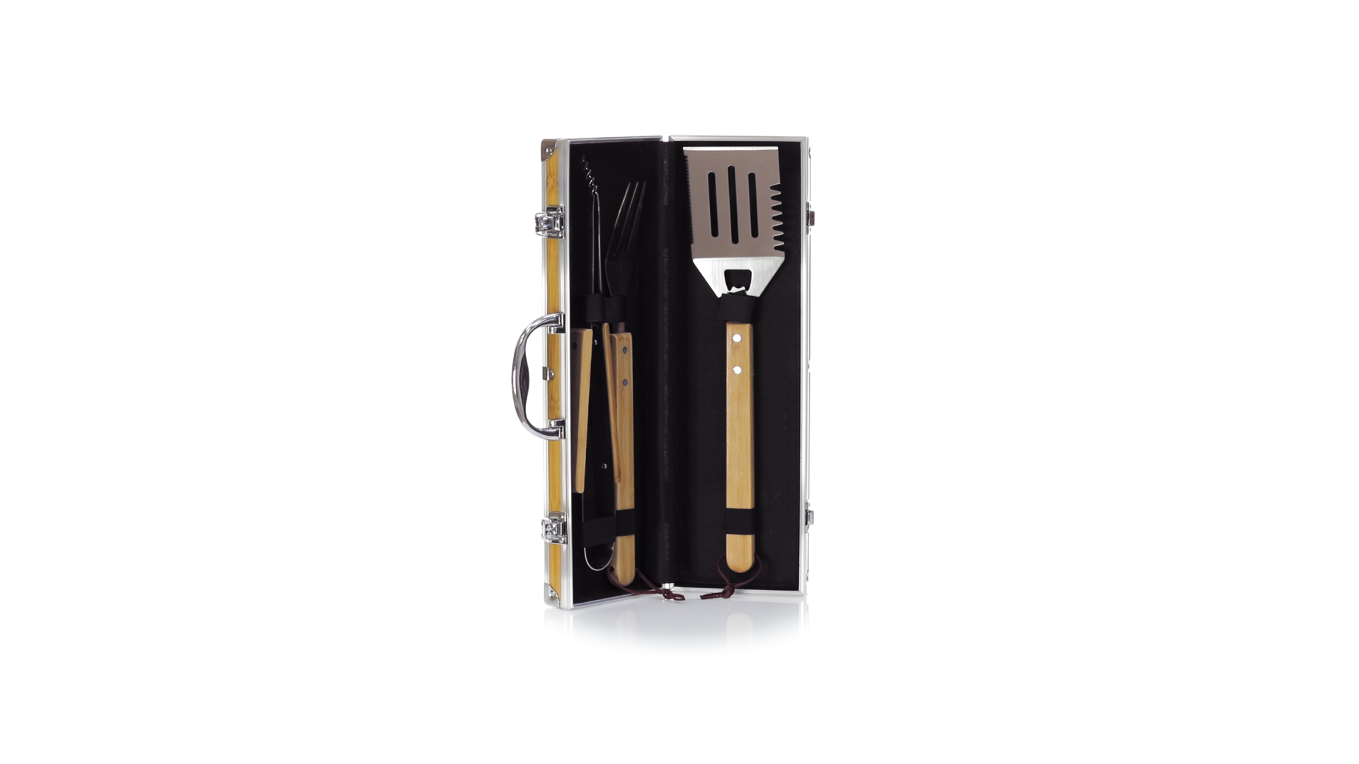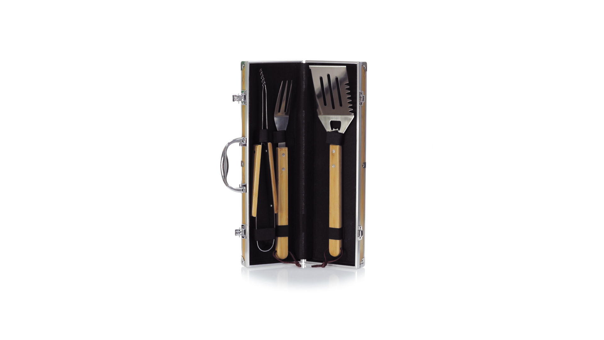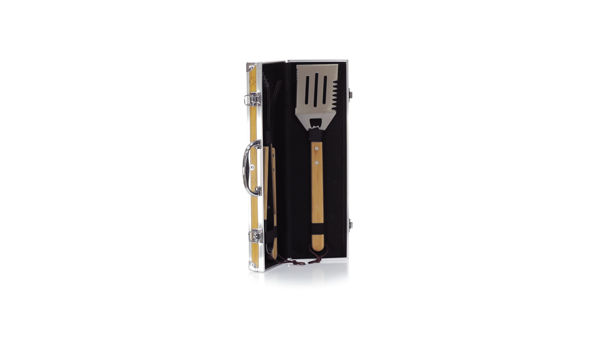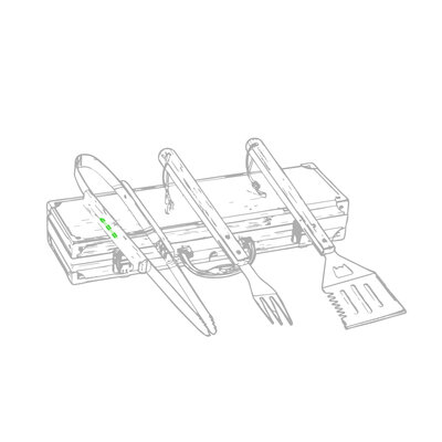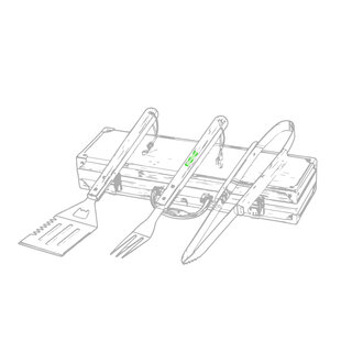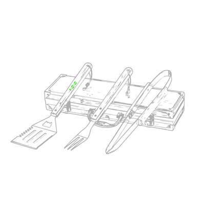 Grillset der Liene "Natur" und 3 Zubehörteile aus Metall mit Bambusgriff. Inklusive Kelle mit Öffner, Schnitzer und Pinzette. Präsentiert in einem imitierten Bambusgehäuse mit Metalloberflächen. Präsentiert in einer attraktiven Einzelbox im Öko-Design.