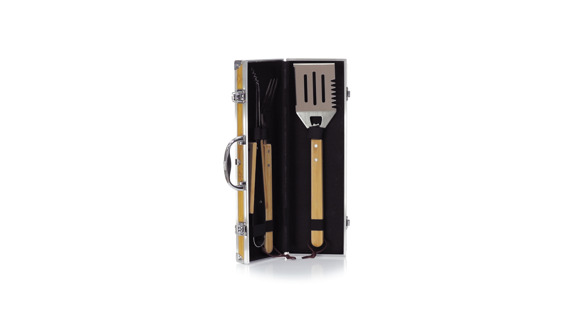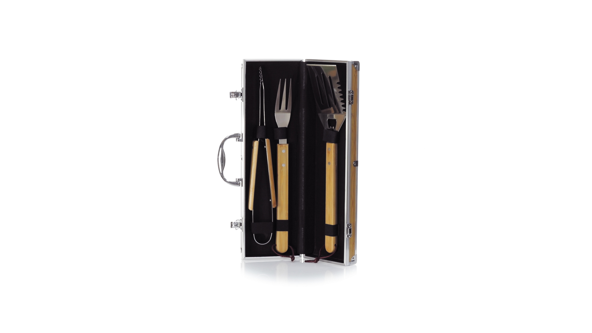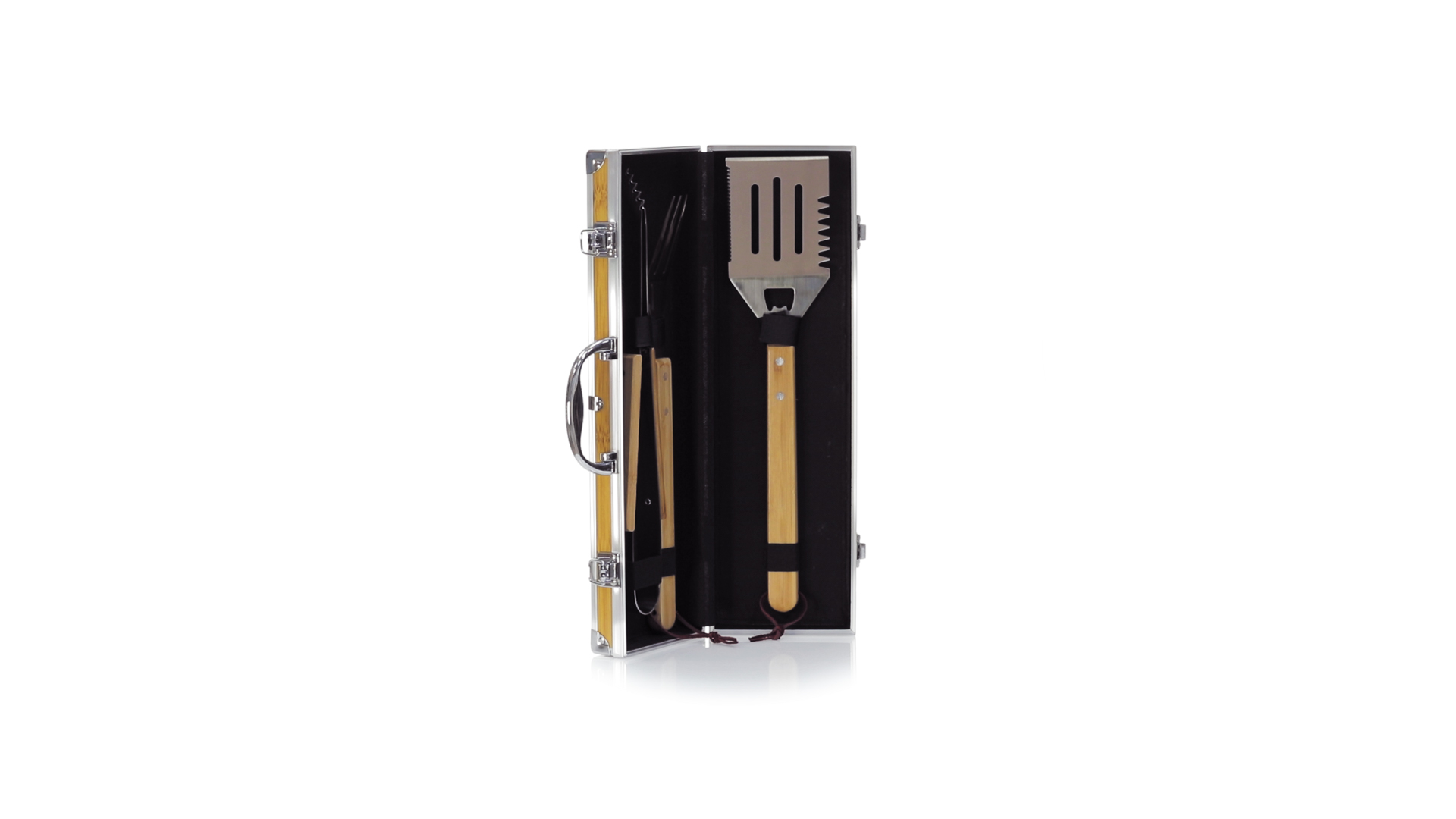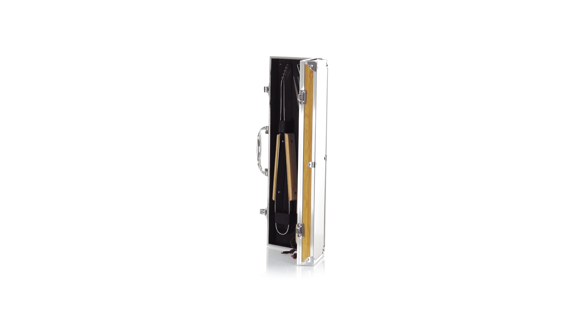 Grillset der Liene "Natur" und 3 Zubehörteile aus Metall mit Bambusgriff. Inklusive Kelle mit Öffner, Schnitzer und Pinzette. Präsentiert in einem imitierten Bambusgehäuse mit Metalloberflächen. Präsentiert in einer attraktiven Einzelbox im Öko-Design.