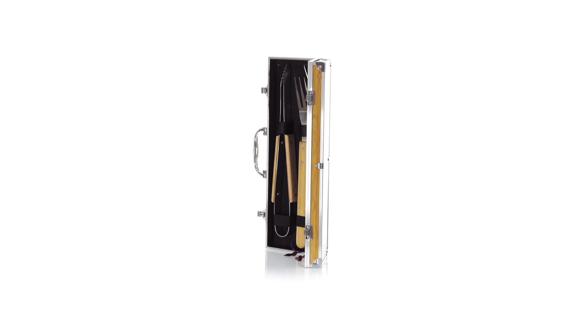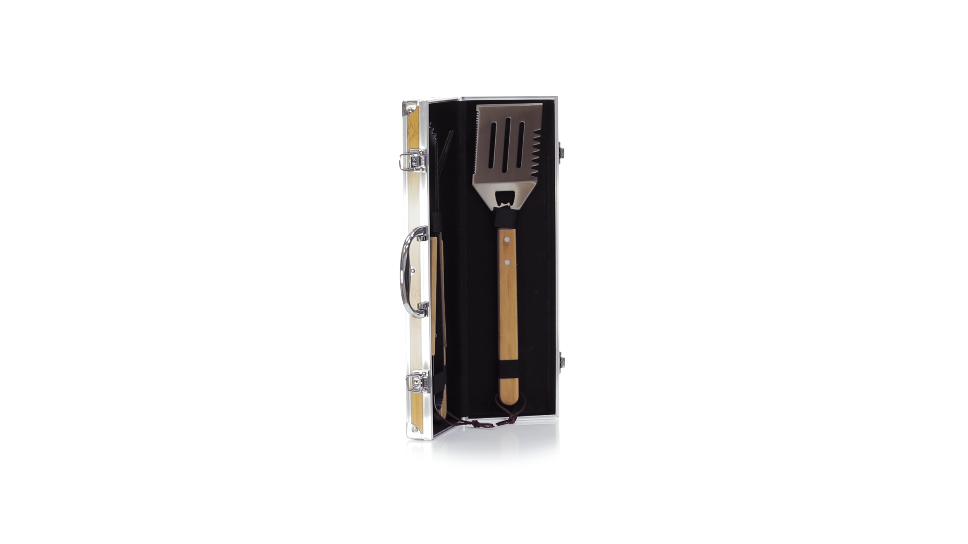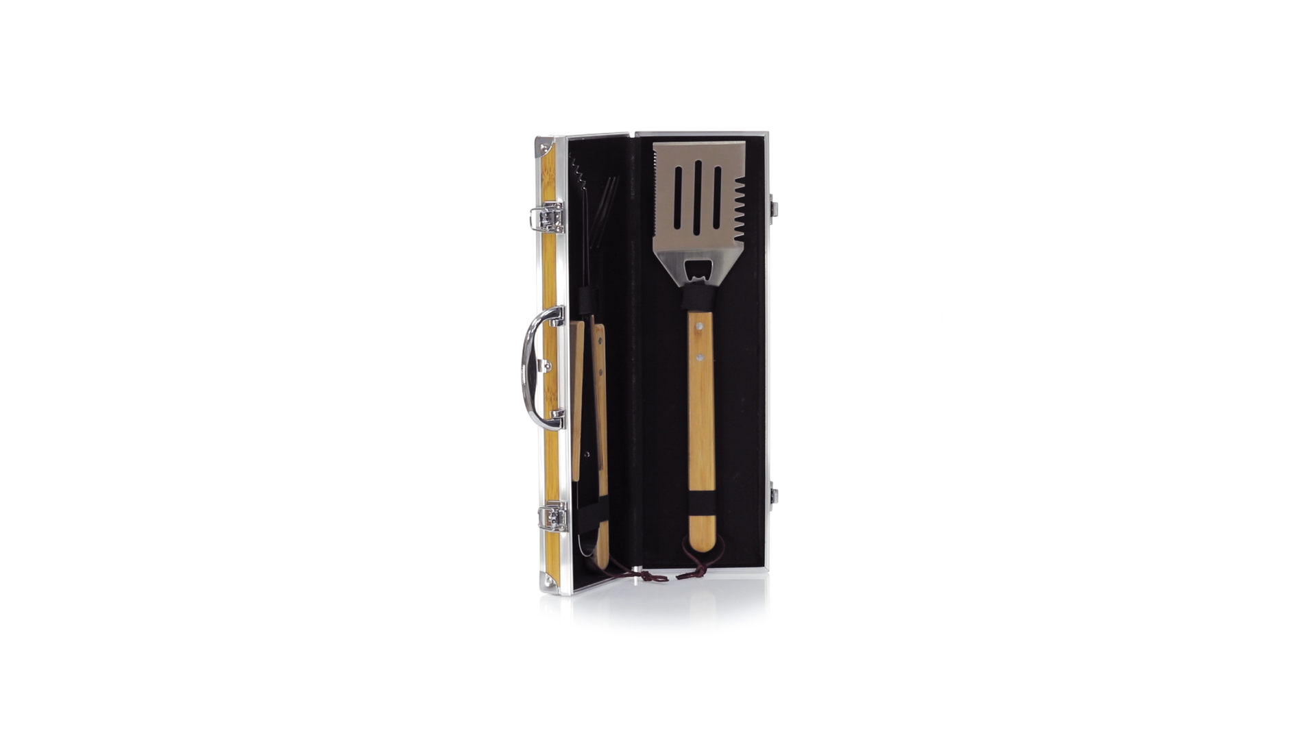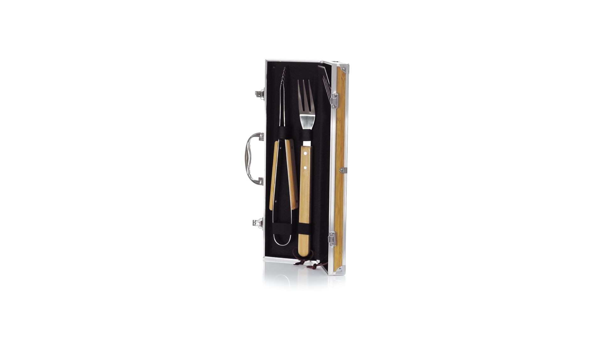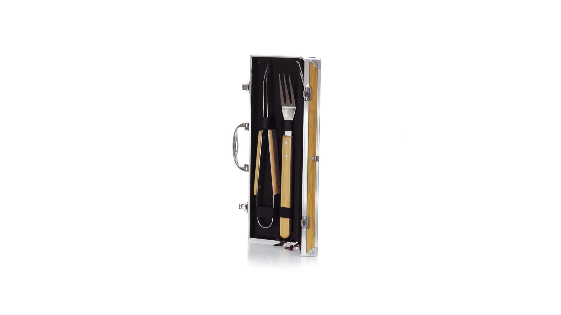 Grillset der Liene "Natur" und 3 Zubehörteile aus Metall mit Bambusgriff. Inklusive Kelle mit Öffner, Schnitzer und Pinzette. Präsentiert in einem imitierten Bambusgehäuse mit Metalloberflächen. Präsentiert in einer attraktiven Einzelbox im Öko-Design.