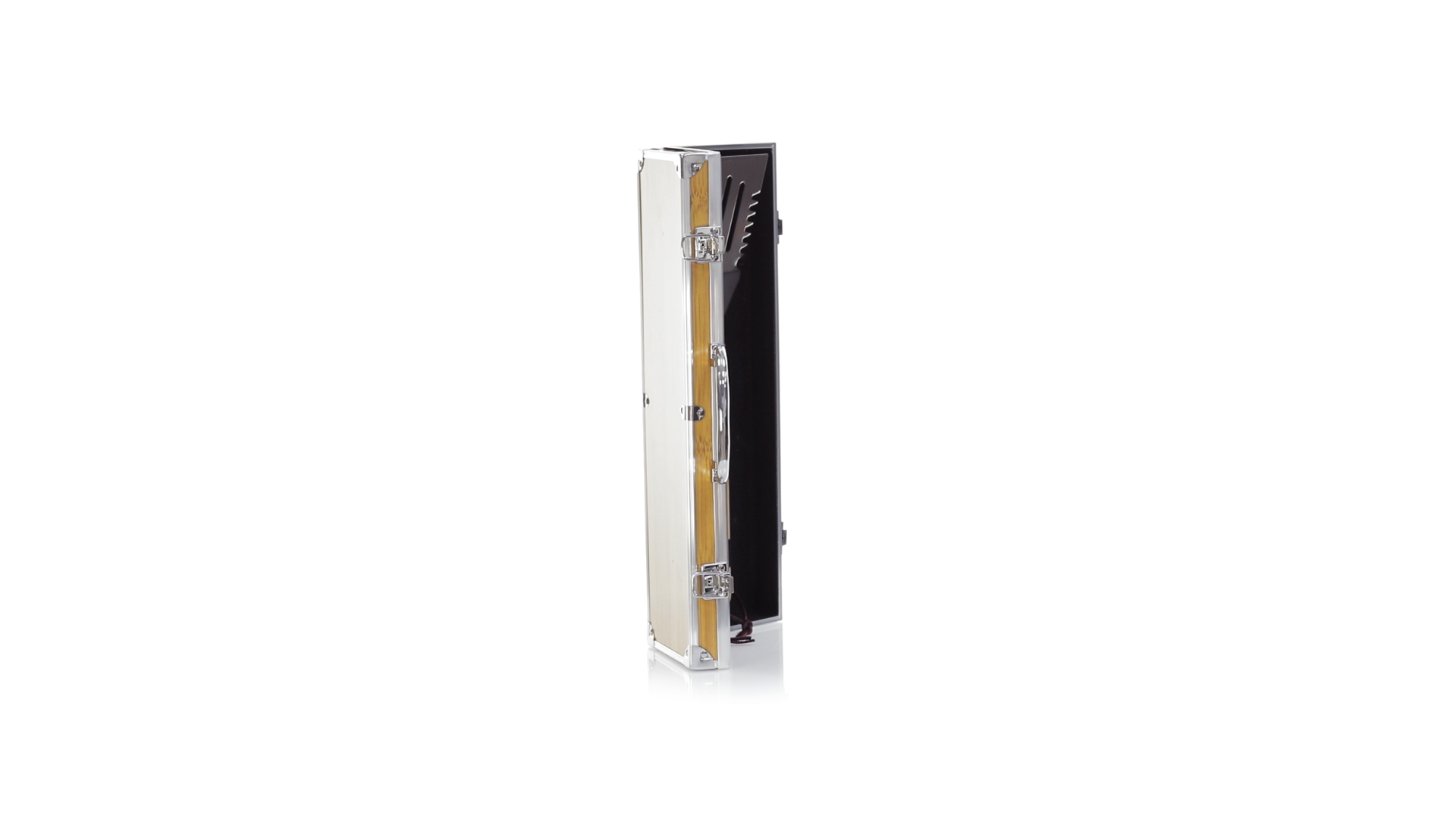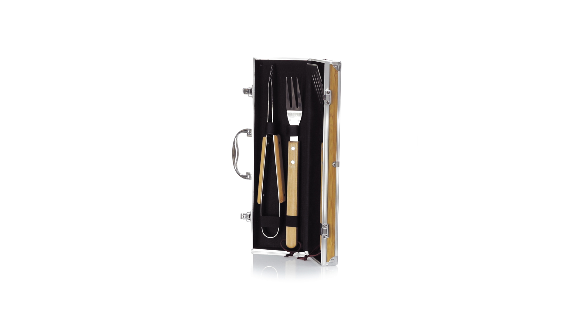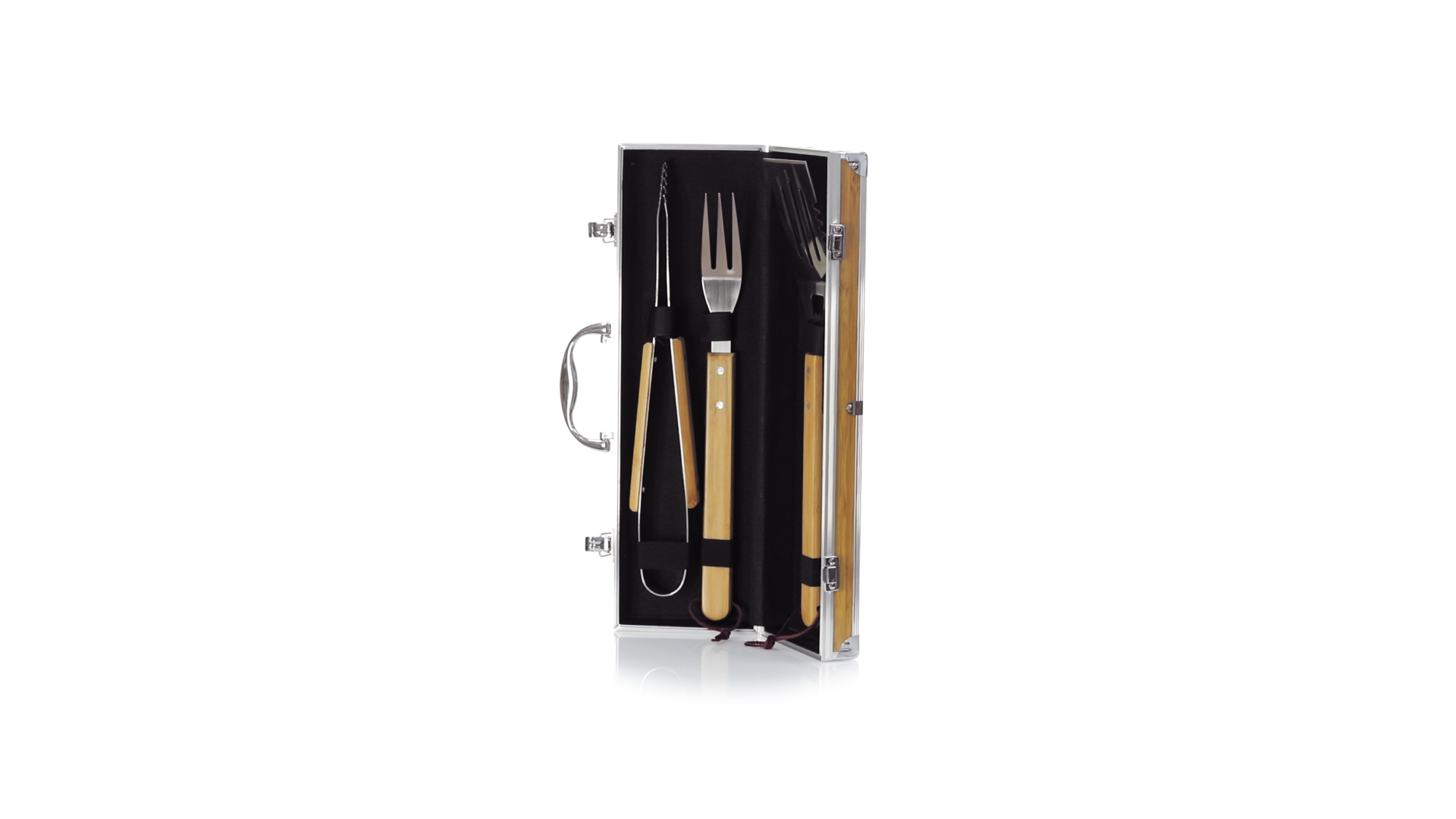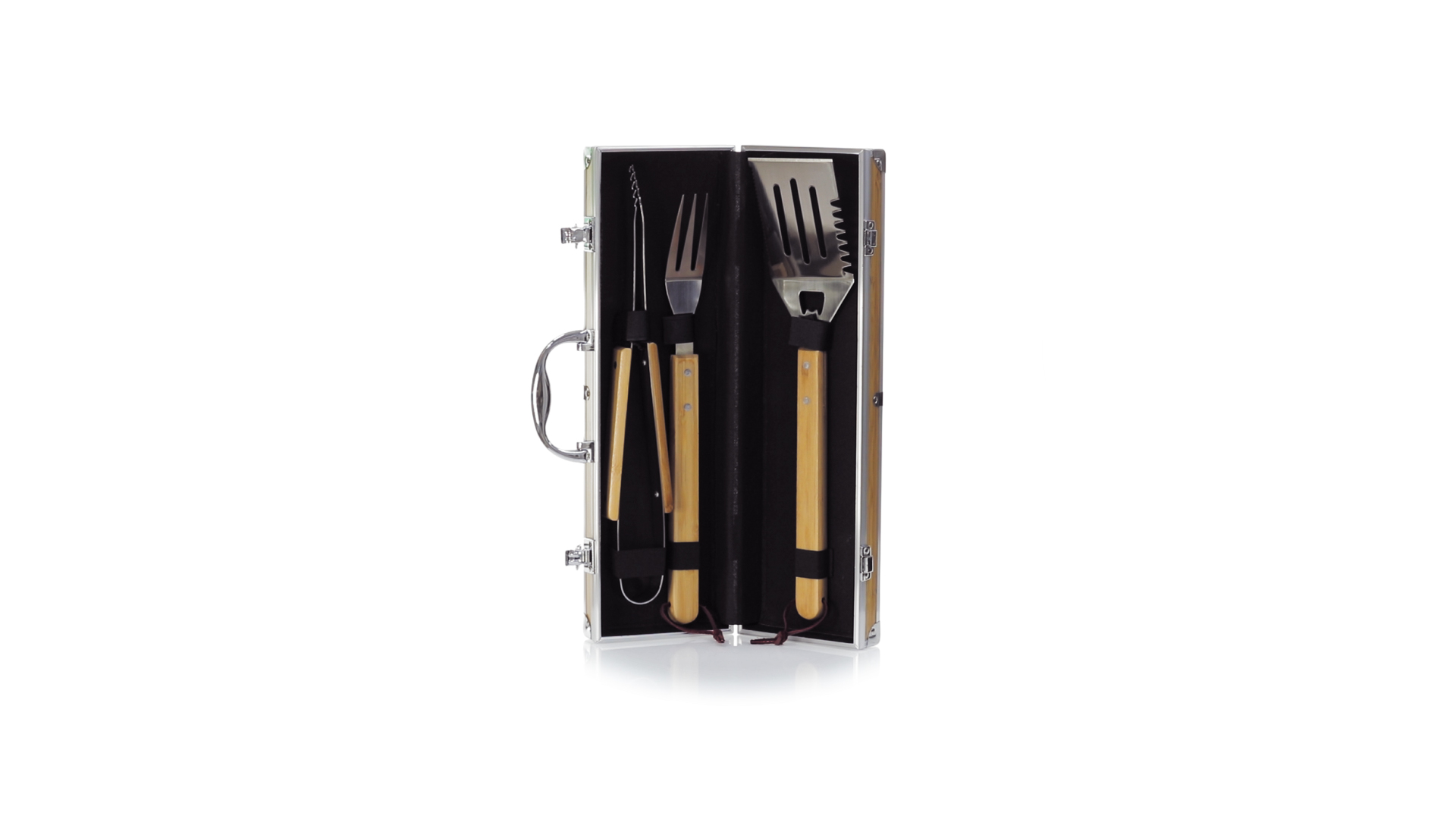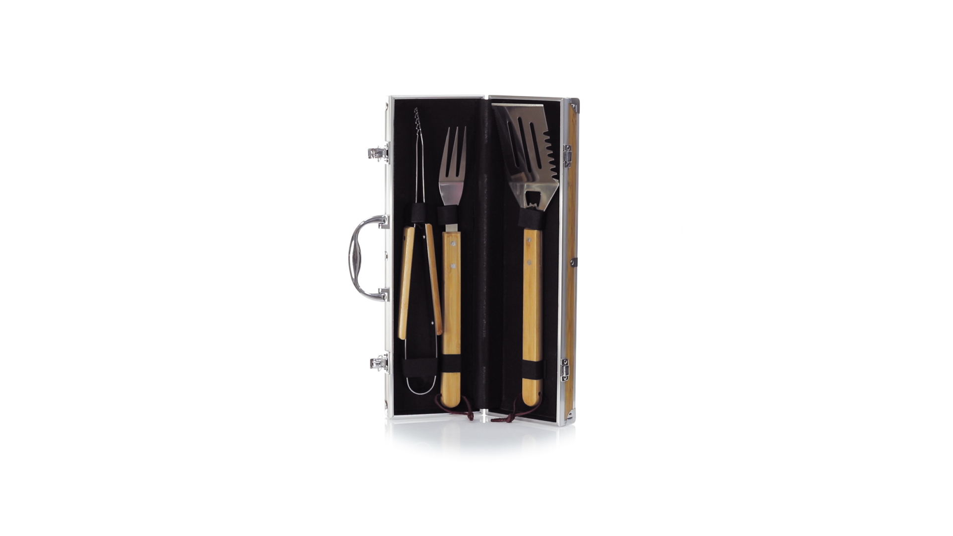 Grillset der Liene "Natur" und 3 Zubehörteile aus Metall mit Bambusgriff. Inklusive Kelle mit Öffner, Schnitzer und Pinzette. Präsentiert in einem imitierten Bambusgehäuse mit Metalloberflächen. Präsentiert in einer attraktiven Einzelbox im Öko-Design.