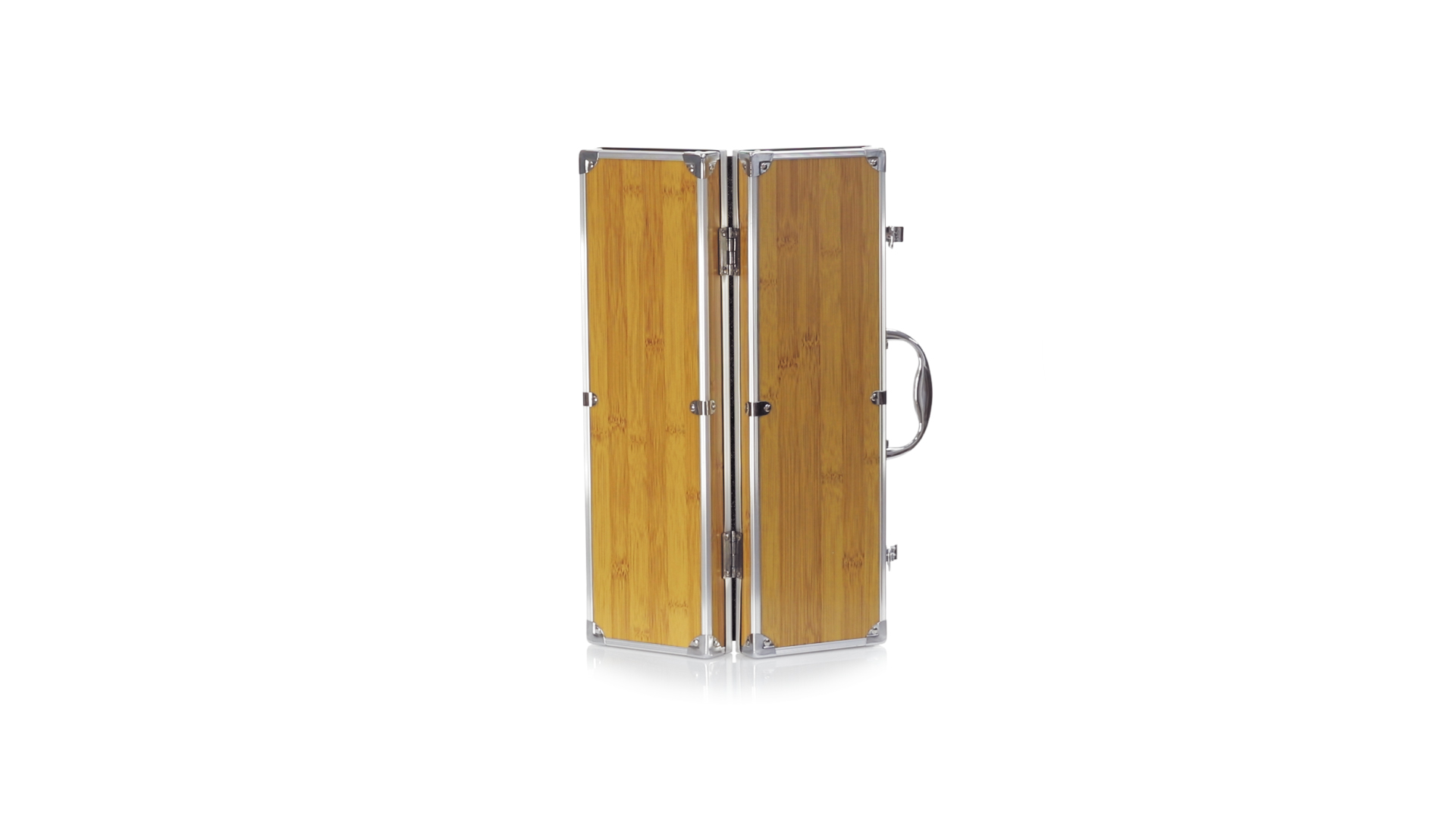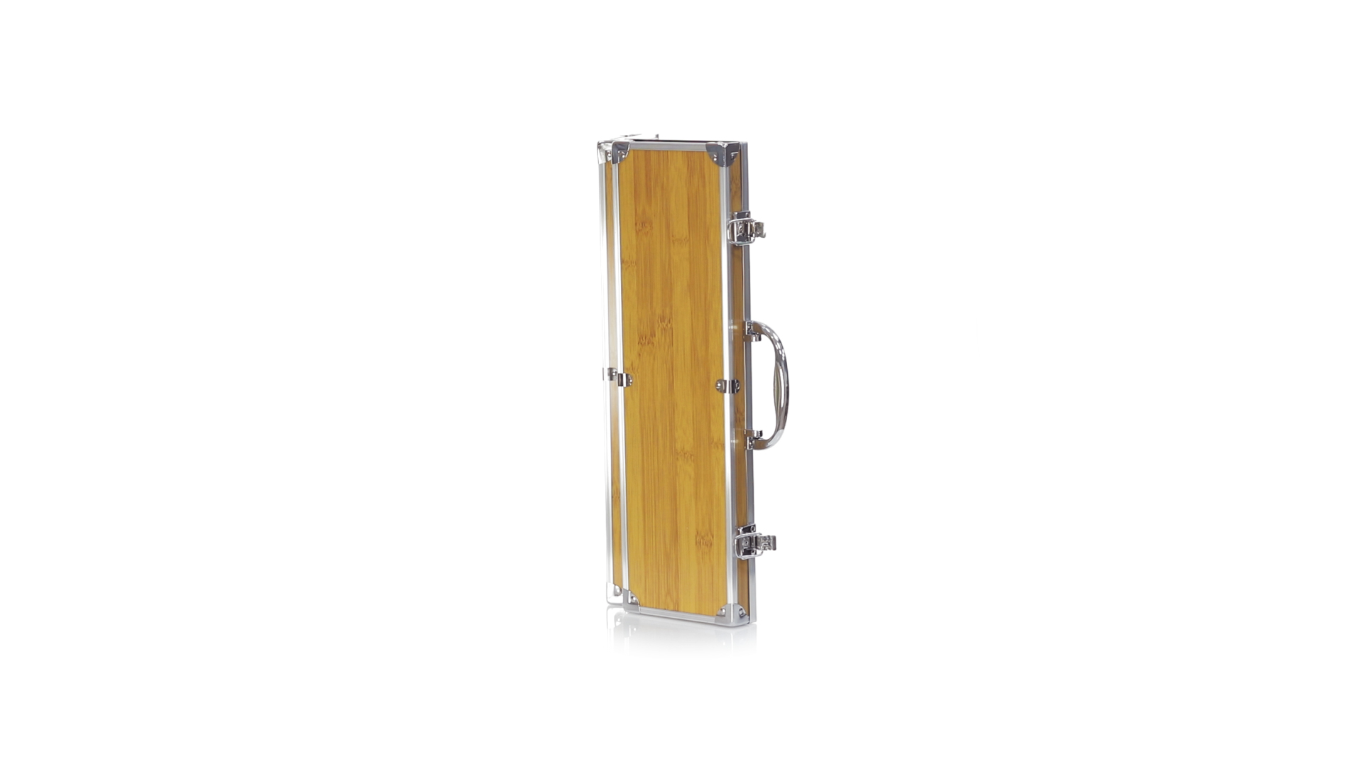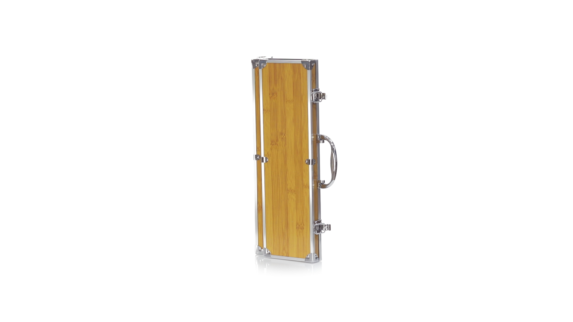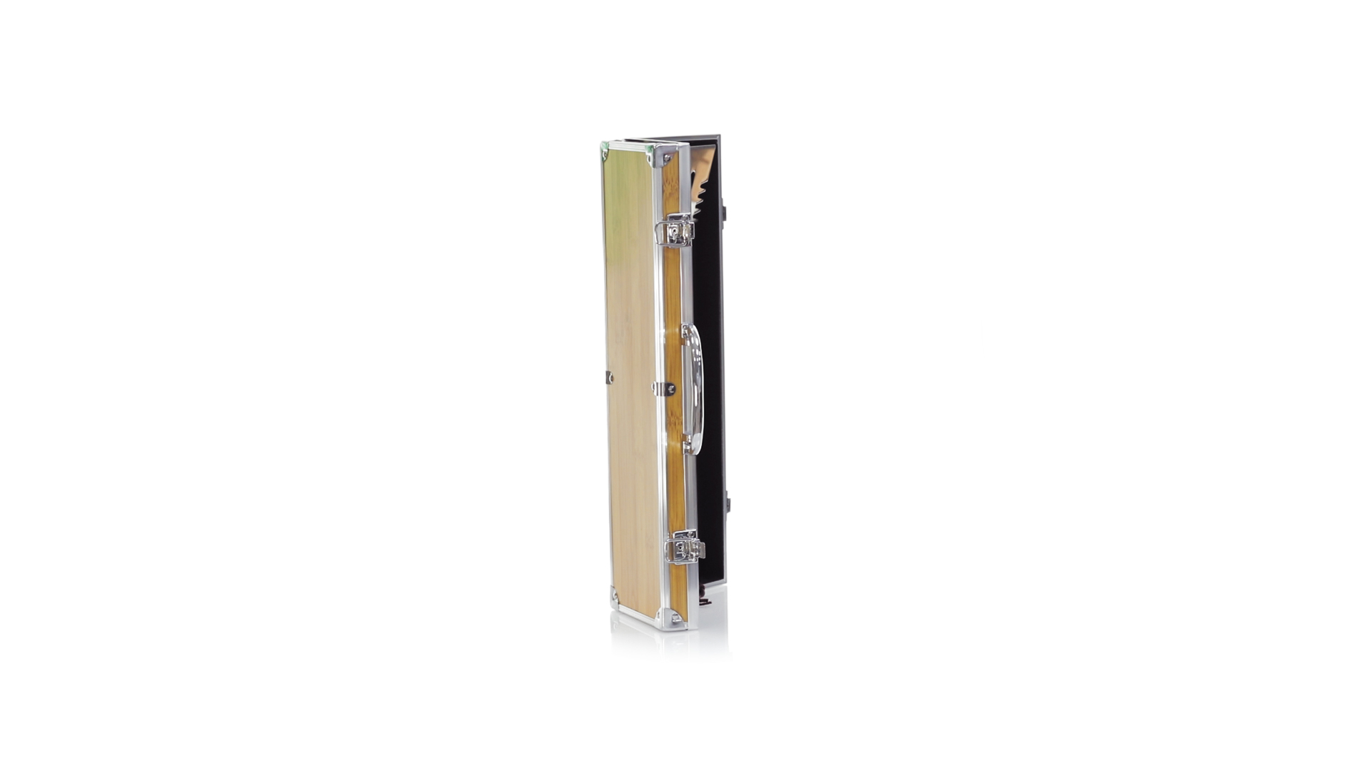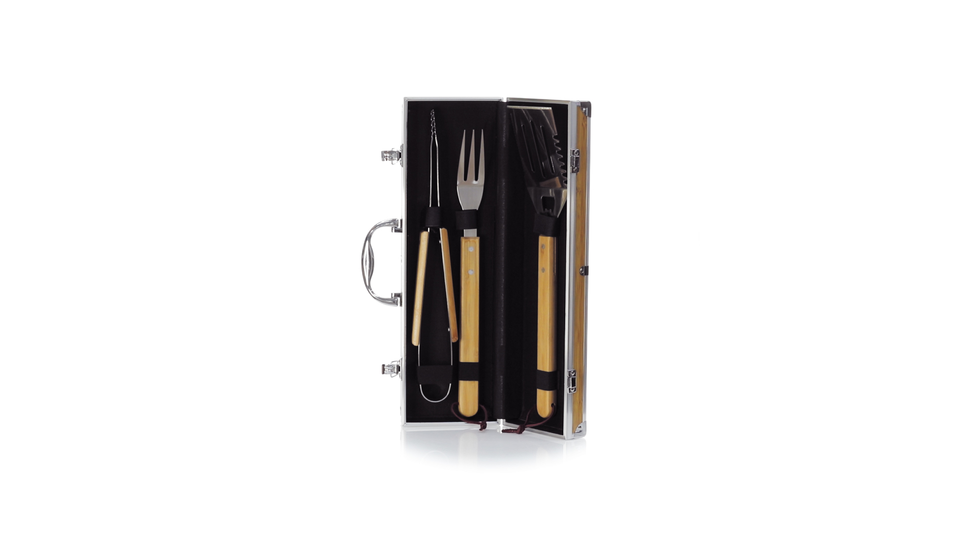 Grillset der Liene "Natur" und 3 Zubehörteile aus Metall mit Bambusgriff. Inklusive Kelle mit Öffner, Schnitzer und Pinzette. Präsentiert in einem imitierten Bambusgehäuse mit Metalloberflächen. Präsentiert in einer attraktiven Einzelbox im Öko-Design.