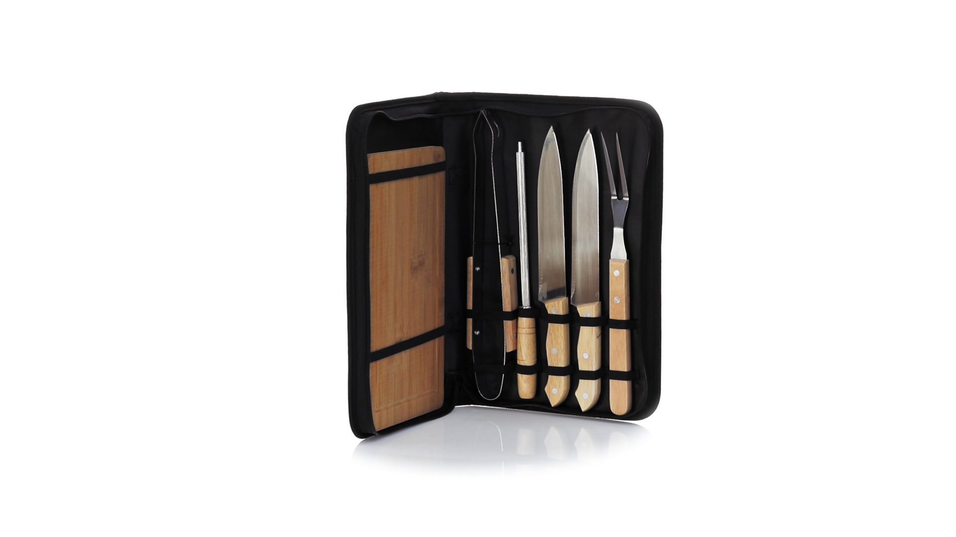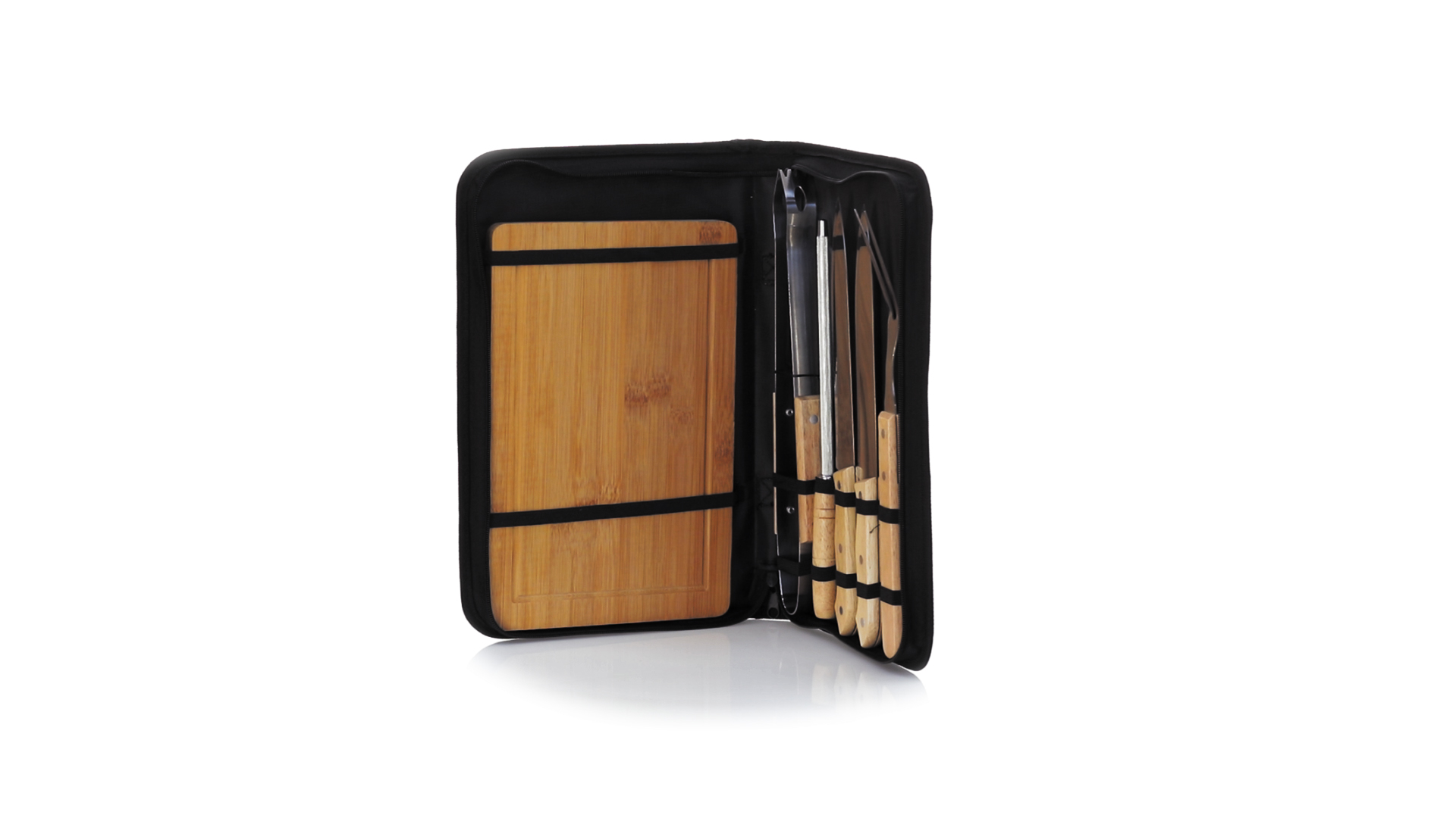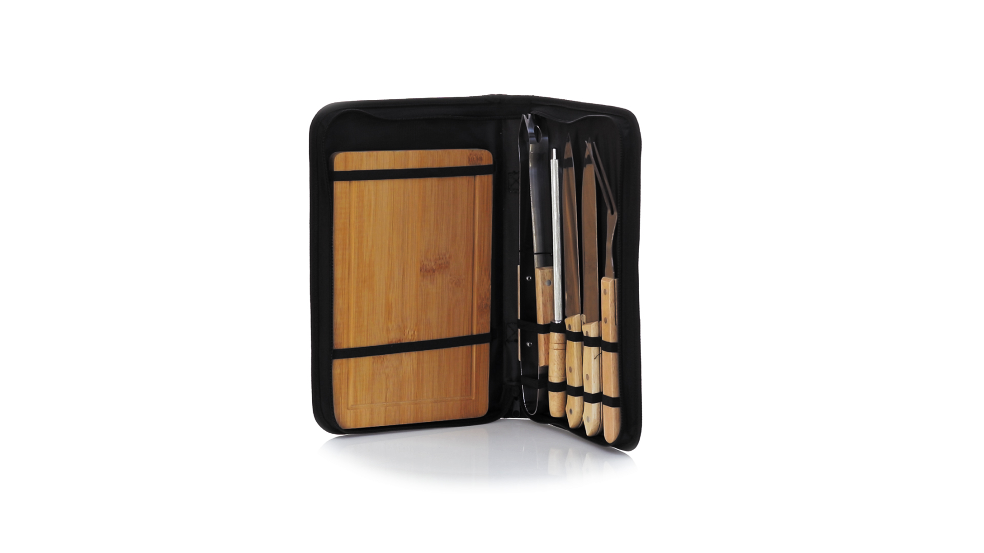 Nature Line Grillset und 6 Zubehörteile aus Metall mit Holzgriff. Inklusive 2 Messer, Spitzer, Schnitzer und Pinzette, mit Bambus-Schneider und Präsentationstafel. Präsentiert in einem individuellen Etui aus widerstandsfähigem Polyester, mit innenliegenden elastischen Verschlüssen für die verschiedenen Utensilien.