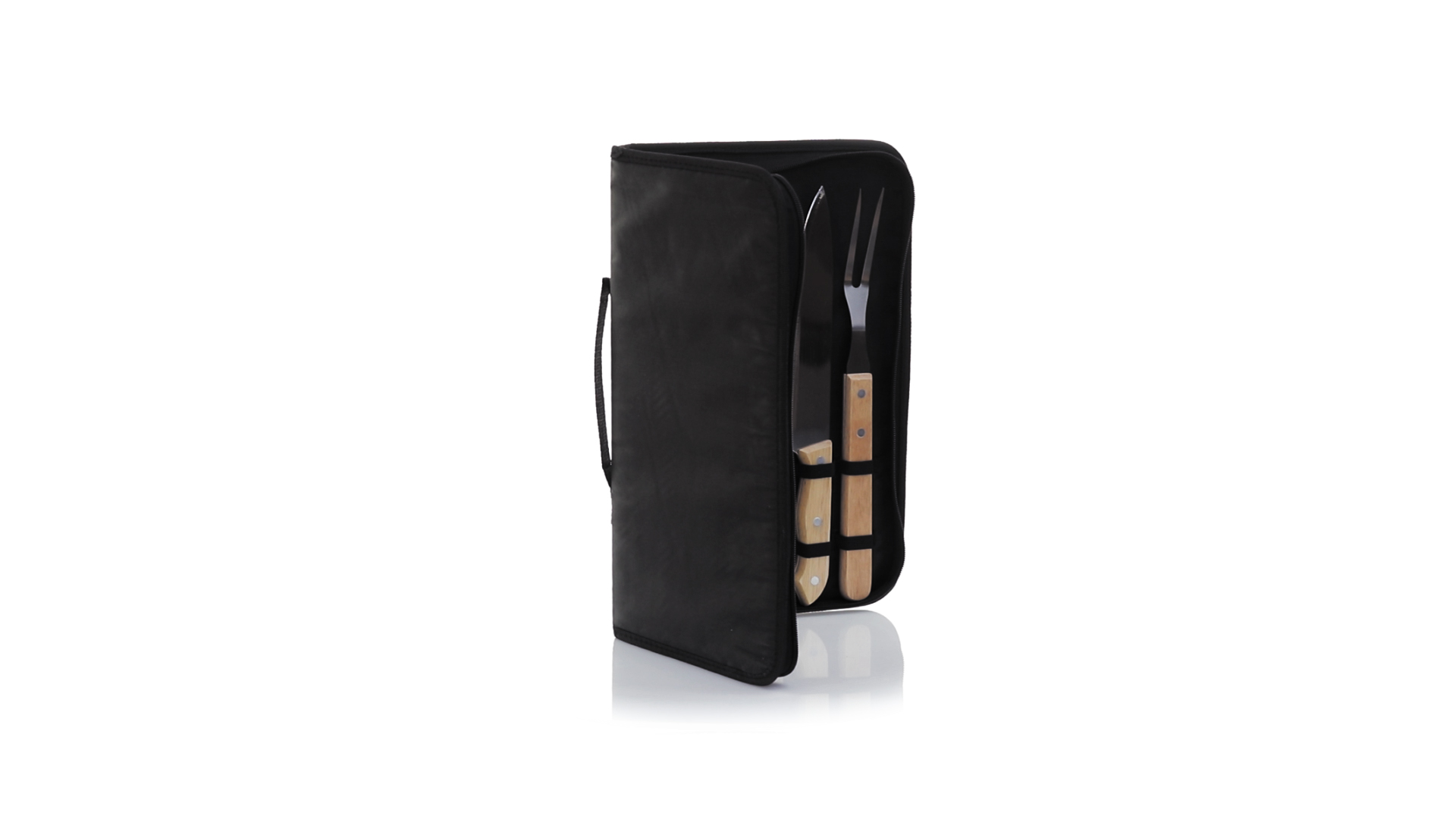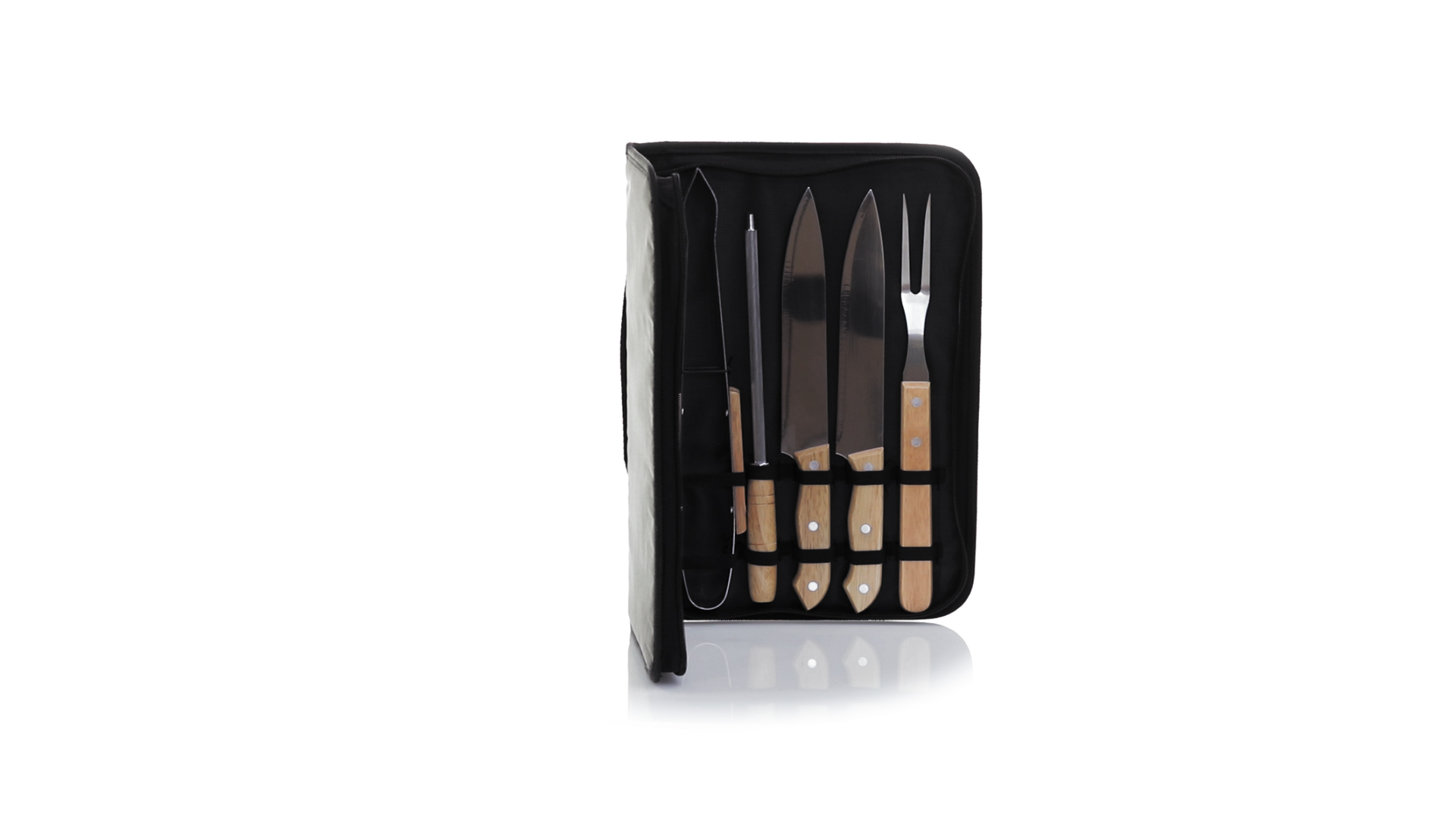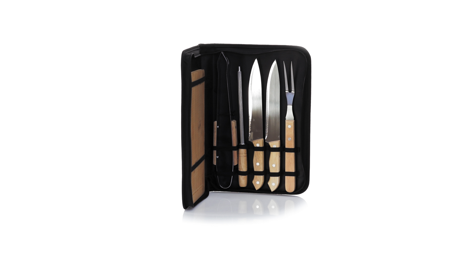 Nature Line Grillset und 6 Zubehörteile aus Metall mit Holzgriff. Inklusive 2 Messer, Spitzer, Schnitzer und Pinzette, mit Bambus-Schneider und Präsentationstafel. Präsentiert in einem individuellen Etui aus widerstandsfähigem Polyester, mit innenliegenden elastischen Verschlüssen für die verschiedenen Utensilien.