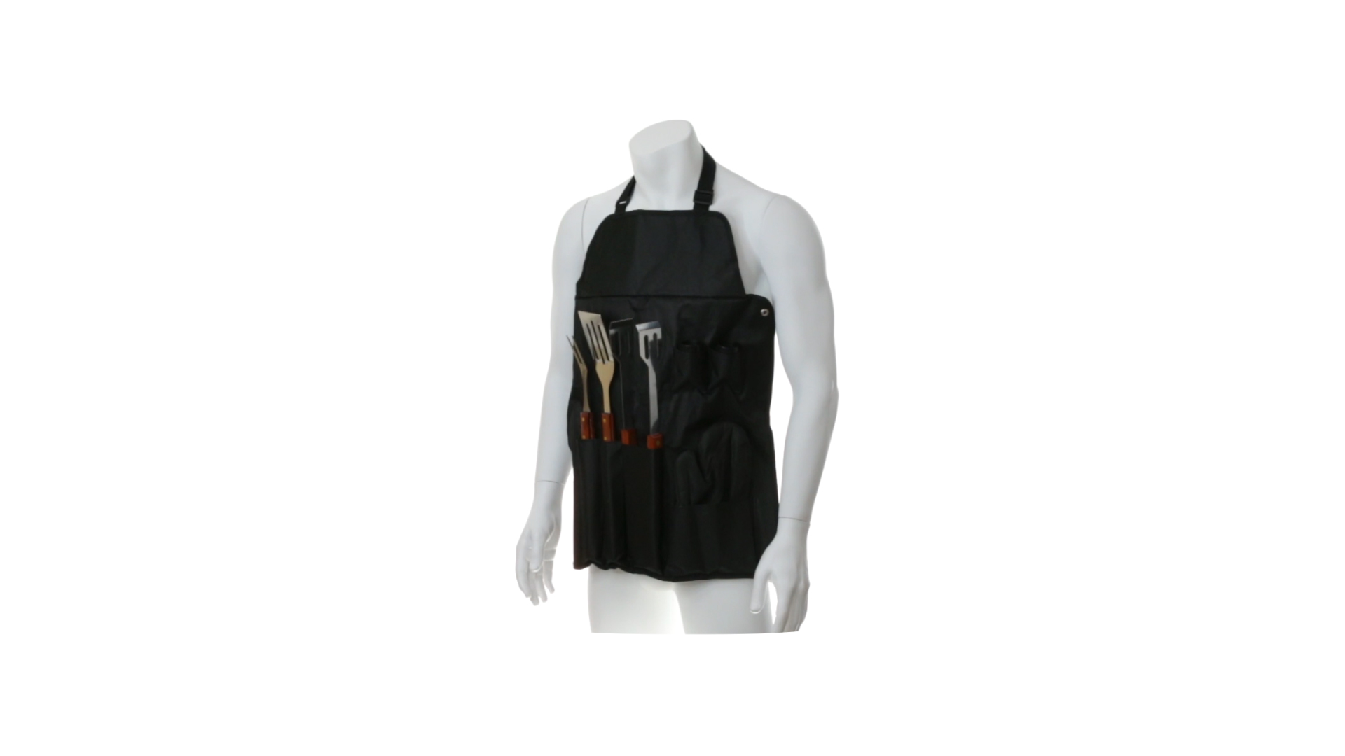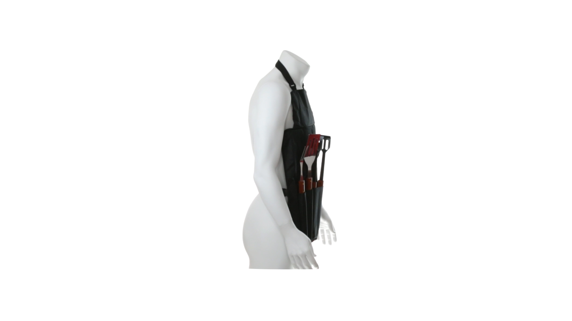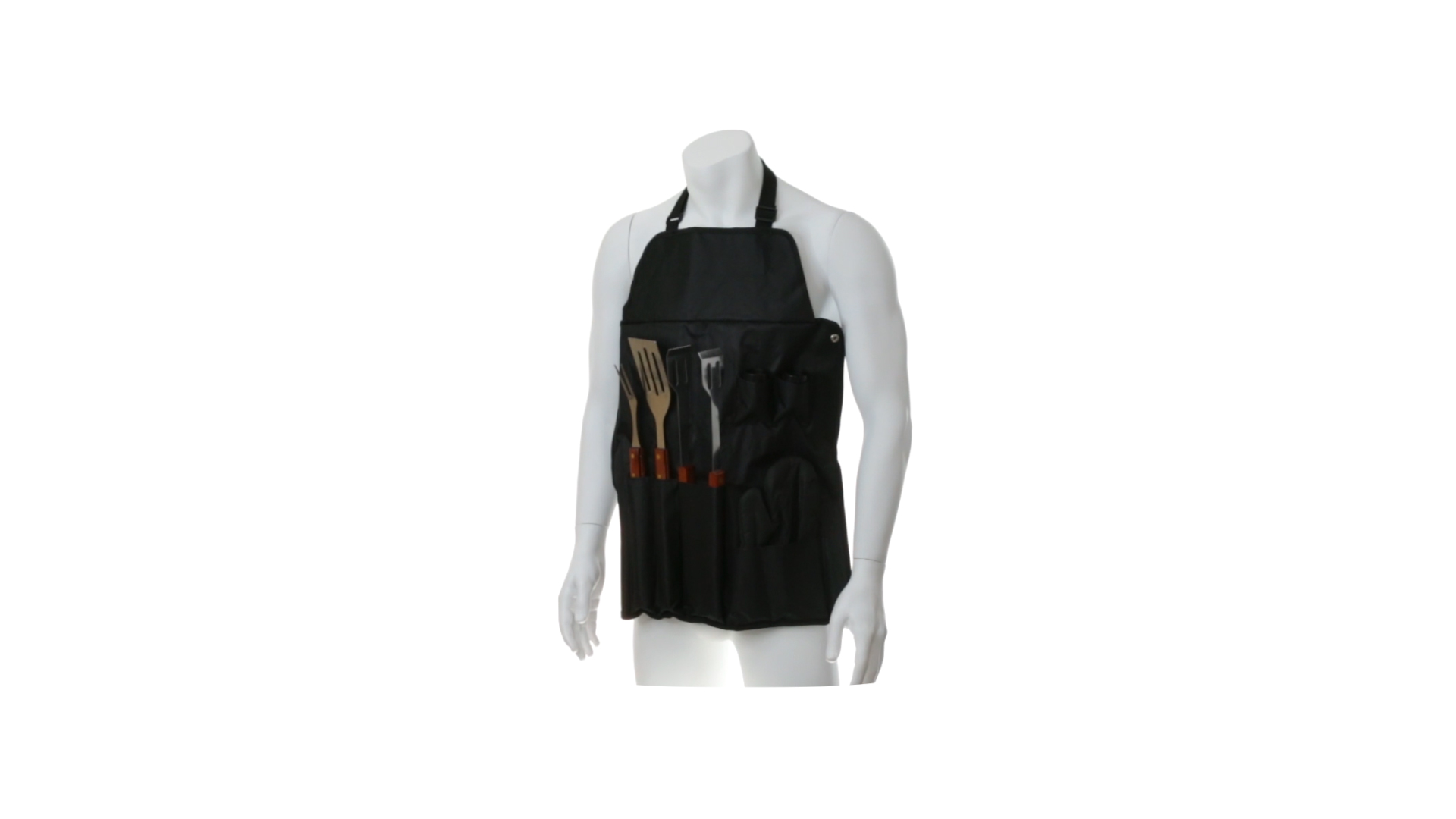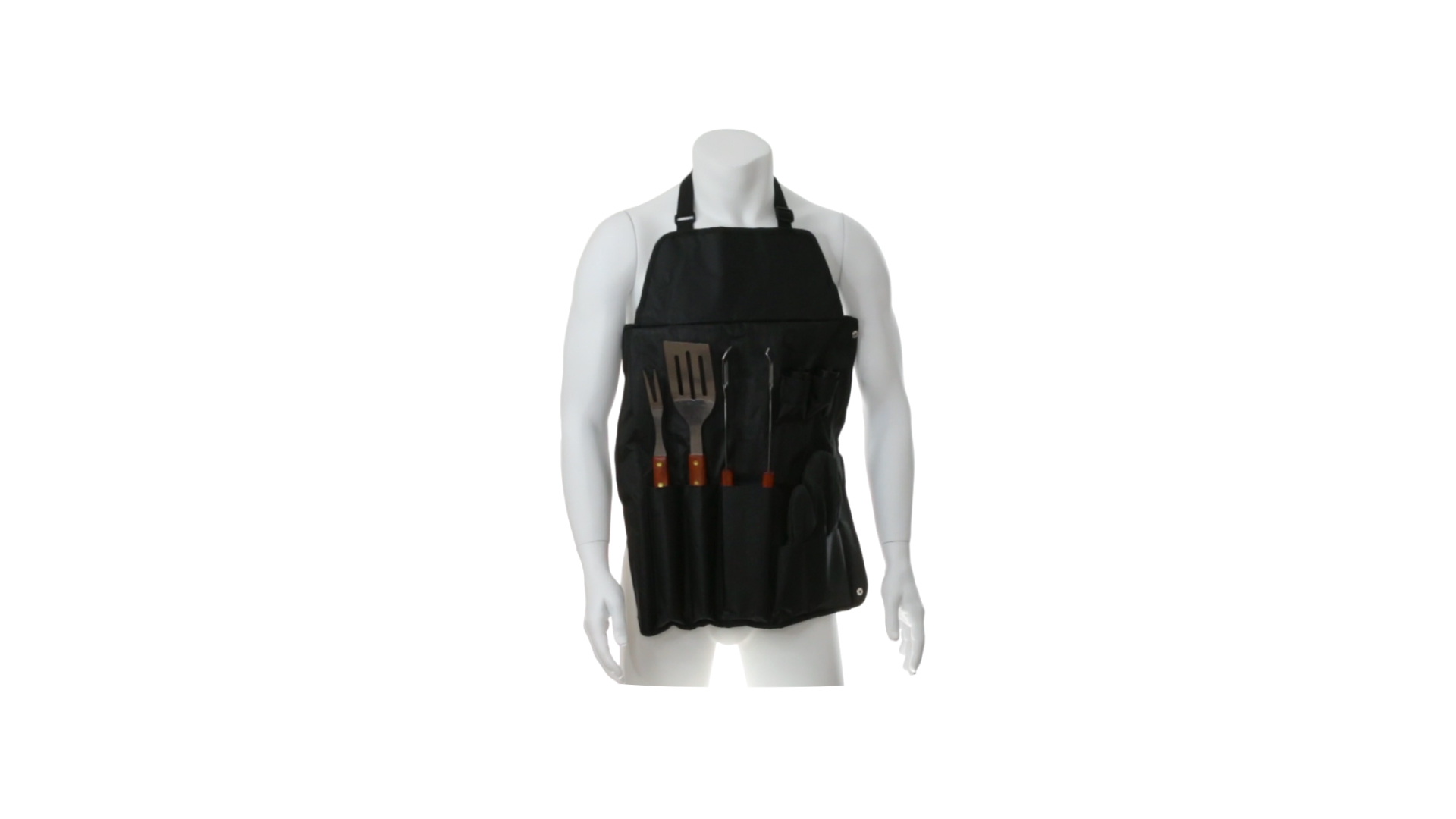 7-teiliges Grill-Set mit Wender, Fleischgabel und Zange aus Edelstahl mit Holzgriff sowie gepolsterten Handschuhen und Salz- und Pfefferstreuer. Präsentiert in einem robusten 600D Polyester-Etui in Schwarz mit Metallknopfverschluss. Mit verstellbarem Tragegurt aus robustem Nylon mit Klickverschluss.