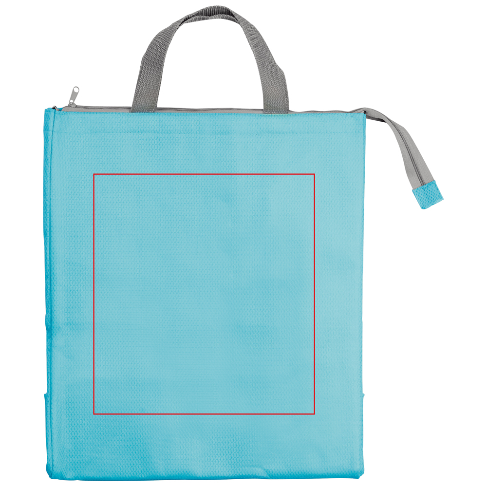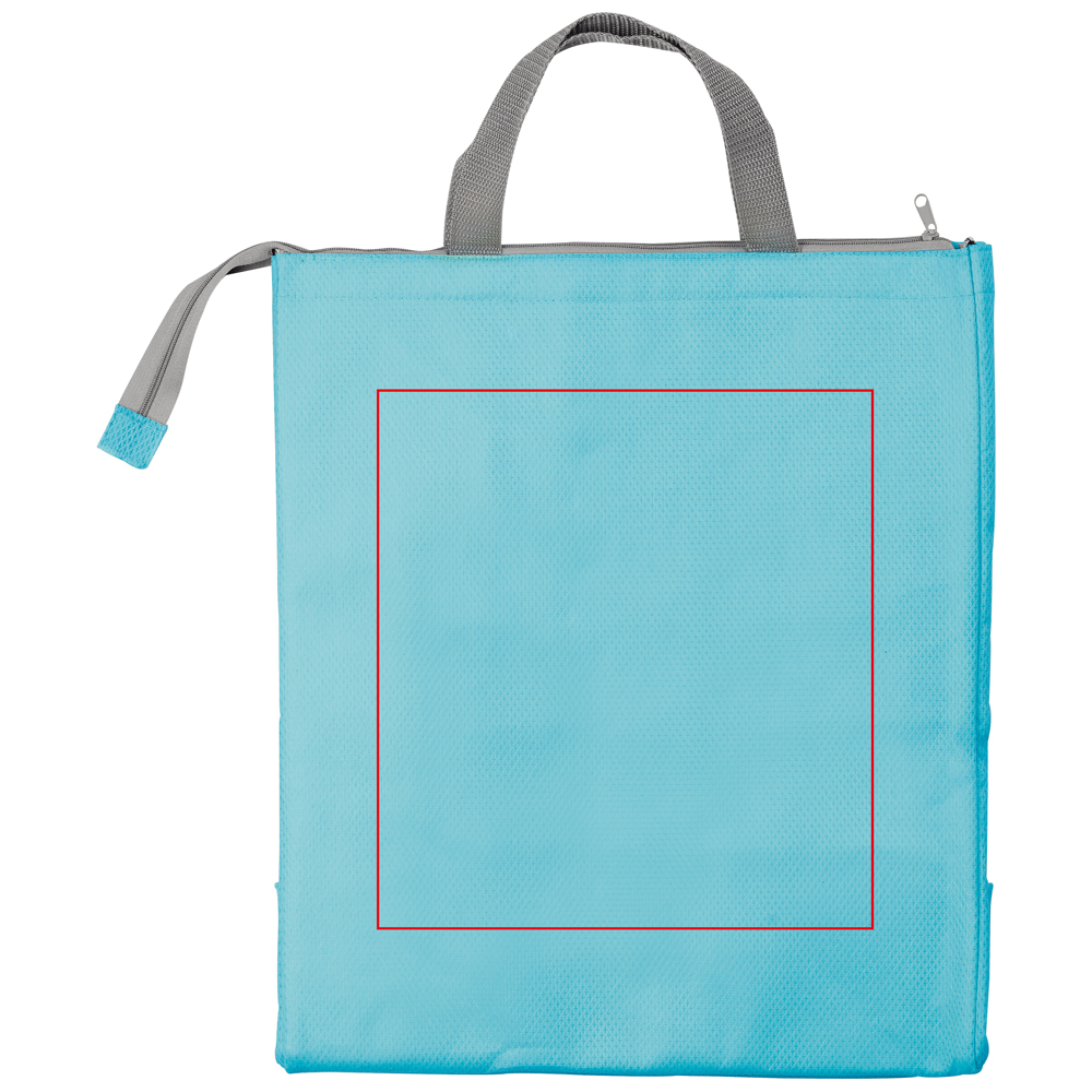 Grosse Kühltasche aus Non-Woven mit Reissverschluss und festem Griff und einer grossen Druckfläche.