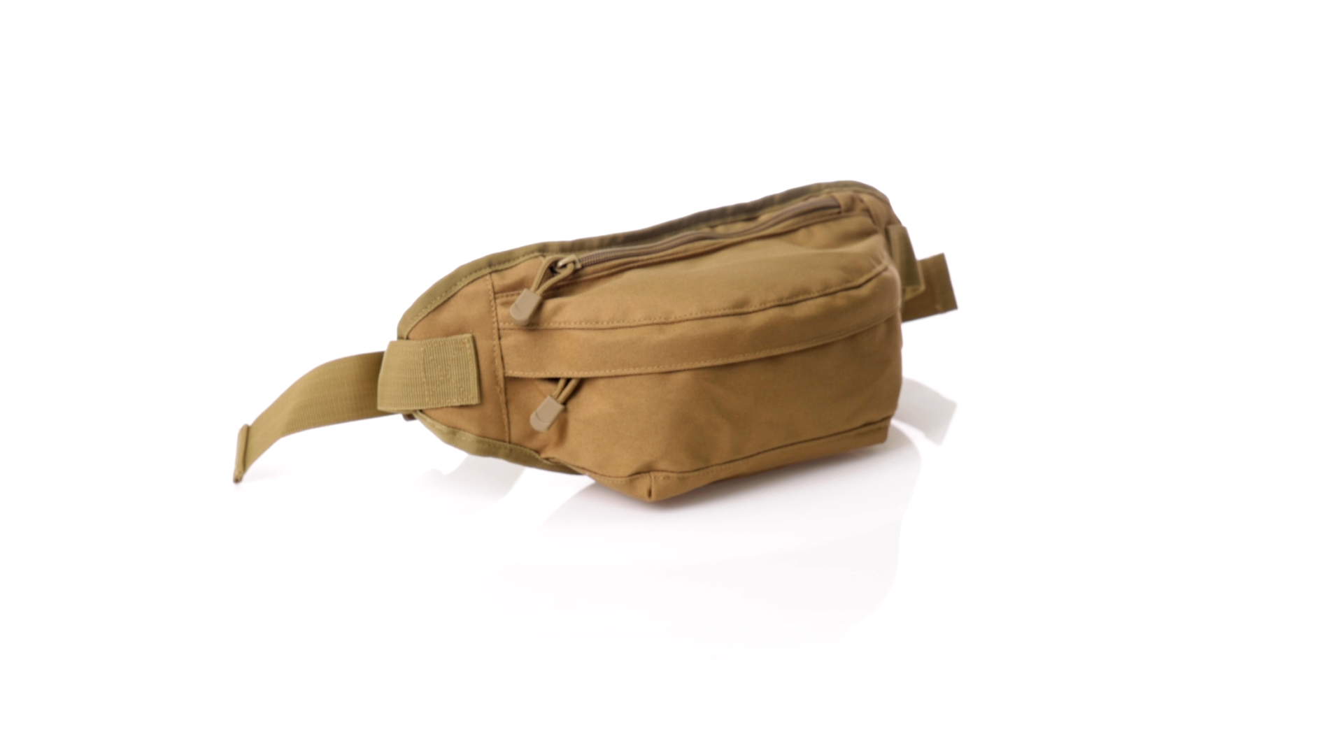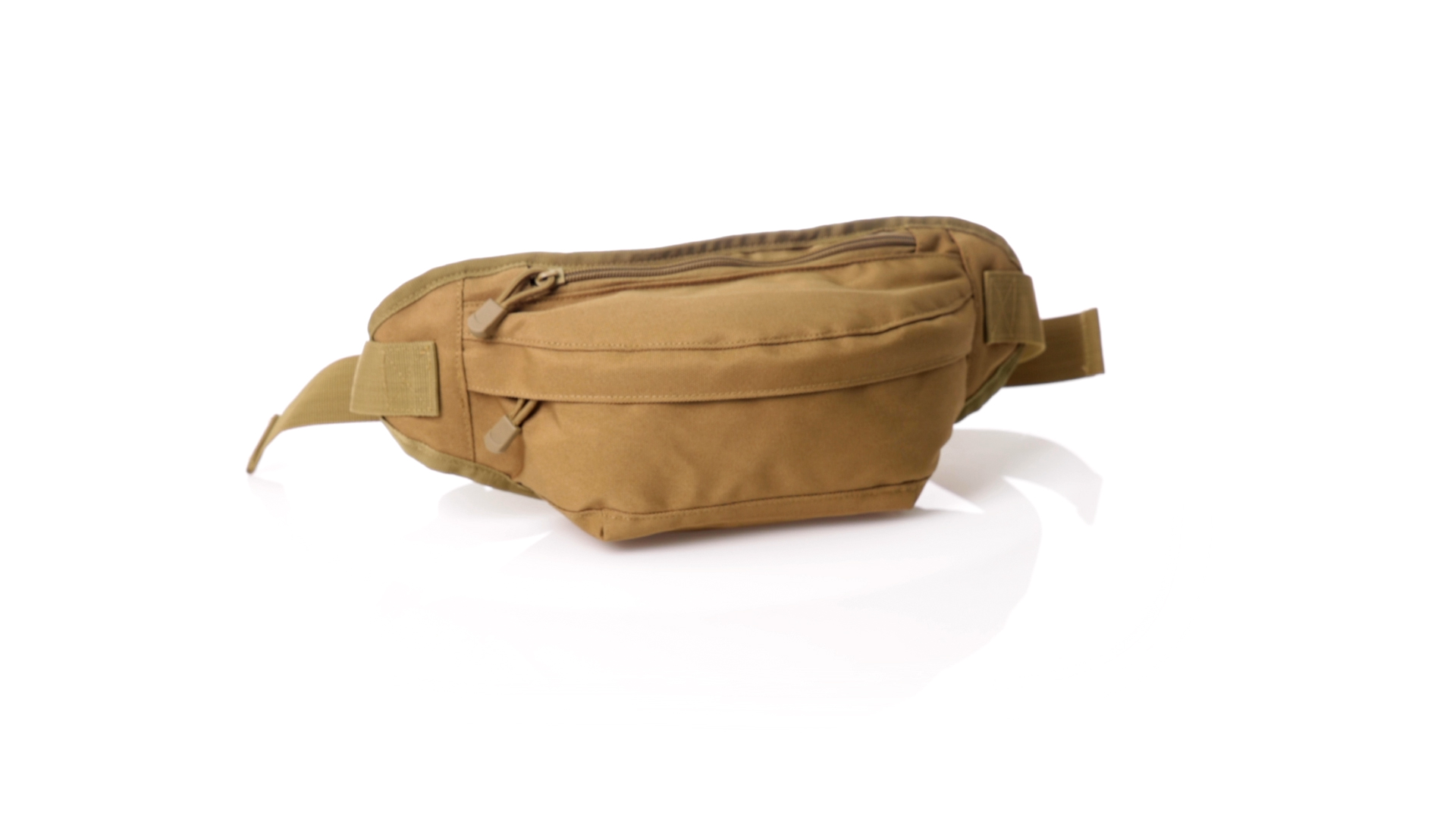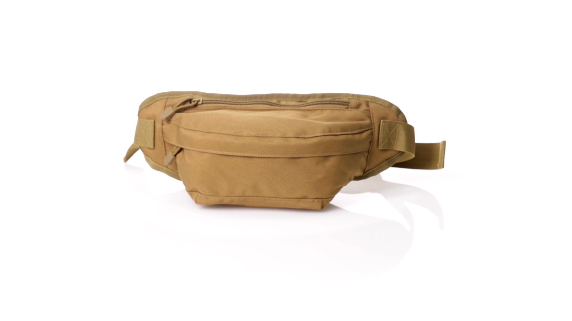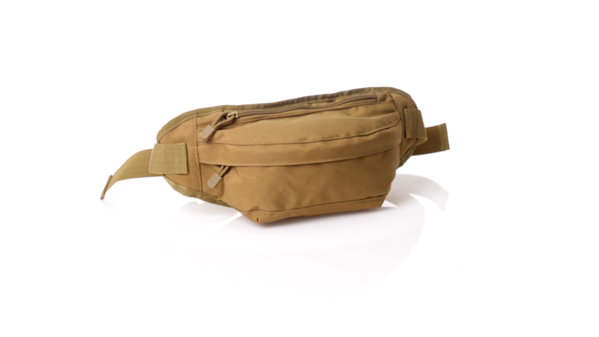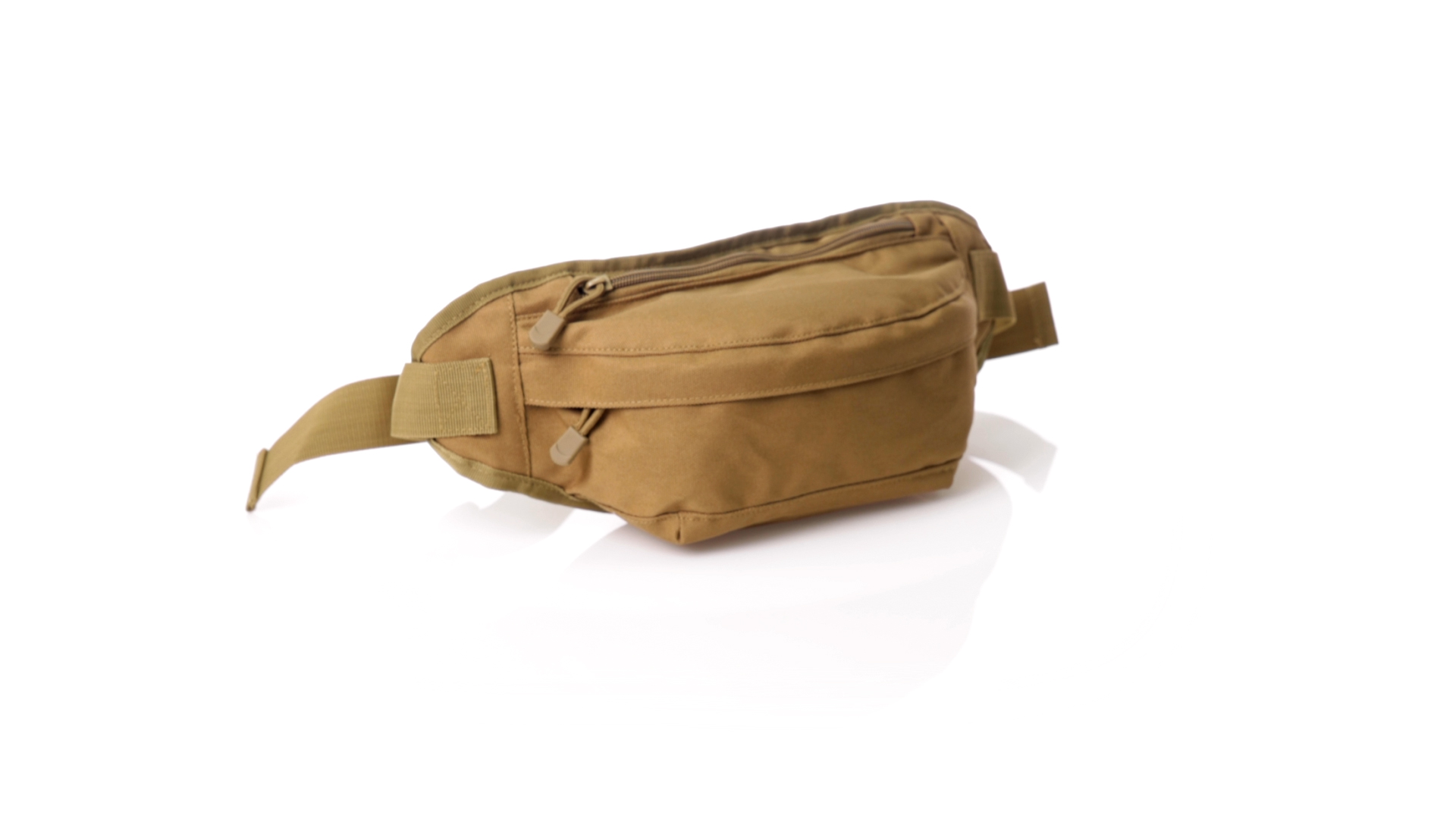 Gürteltasche aus strapazierfähigem 800D-Polyester und sandbraunem Ton. Mit 2 Reissverschlusstaschen und Riemen an Zugbändern zum einfachen Öffnen. Verstellbarer Gurt mit Schnallenverschluss, einzeln verpackt in einer recycelten Tasche.
