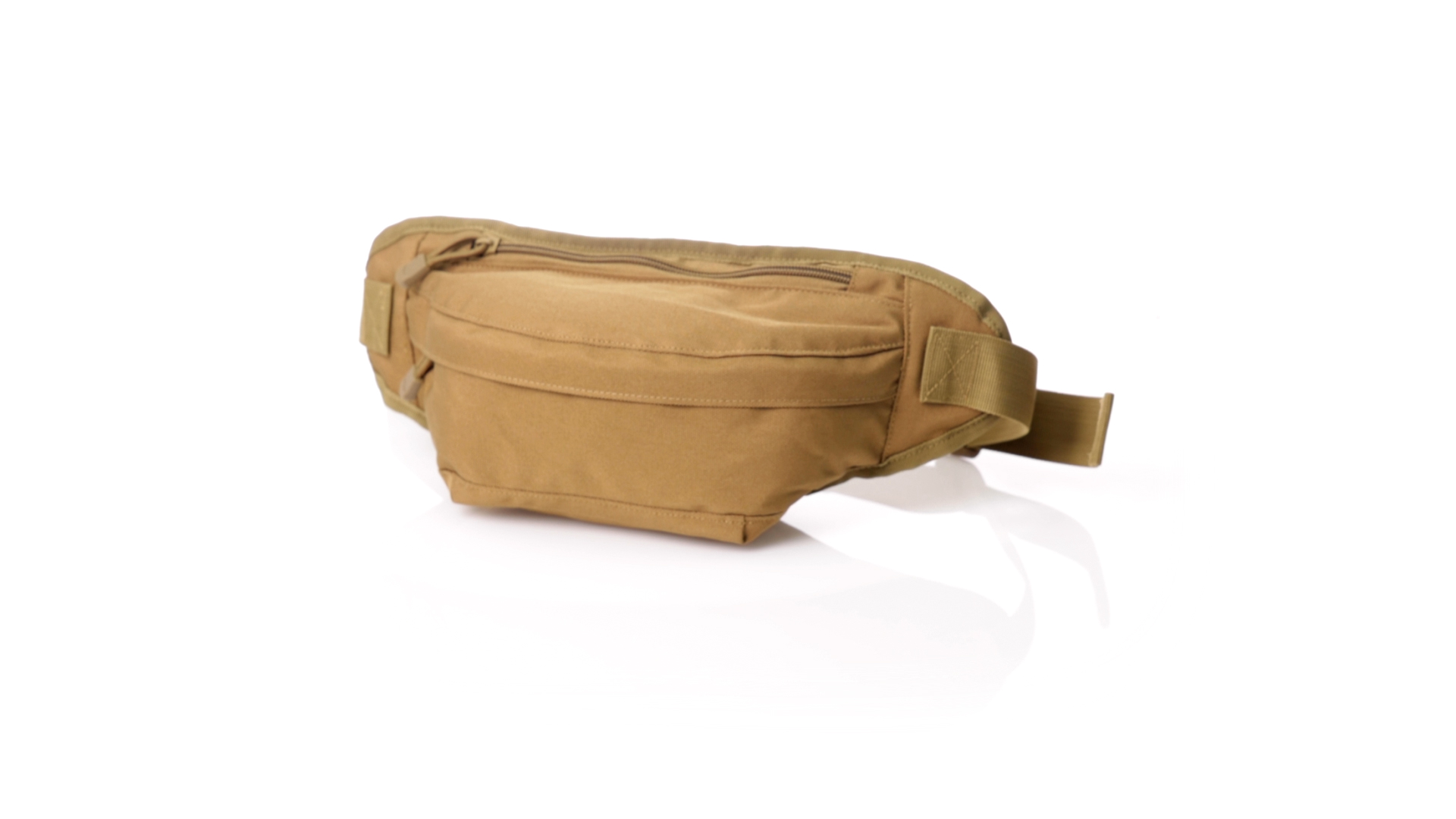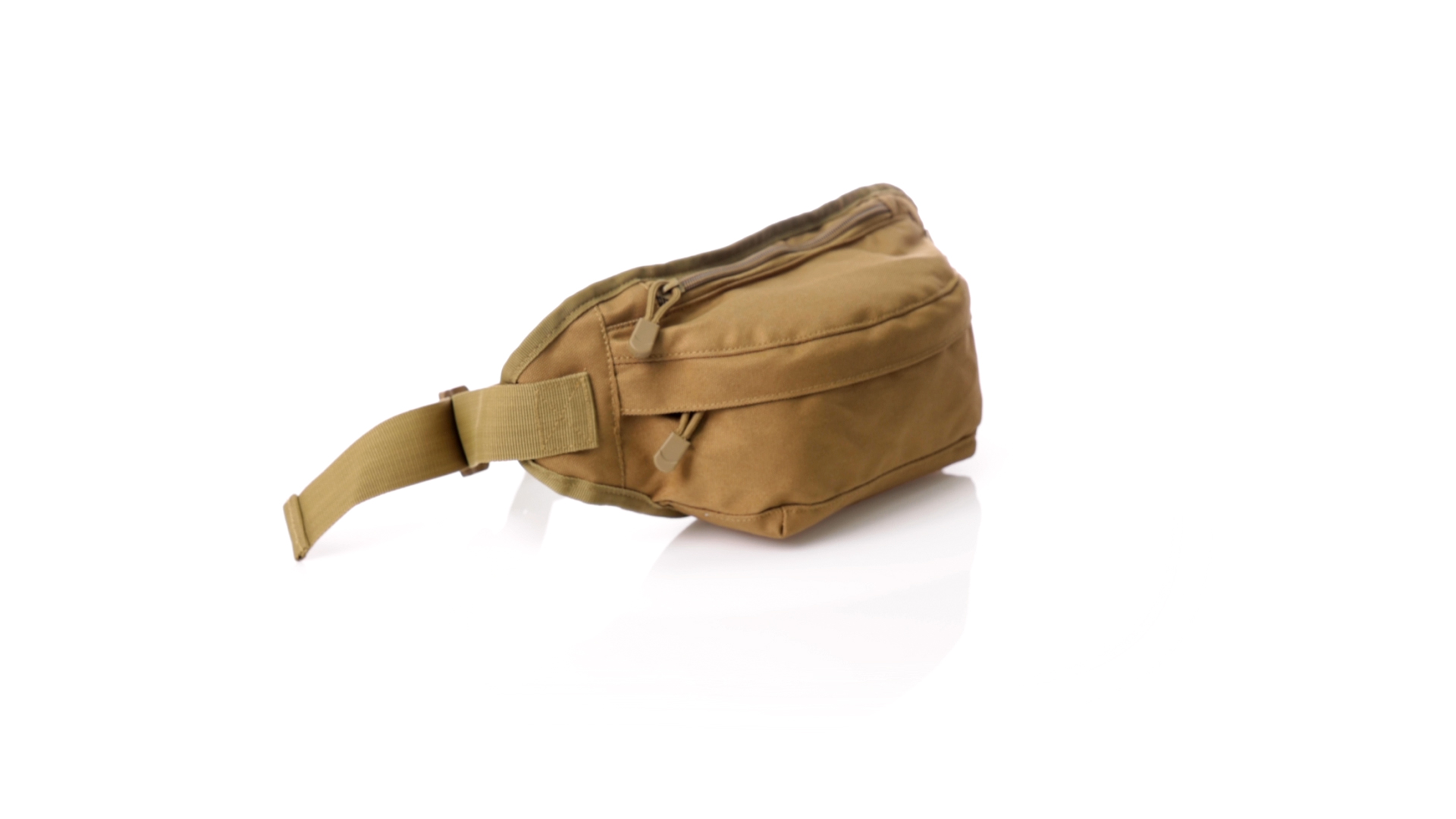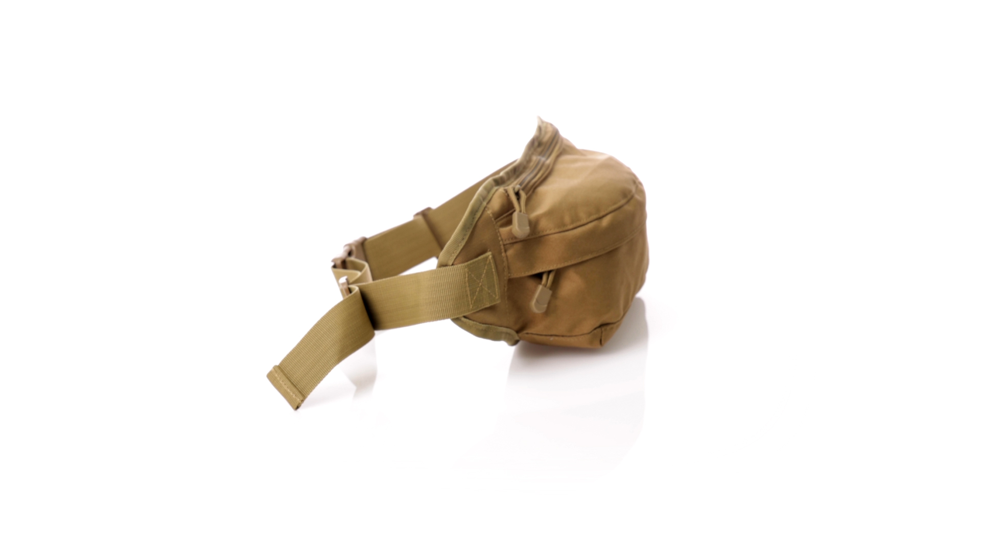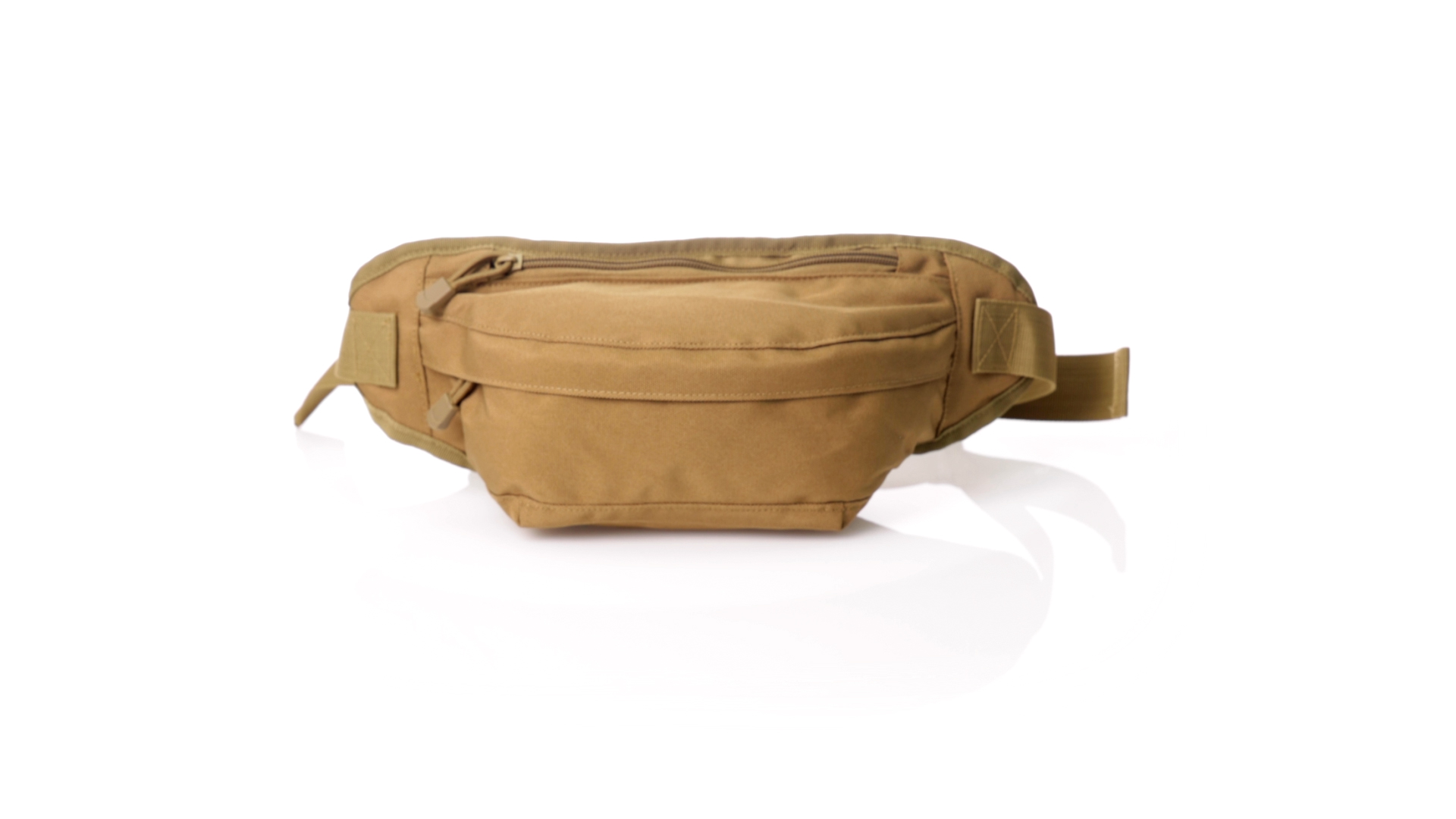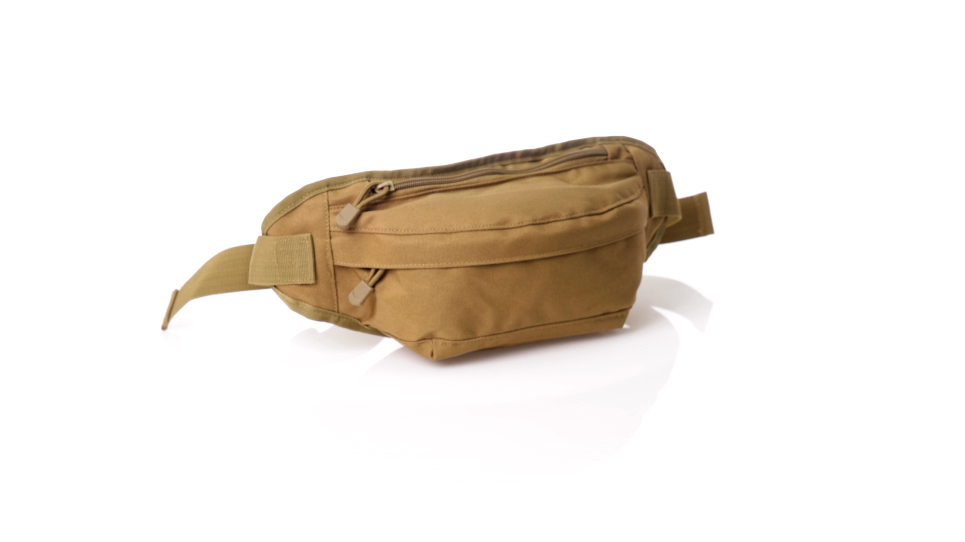 Gürteltasche aus strapazierfähigem 800D-Polyester und sandbraunem Ton. Mit 2 Reissverschlusstaschen und Riemen an Zugbändern zum einfachen Öffnen. Verstellbarer Gurt mit Schnallenverschluss, einzeln verpackt in einer recycelten Tasche.