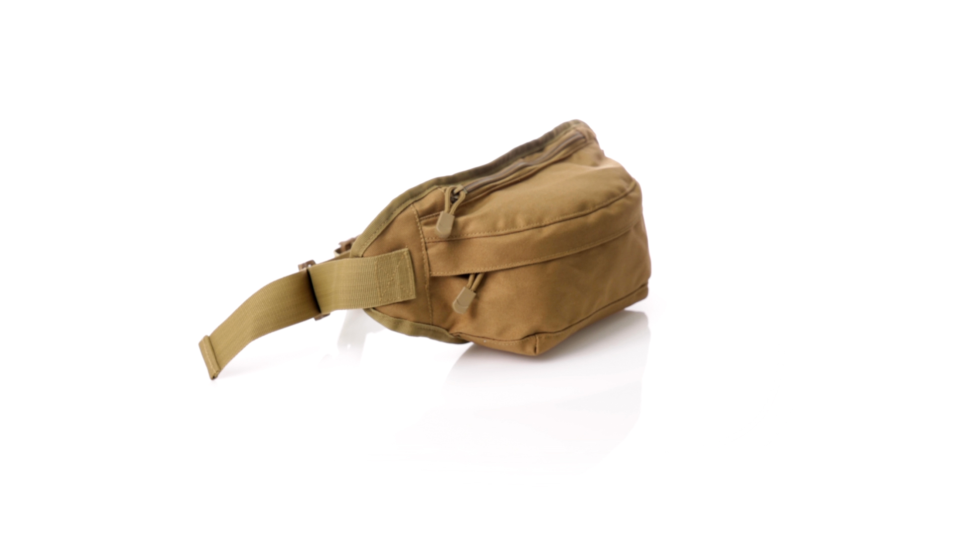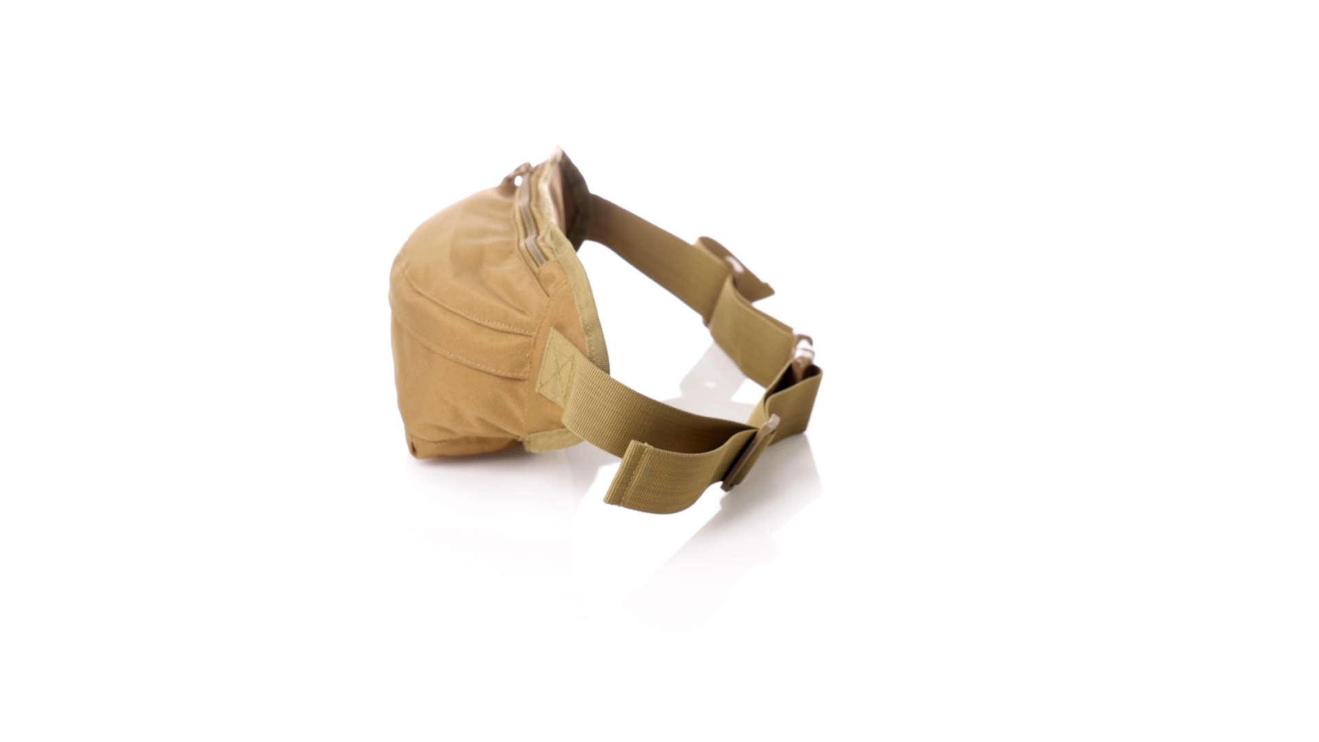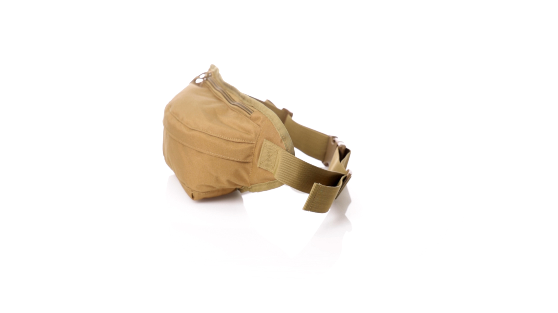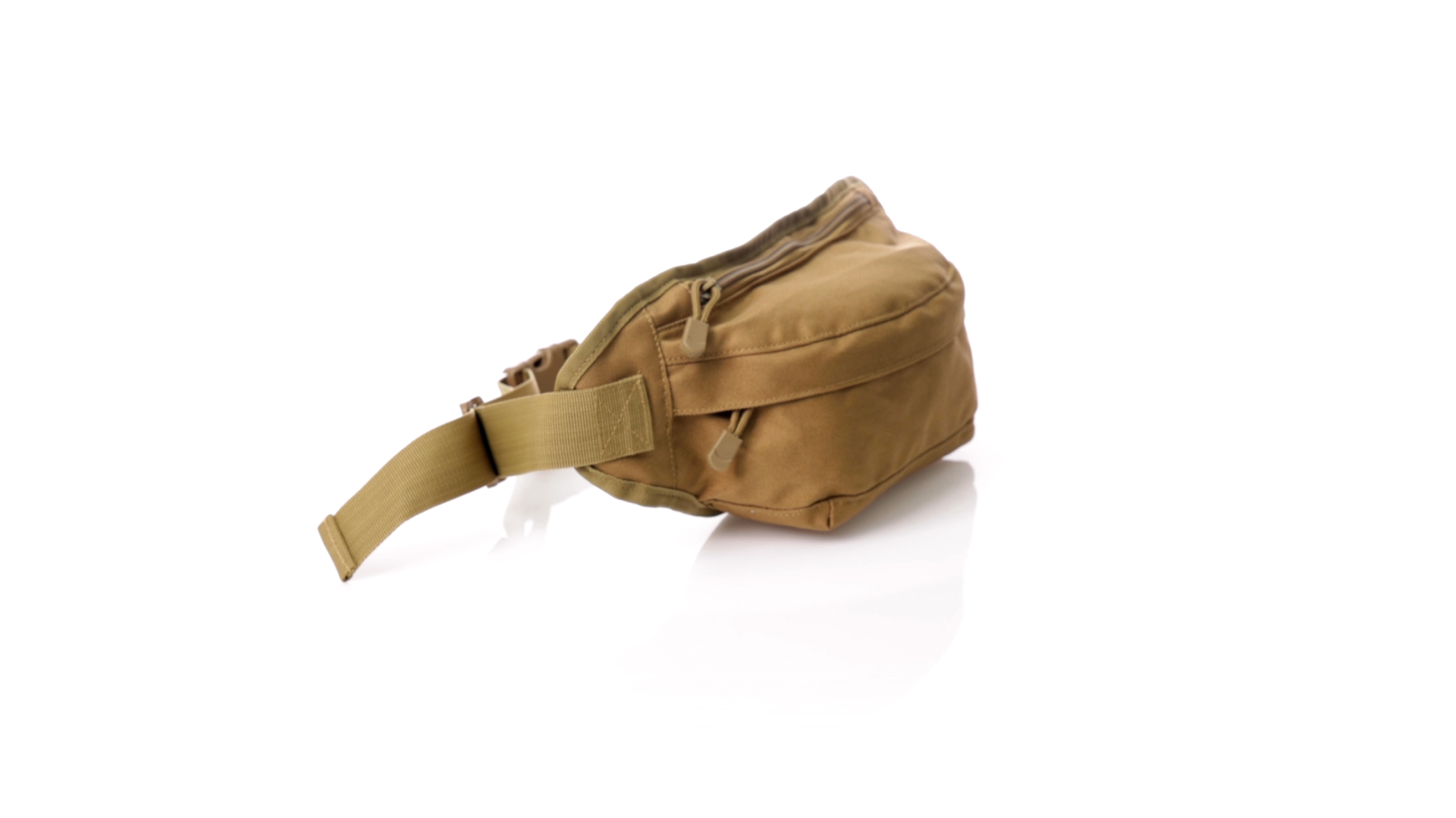 Gürteltasche aus strapazierfähigem 800D-Polyester und sandbraunem Ton. Mit 2 Reissverschlusstaschen und Riemen an Zugbändern zum einfachen Öffnen. Verstellbarer Gurt mit Schnallenverschluss, einzeln verpackt in einer recycelten Tasche.