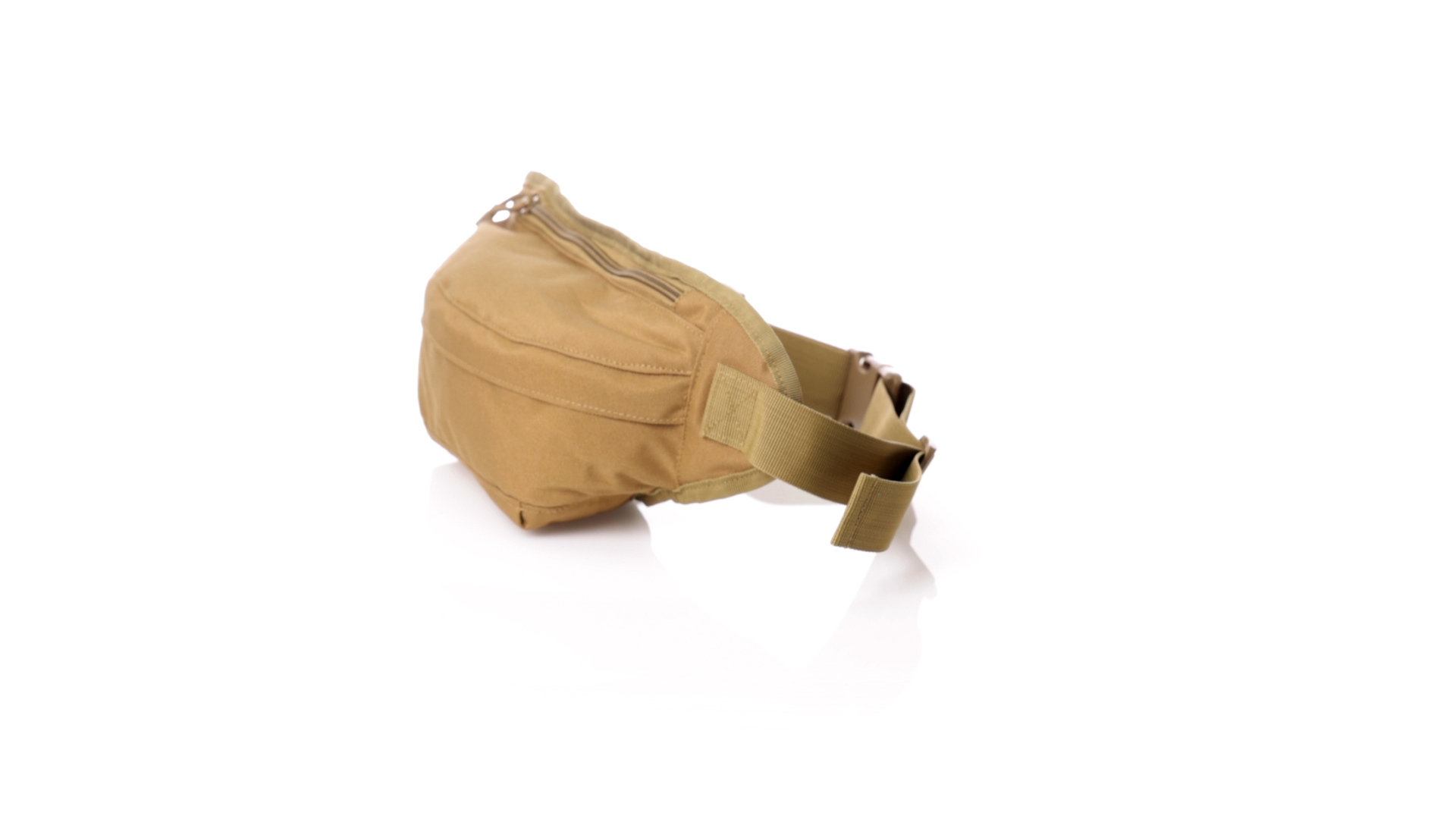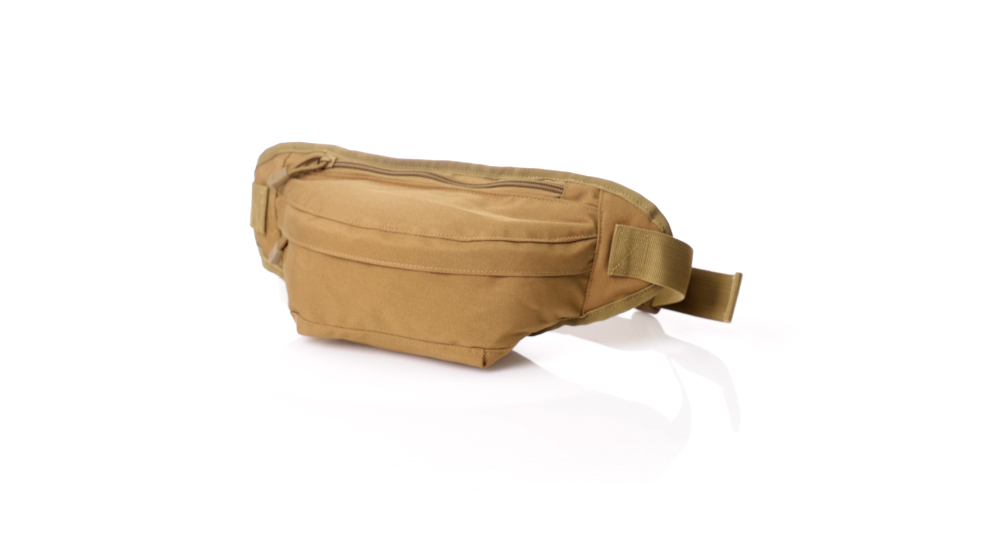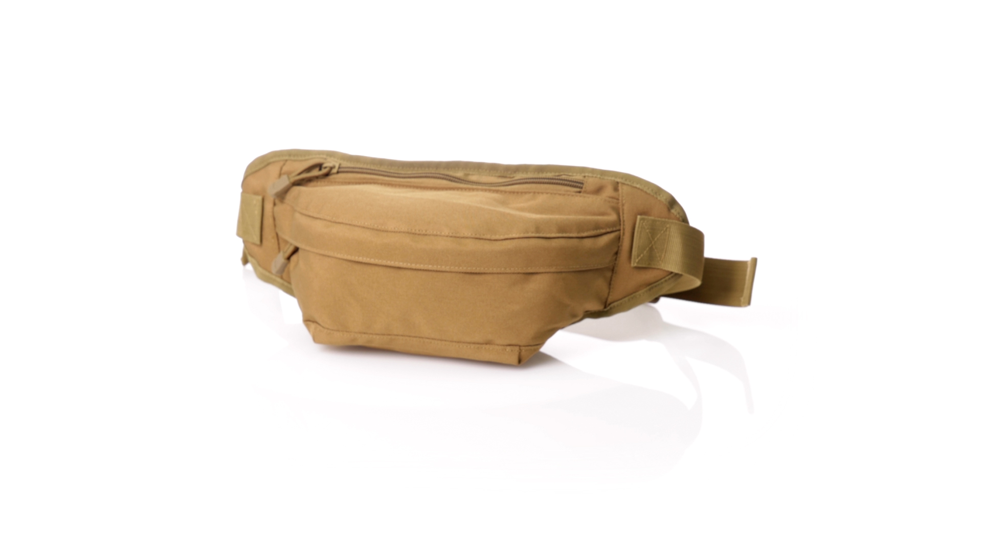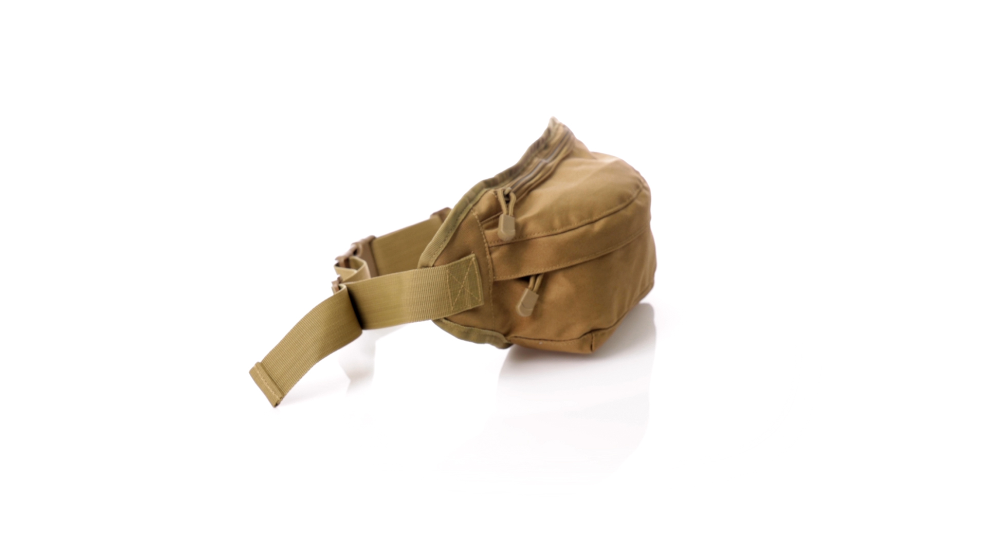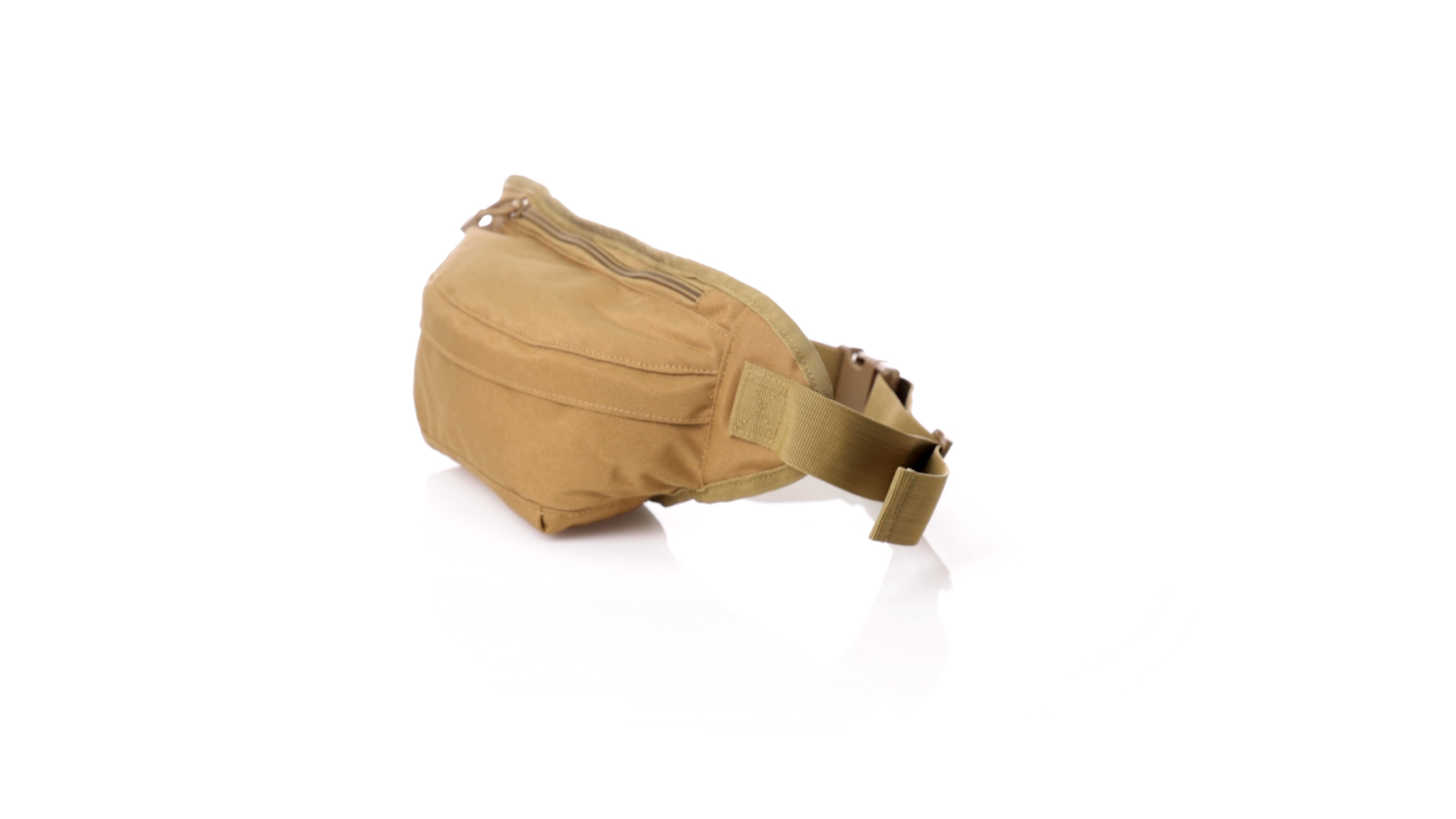 Gürteltasche aus strapazierfähigem 800D-Polyester und sandbraunem Ton. Mit 2 Reissverschlusstaschen und Riemen an Zugbändern zum einfachen Öffnen. Verstellbarer Gurt mit Schnallenverschluss, einzeln verpackt in einer recycelten Tasche.