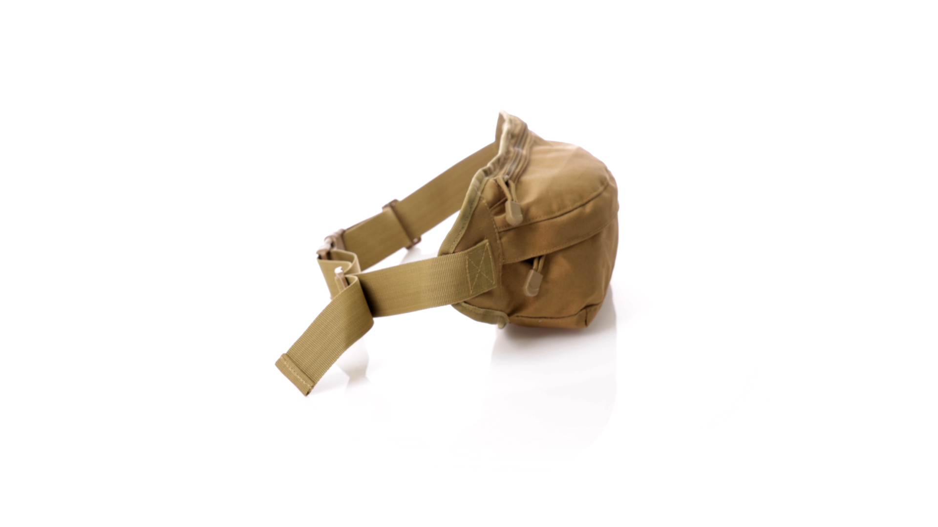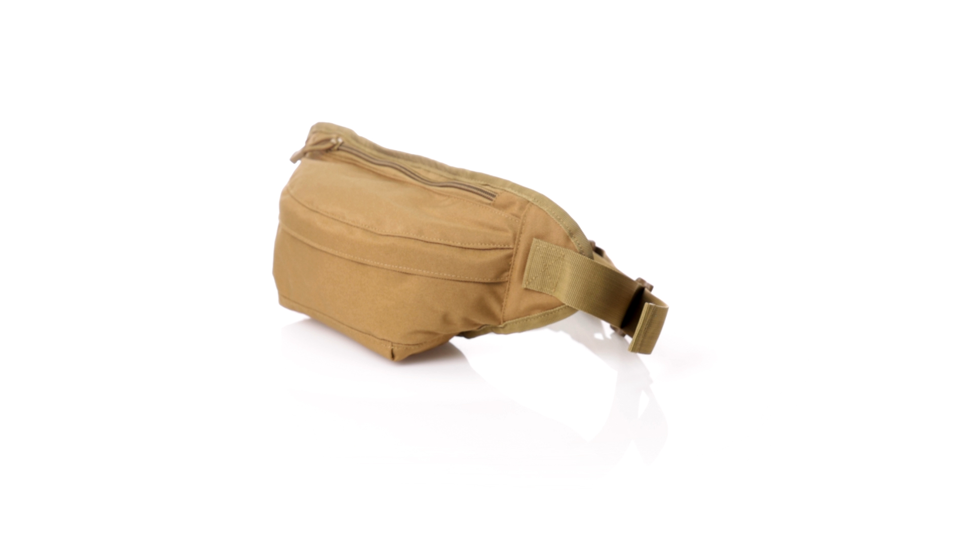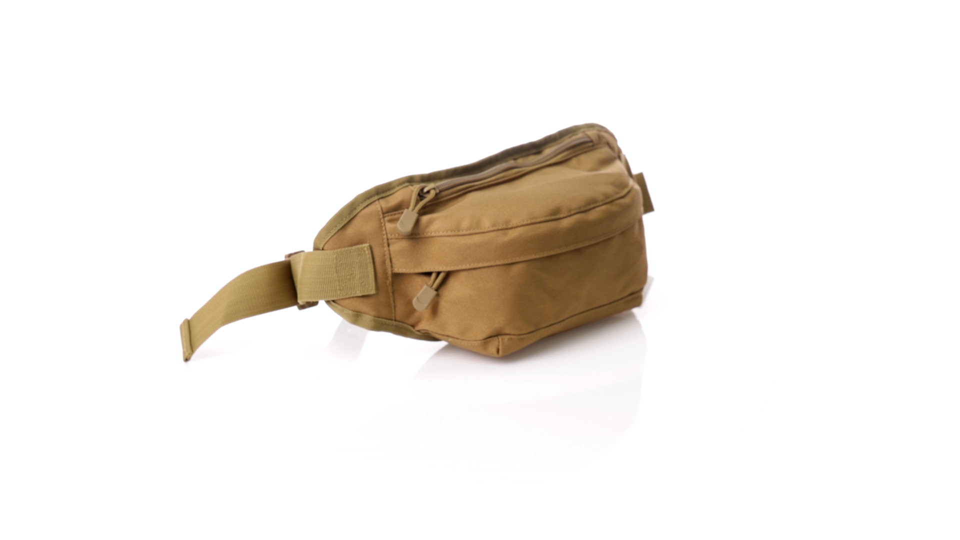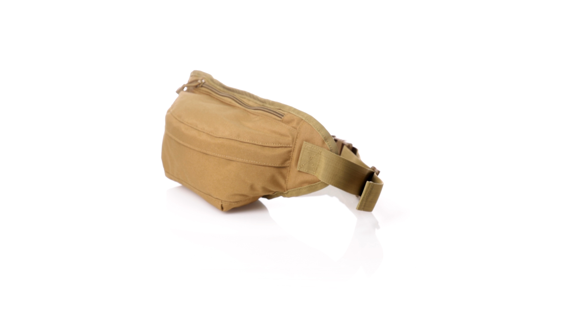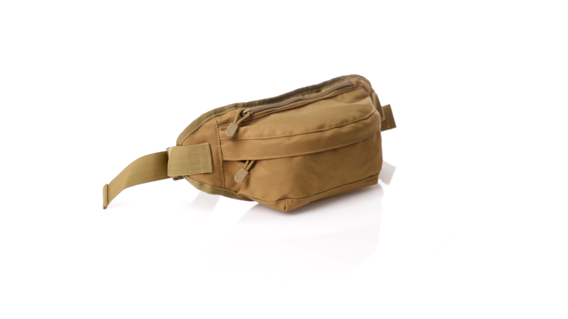 Gürteltasche aus strapazierfähigem 800D-Polyester und sandbraunem Ton. Mit 2 Reissverschlusstaschen und Riemen an Zugbändern zum einfachen Öffnen. Verstellbarer Gurt mit Schnallenverschluss, einzeln verpackt in einer recycelten Tasche.